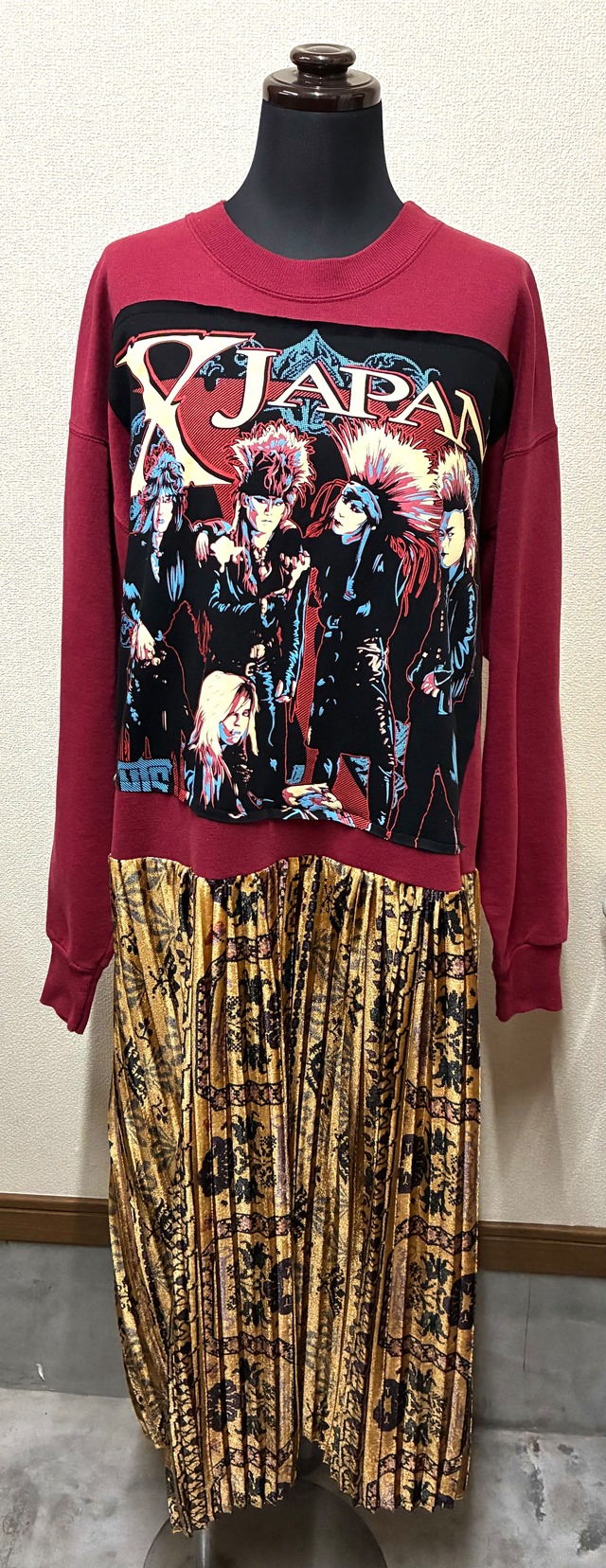 世界にひとつだけ!ベネンバネバネバワンピースです! 全て古着のリメイクです♡ 紅好きにはたまらない!! ワイン色のスウェットにかっこいいやつを縫いつけ、ベロア生地の柄プリーツスカートを合わせています♬ 重ね着すると、ほぼ年中着ていただけます♡ 誰ともかぶらない!衣装に!旅行に!飽きたら部屋着に♡ サイズ 着丈約118cm 身幅約54cm 肩幅約56cm 袖丈約53cm 切り替え部分約57cm *丈詰め等リフォームのご依頼はお受けしておりません。 *完璧を求める方のご購入はお控えください。 *古着ですので、着用感、シミや毛玉や毛羽立ちなどがある場合もあります。古着にご理解いただけない方のご購入は、お控えください。