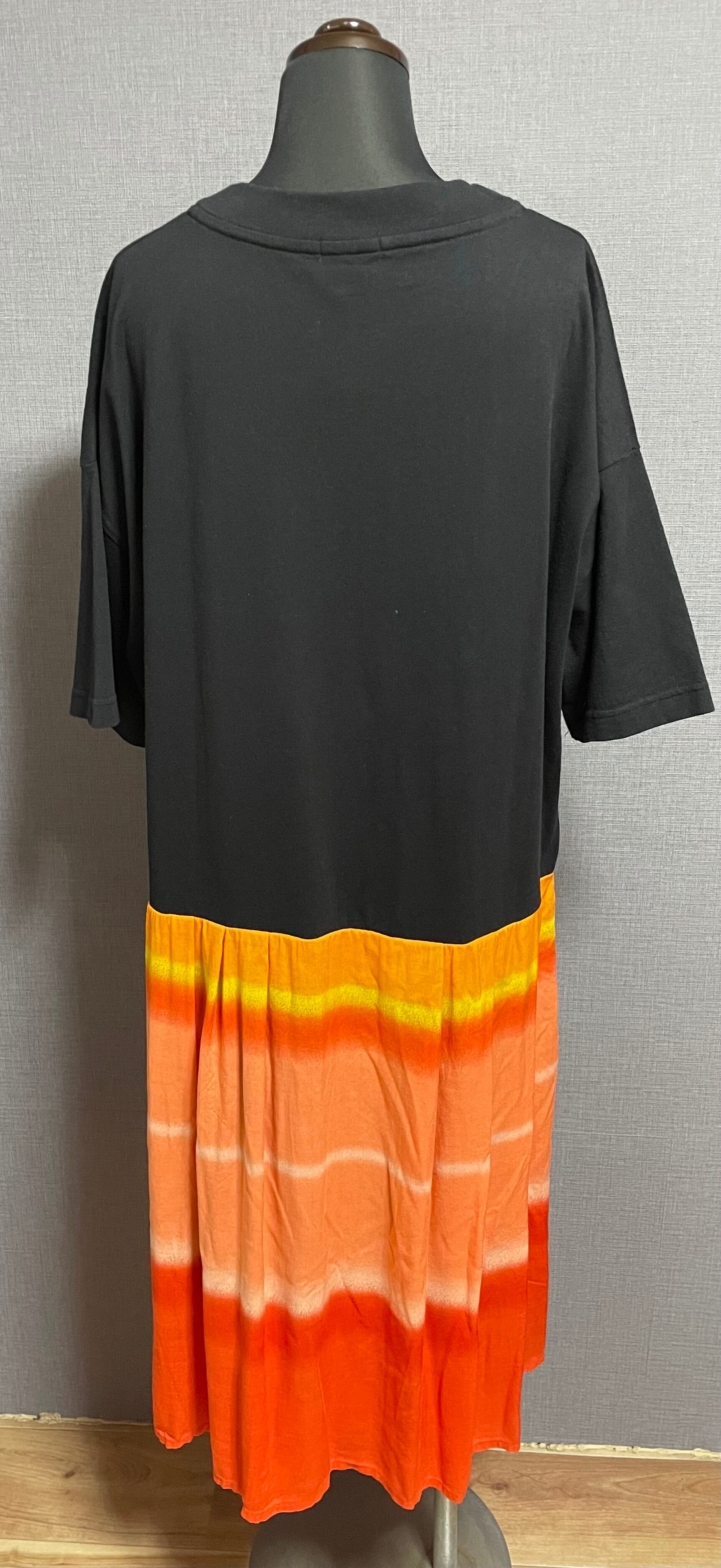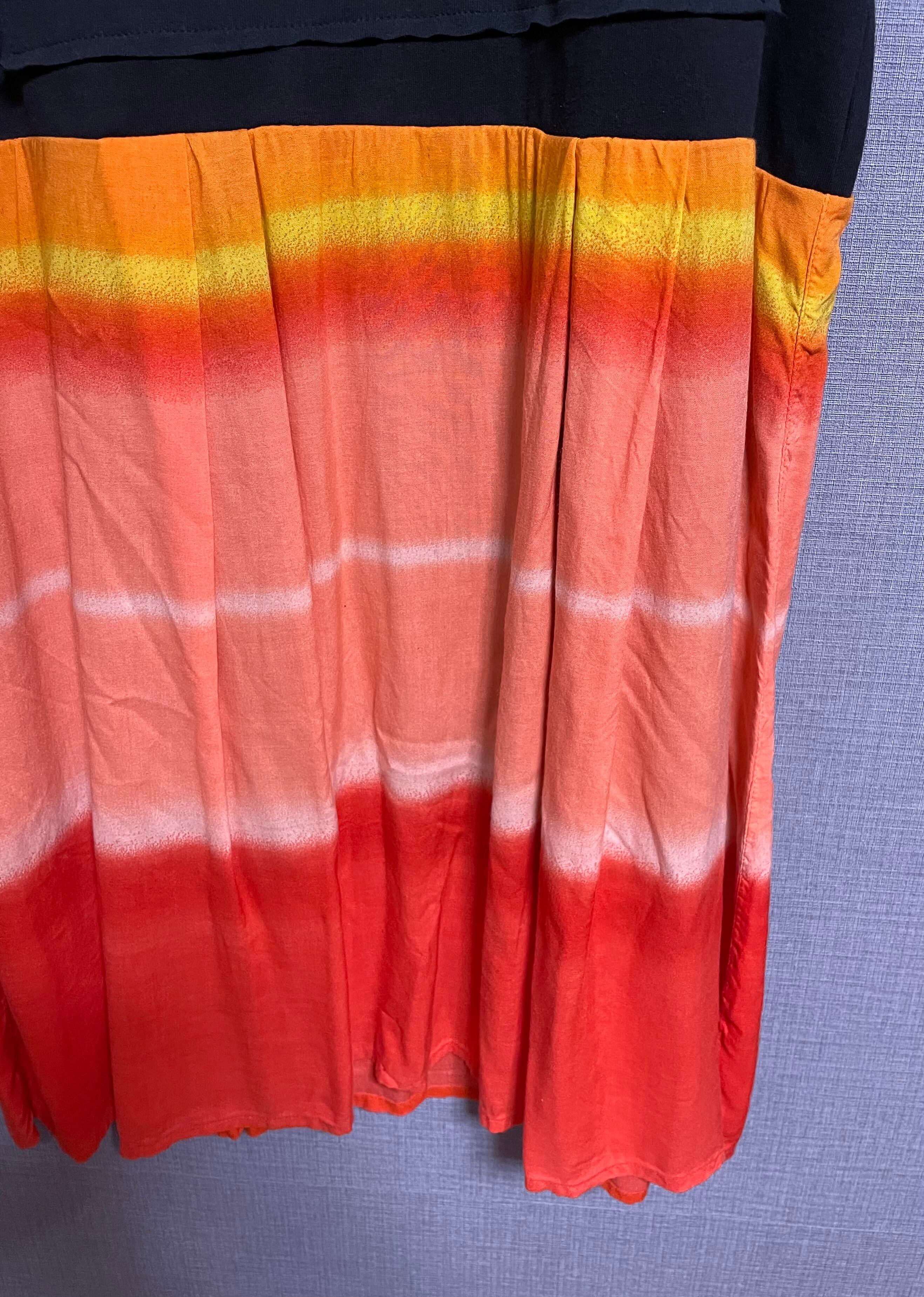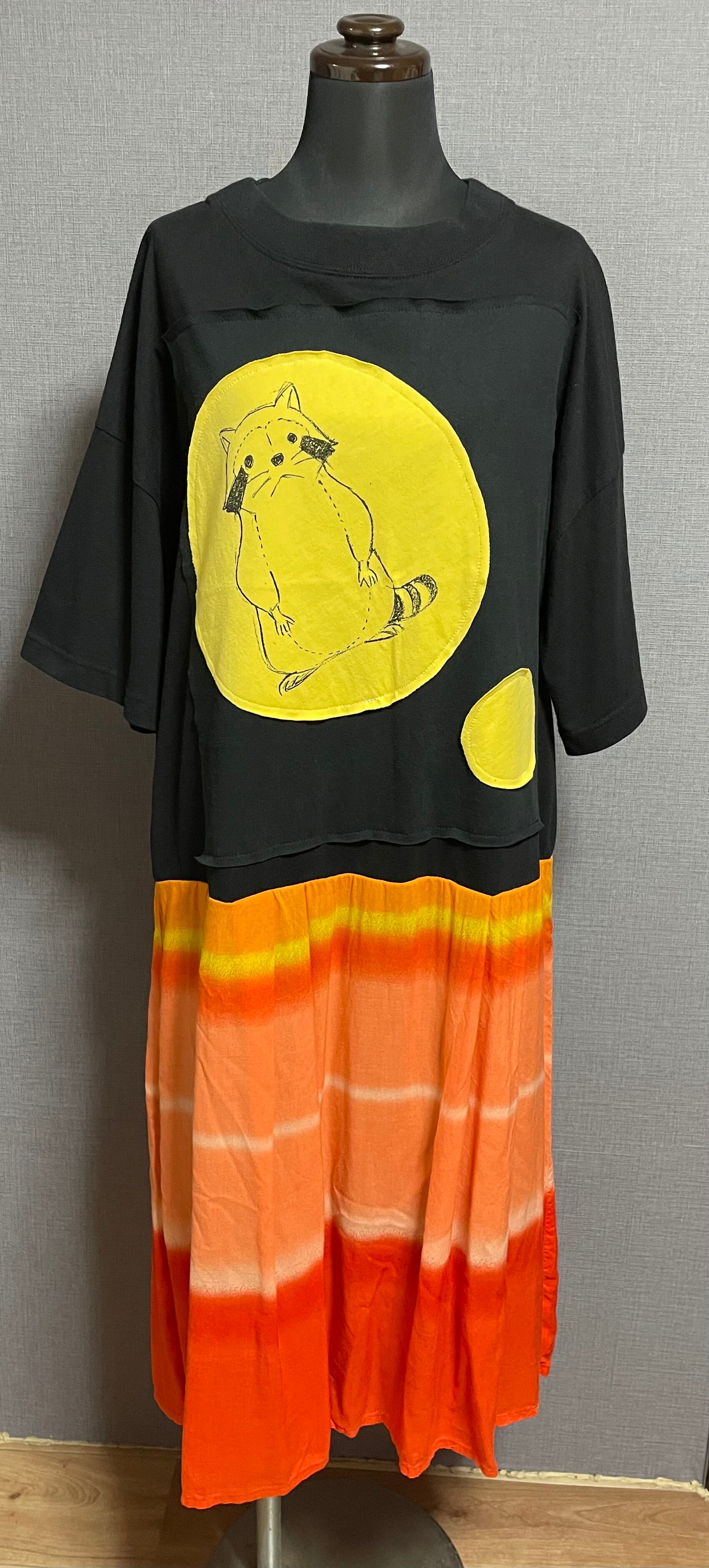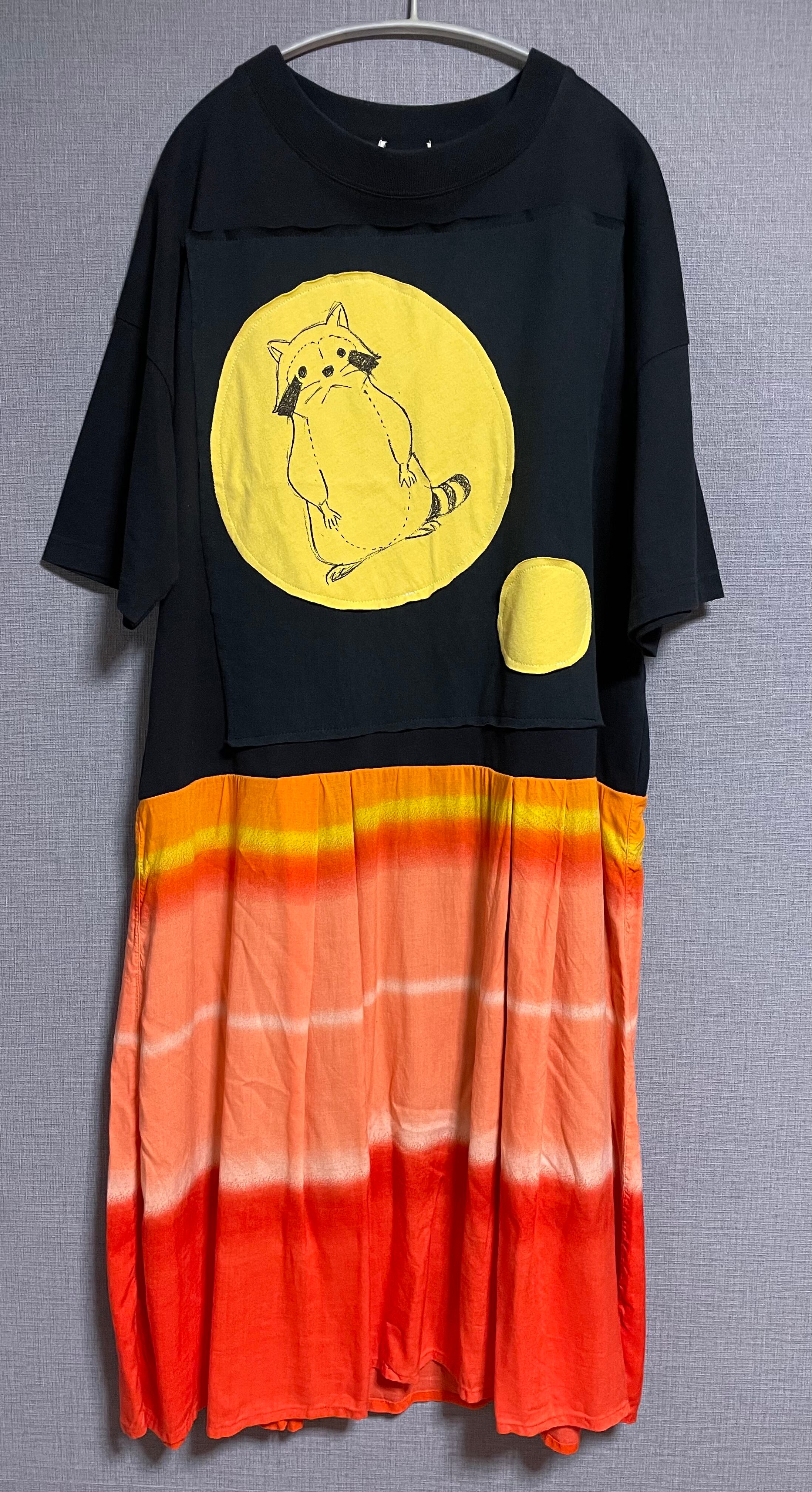黒Tシャツにかわいいアライグマを縫いつけ、タイダイスカートを合わせています♬