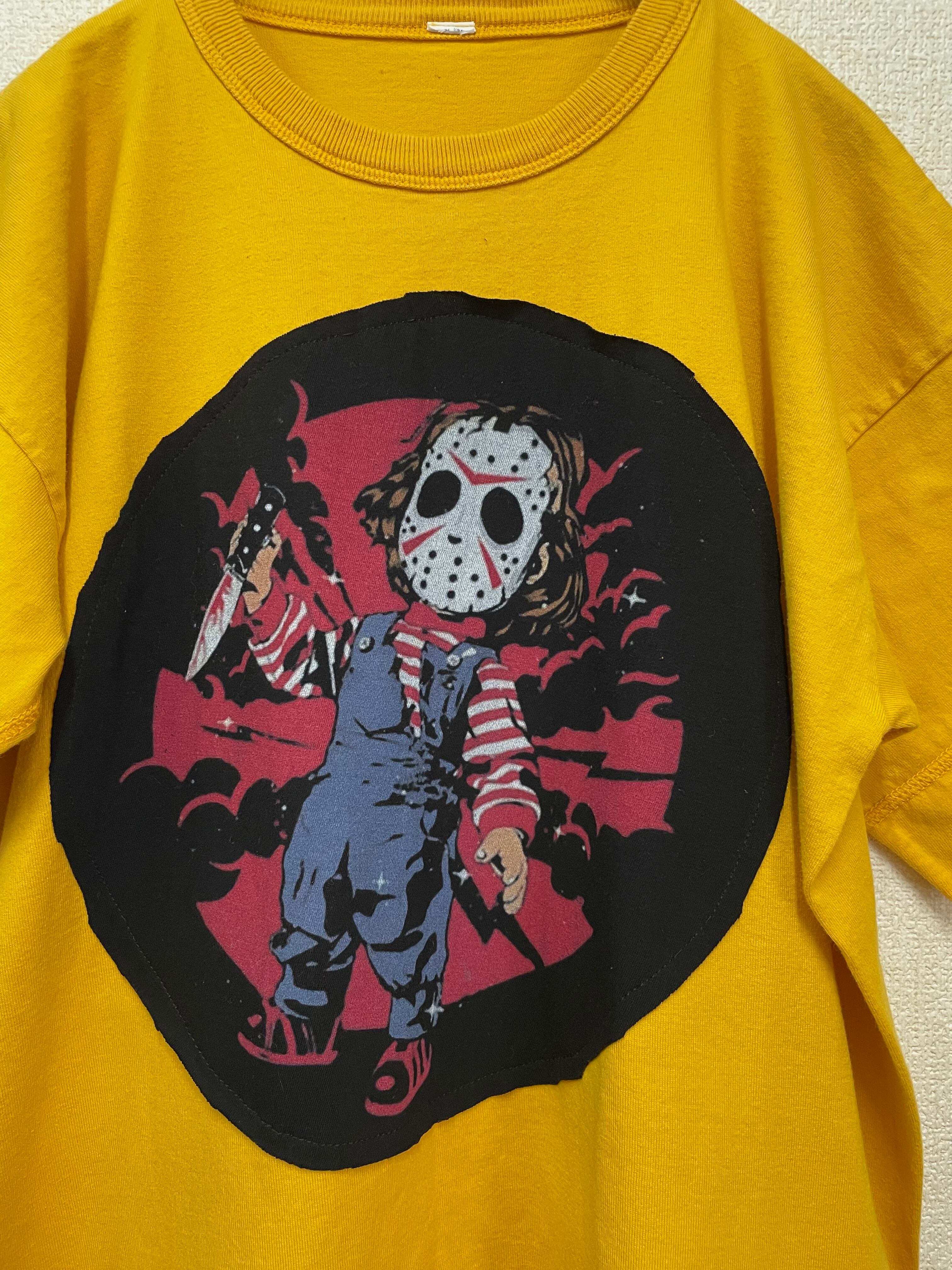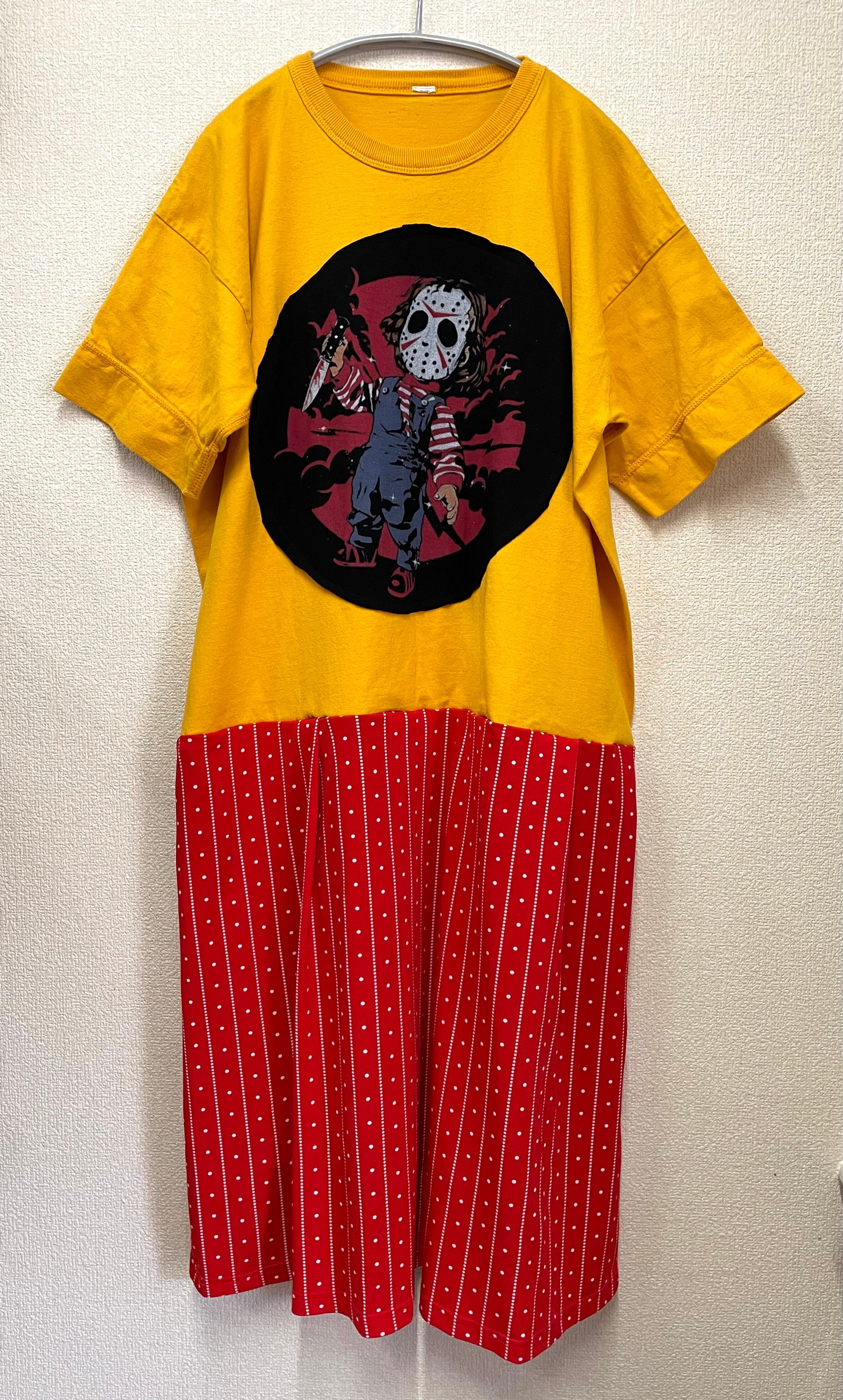 黄色Tシャツにかわいいやつを縫いつけ、赤の柄スカートを合わせています♬