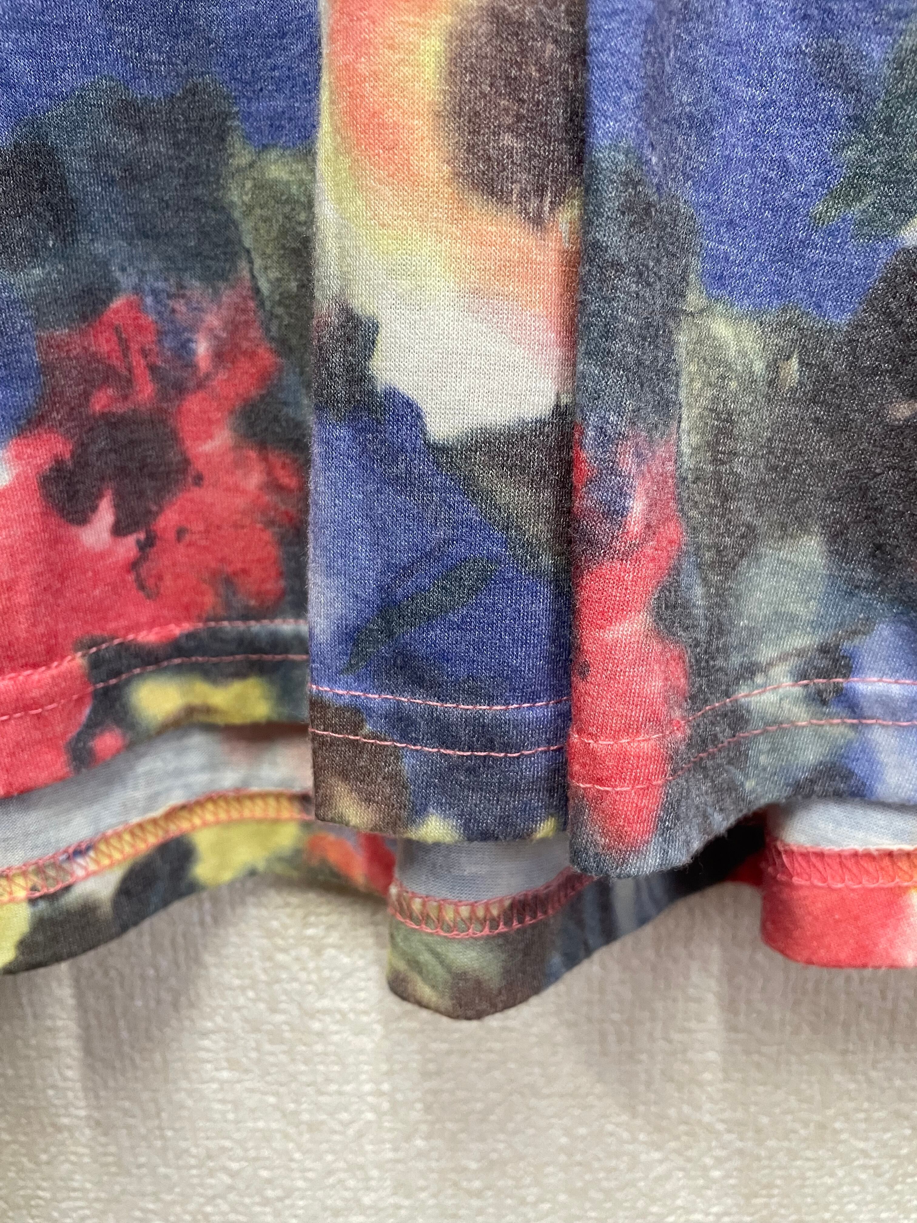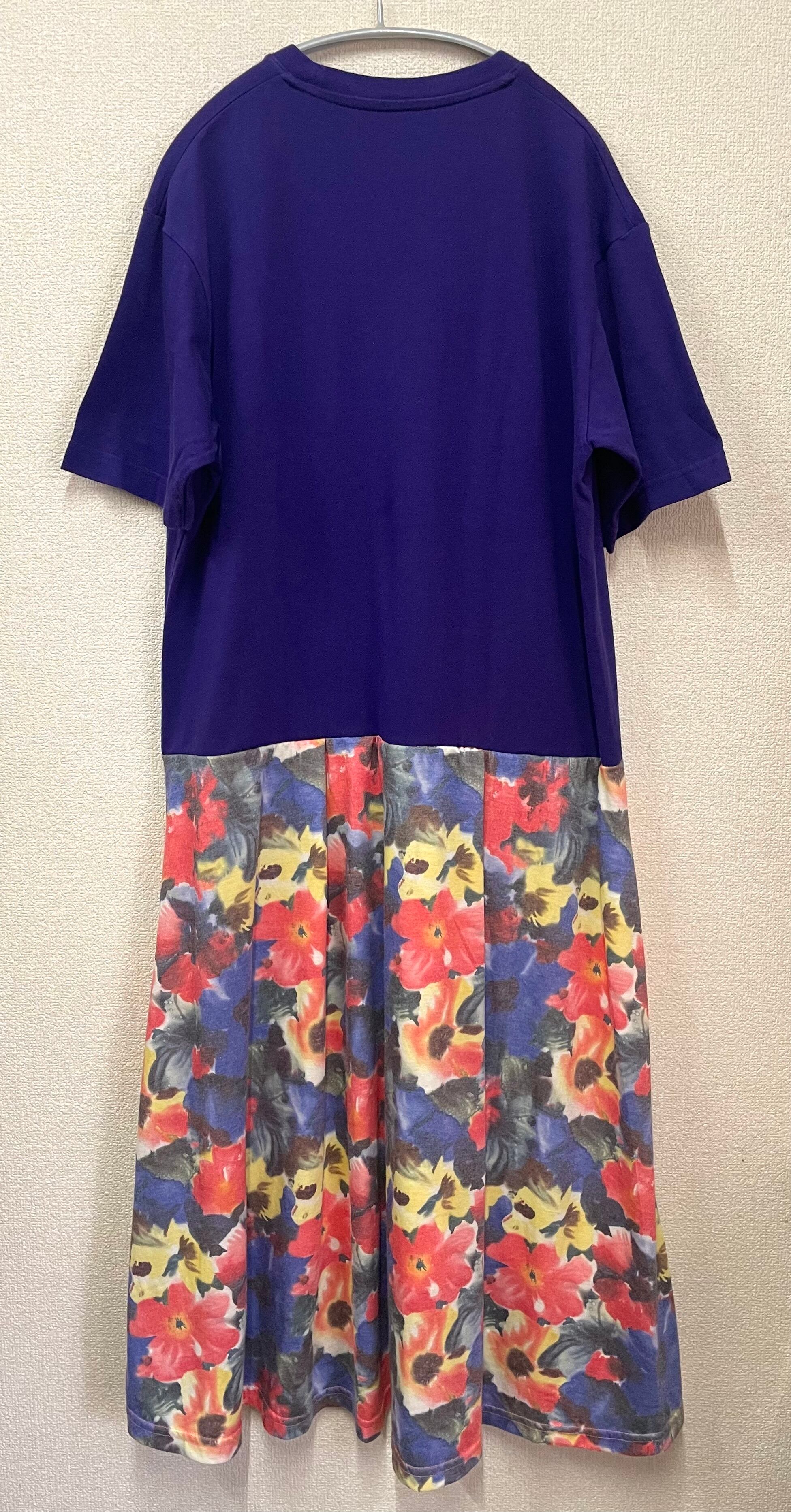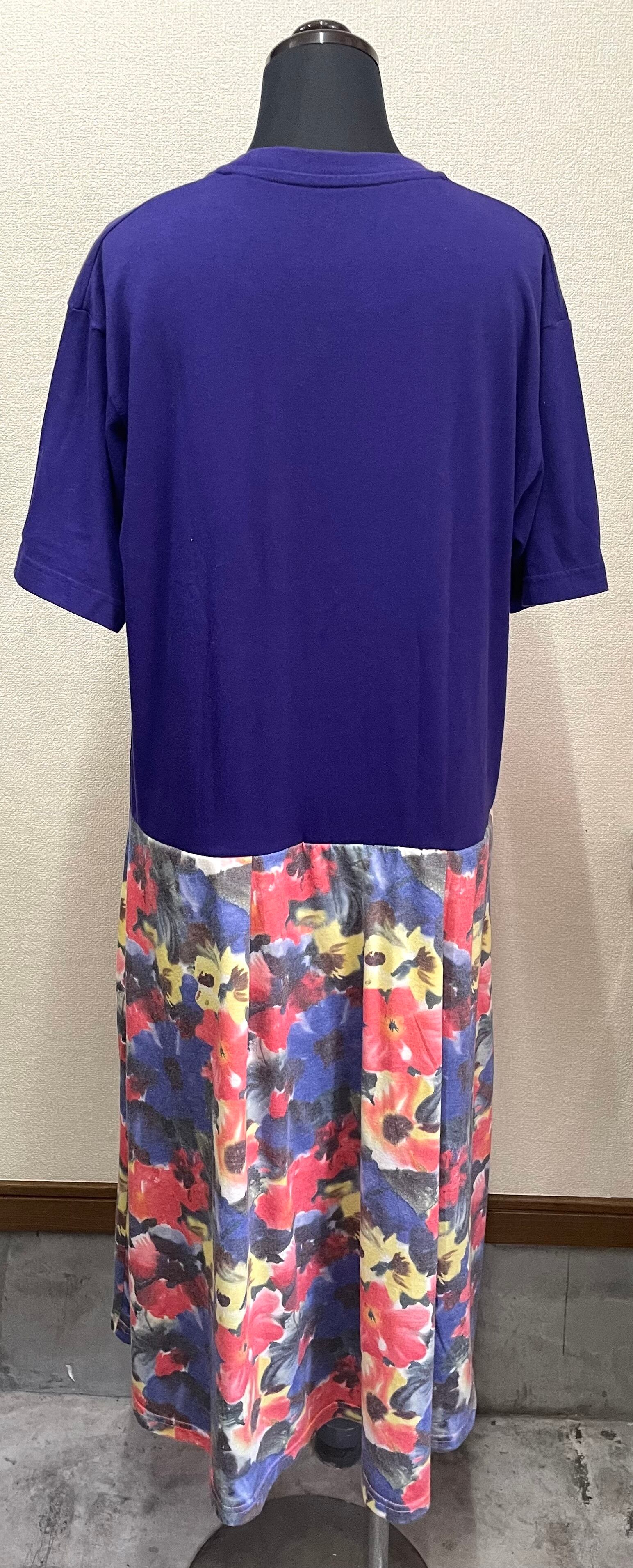 紫Tシャツにかっこいいやつを縫いつけ、カラフル花柄スカートを合わせています♬