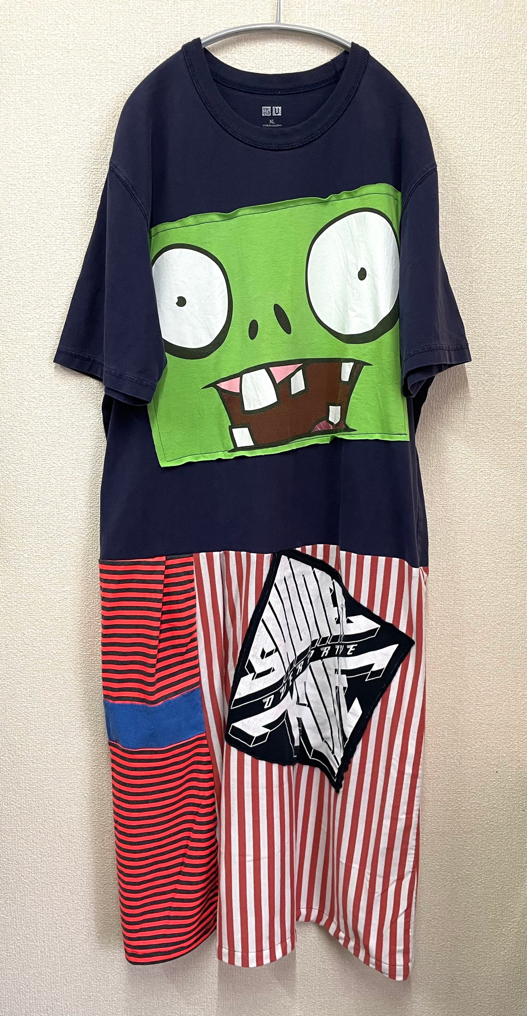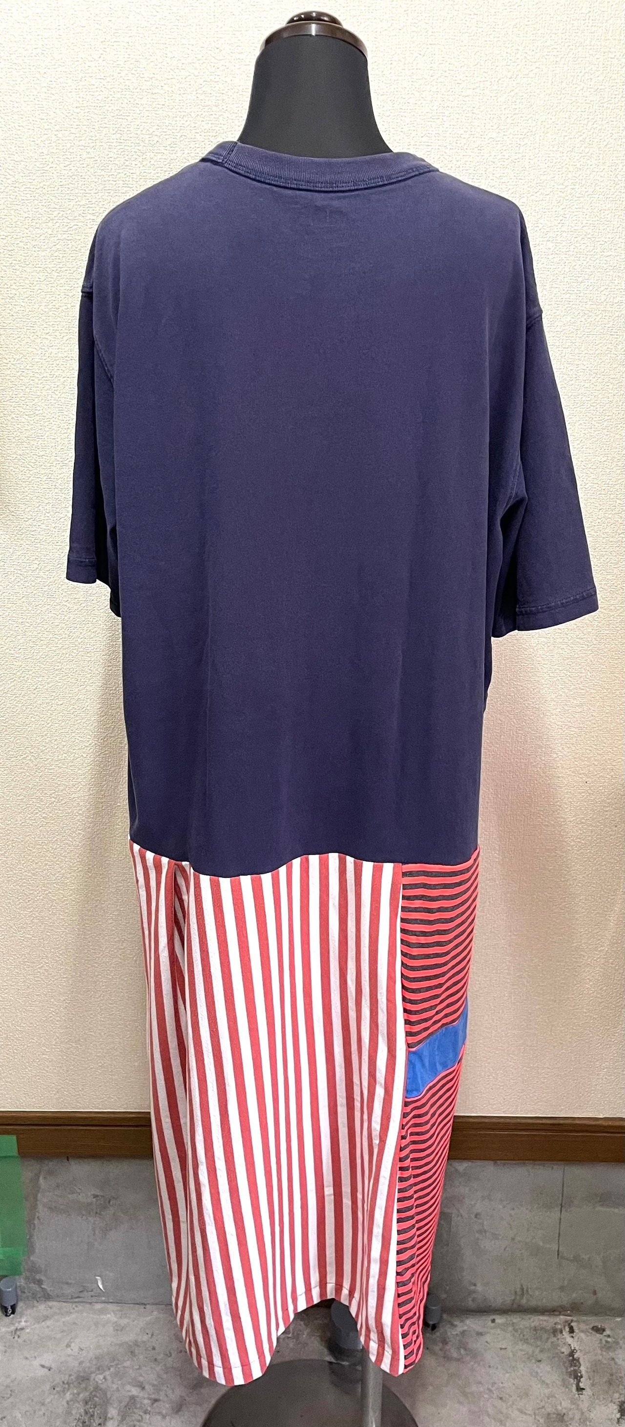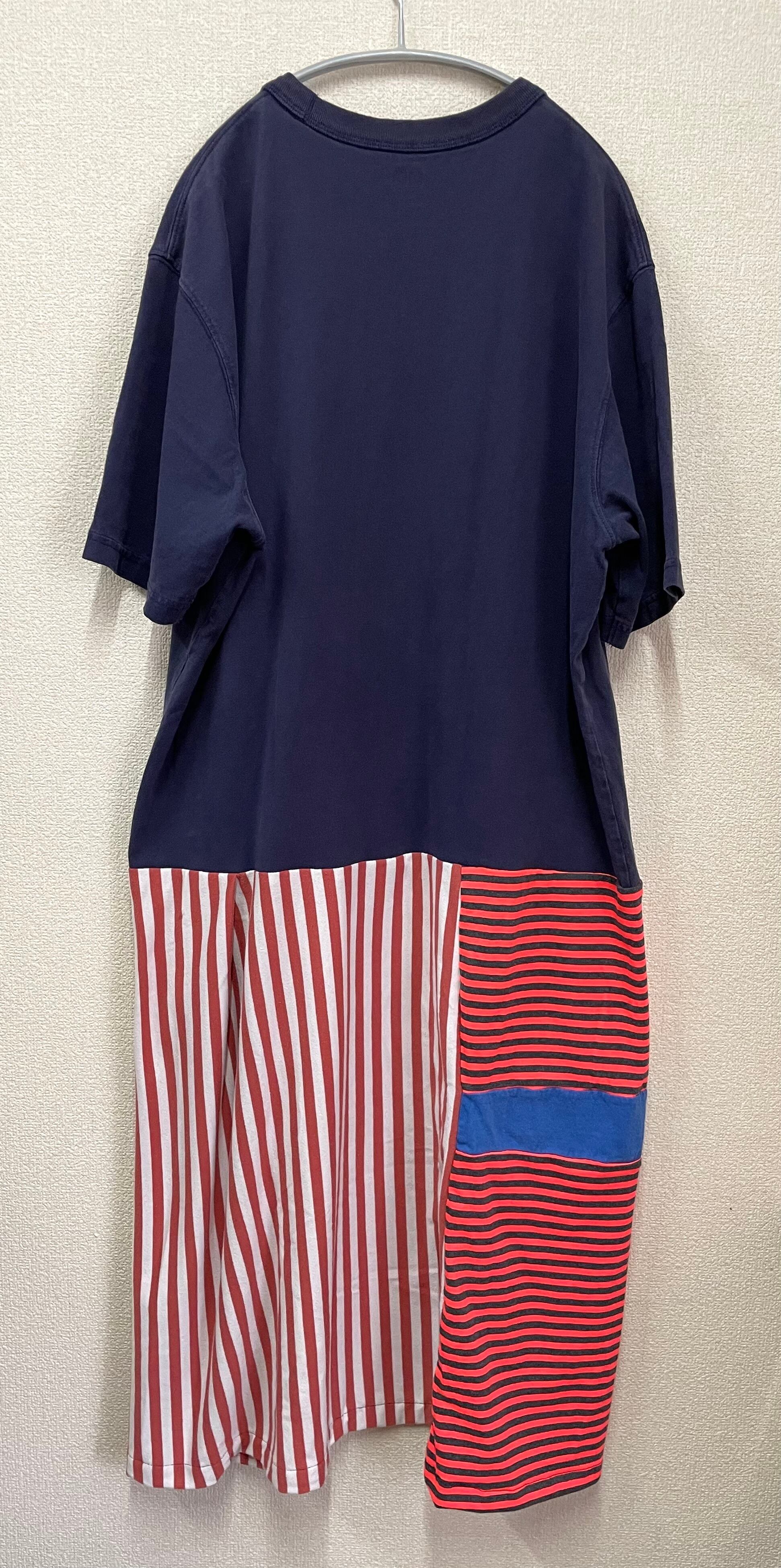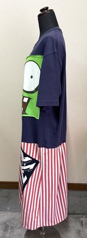 紺Tシャツにかわいいモンスターを縫いつけ、ストライプ✖️ボーダー生地で作ったスカートを合わせています♬