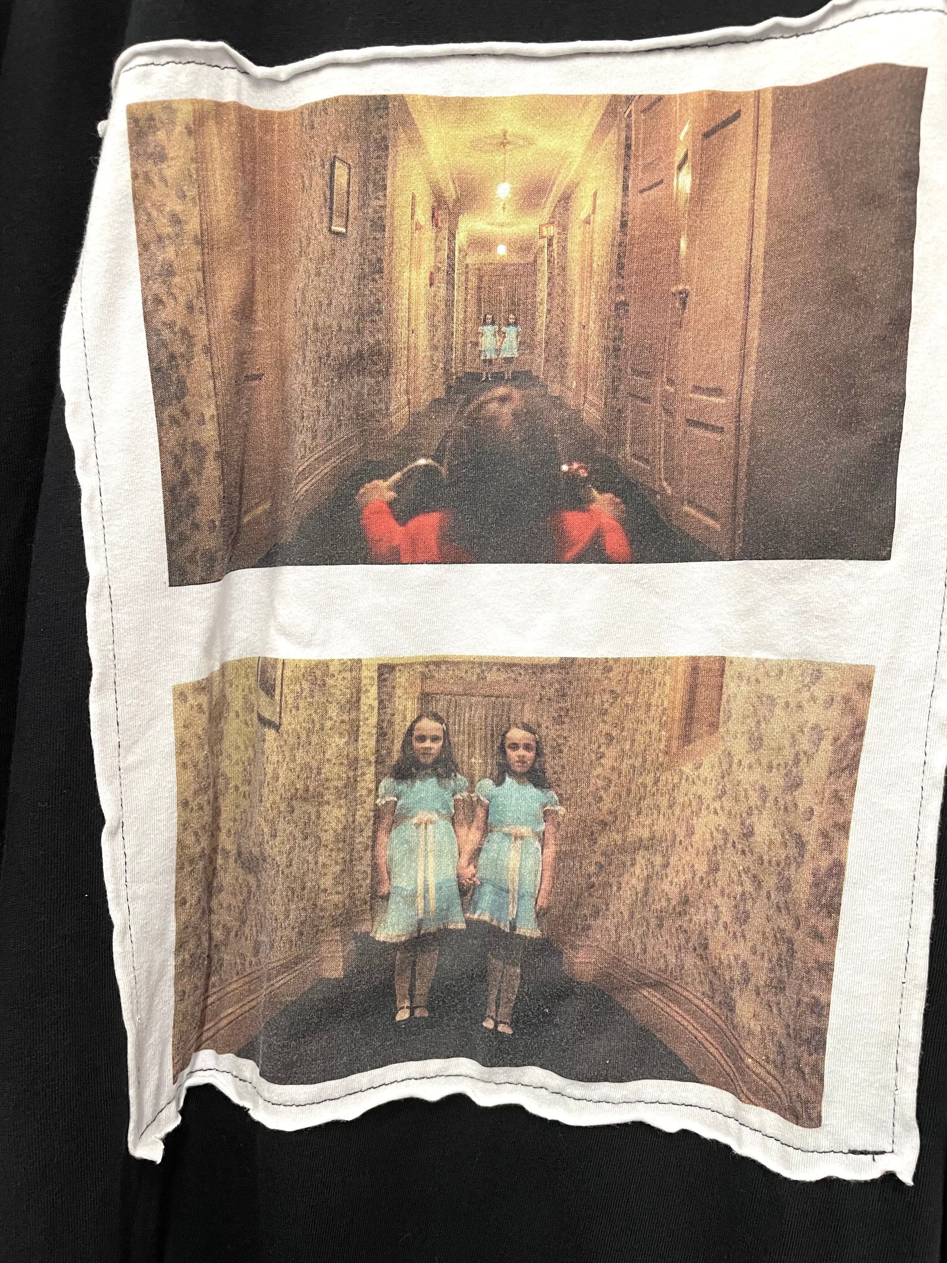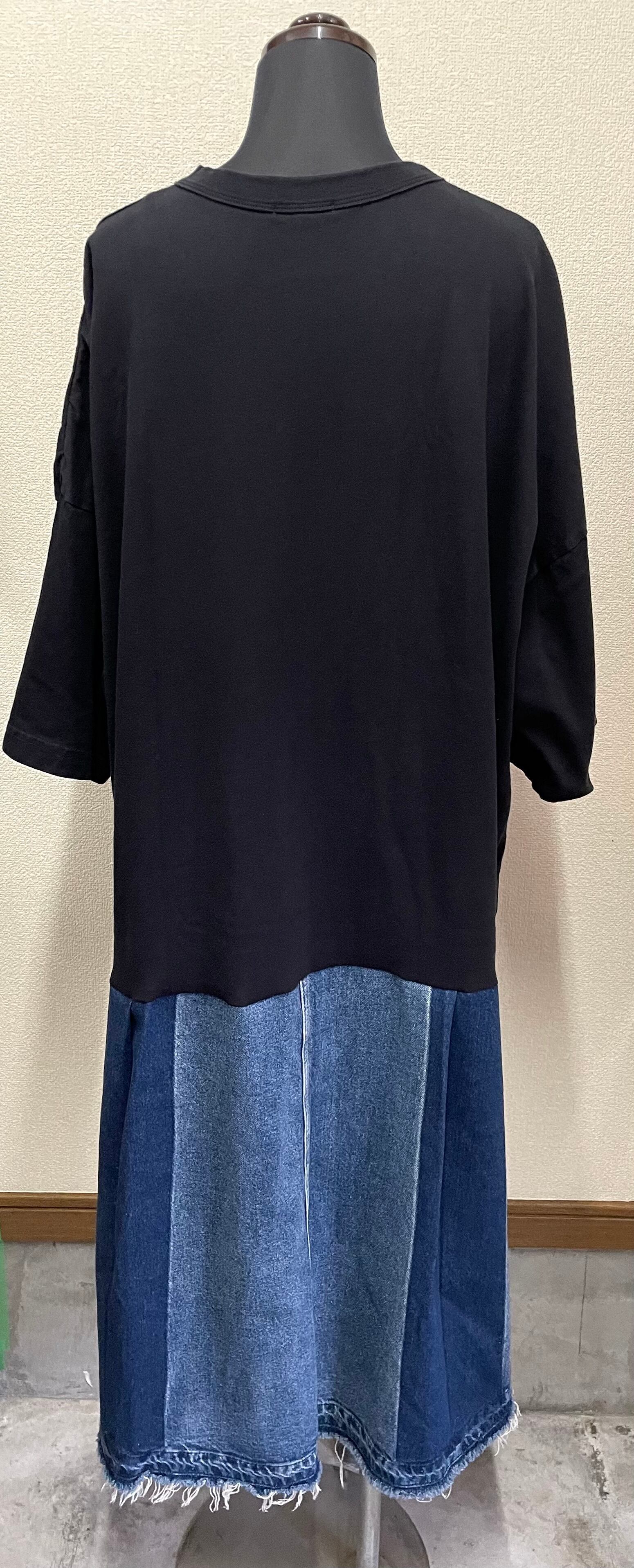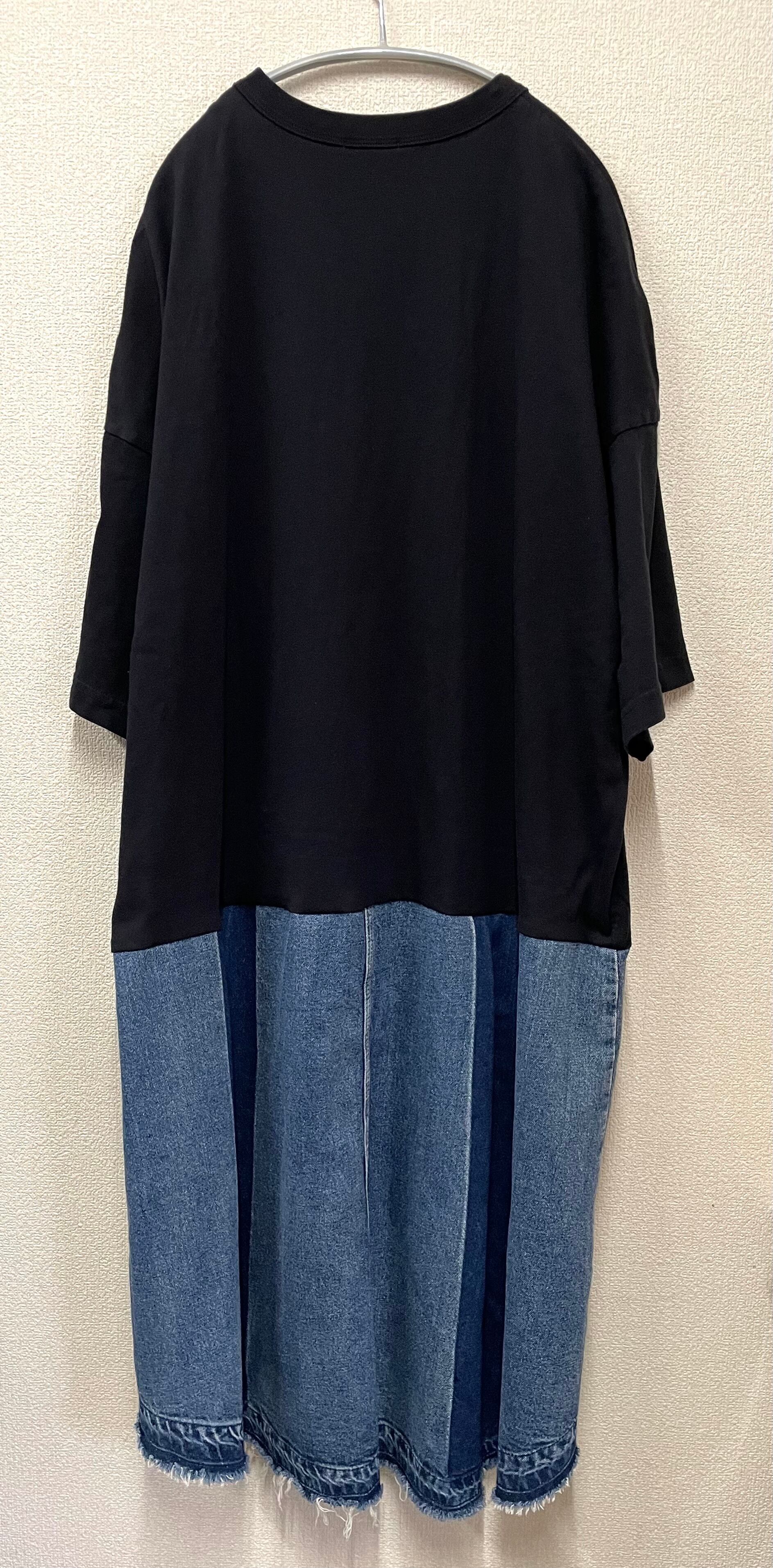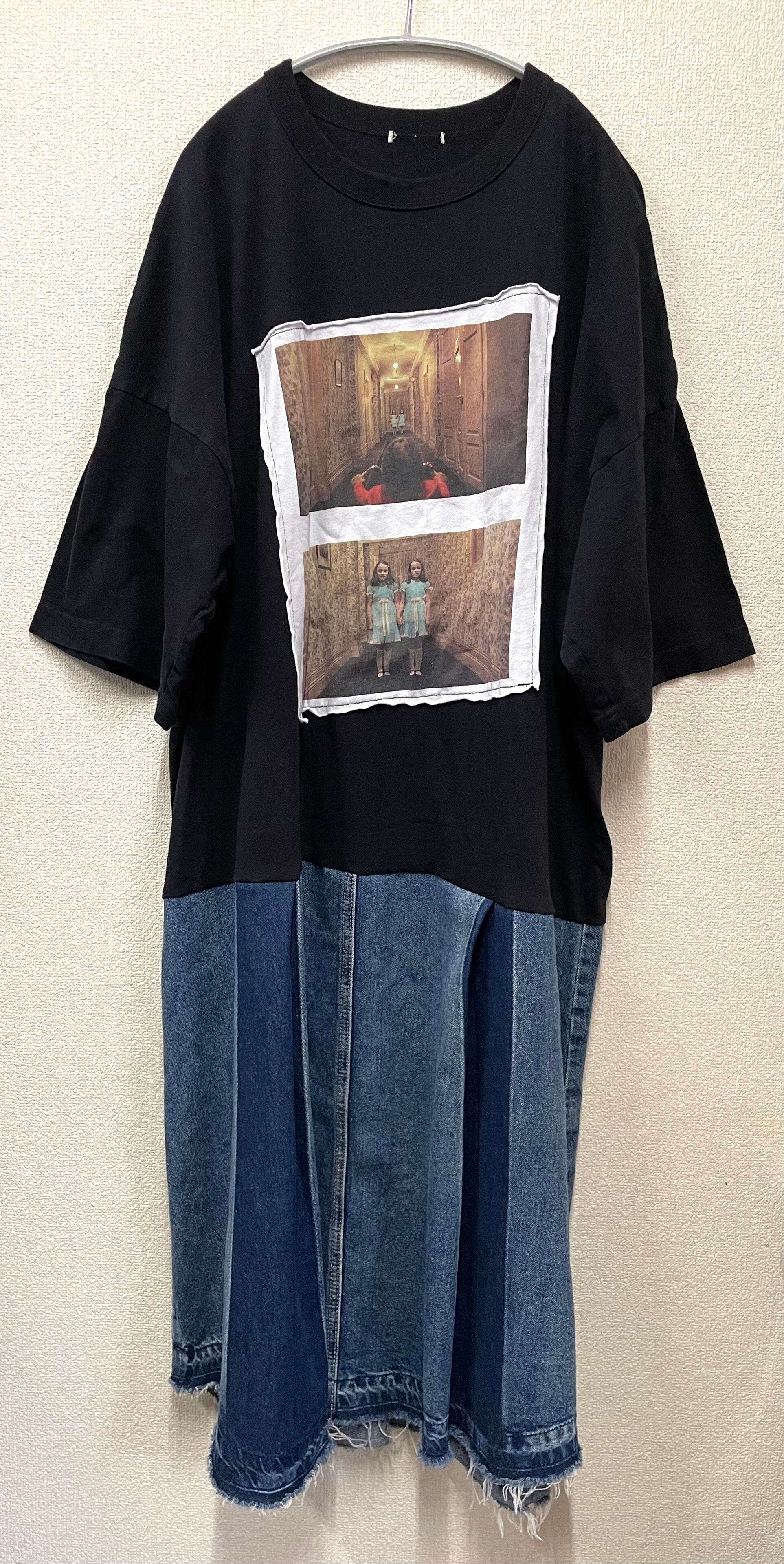 黒Tシャツに名場面を縫いつけ、ダメージ加工されたデニムスカートを合わせています♬