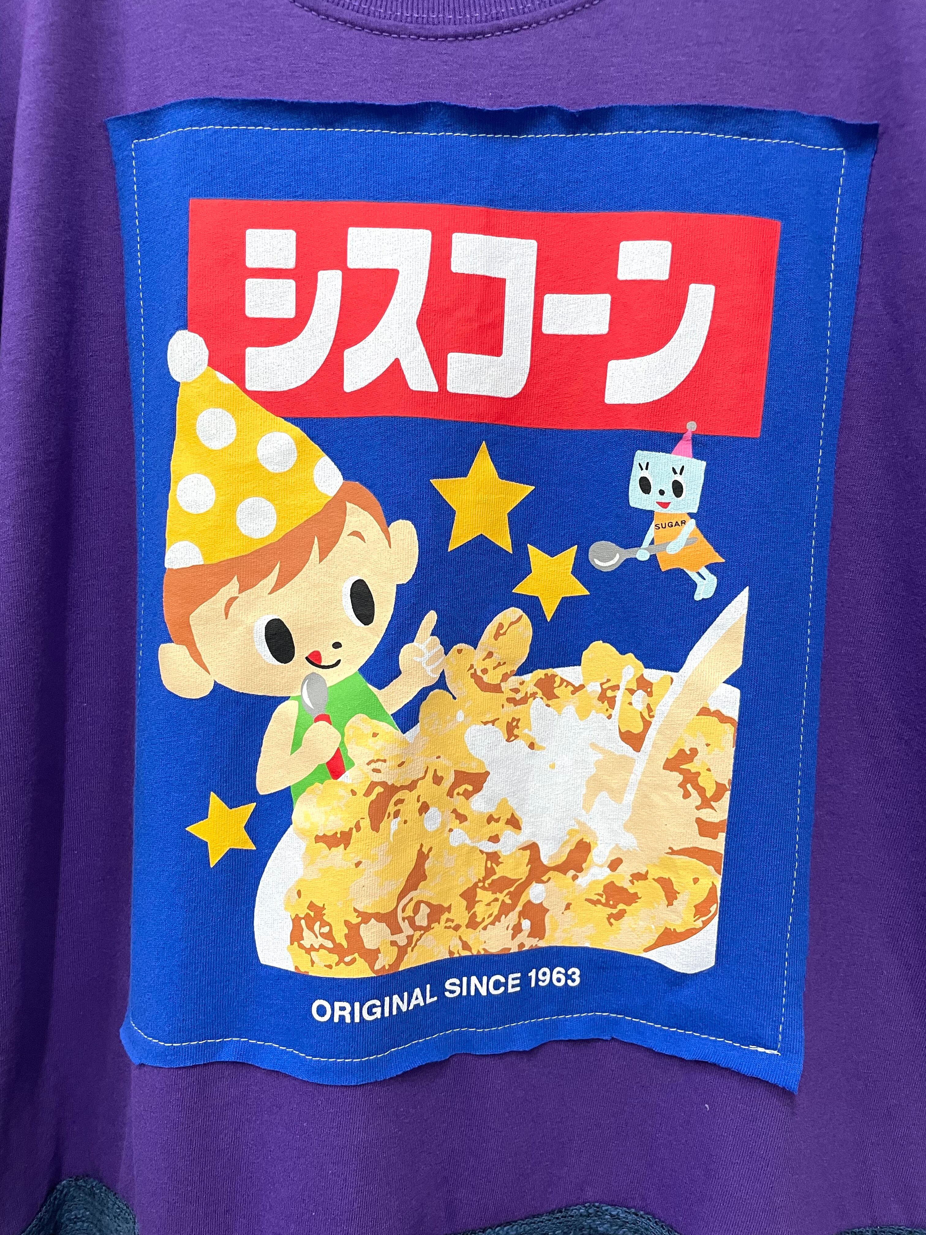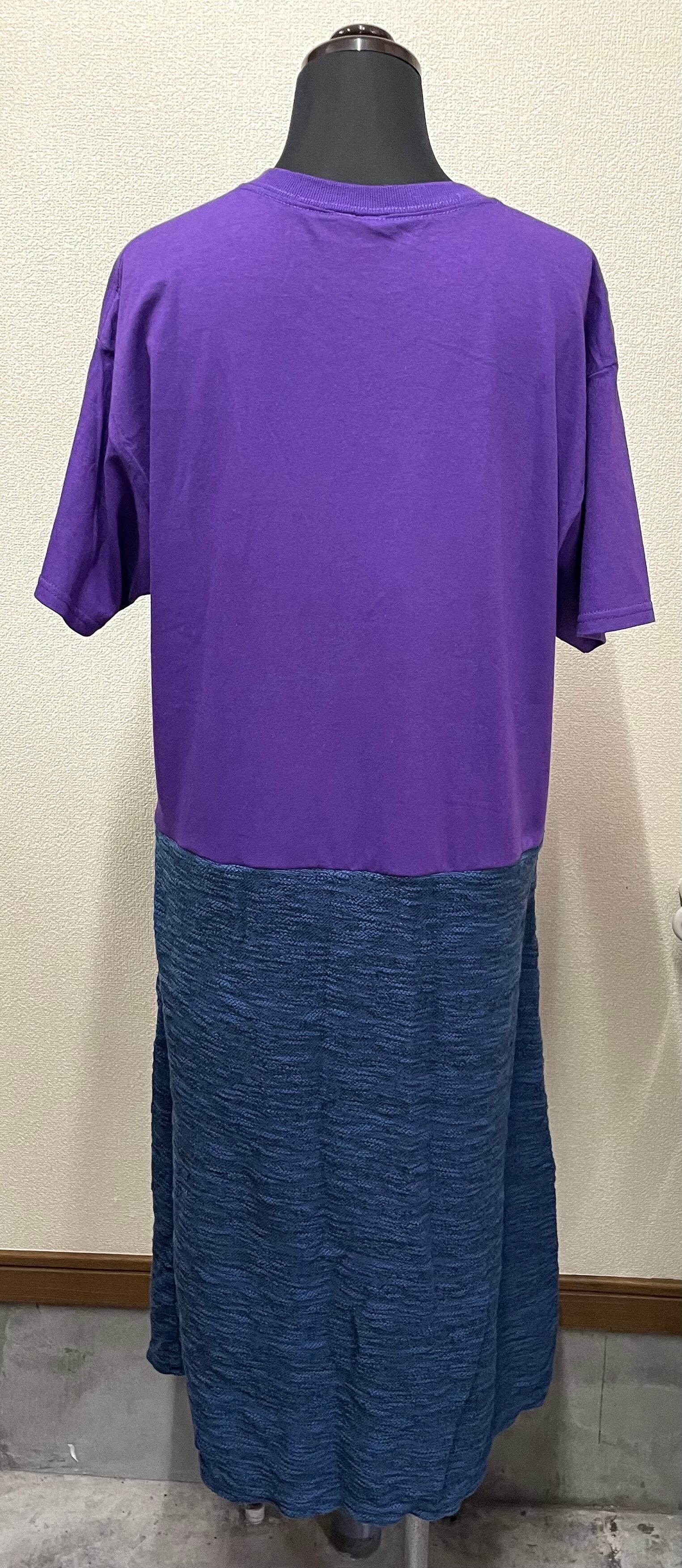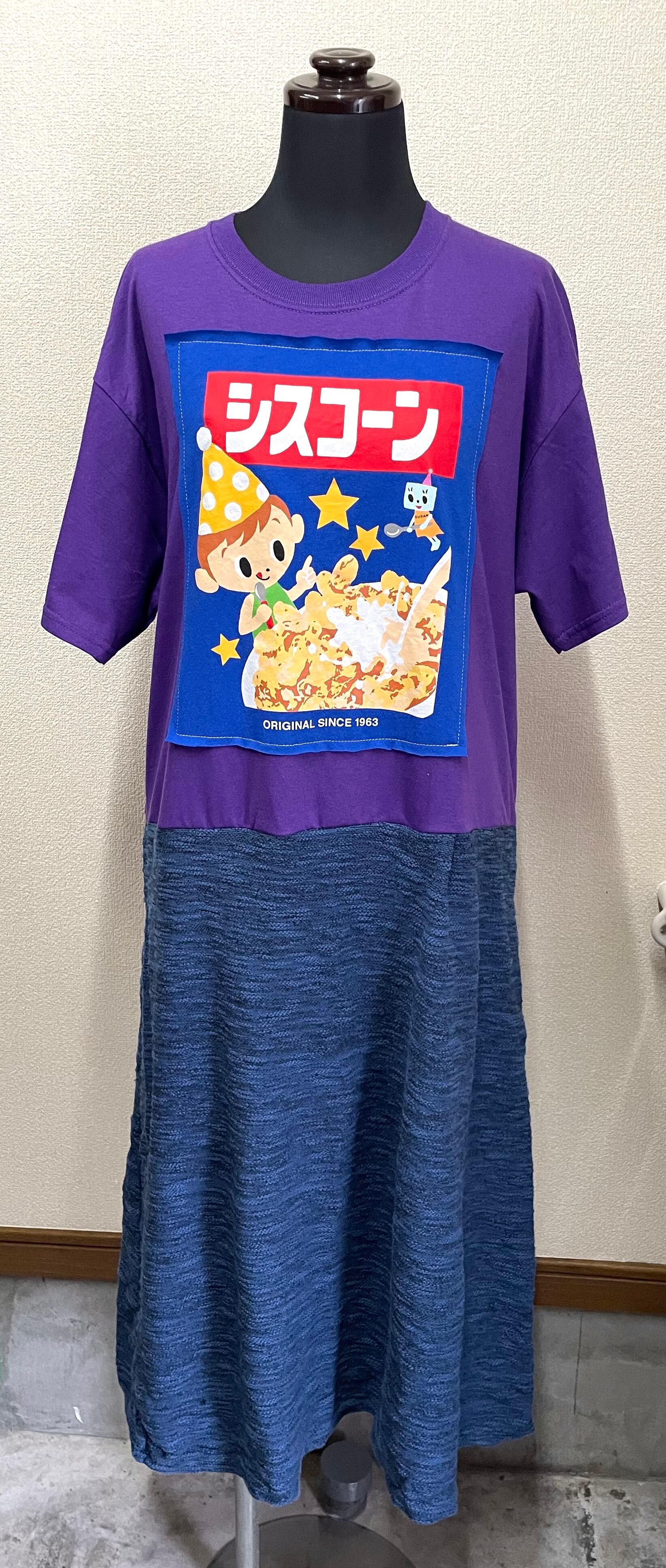 紫Tシャツにかわいいぼっちゃんを縫いつけ、紺系のスカートを合わせています♬