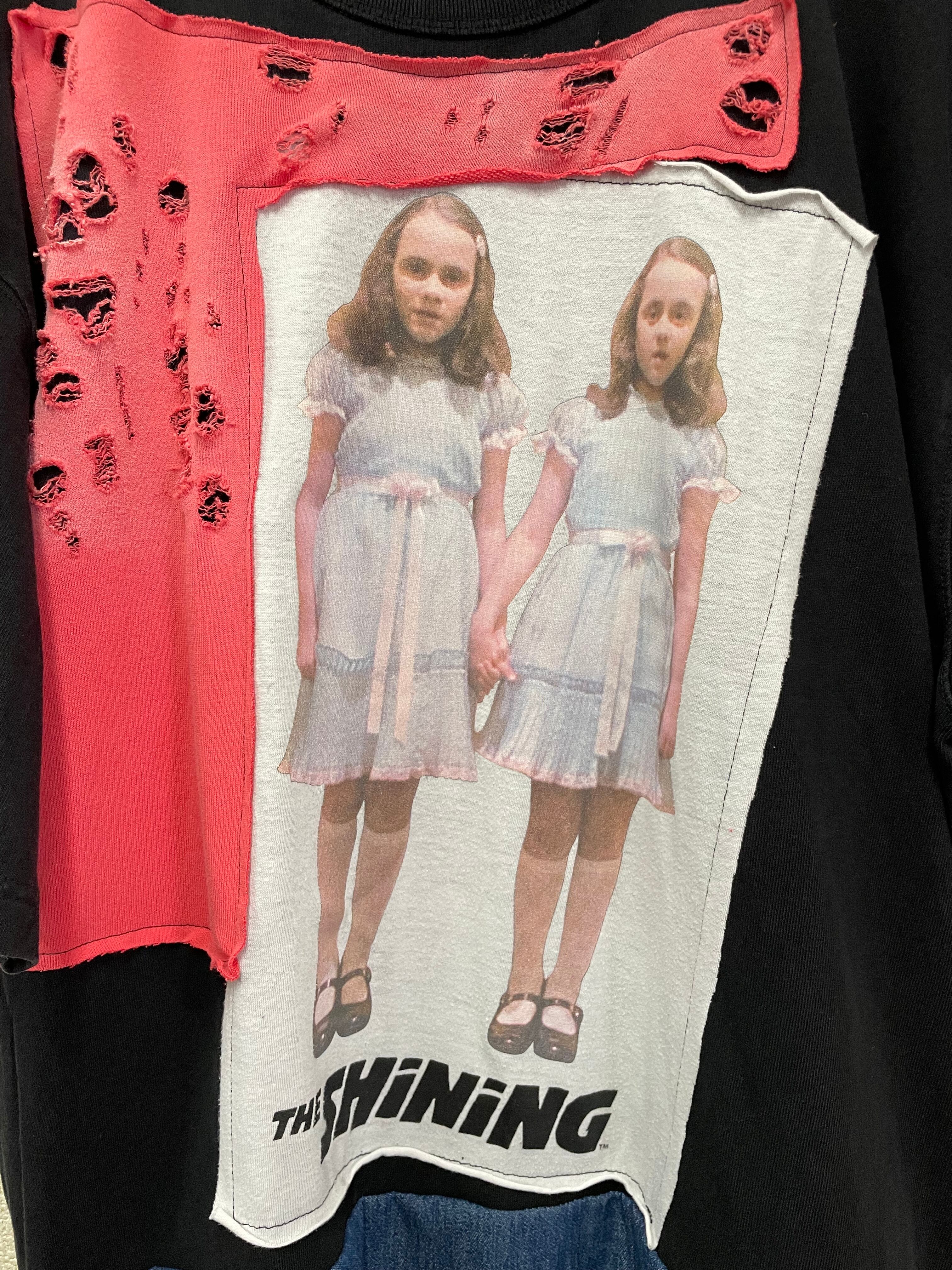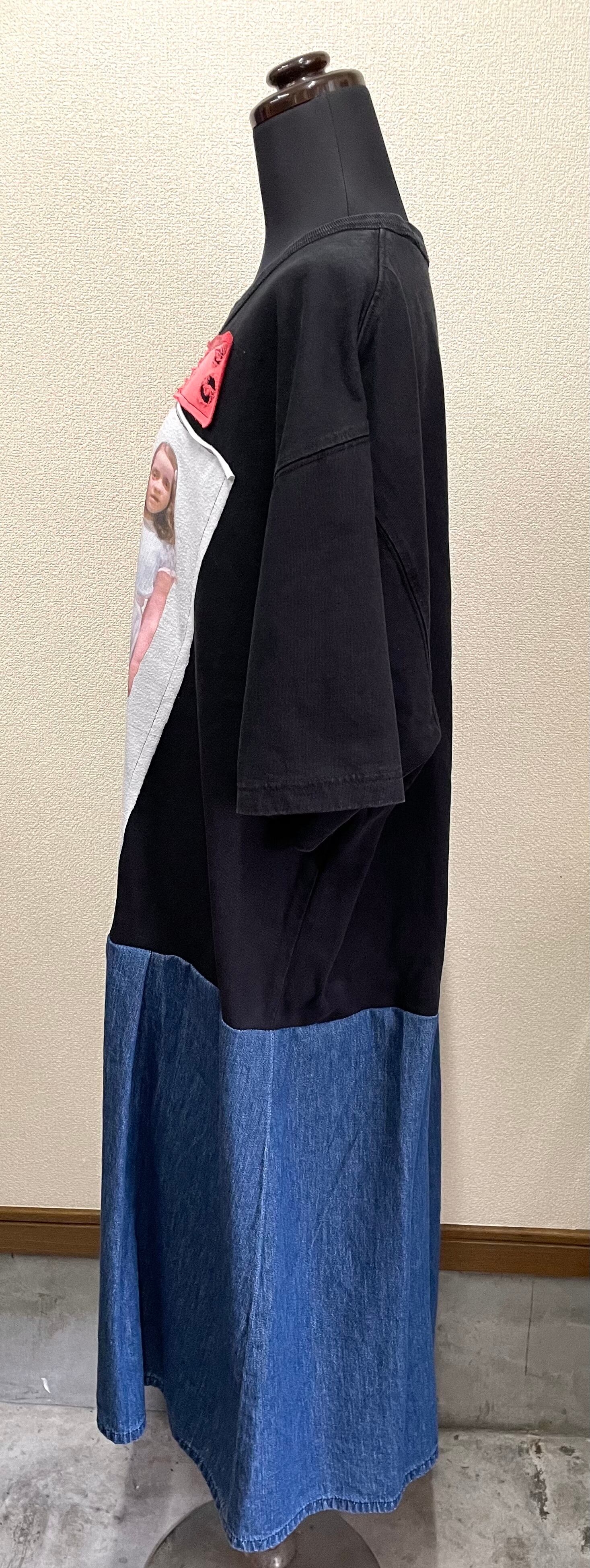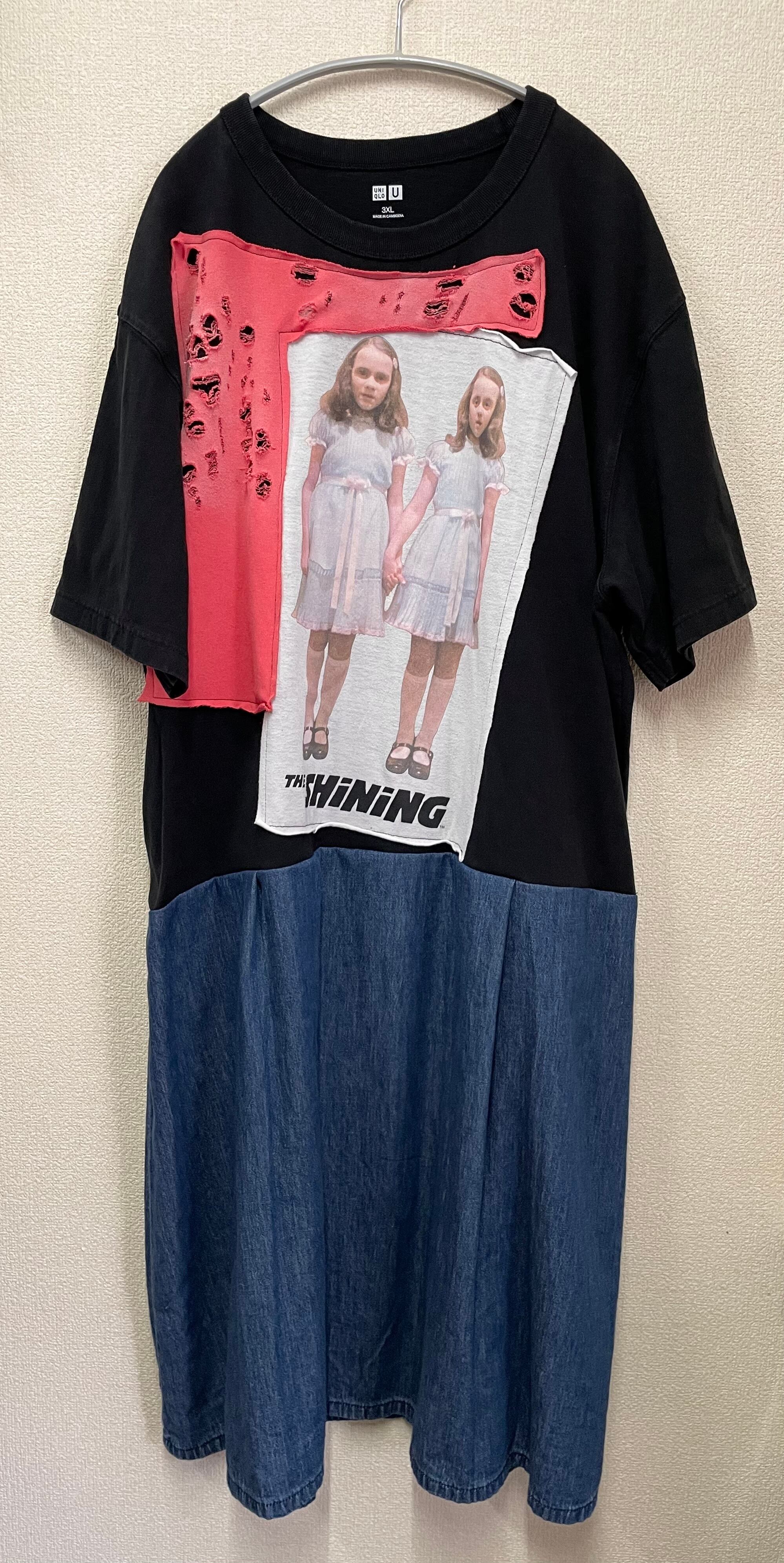 黒Tシャツにかわいい双子とマシンガン痕みたいなやつを縫いつけ、デニムスカートを合わせています♬