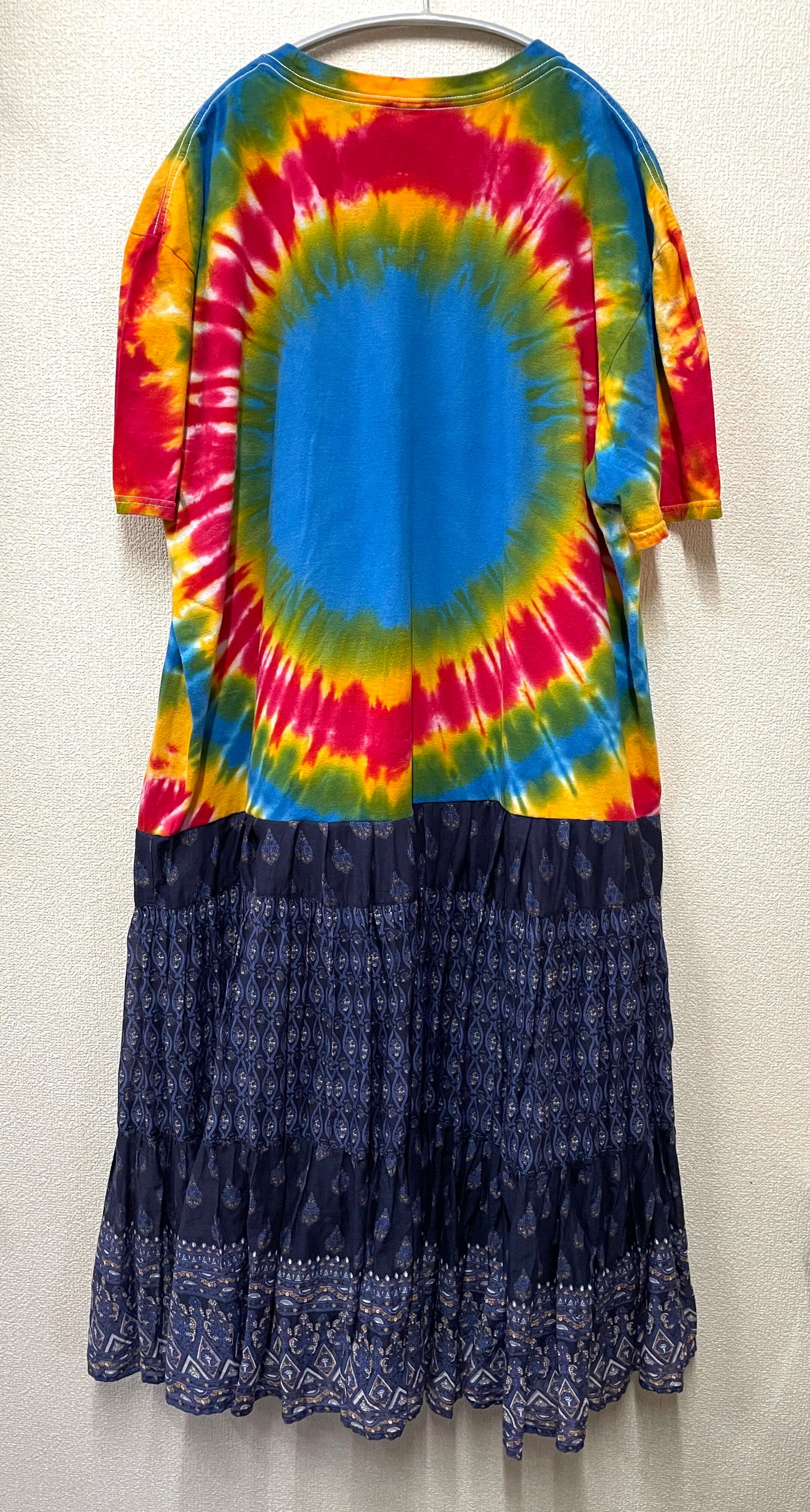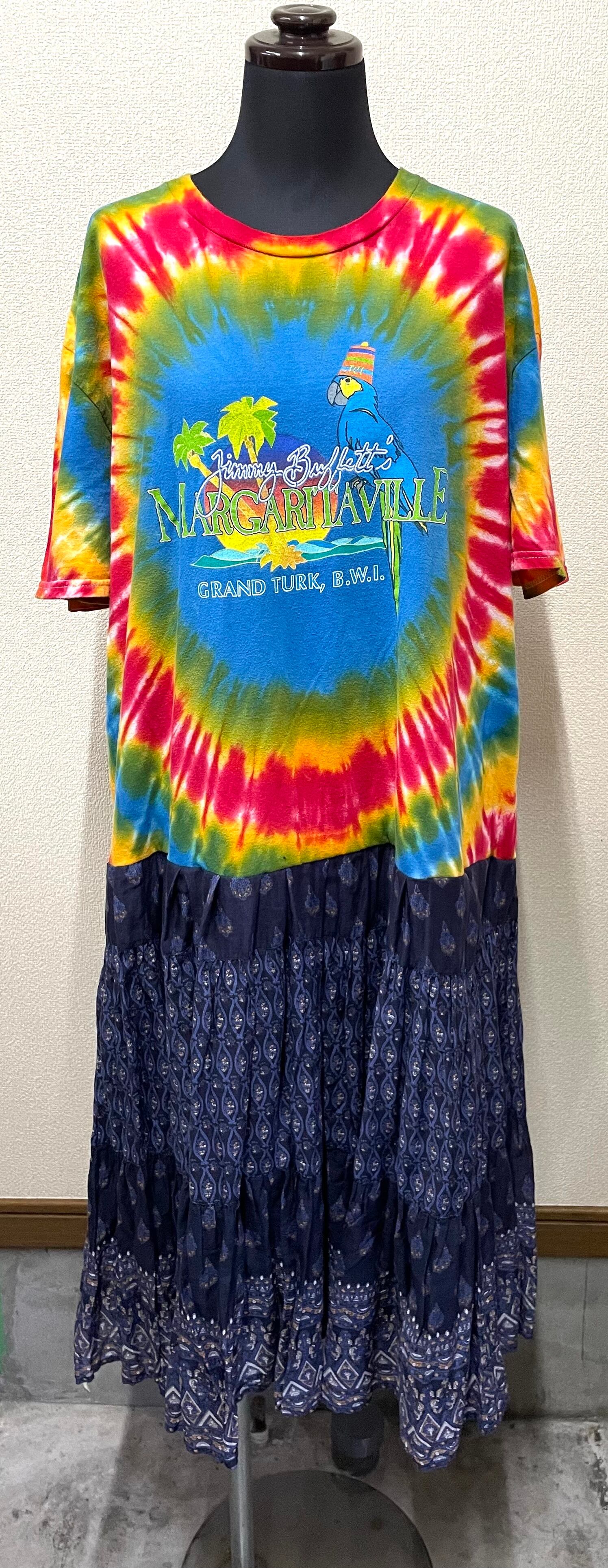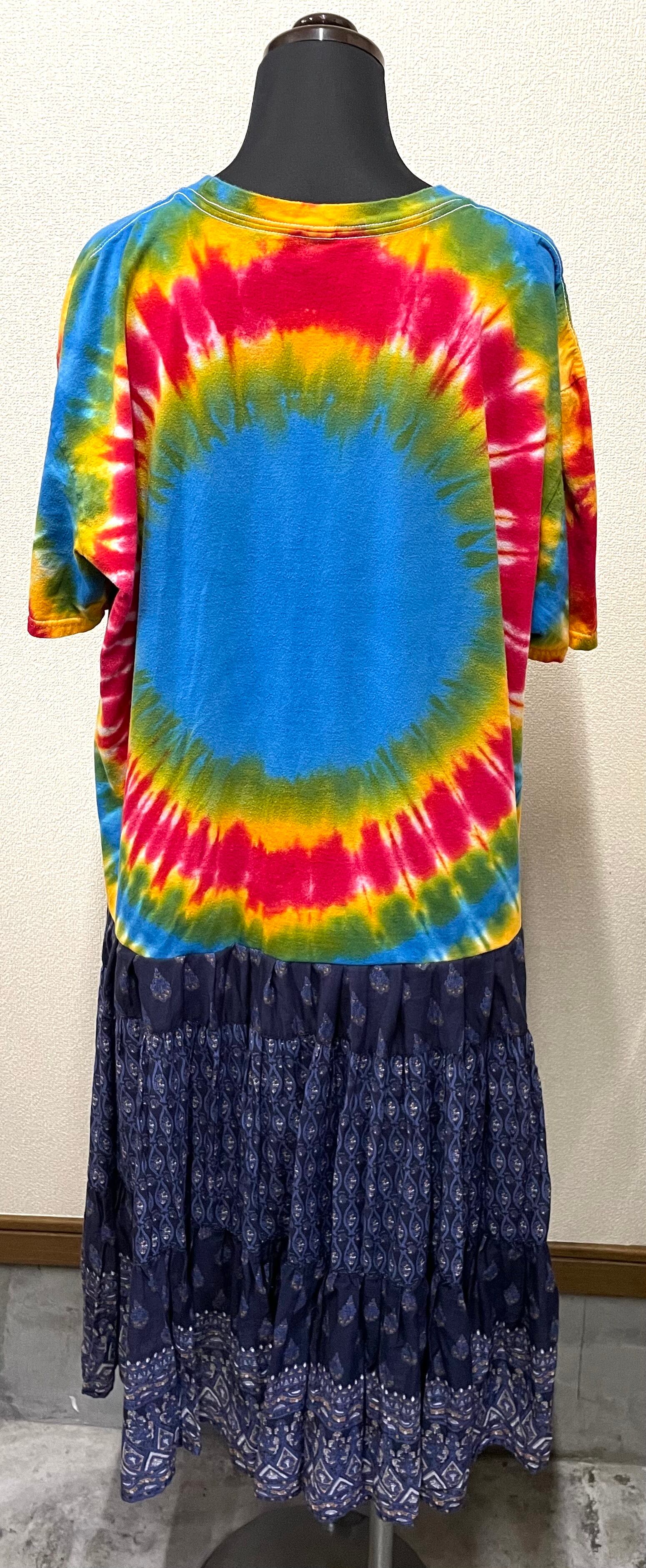 帽子を被ったオウムのカラフルタイダイTシャツに、インド綿のネイビー柄スカートを合わせています♬
