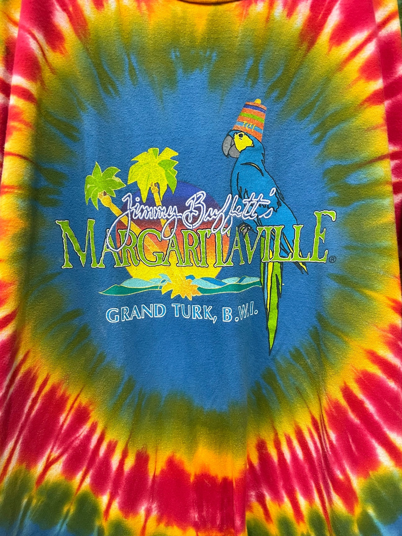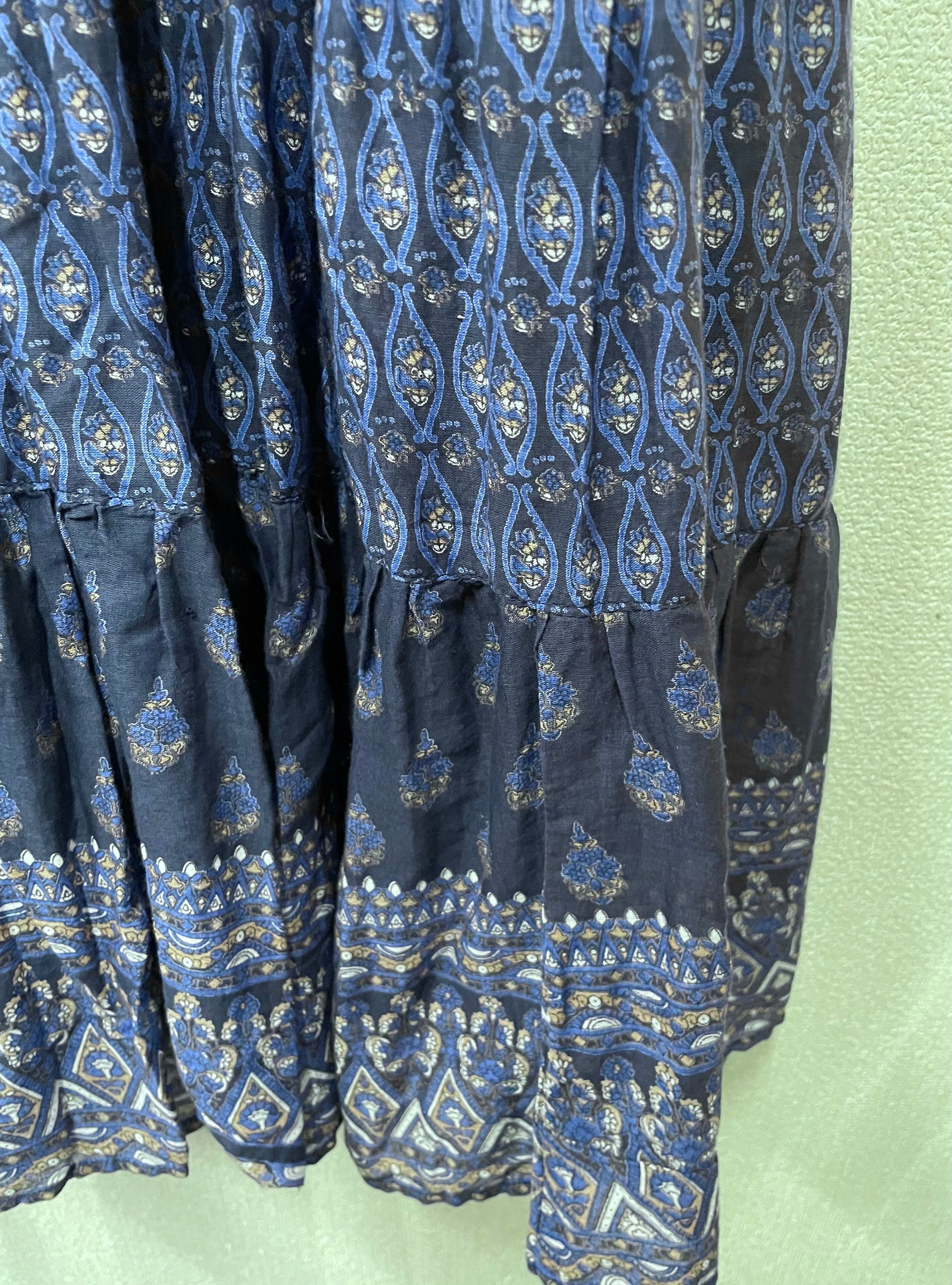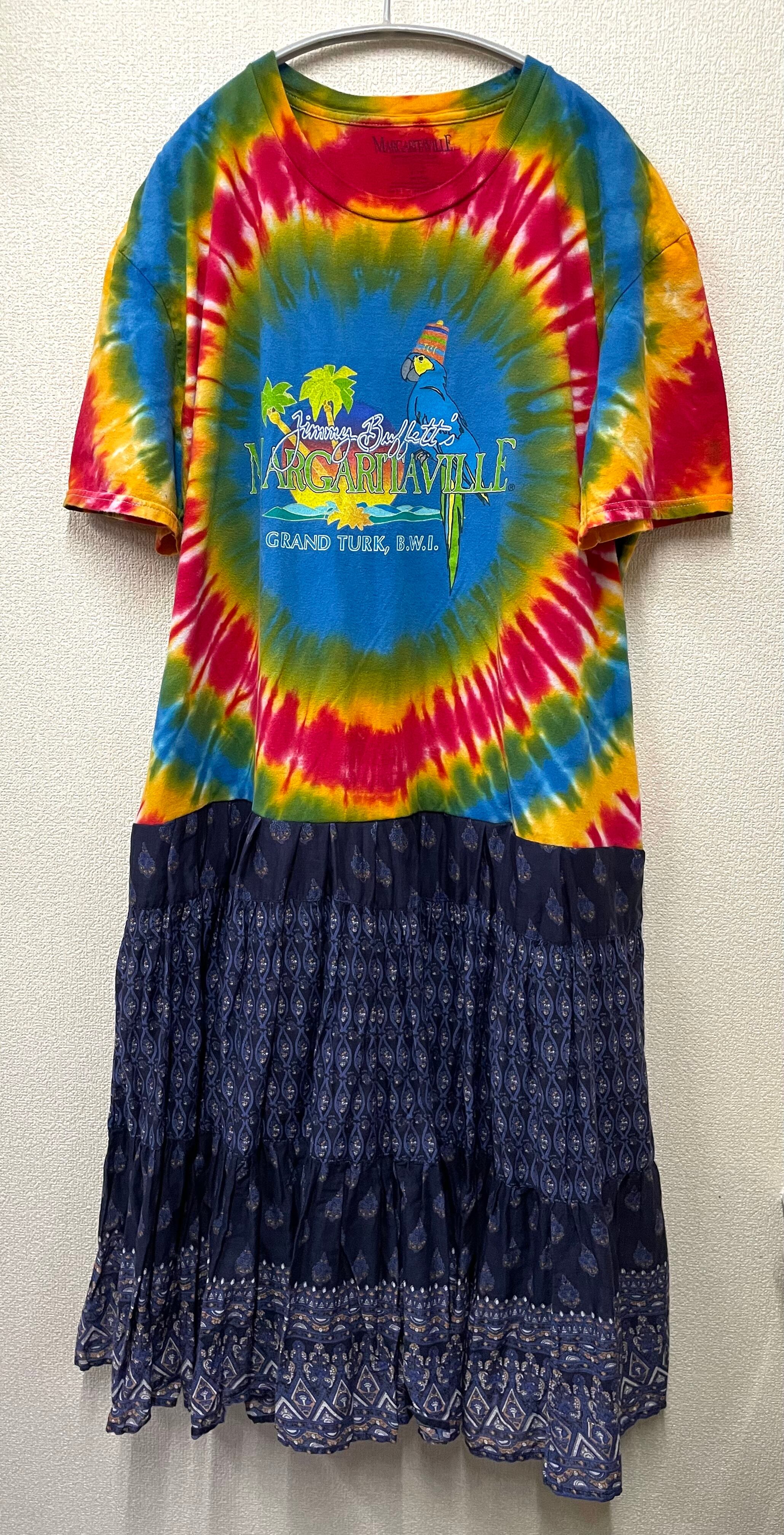 帽子を被ったオウムのカラフルタイダイTシャツに、インド綿のネイビー柄スカートを合わせています♬