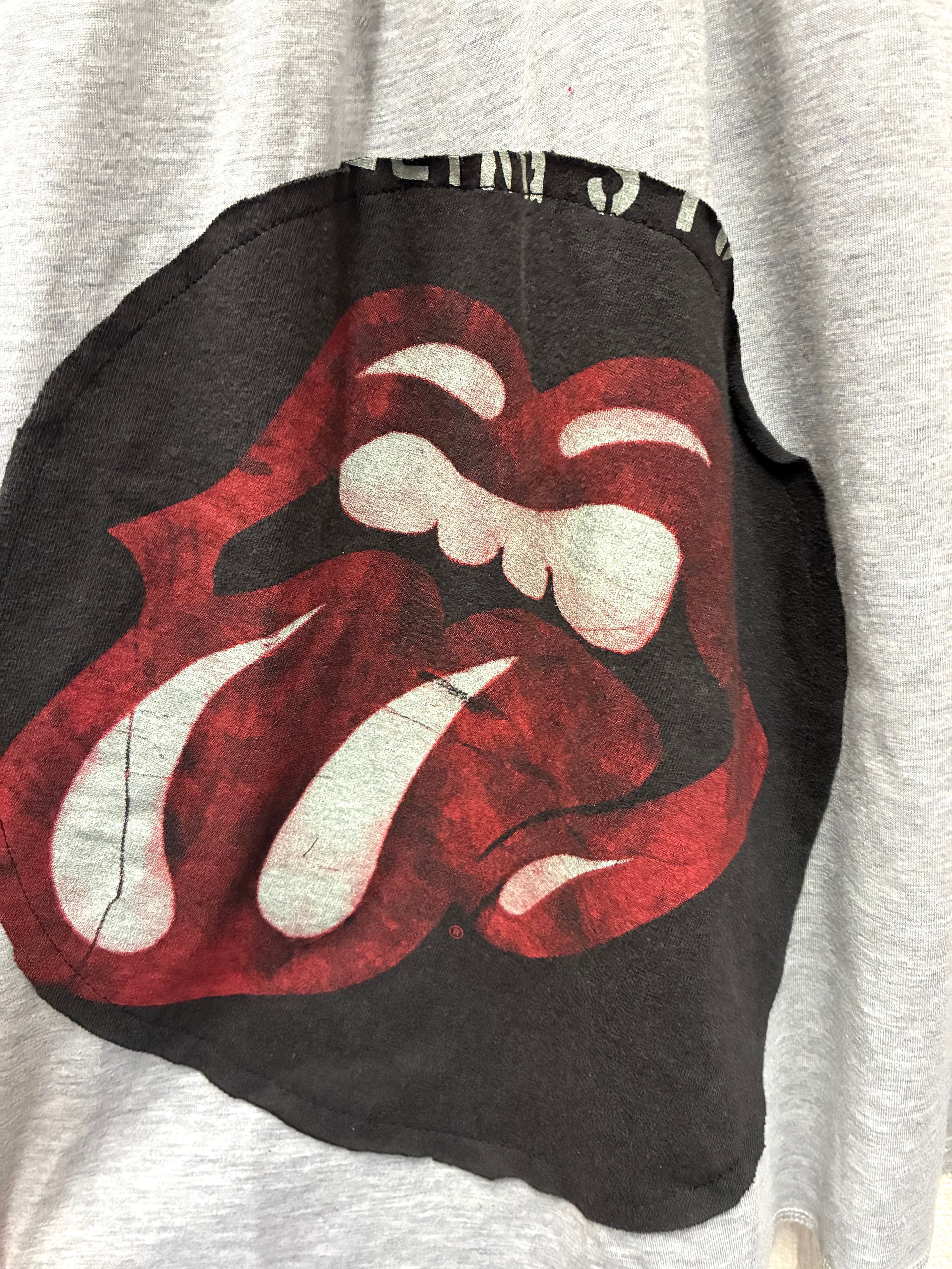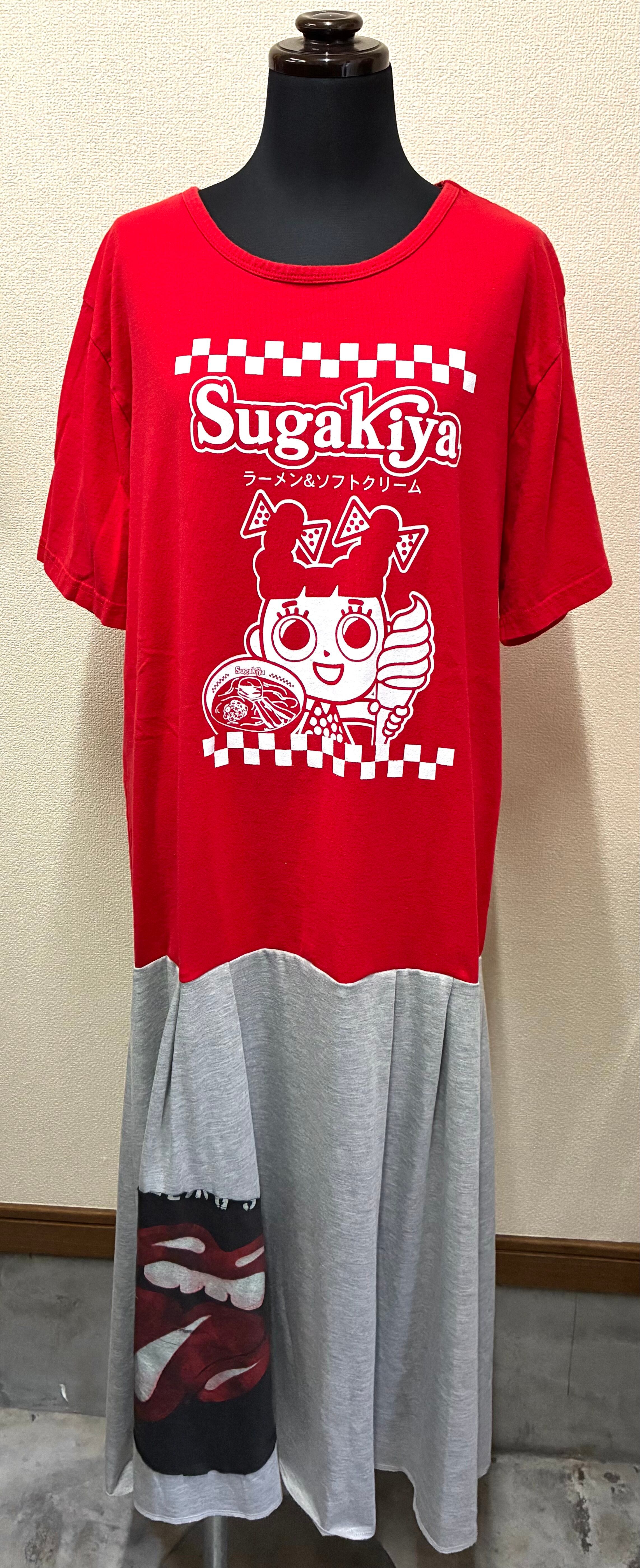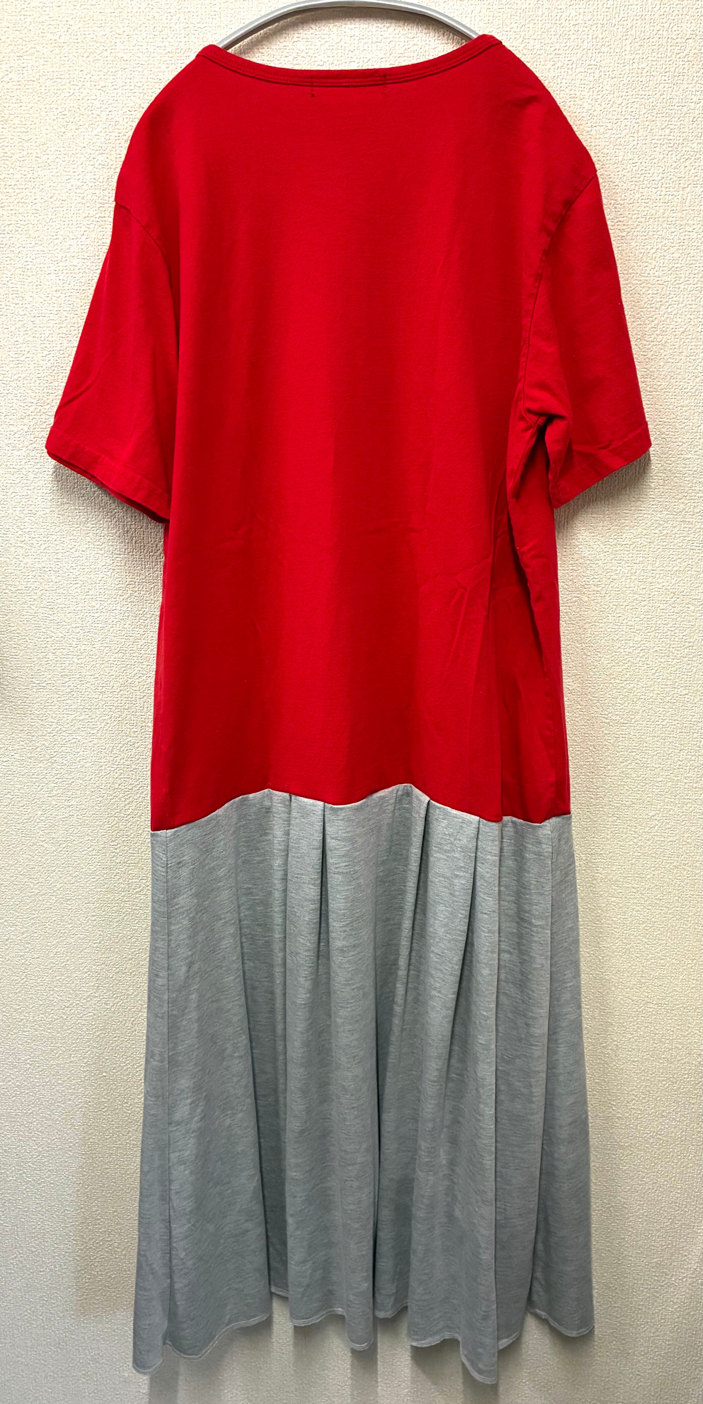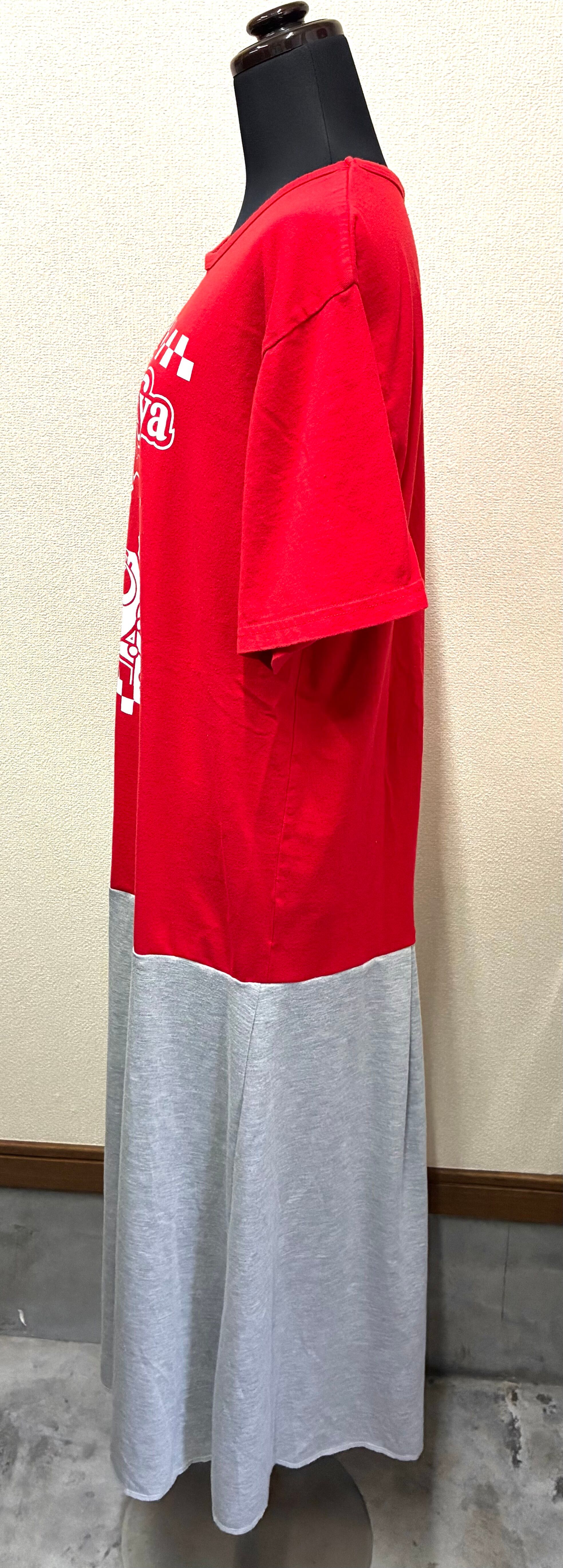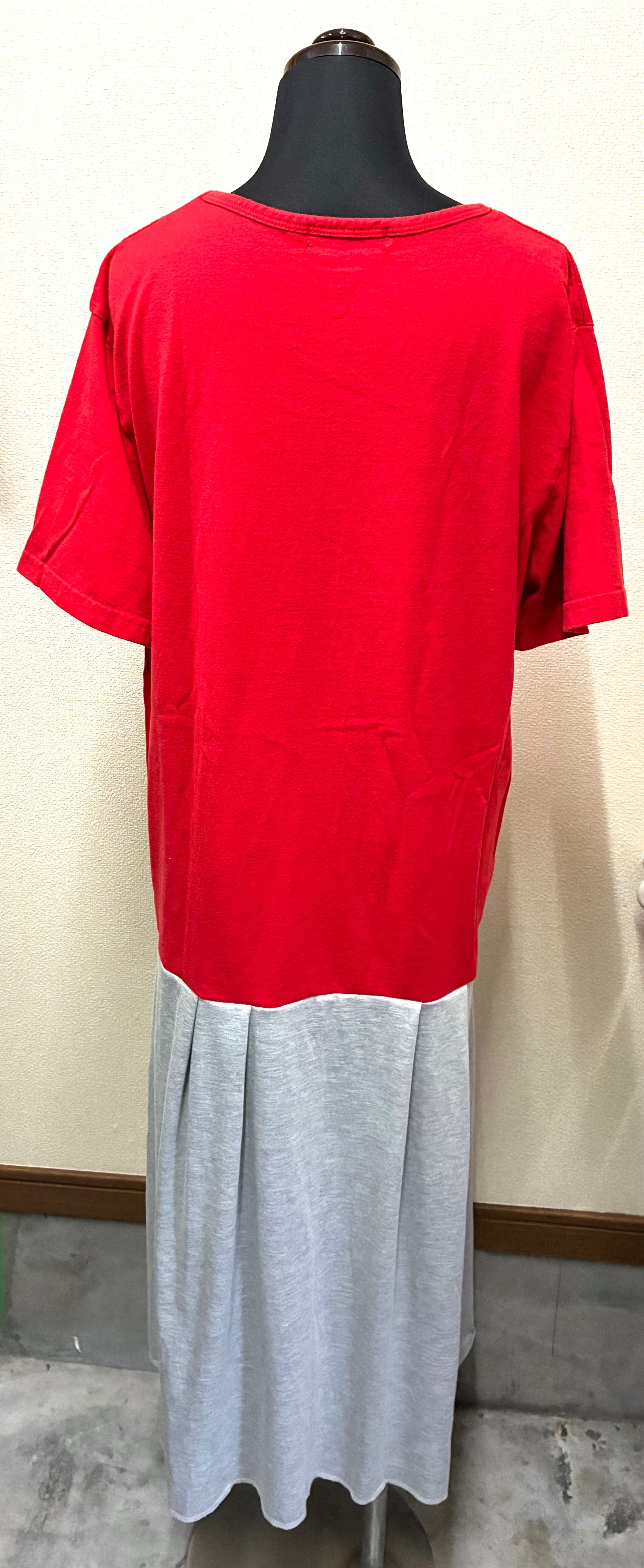 いかした赤Tシャツに、ベロを縫い付けたグレーのスカートを合わせています♬