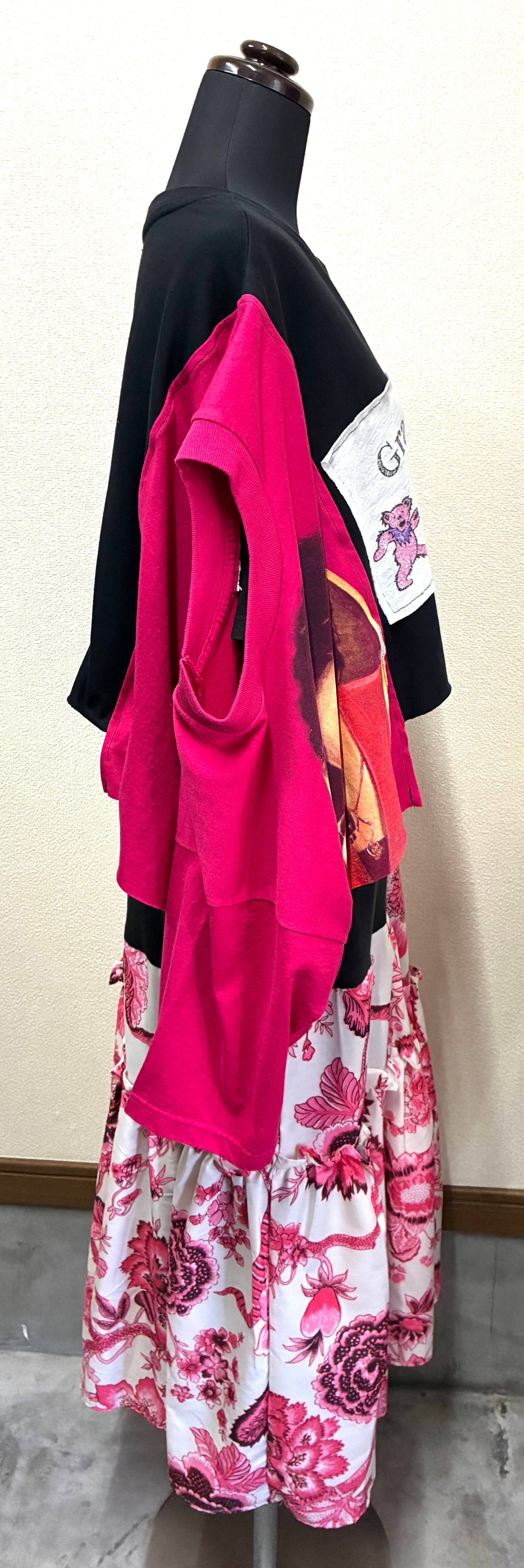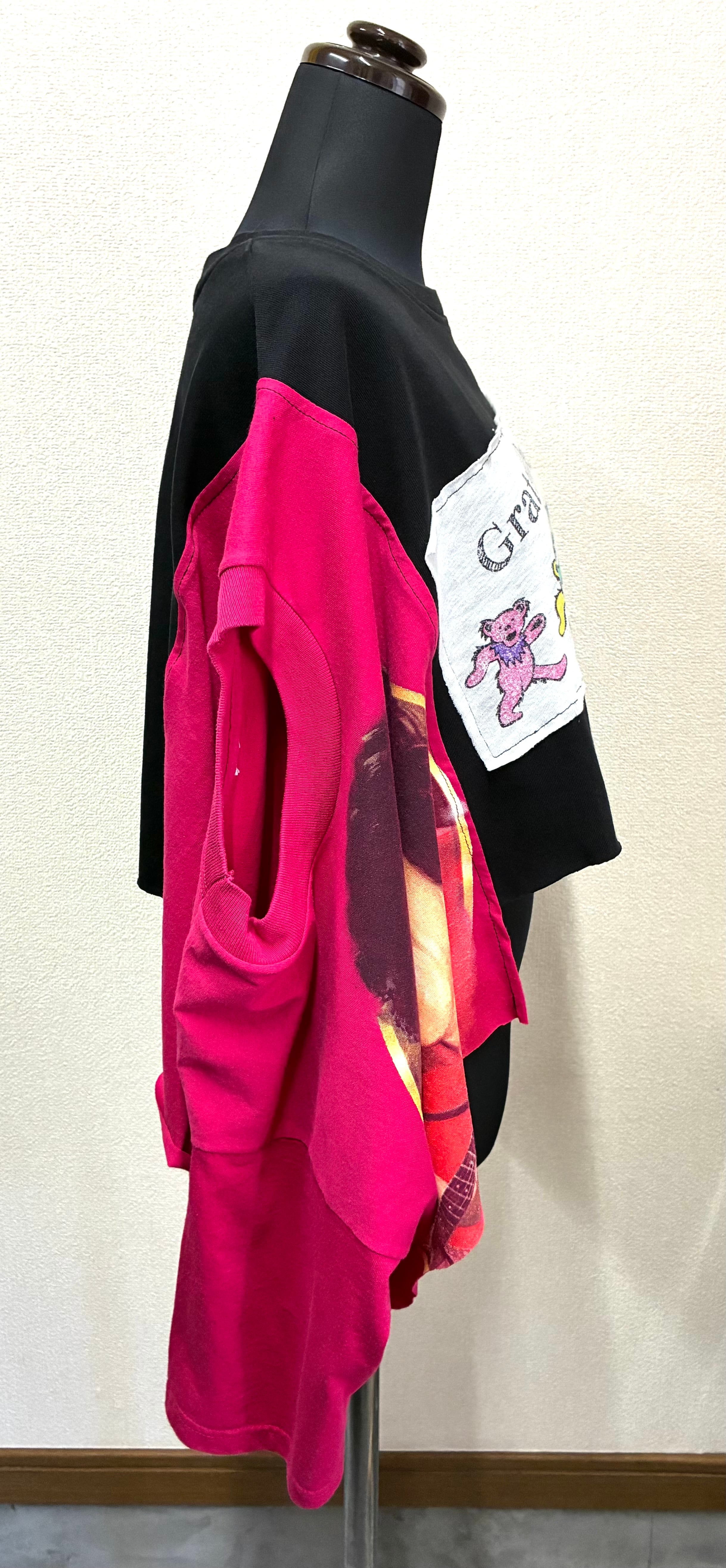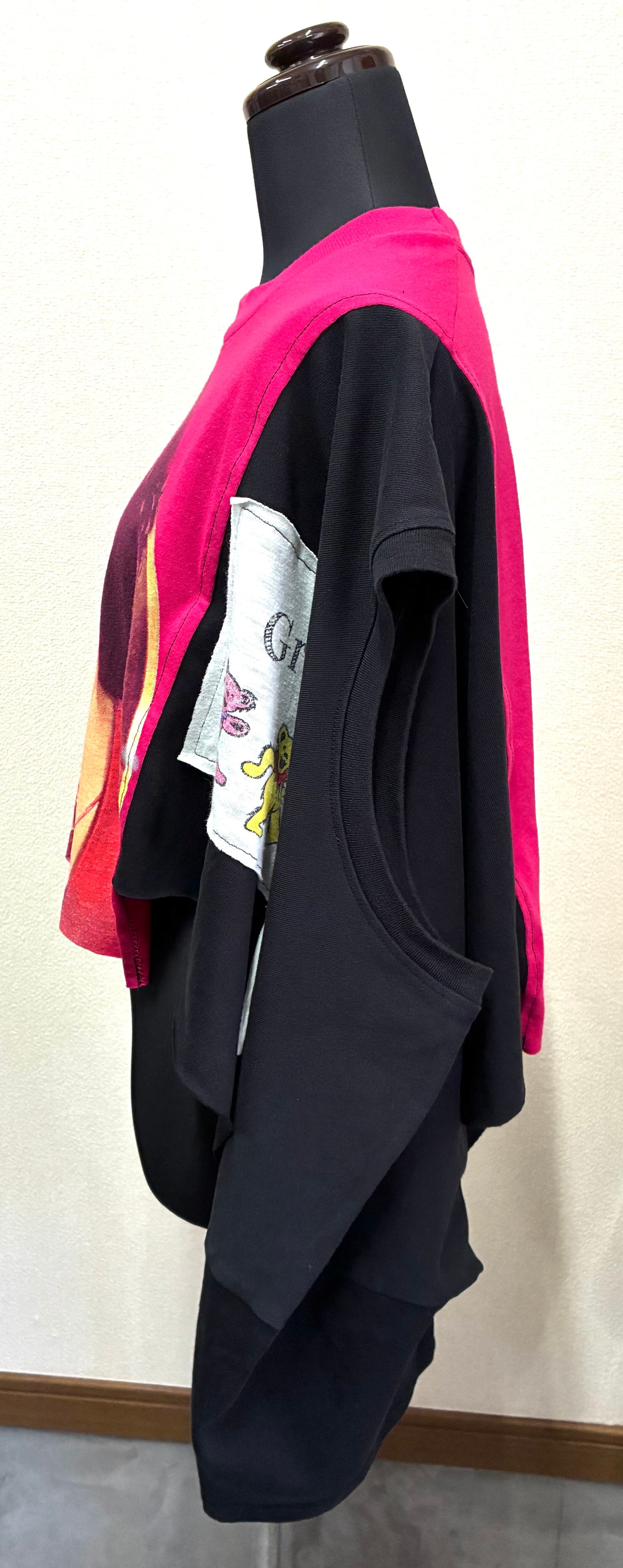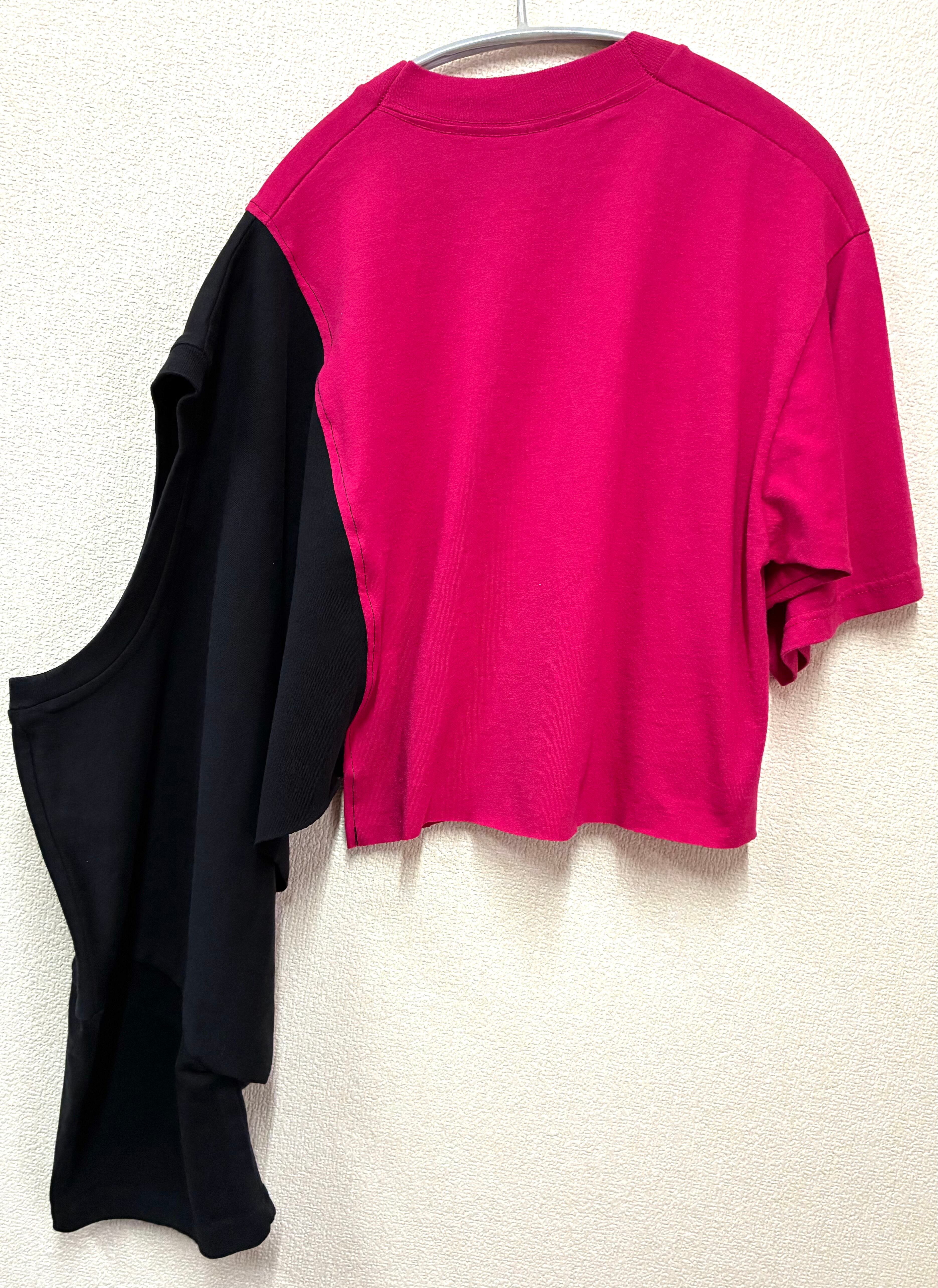 かっこいいローズピンクTシャツに、かわいいくまさんを縫い付けた黒Tシャツを合体させてます♬