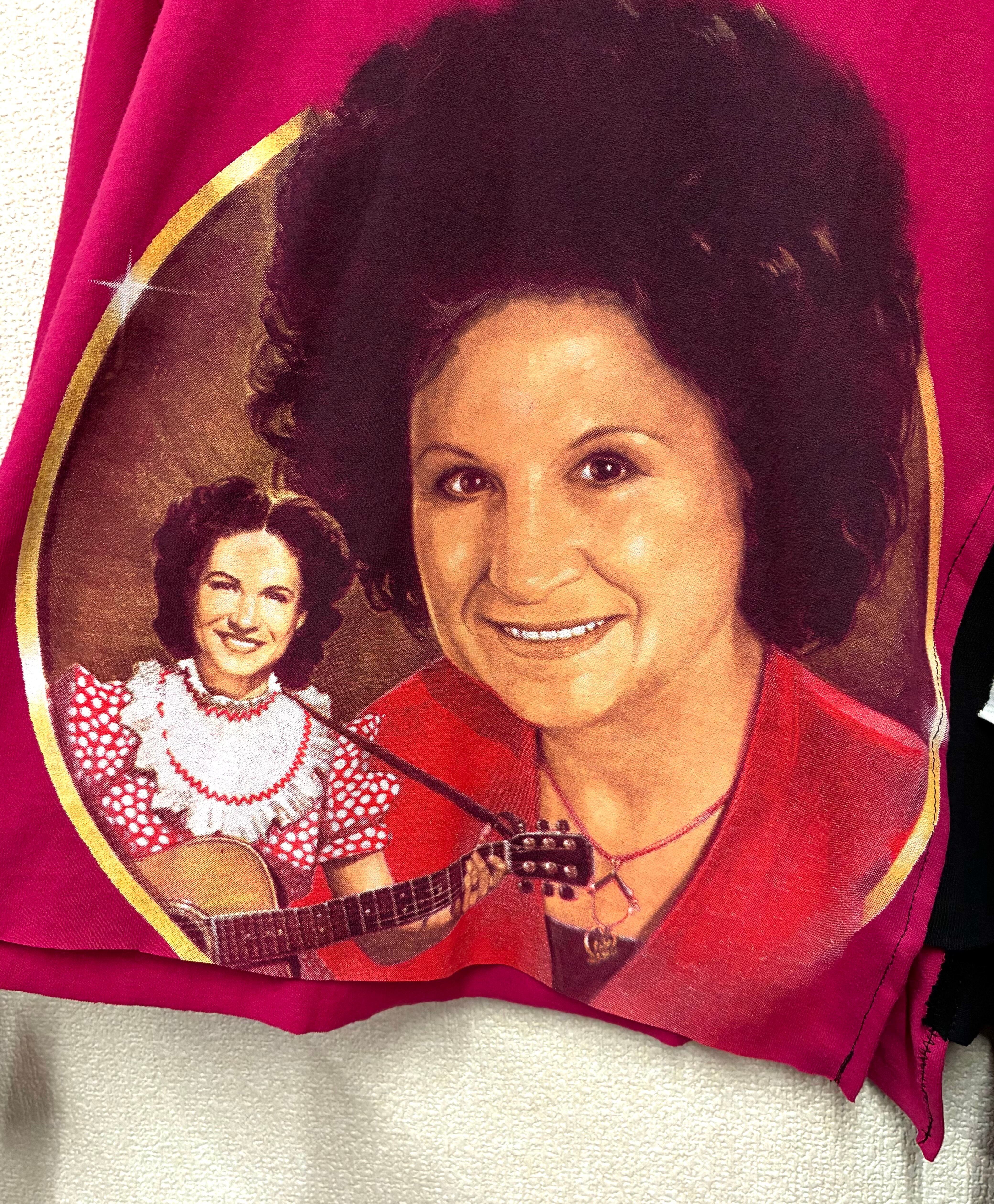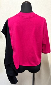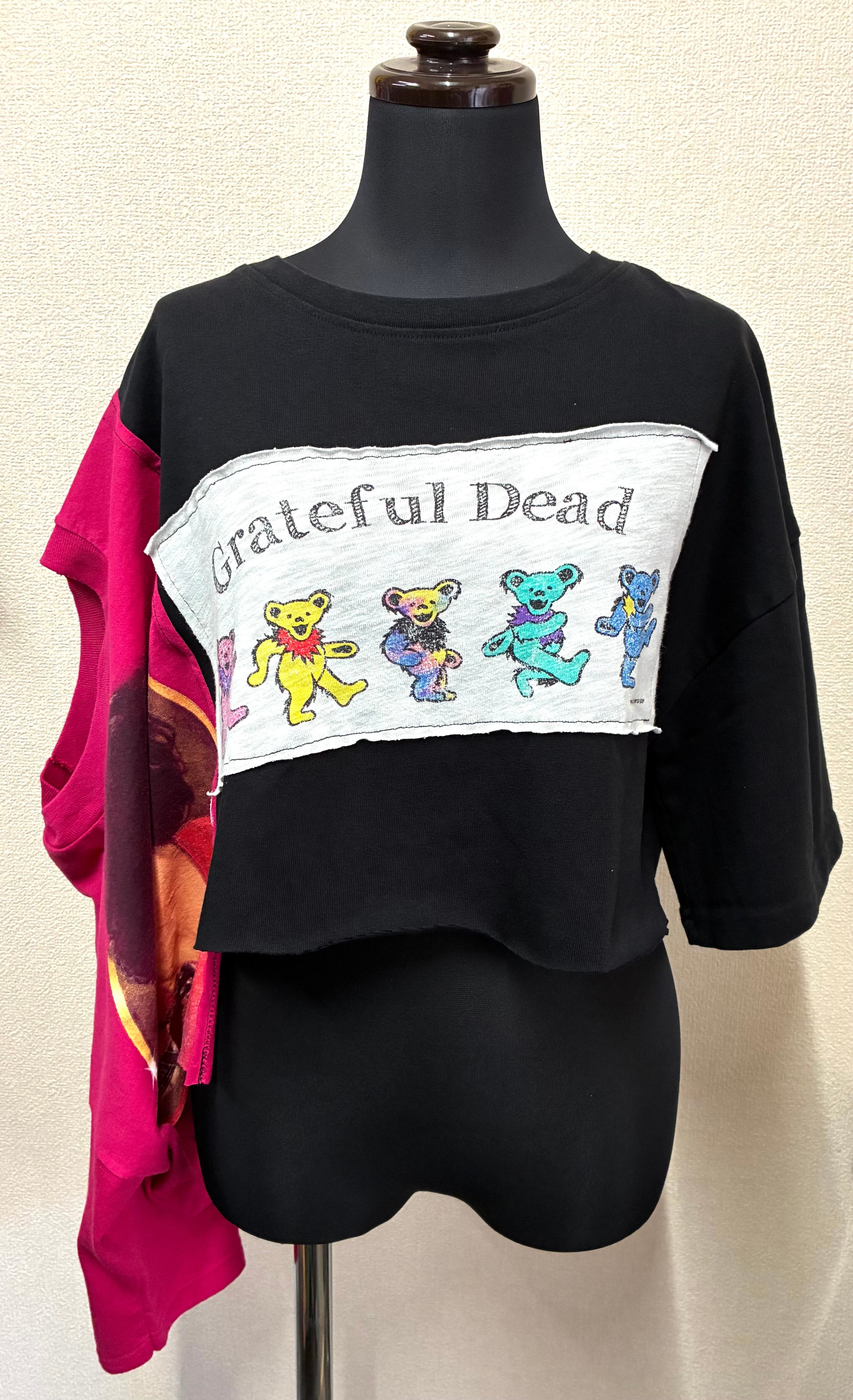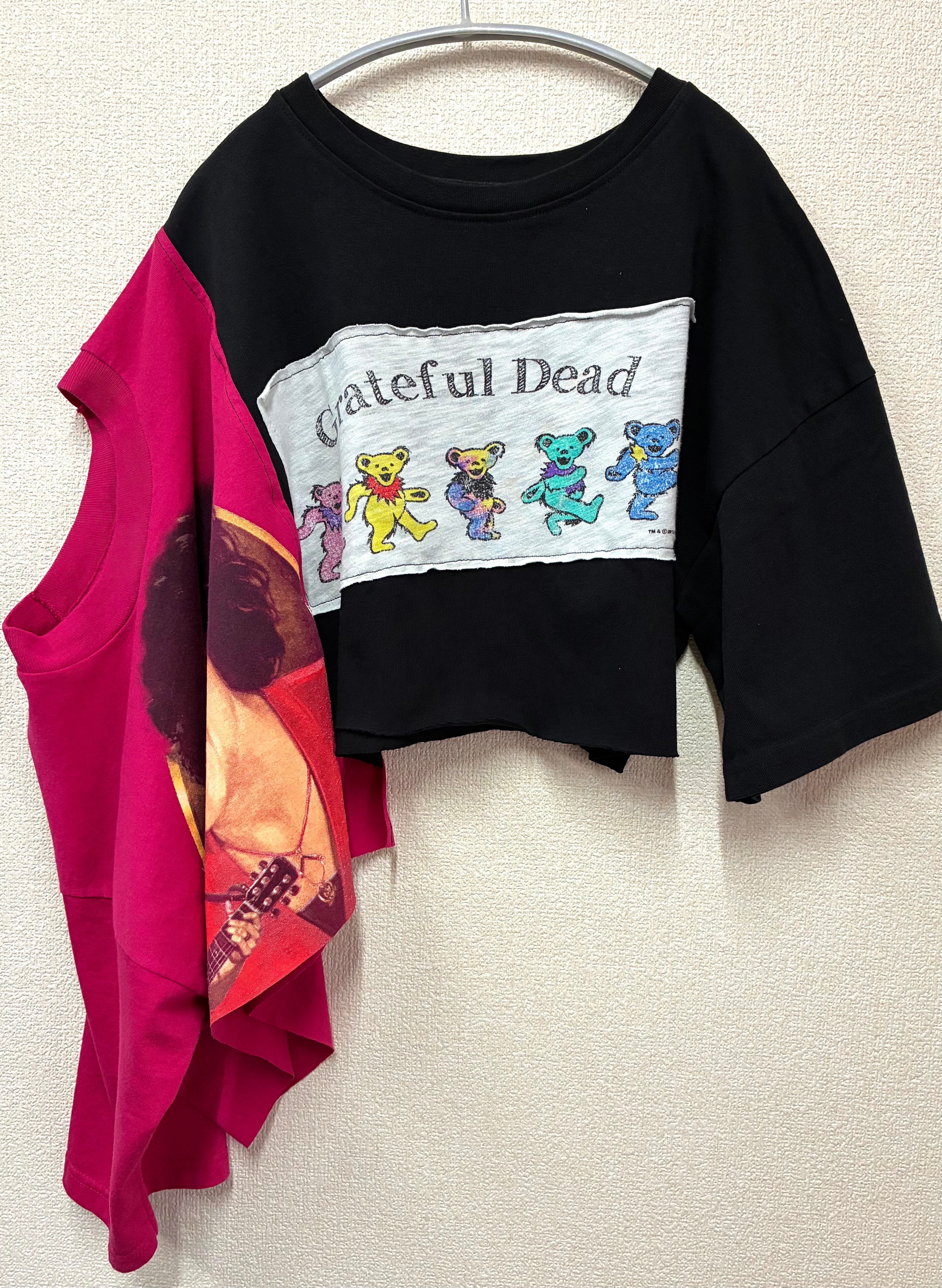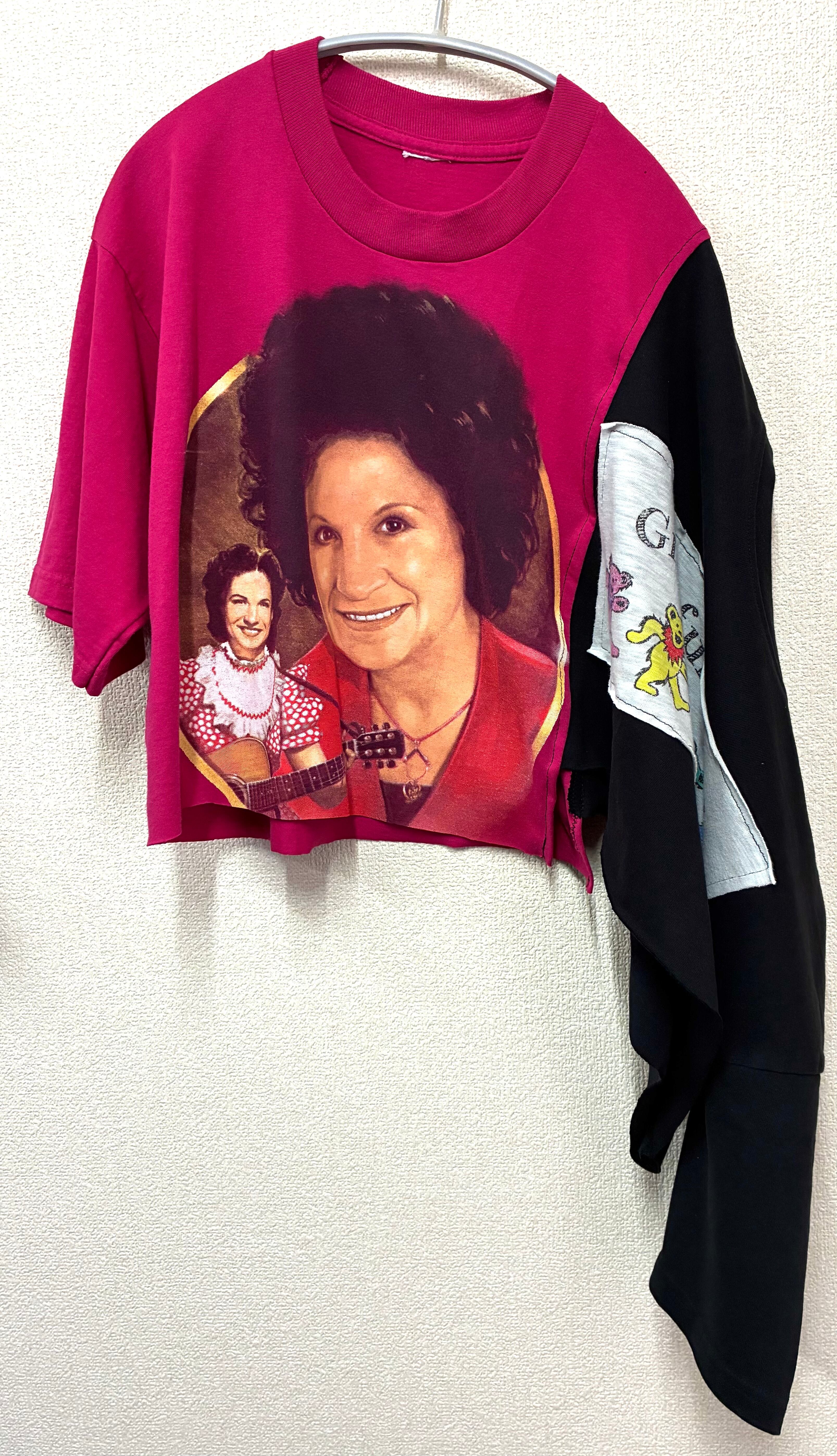 かっこいいローズピンクTシャツに、かわいいくまさんを縫い付けた黒Tシャツを合体させてます♬