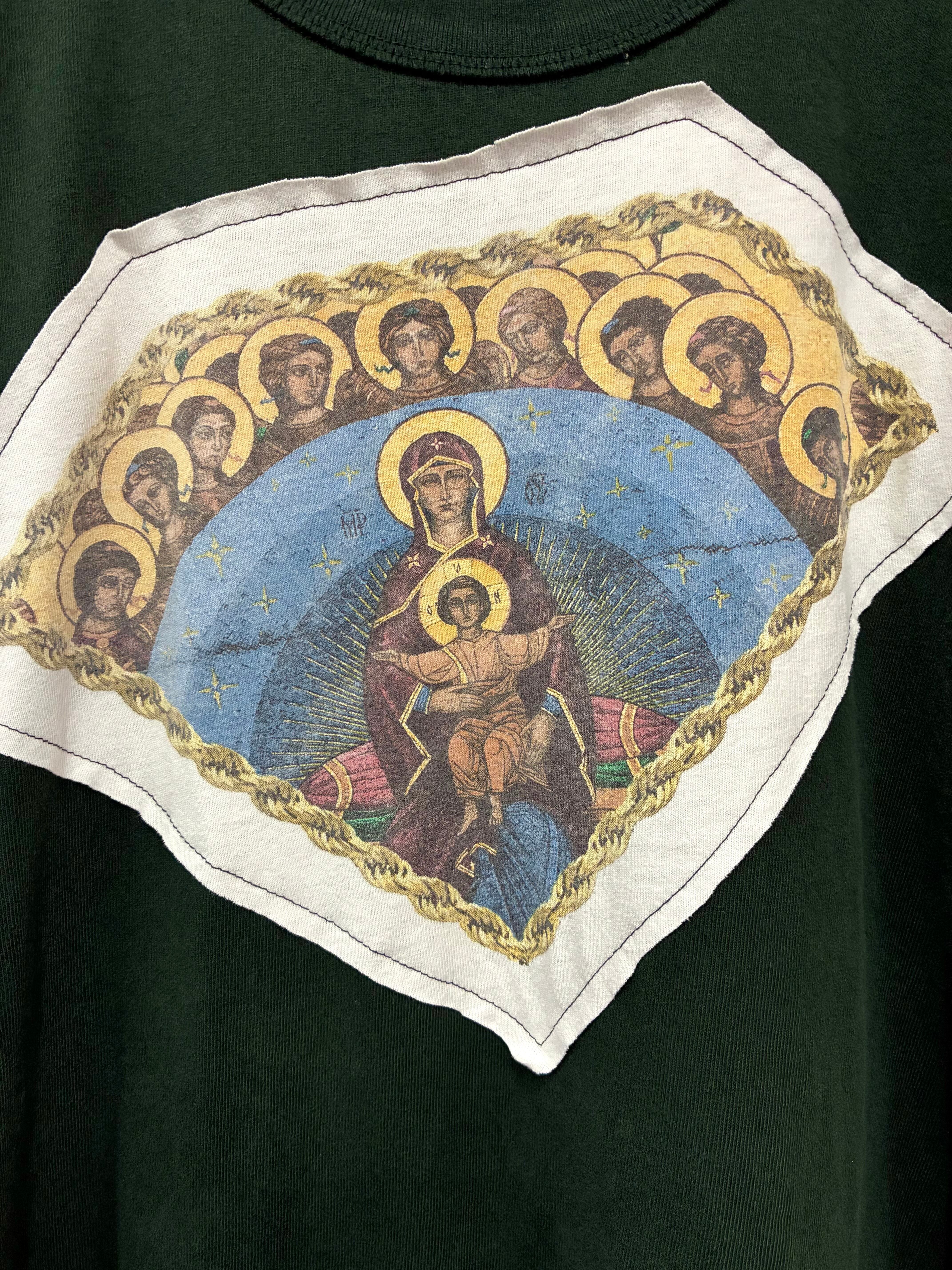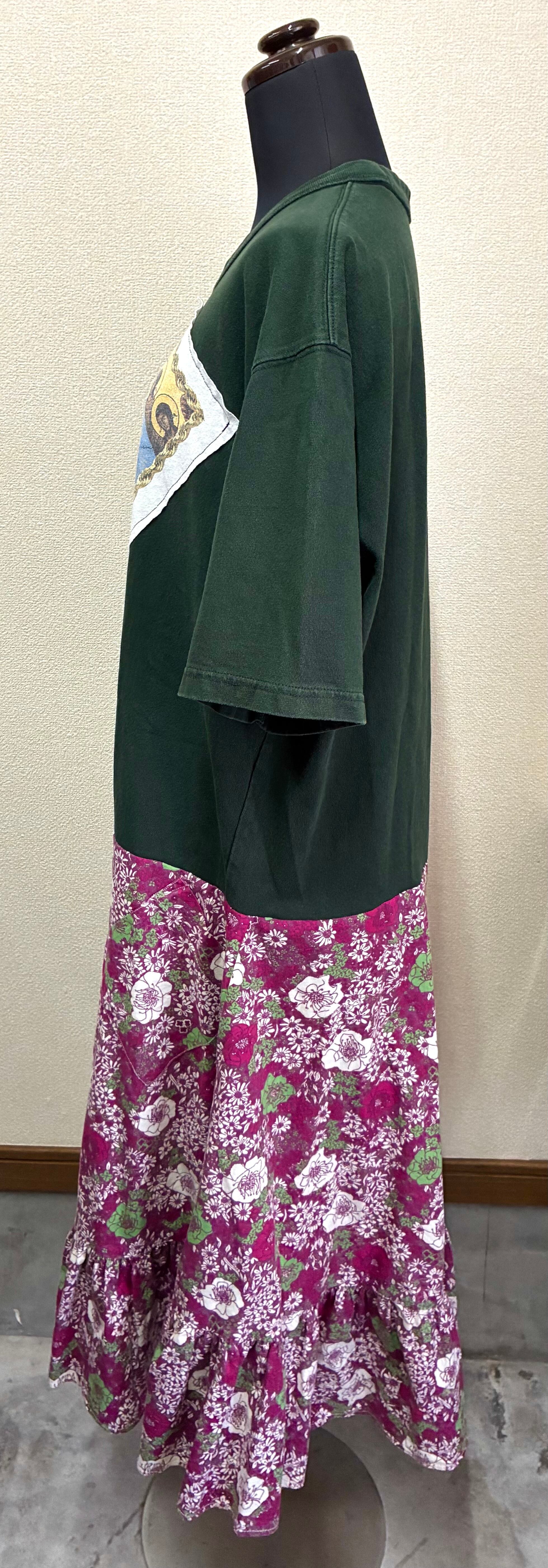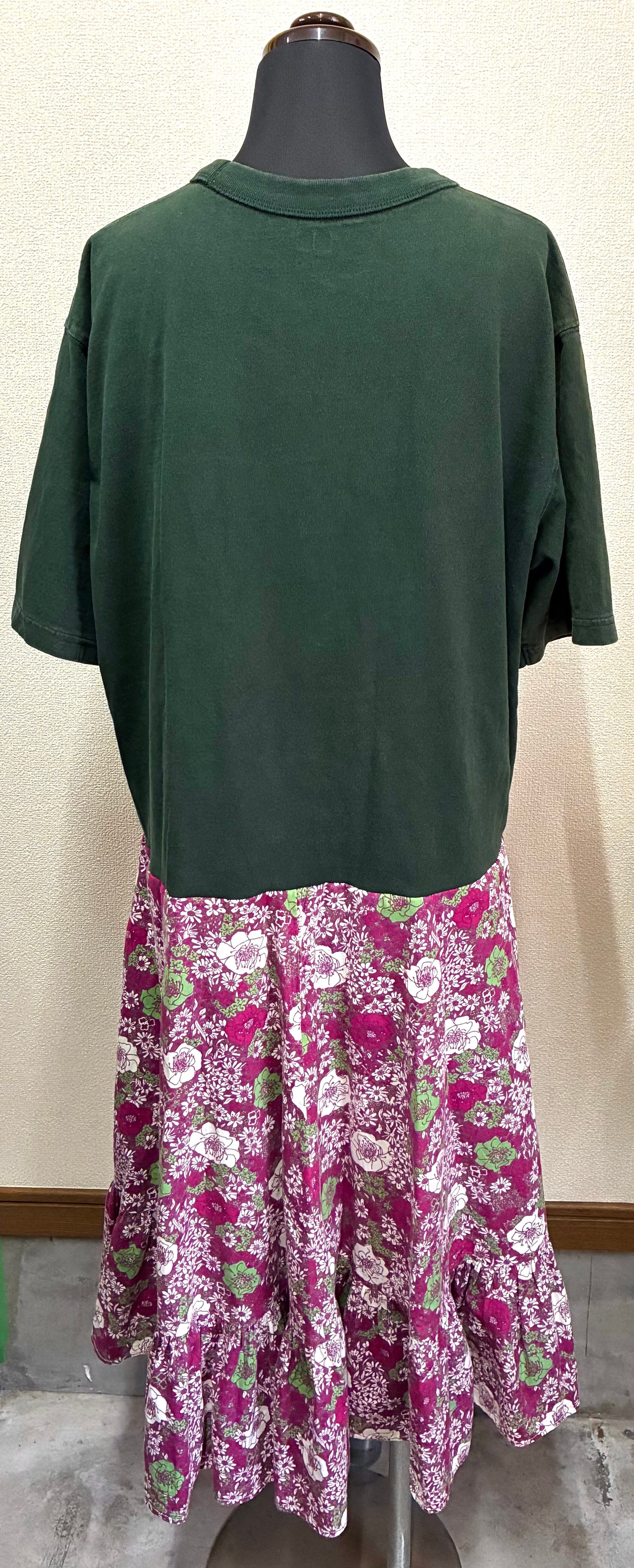 深緑Tシャツにかわいい絵を縫いつけ、花柄スカートを合わせています♬