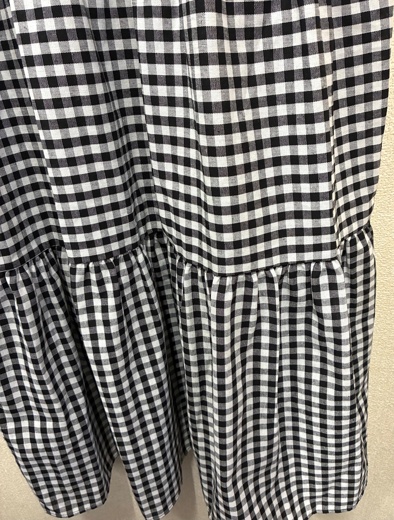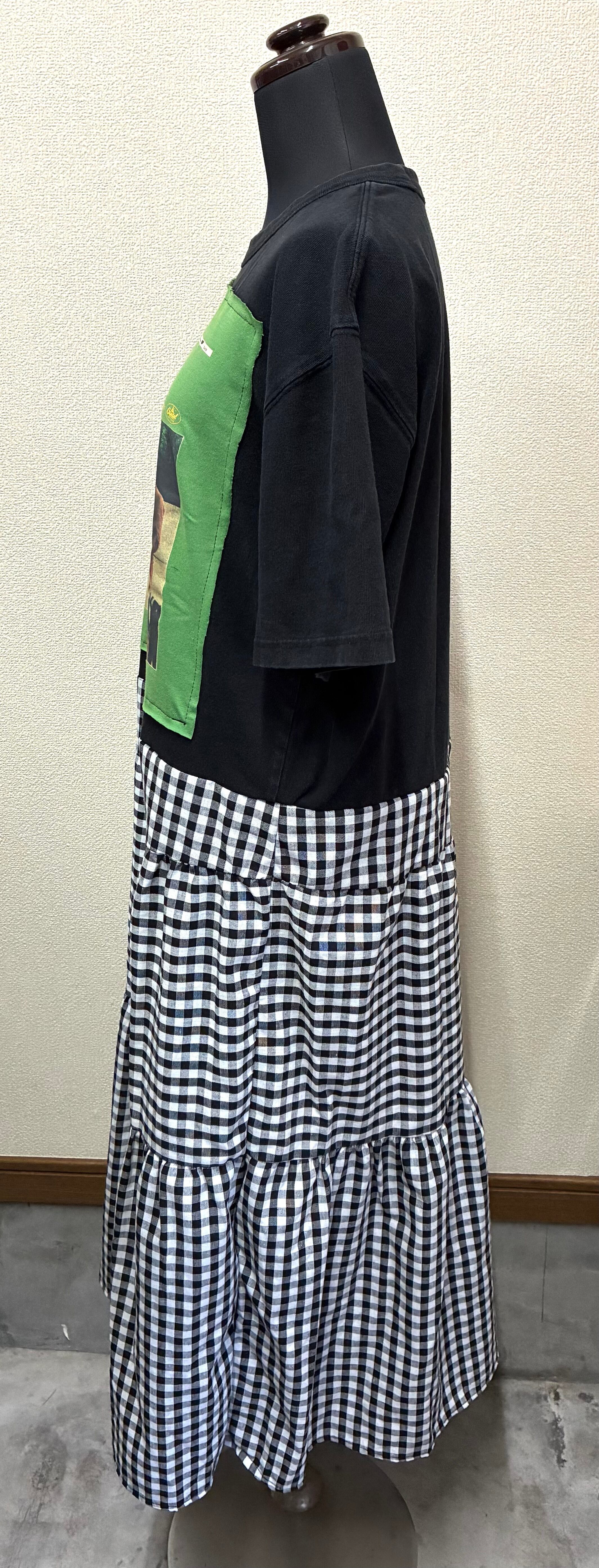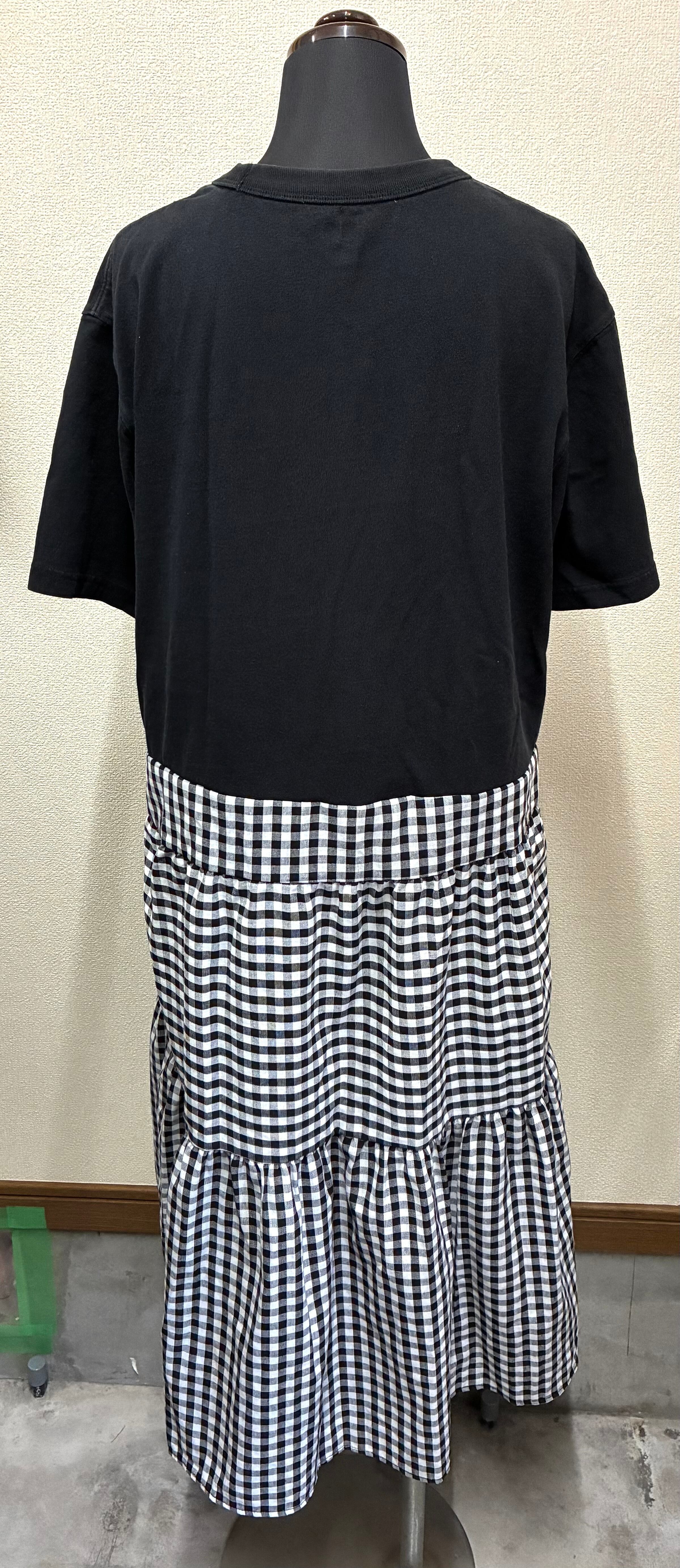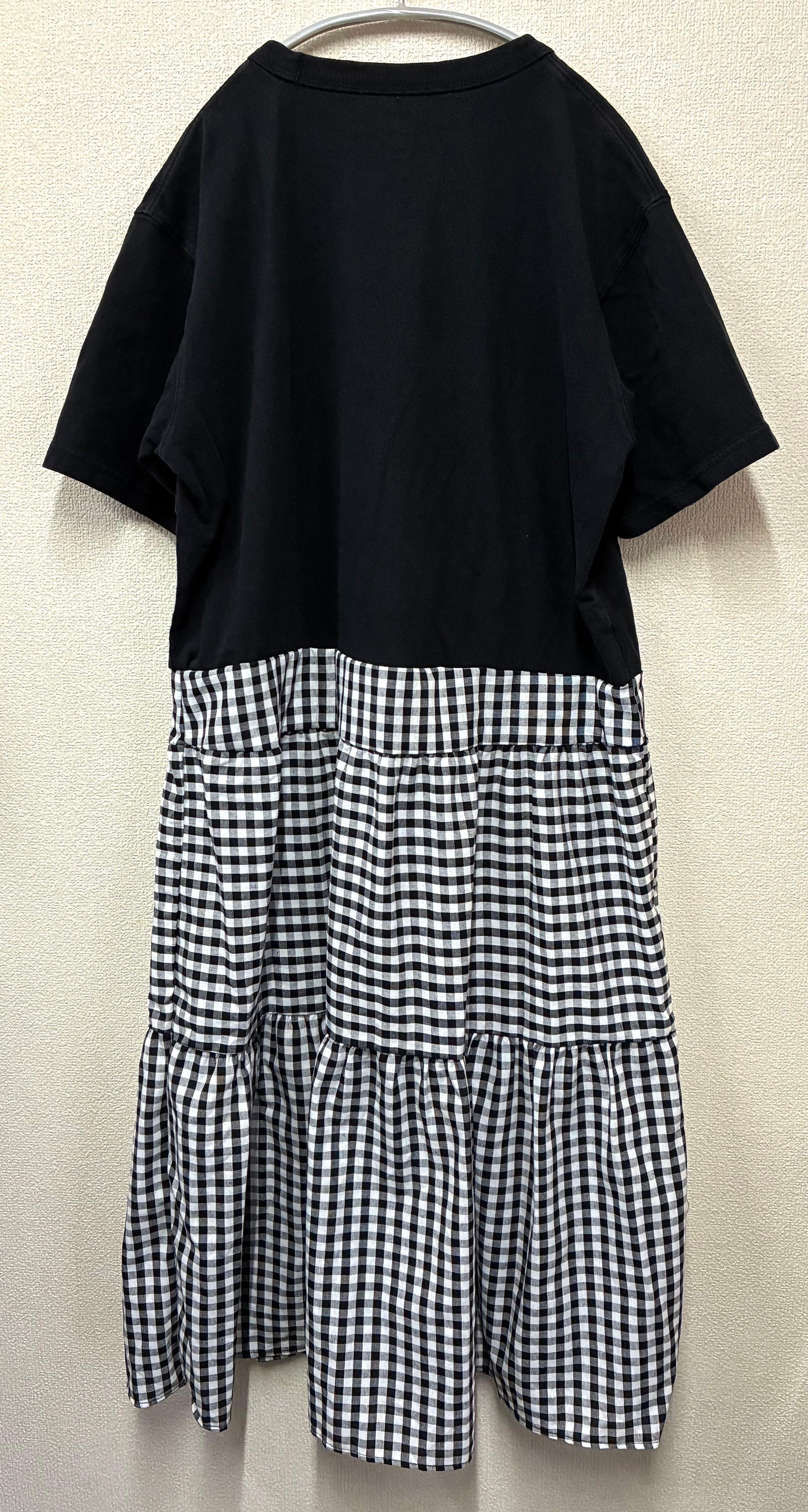 黒Tシャツにかわいい動物と人たちを縫いつけ、ギンガムチェックのスカートを合わせています♬