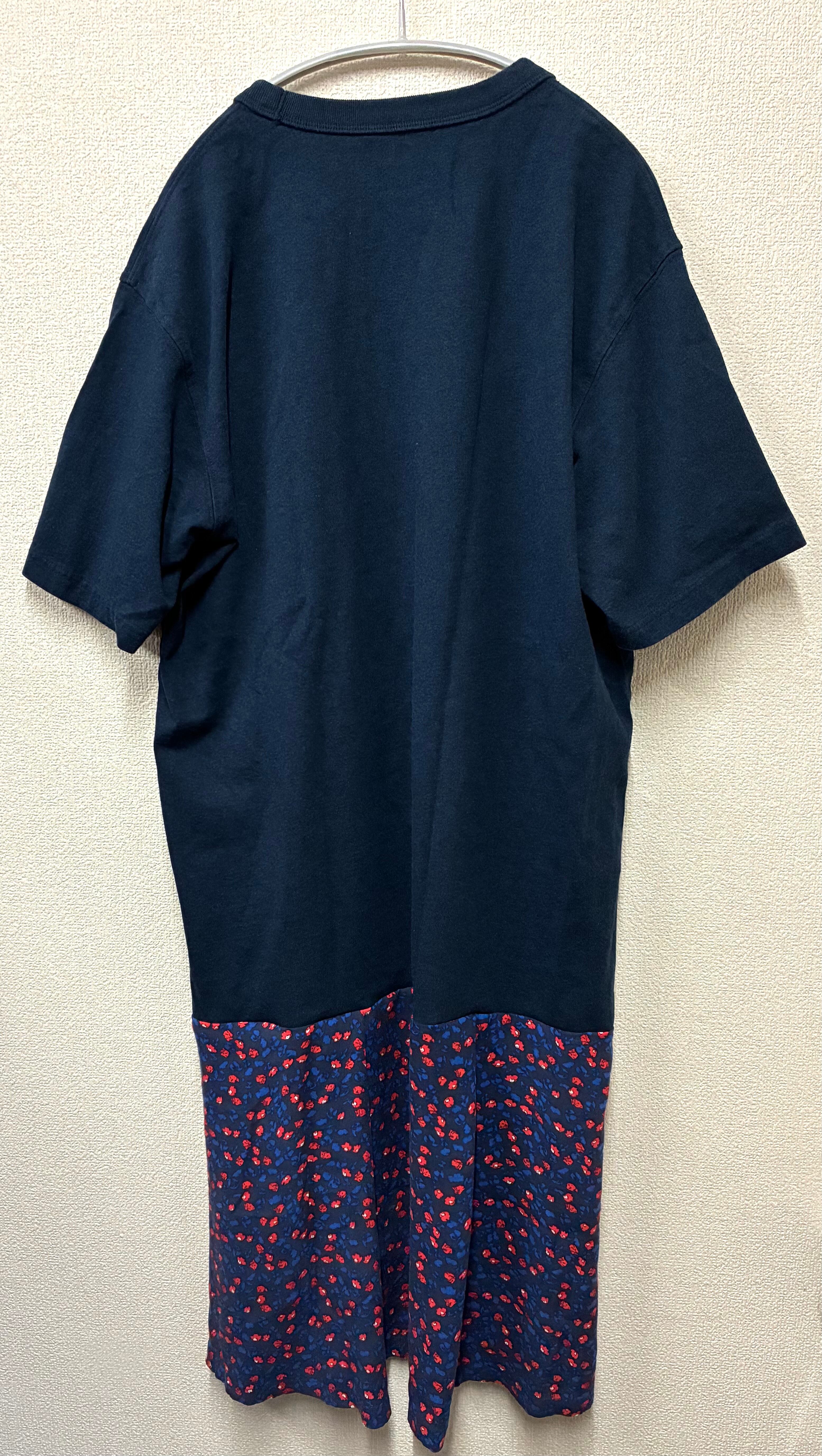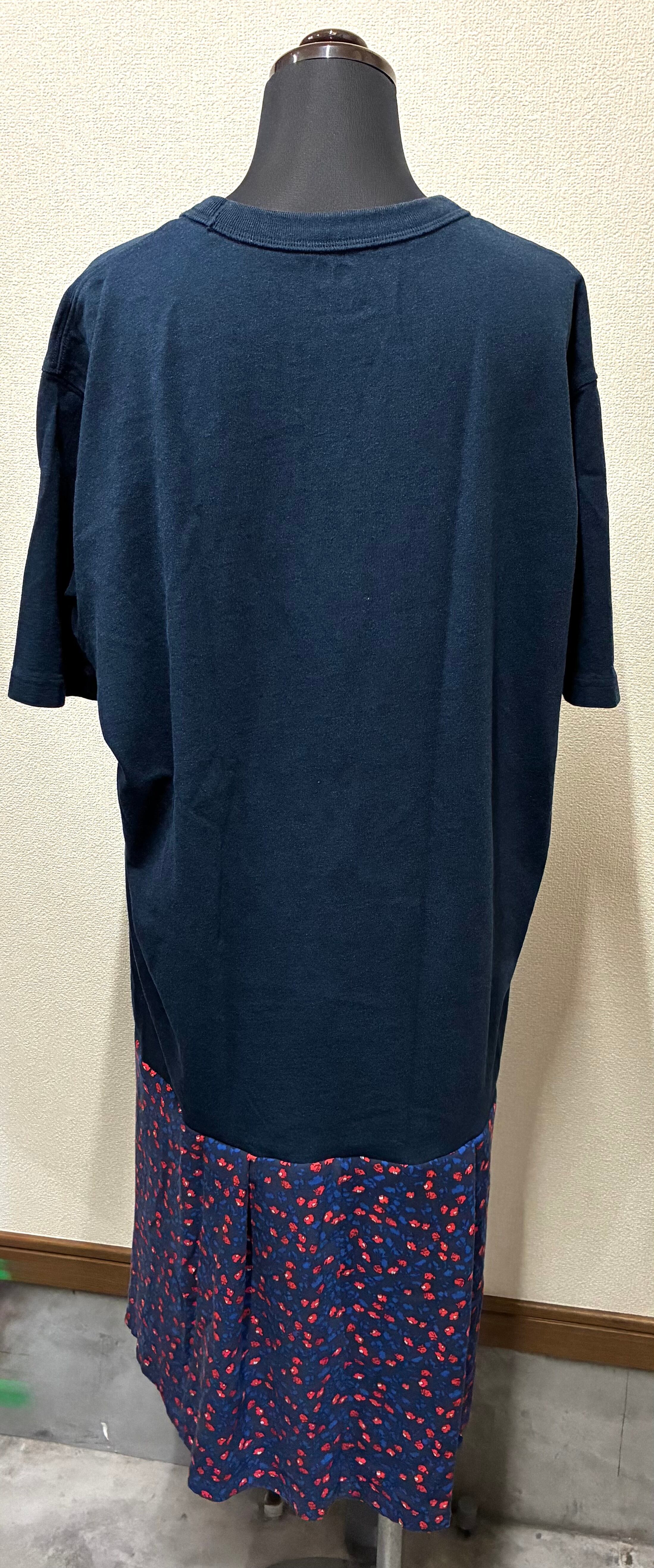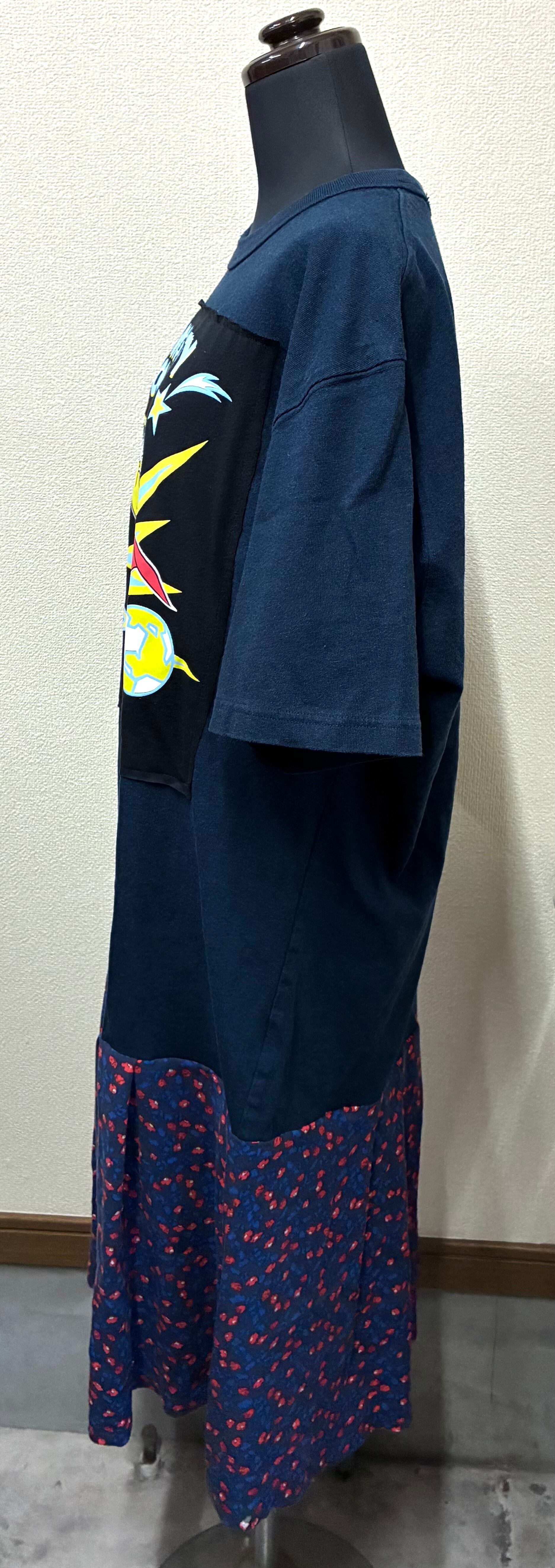 紺Tシャツに強いネズミを縫いつけ、柄スカートを合わせています♬