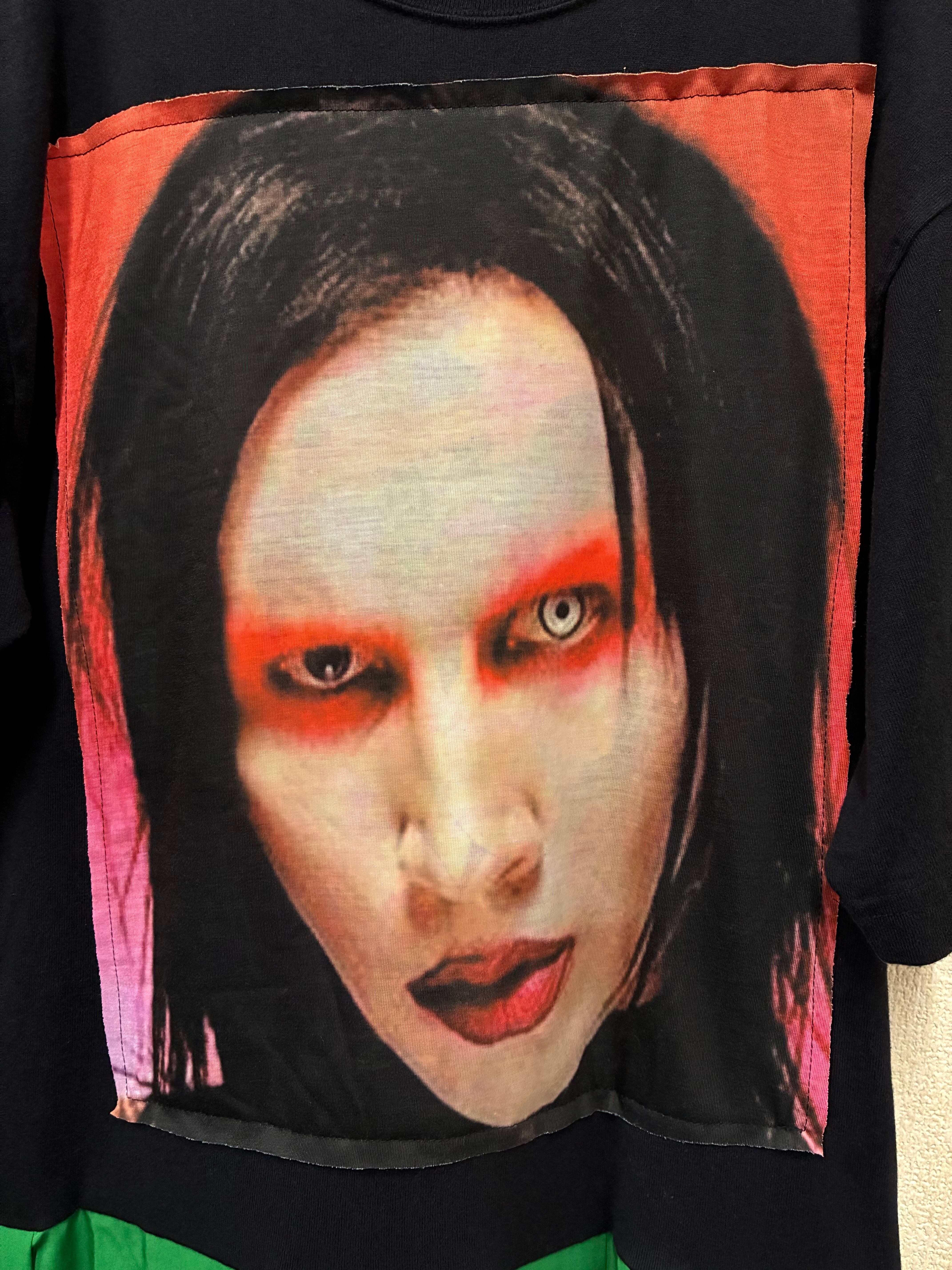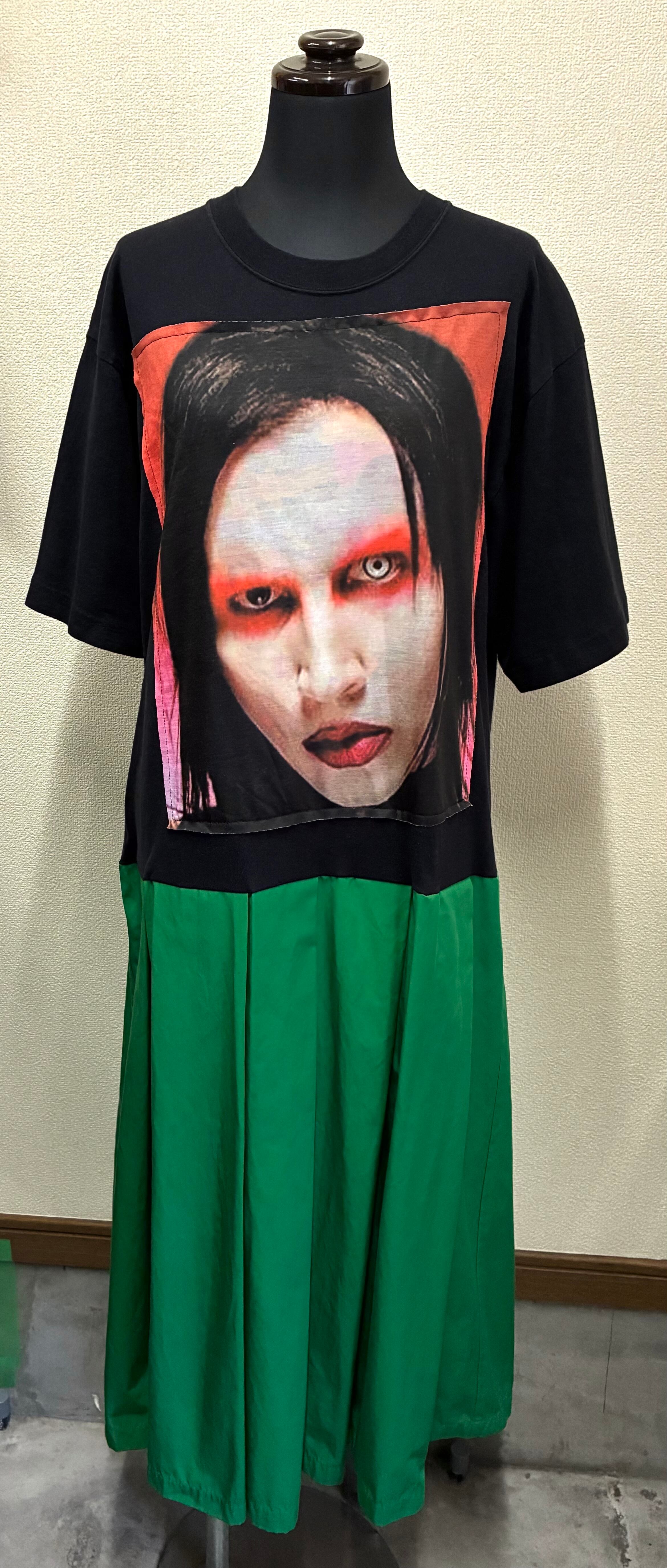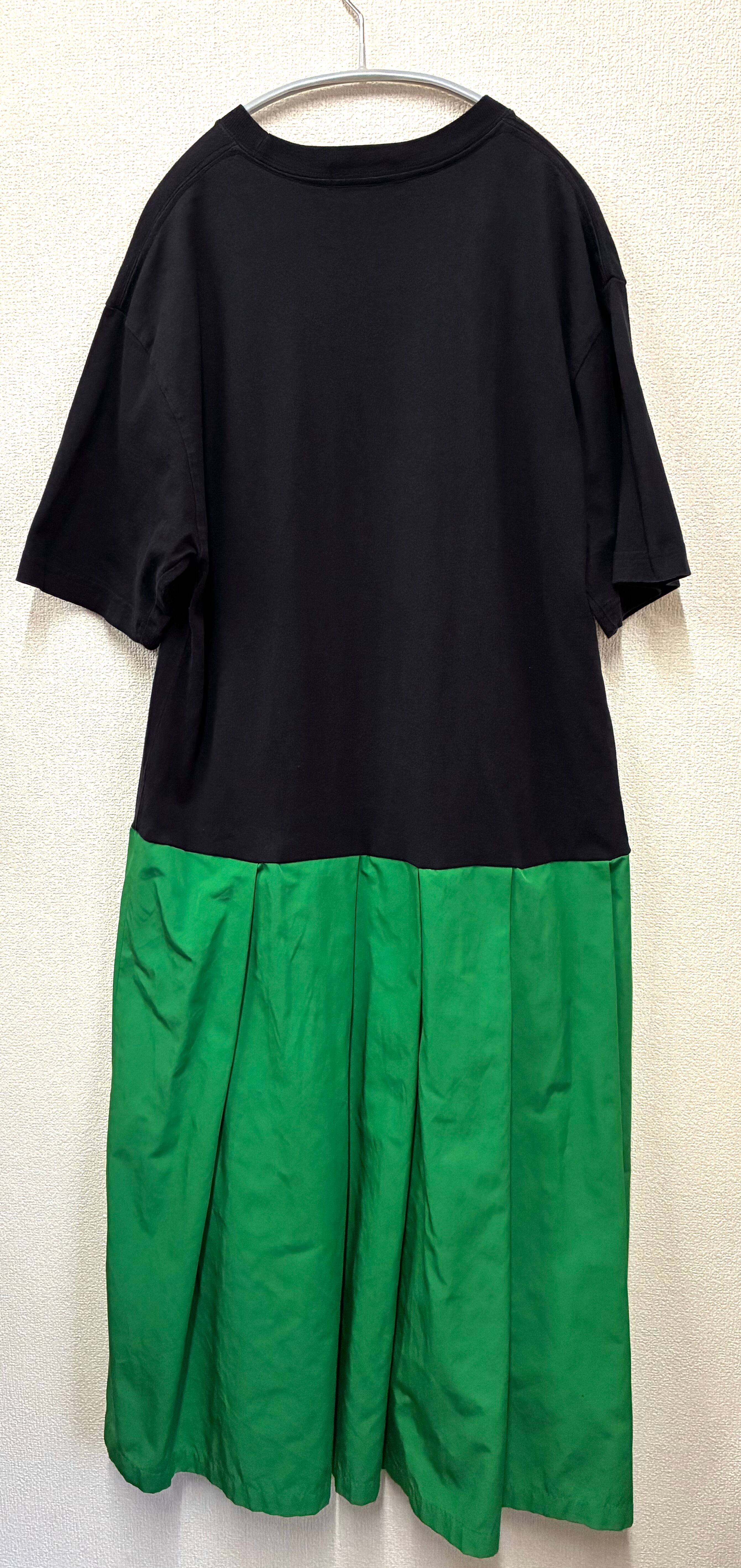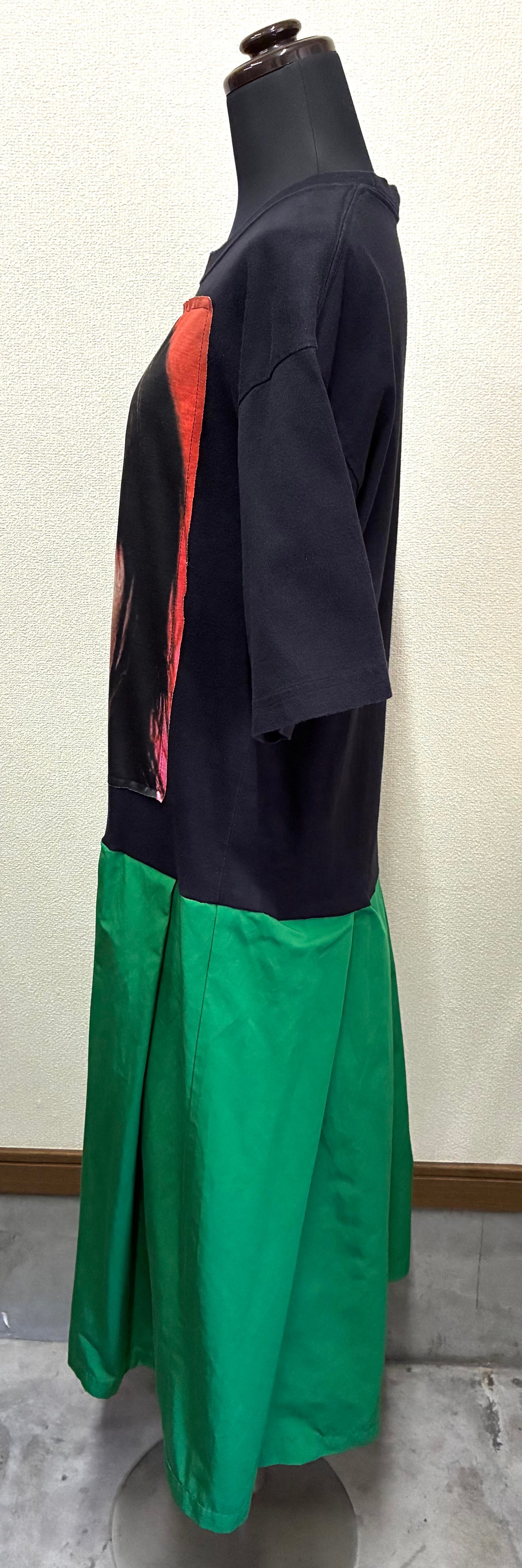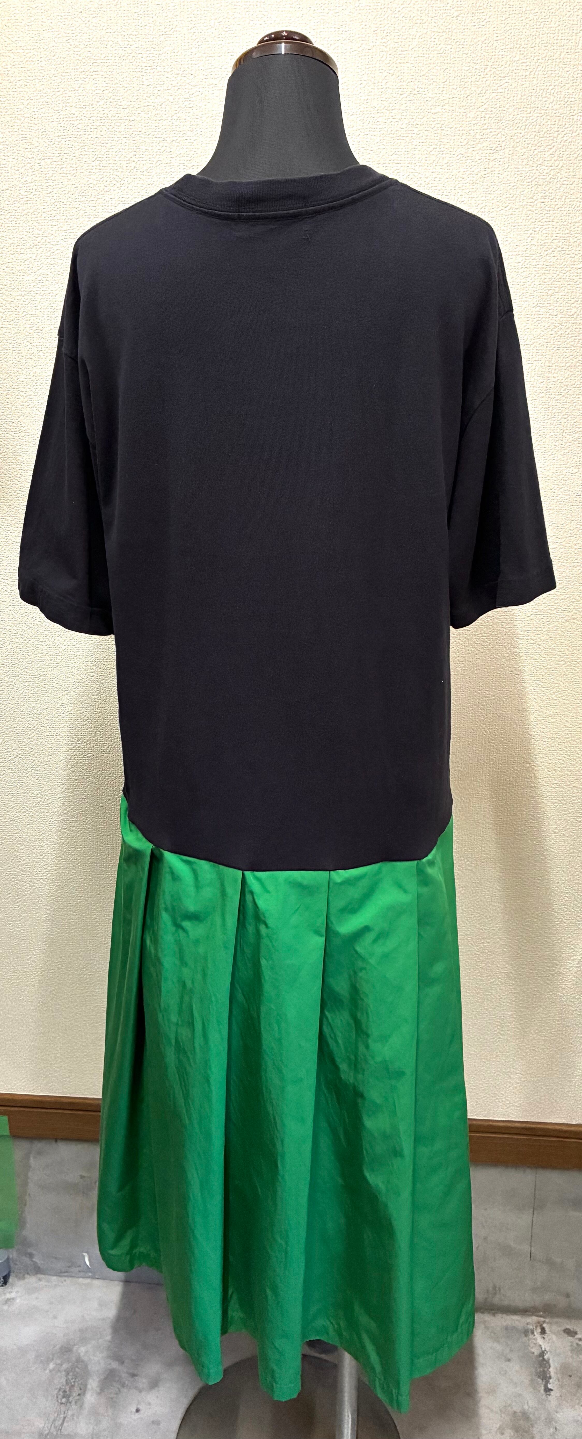 黒Tシャツに非常にかっこいいやつを縫いつけ、緑色のスカートを合わせています♬