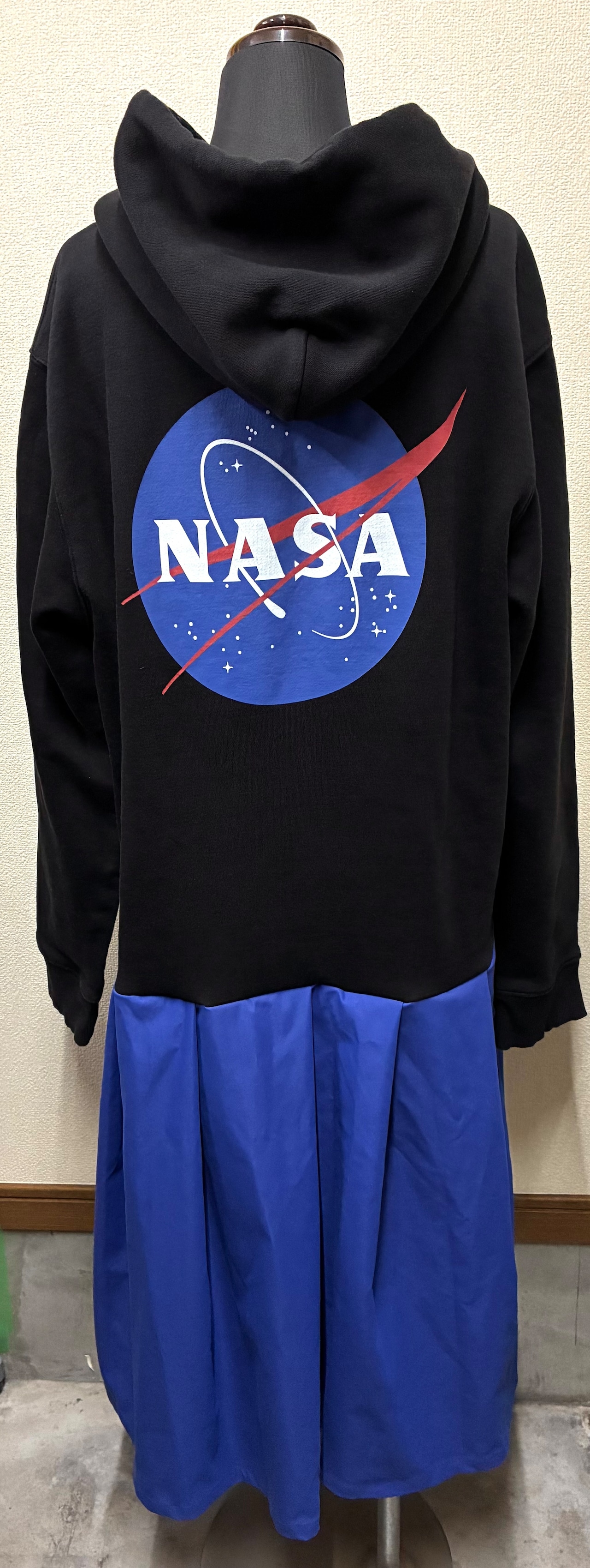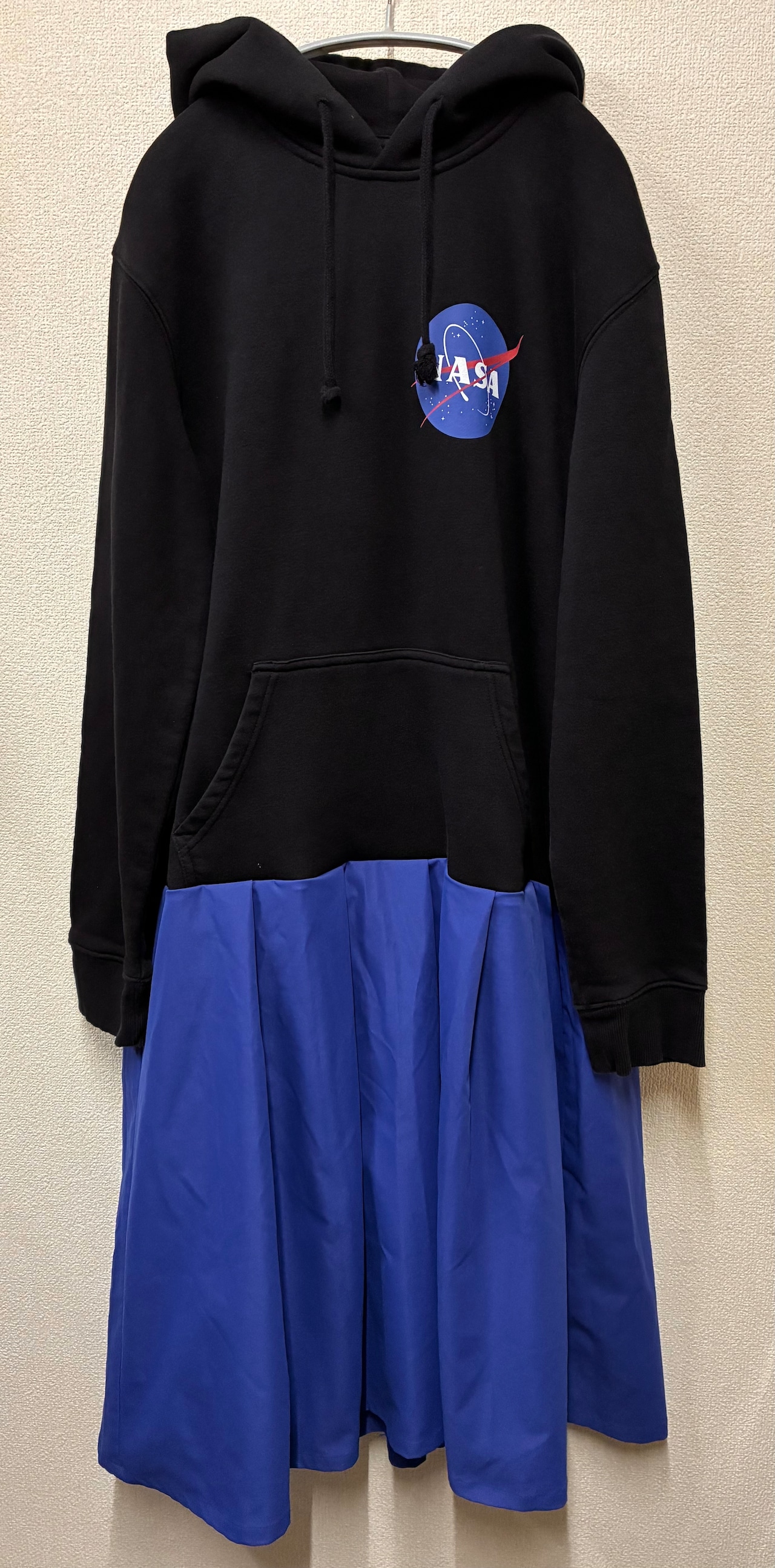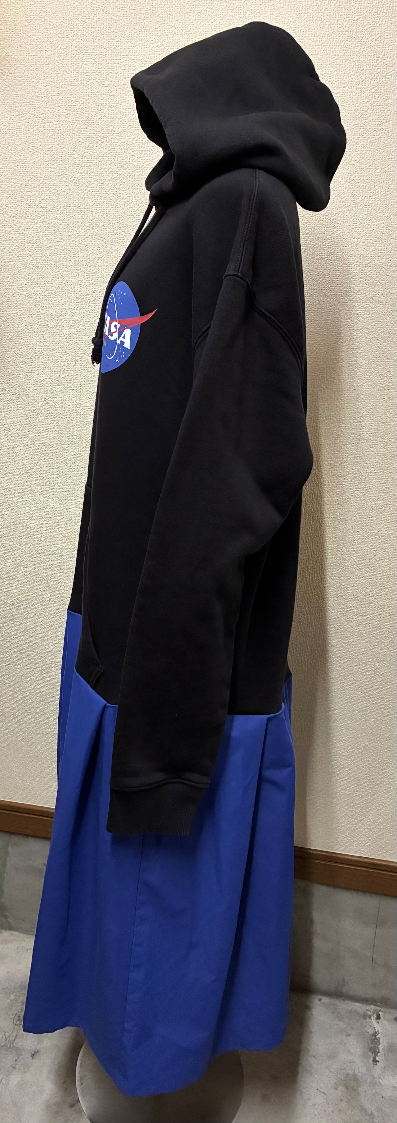 素敵なプリントの黒パーカーに、紫っぽい青系スカートを合わせています♬