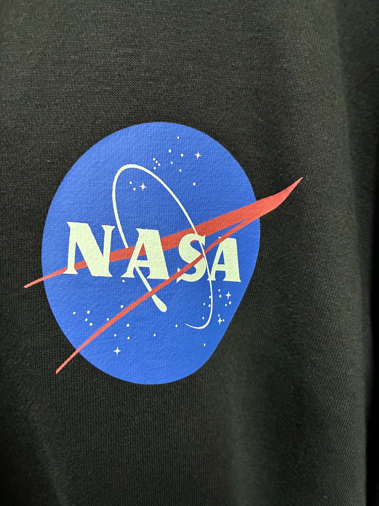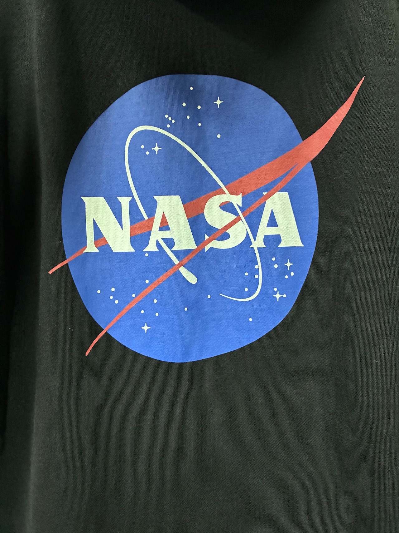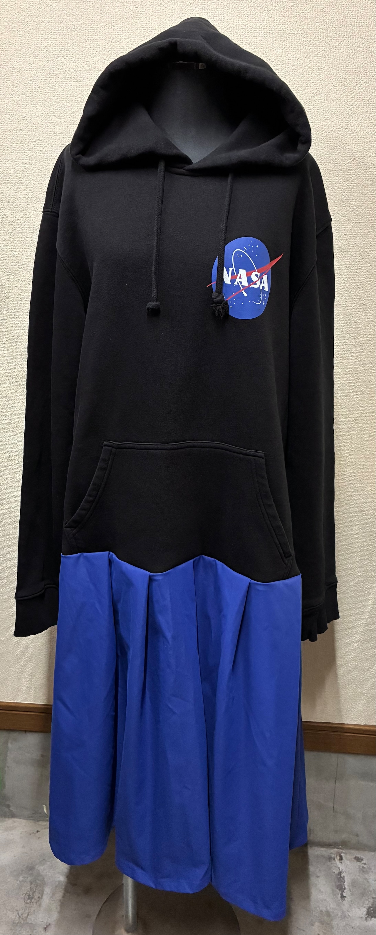 素敵なプリントの黒パーカーに、紫っぽい青系スカートを合わせています♬