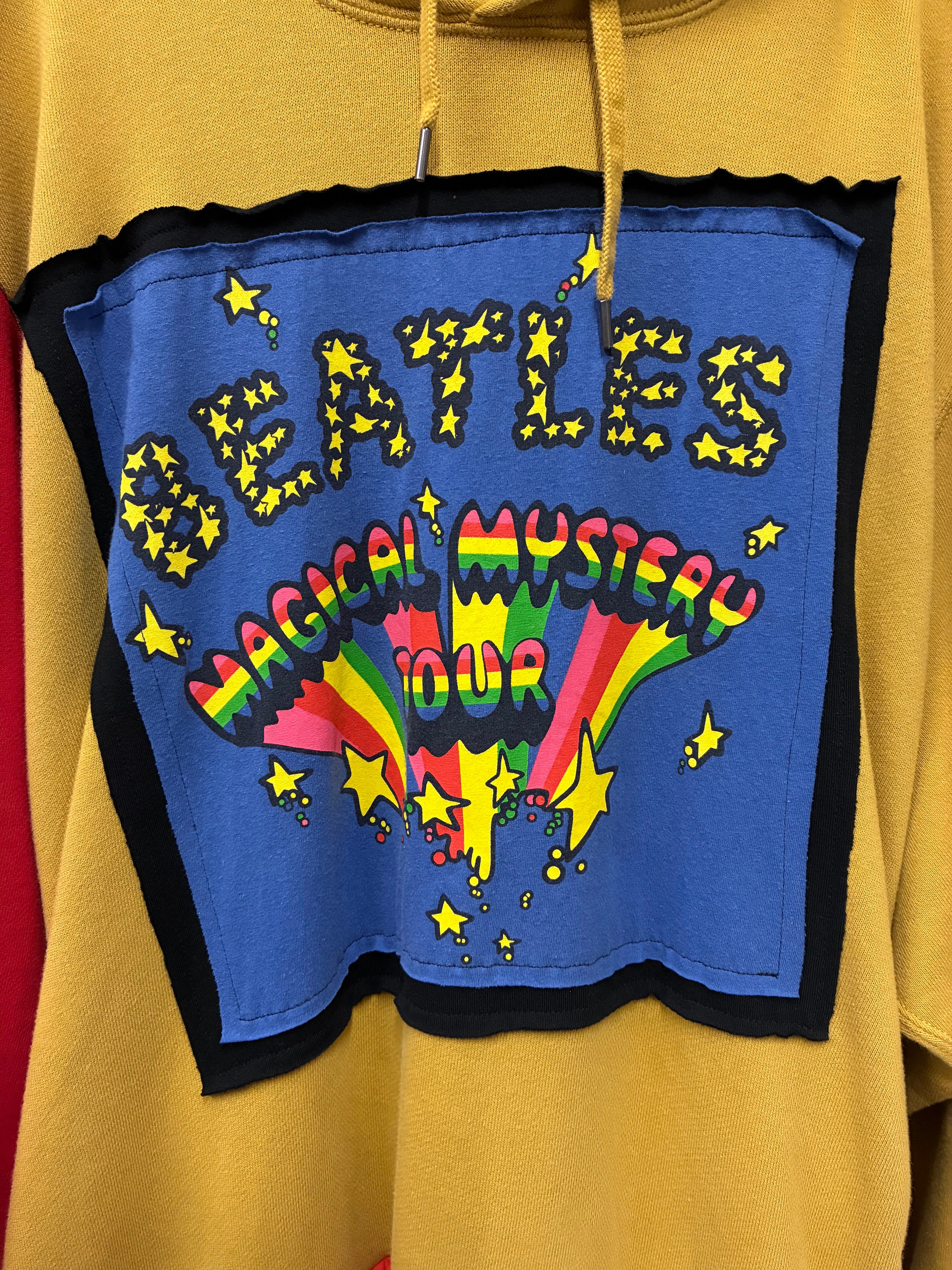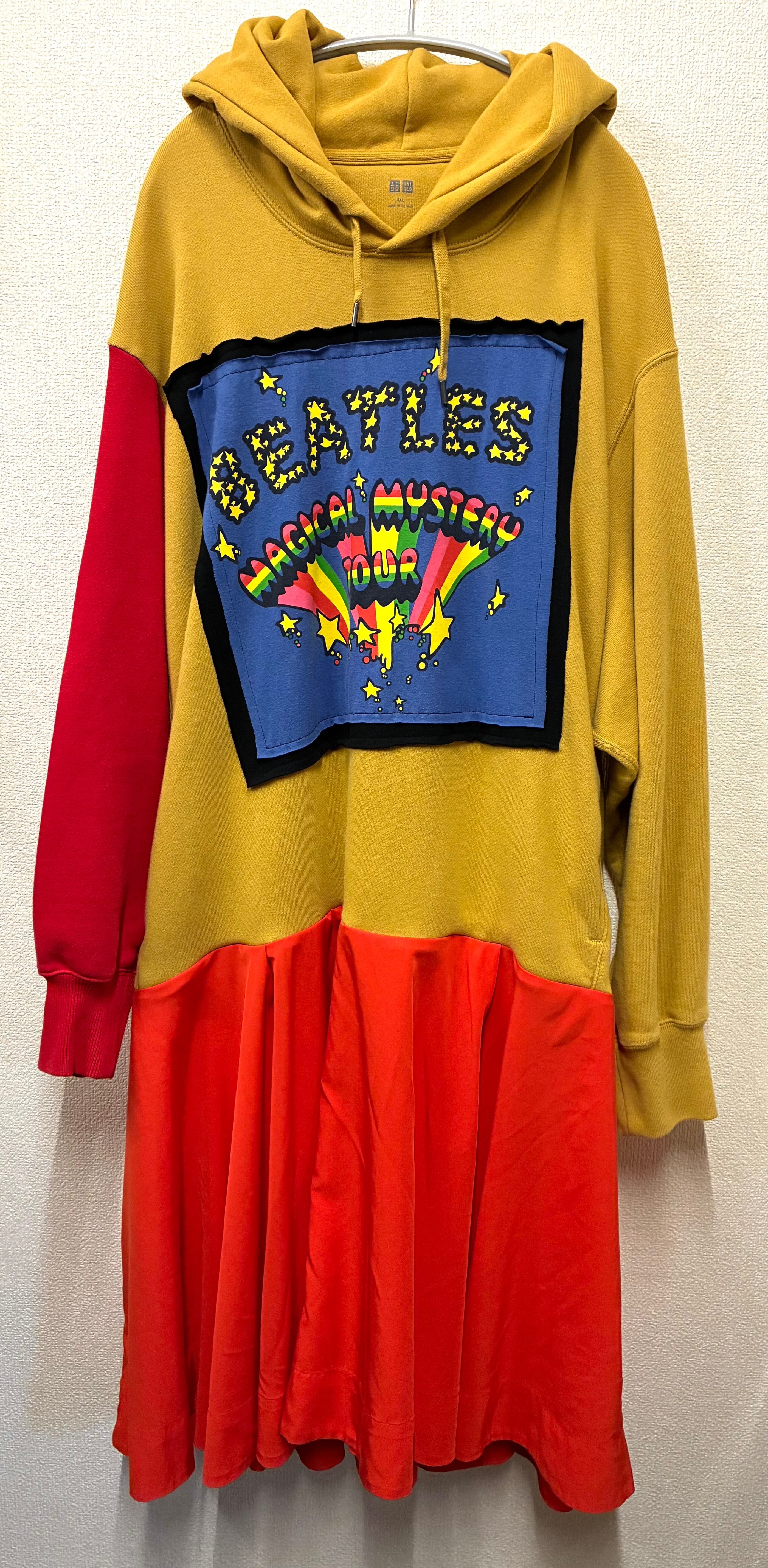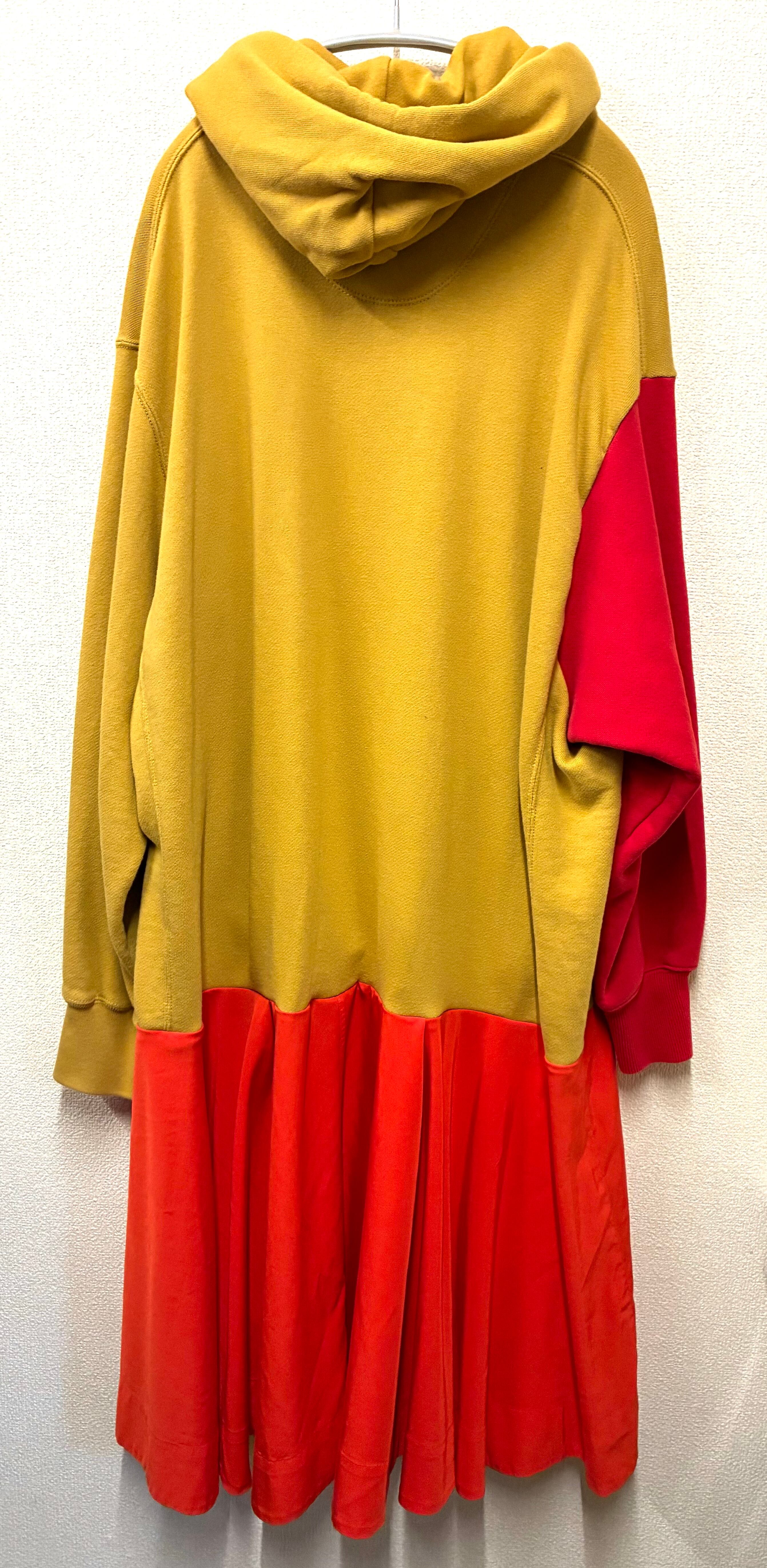 からし色パーカーに赤色の右袖を付けナイスなやつを縫いつけ、オレンジスカートを合わせています♬