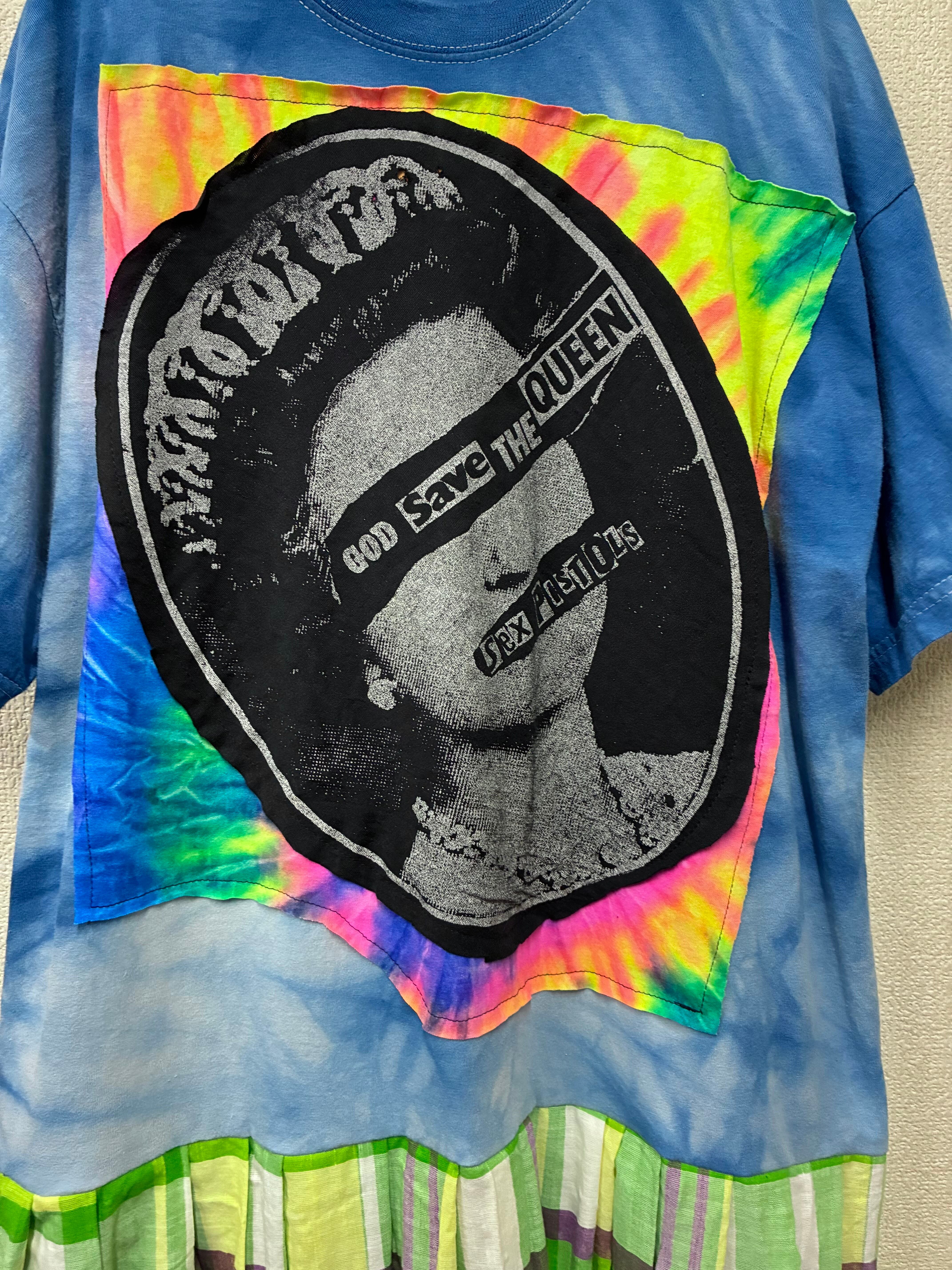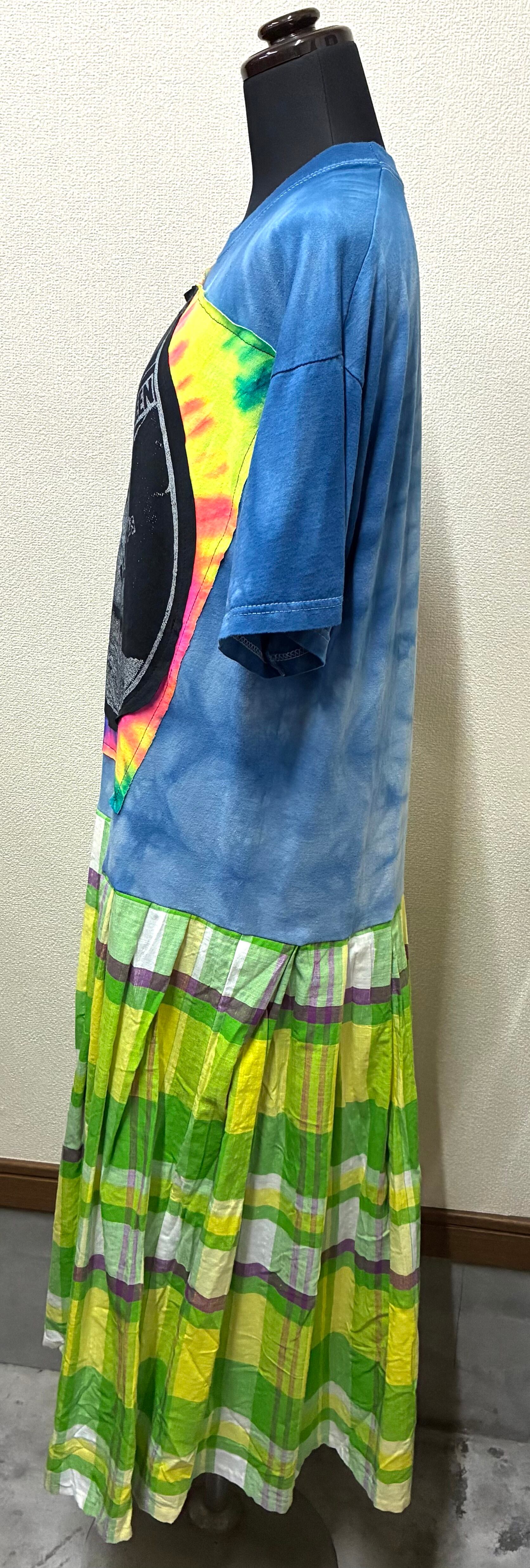 ブルーのタイダイTシャツに女性縫いつけ、チェック柄スカートを合わせています♬