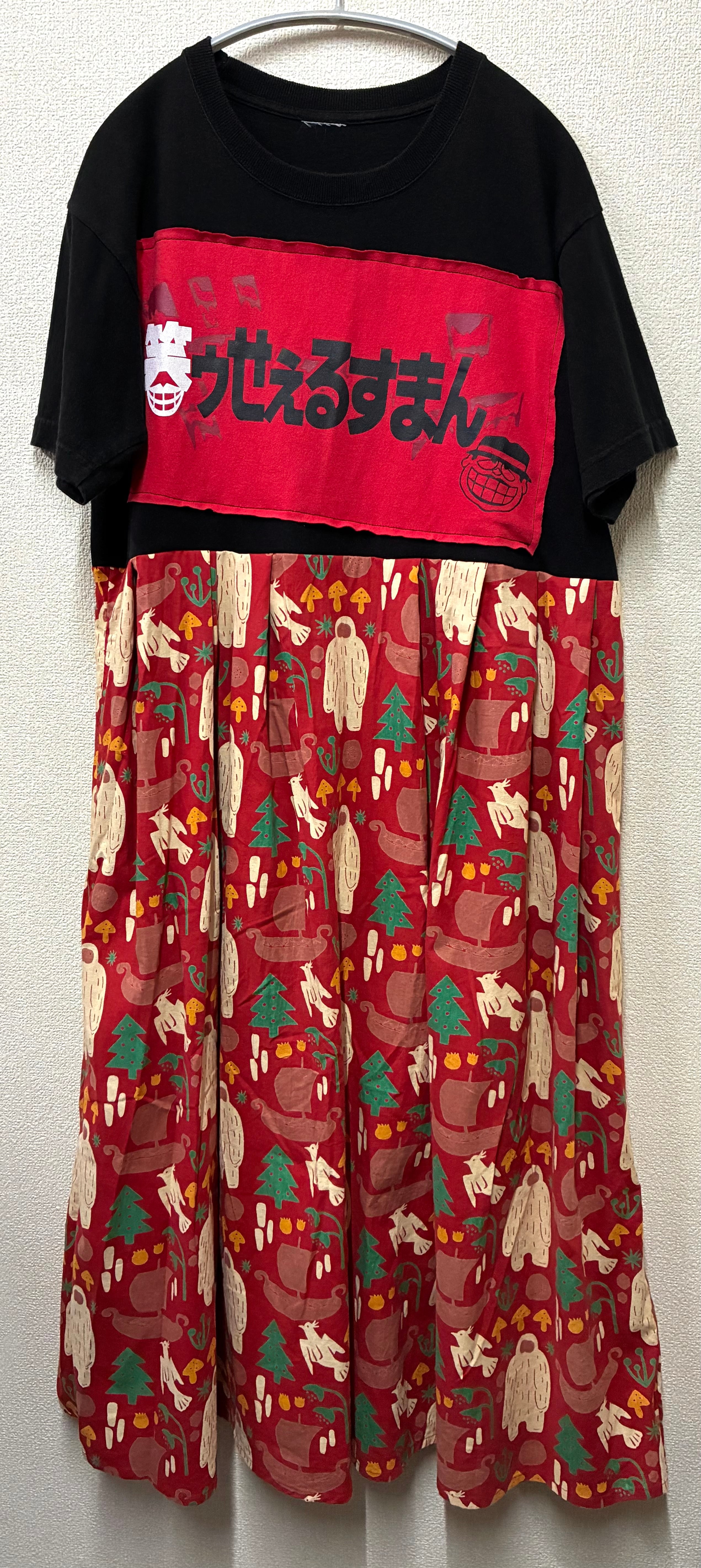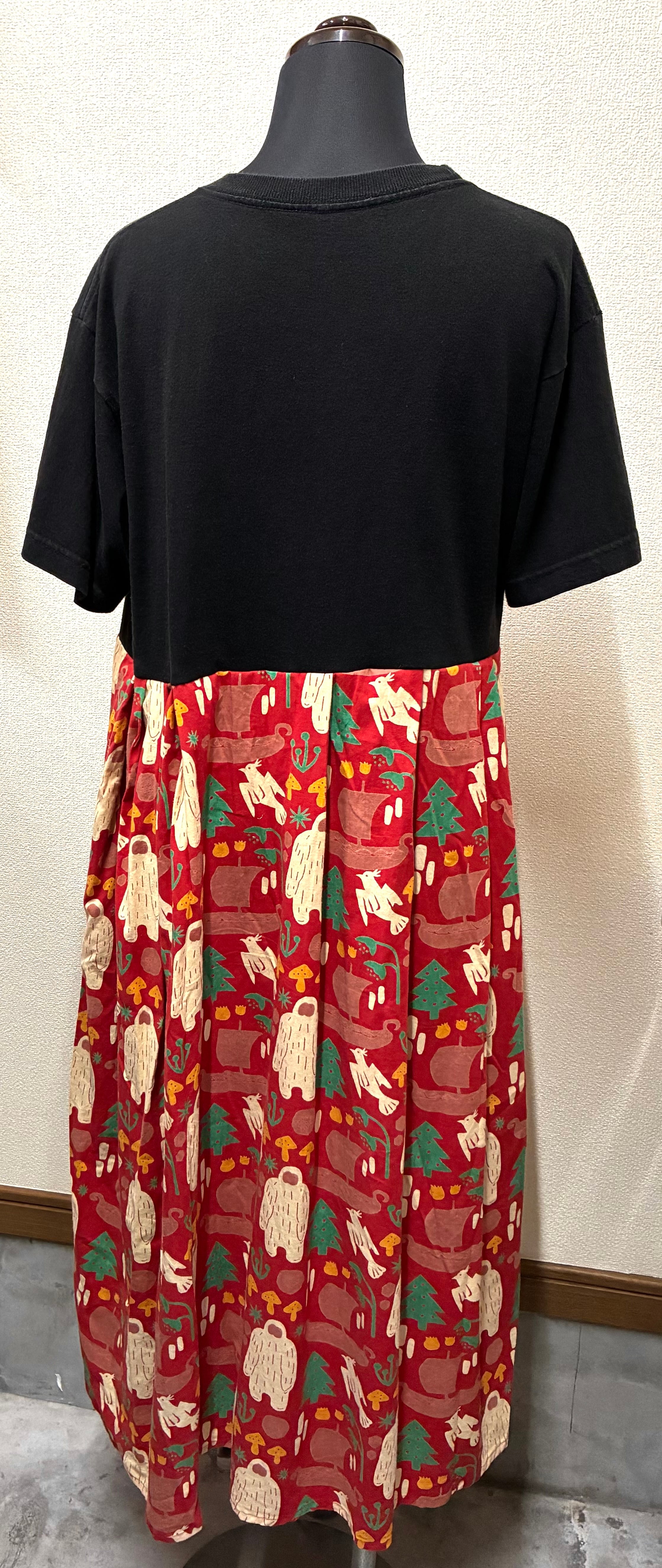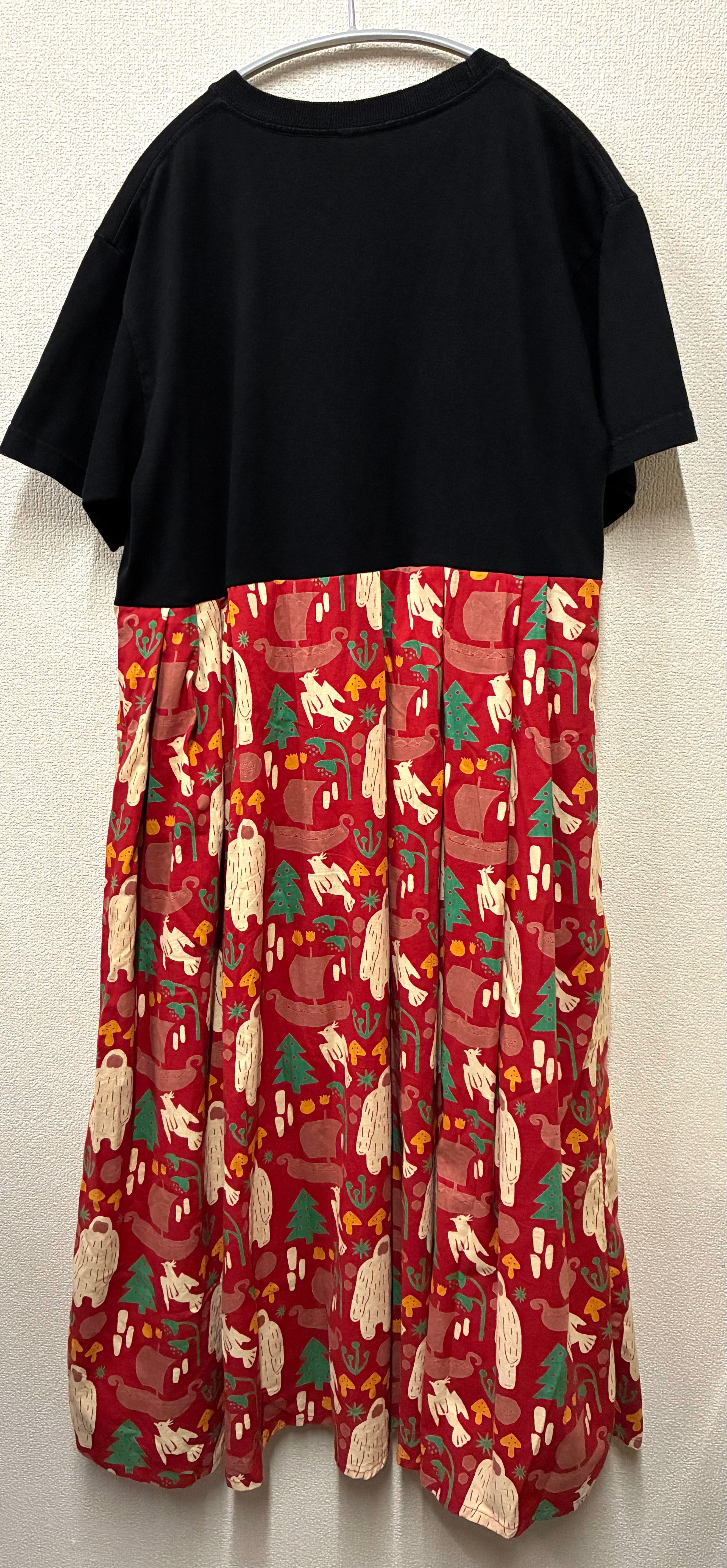 黒Tシャツにセールスマンを縫いつけ、イエティや鳥の柄スカートを合わせています♬