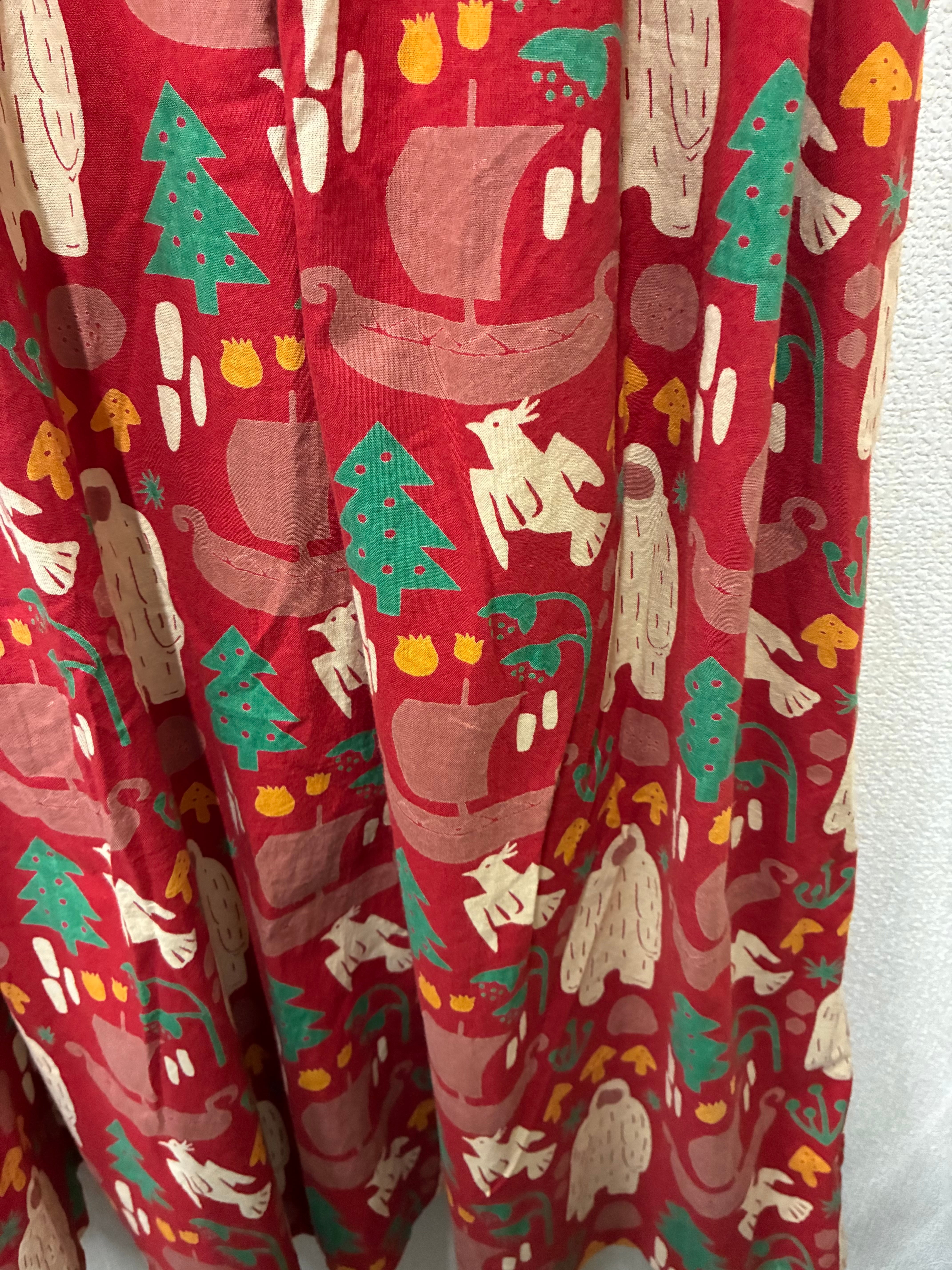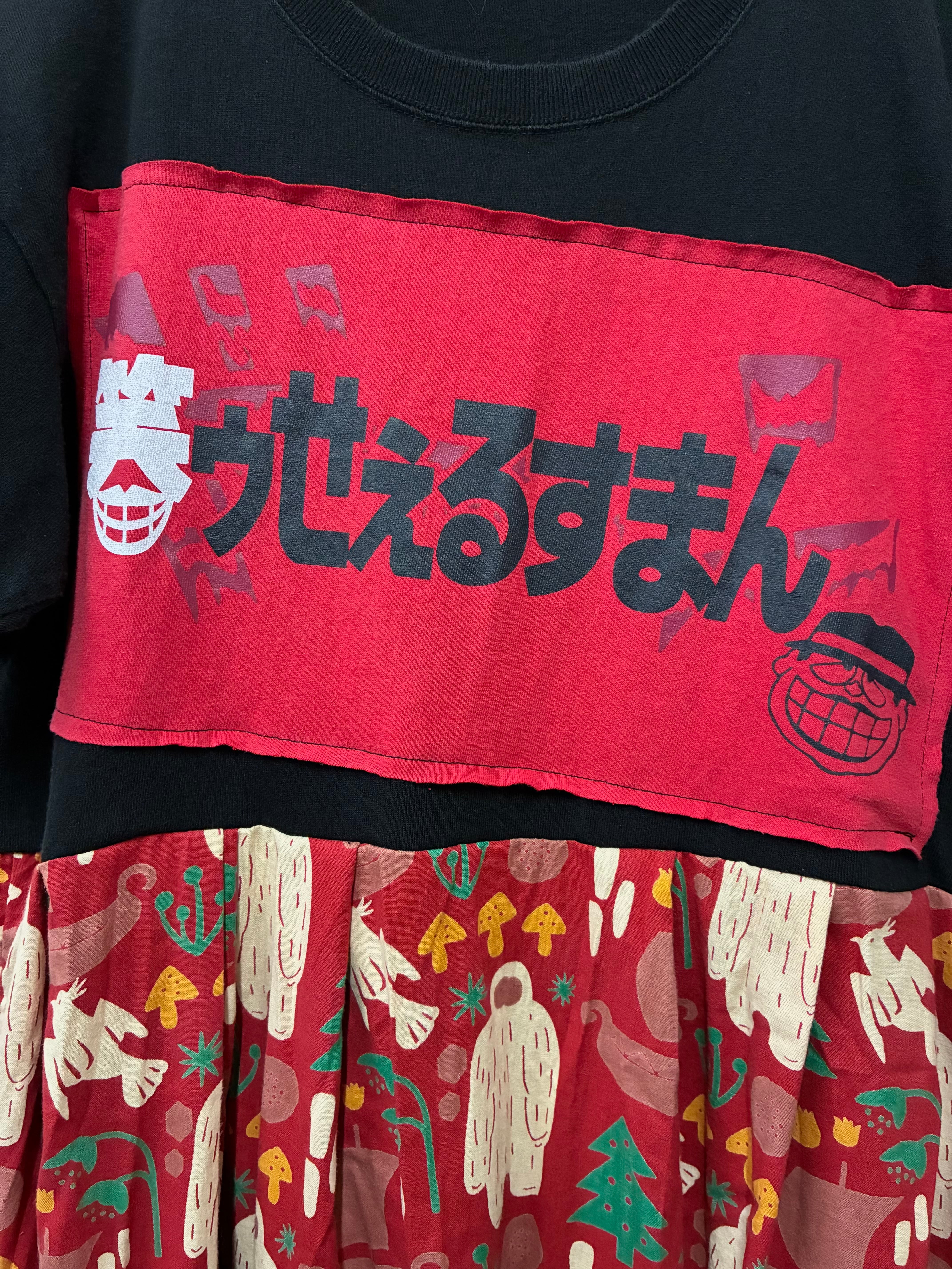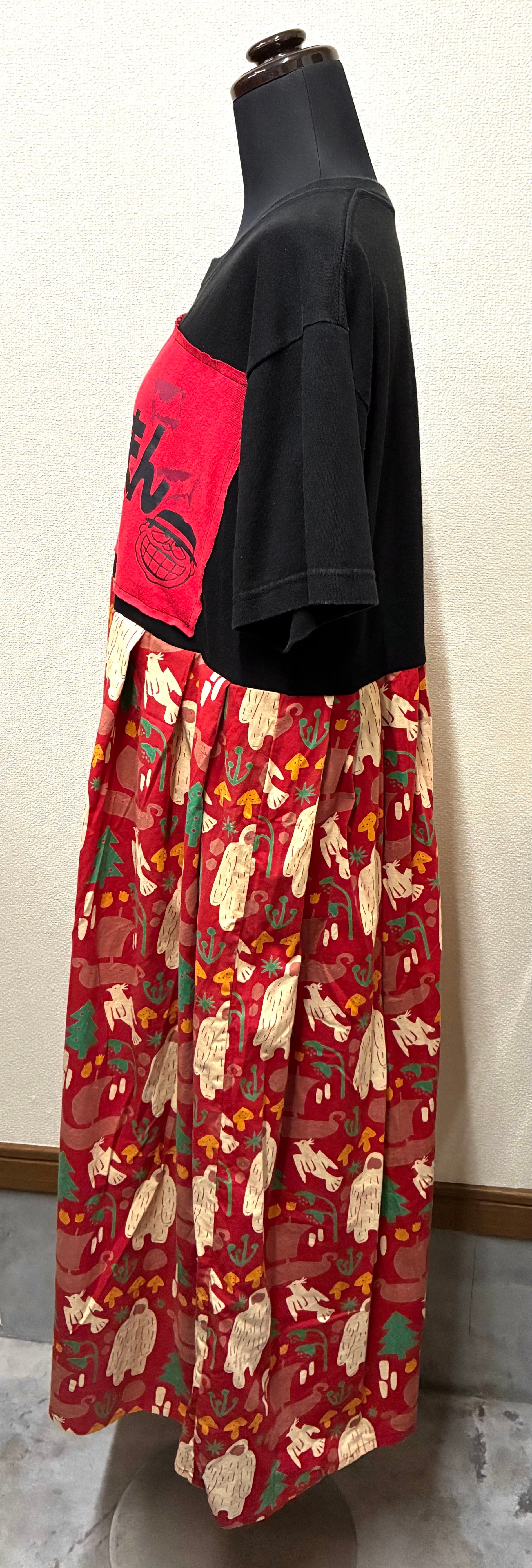 黒Tシャツにセールスマンを縫いつけ、イエティや鳥の柄スカートを合わせています♬