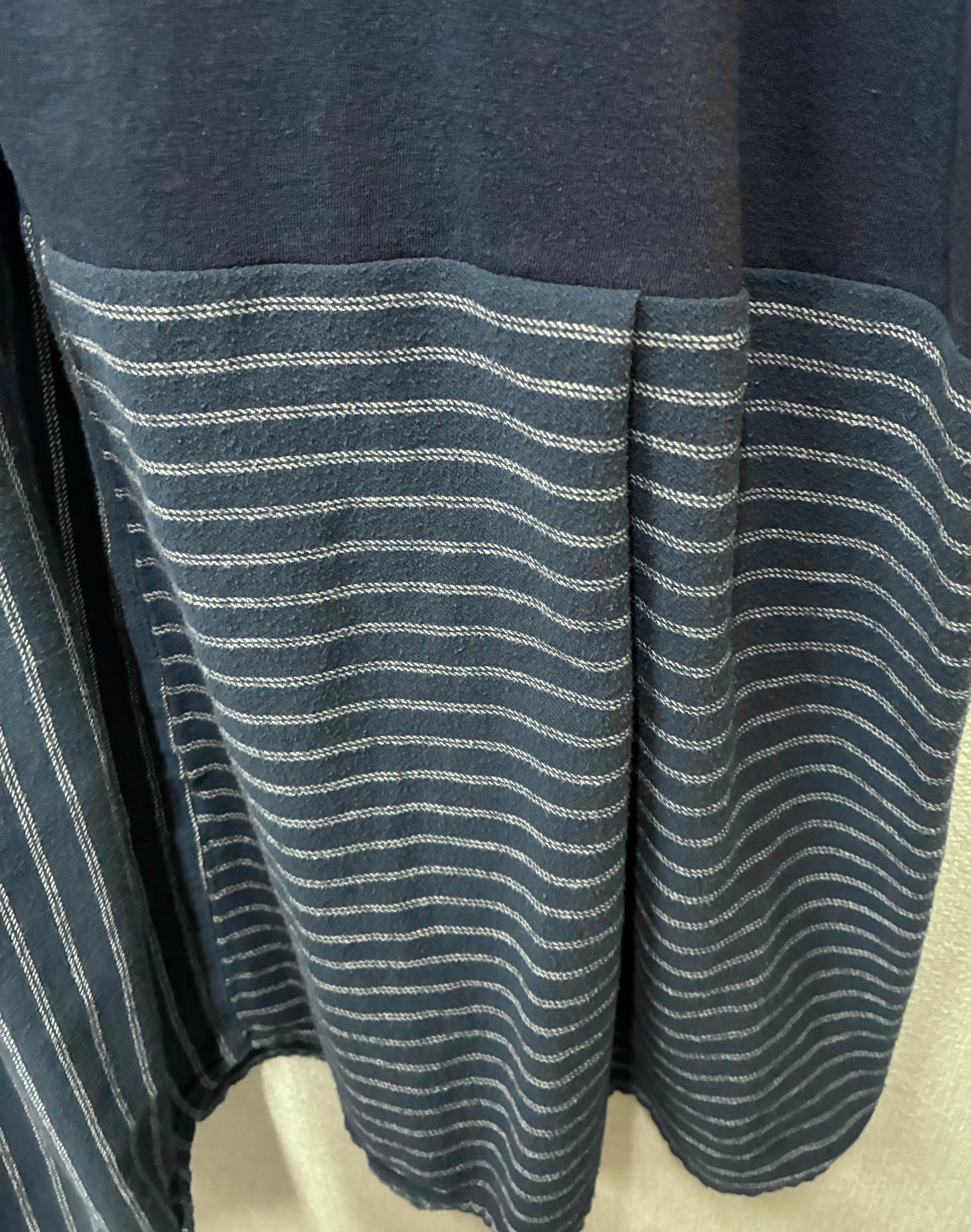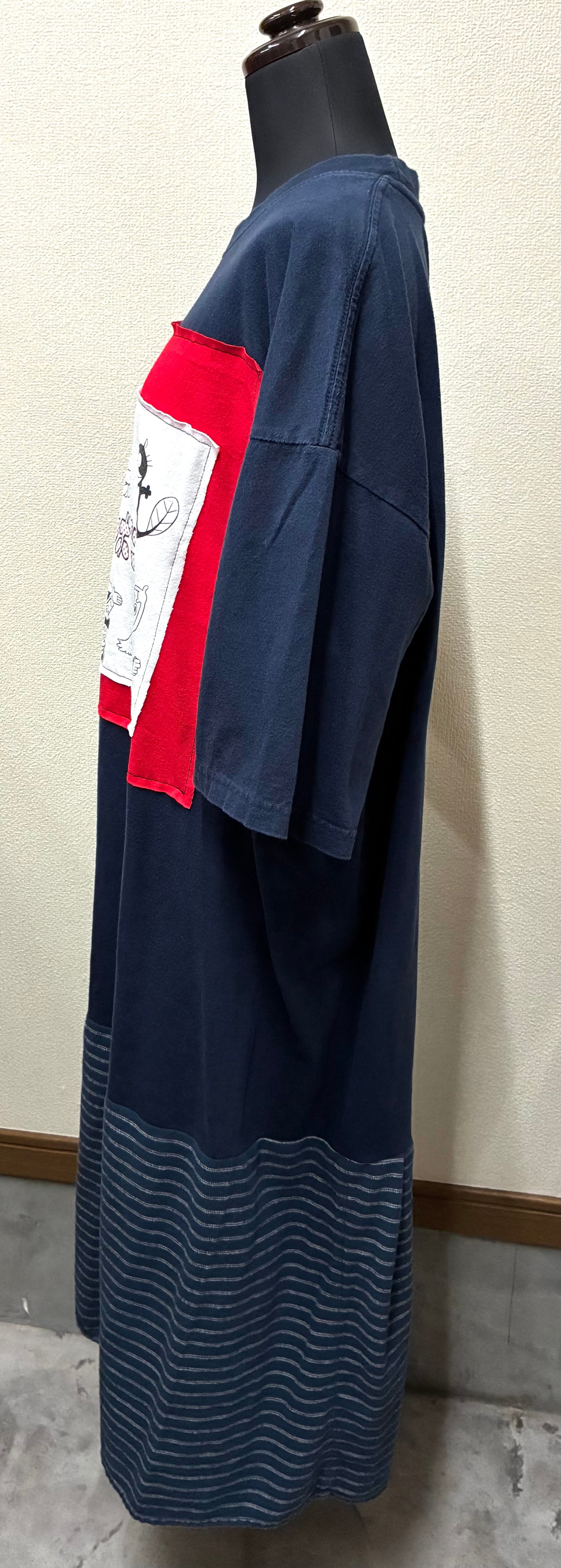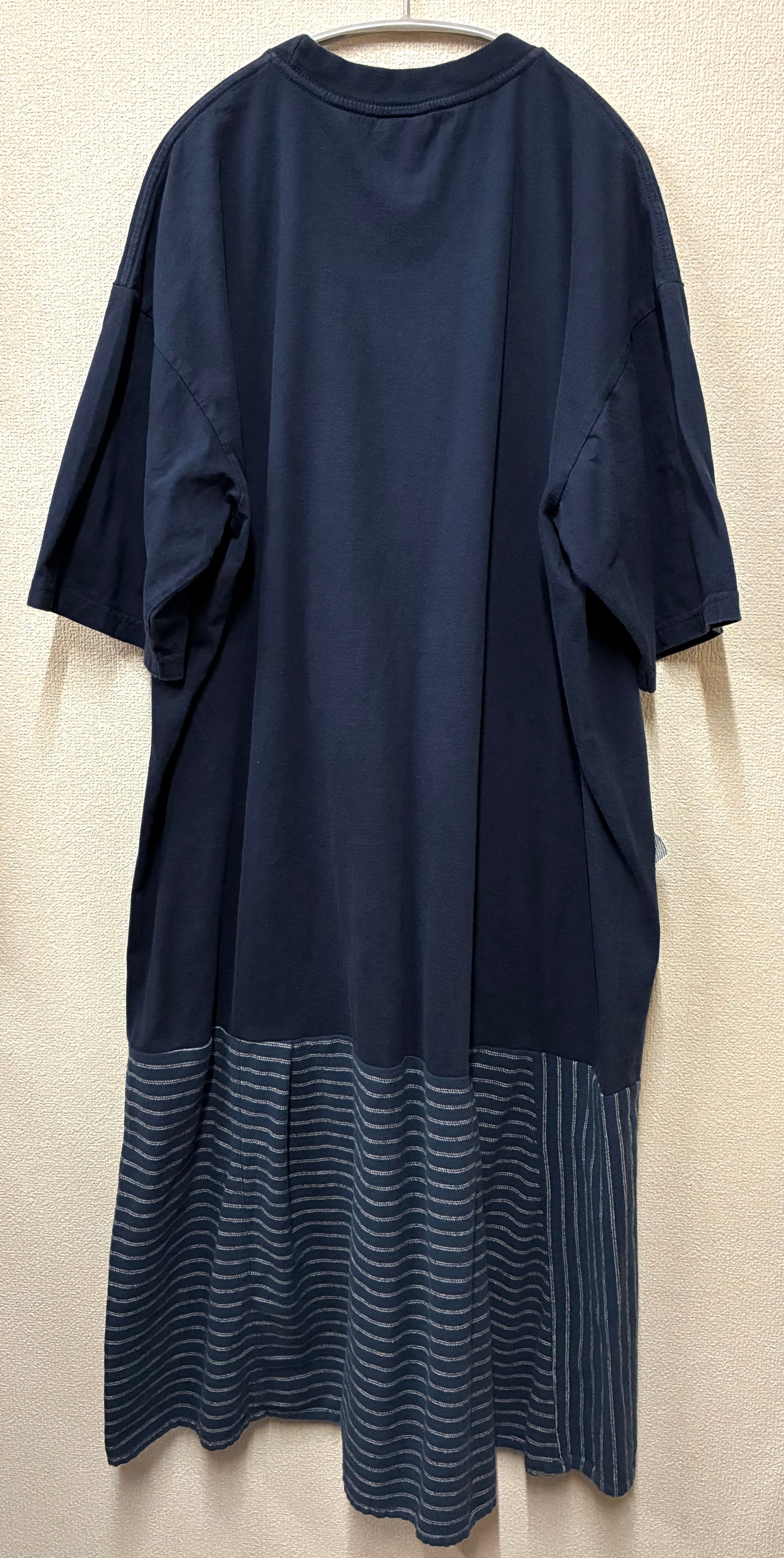 ネイビービッグTシャツにかわいいやつを縫いつけ、しましまスカートを合わせています♬