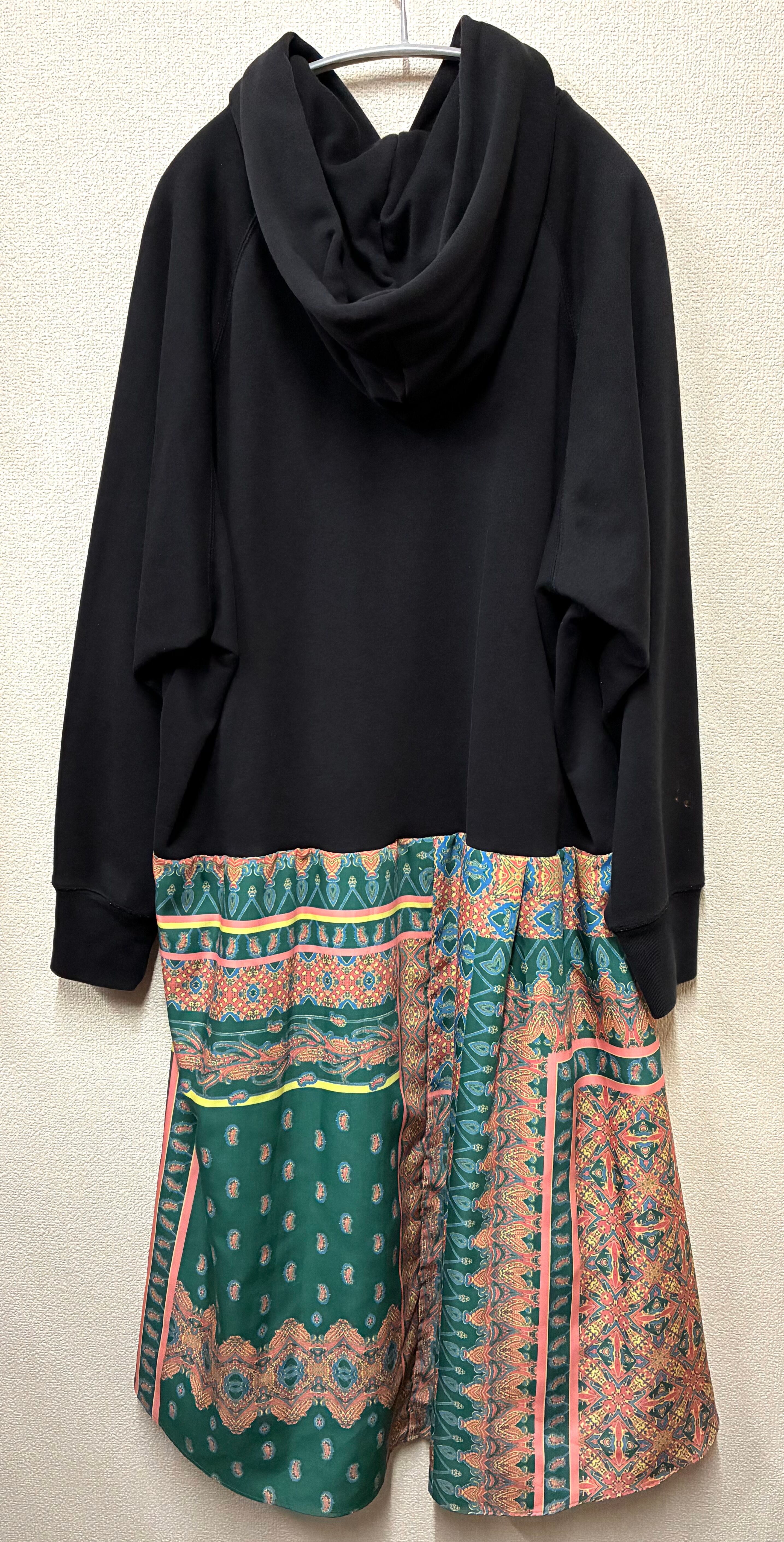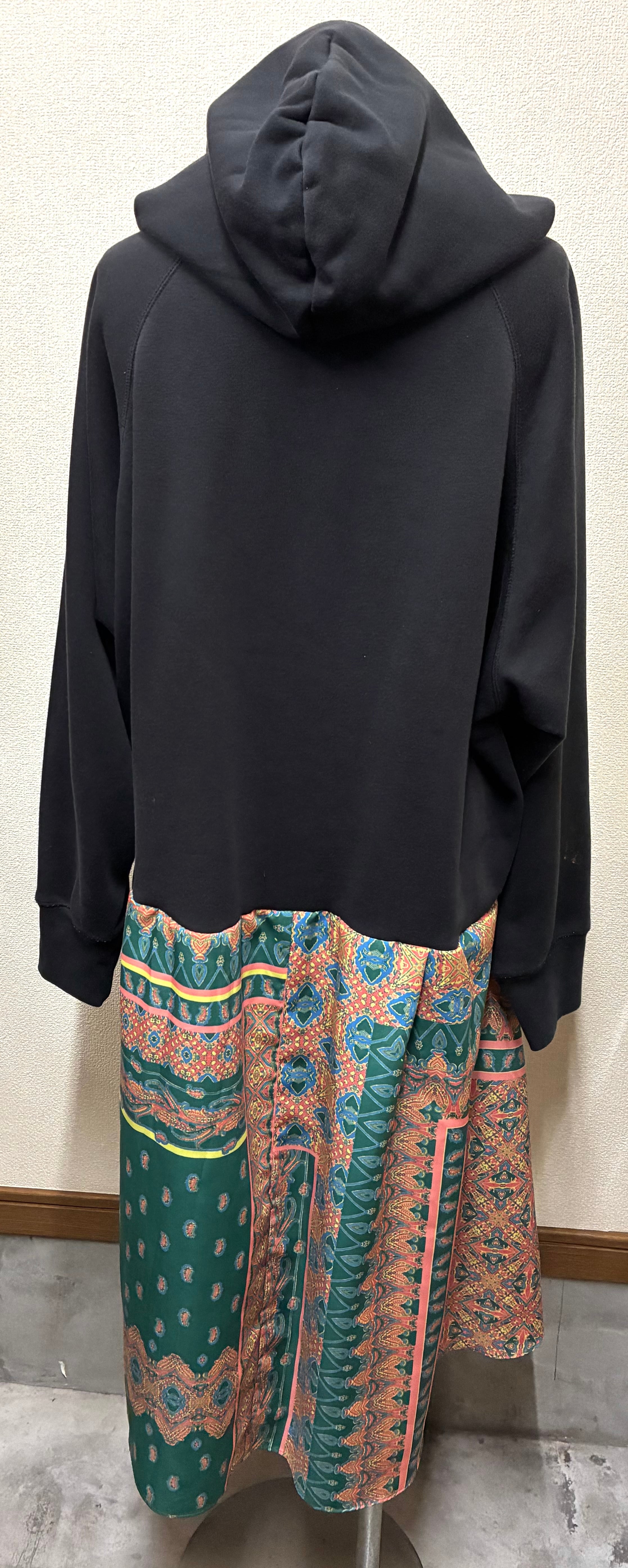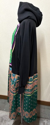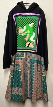 黒スウェットにミドリを縫いつけ、柄スカートを合わせています♬