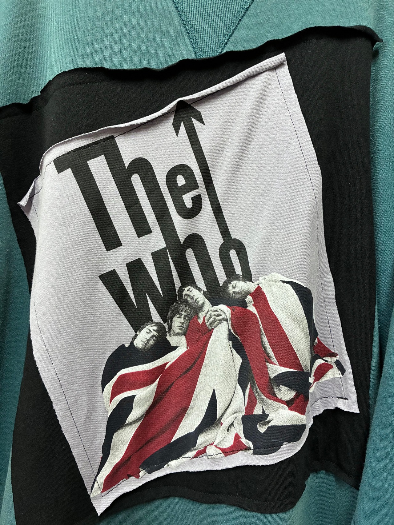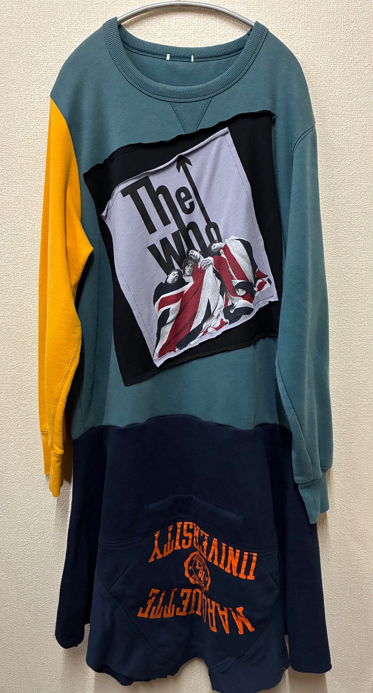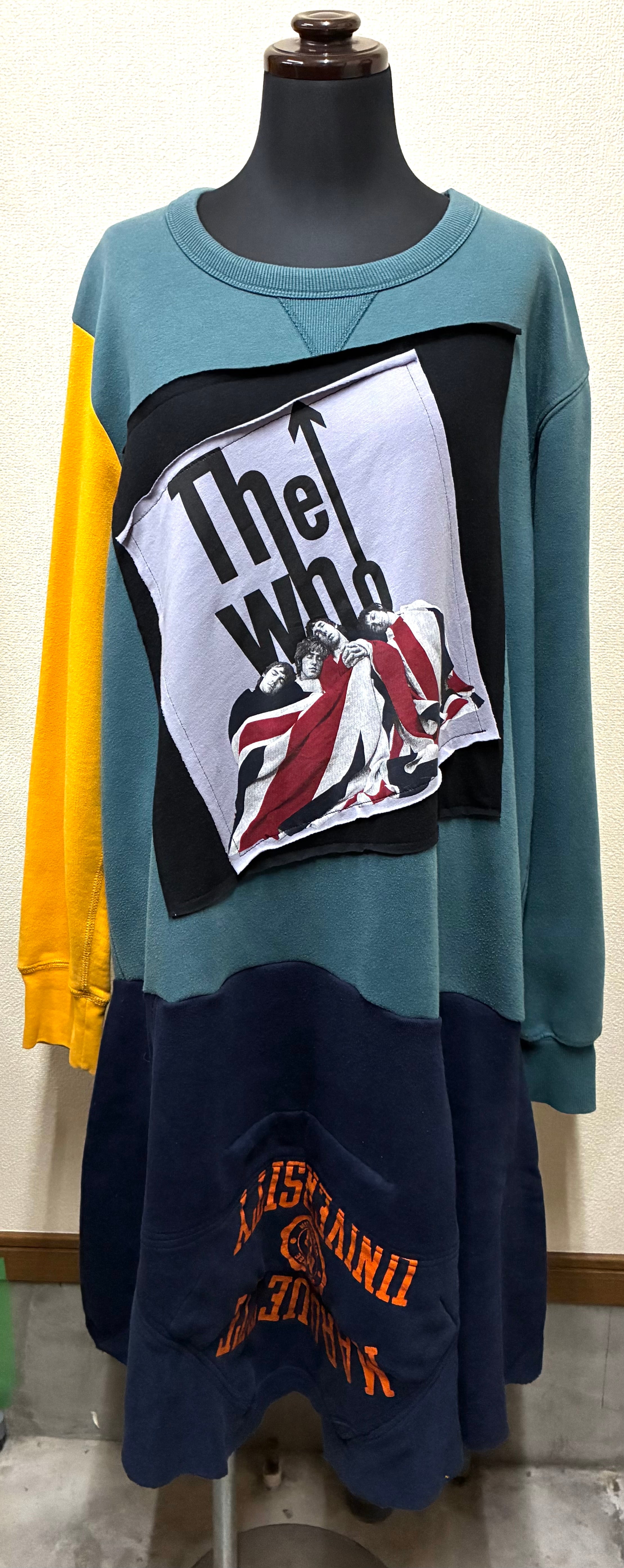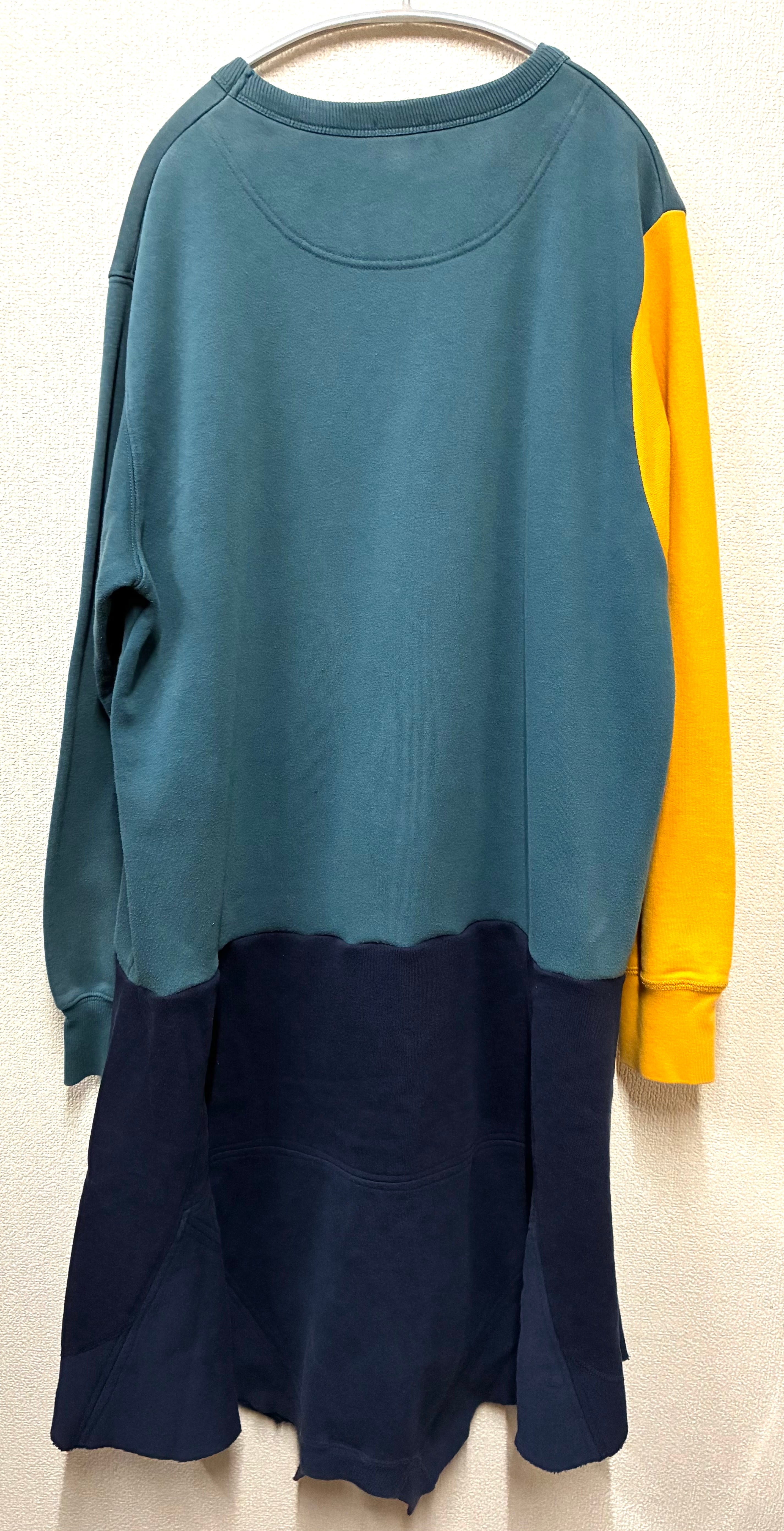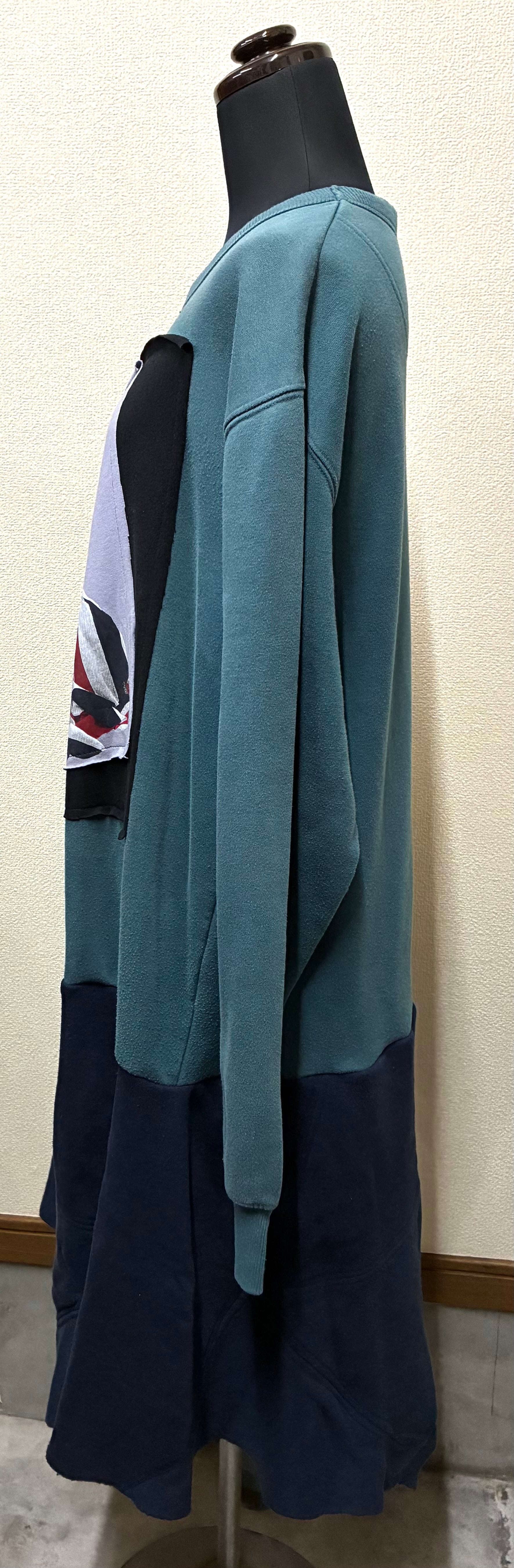 くすんだグリーン系スウェットに4人組を縫いつけ右袖に黄色の袖を合わせ、ネイビーのスウェットスカートを合わせています♬