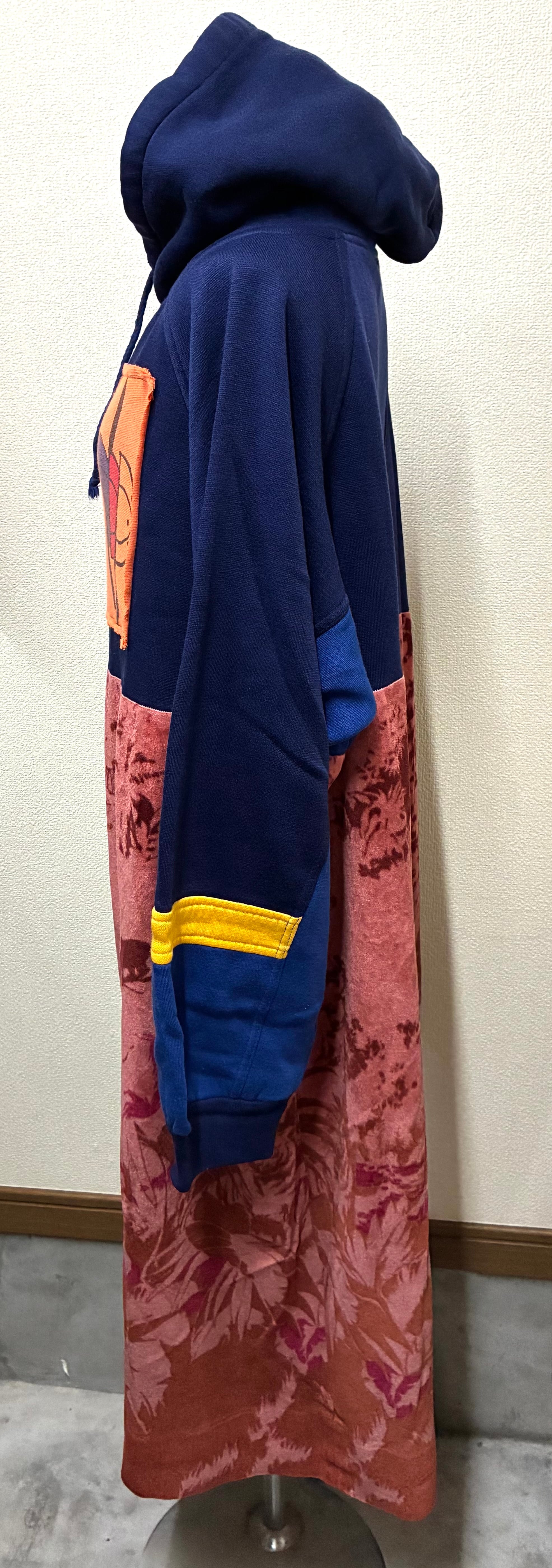 ネイビーパーカーに帽子重ね男を縫いつけ、柄ベロアスカートを合わせています♬