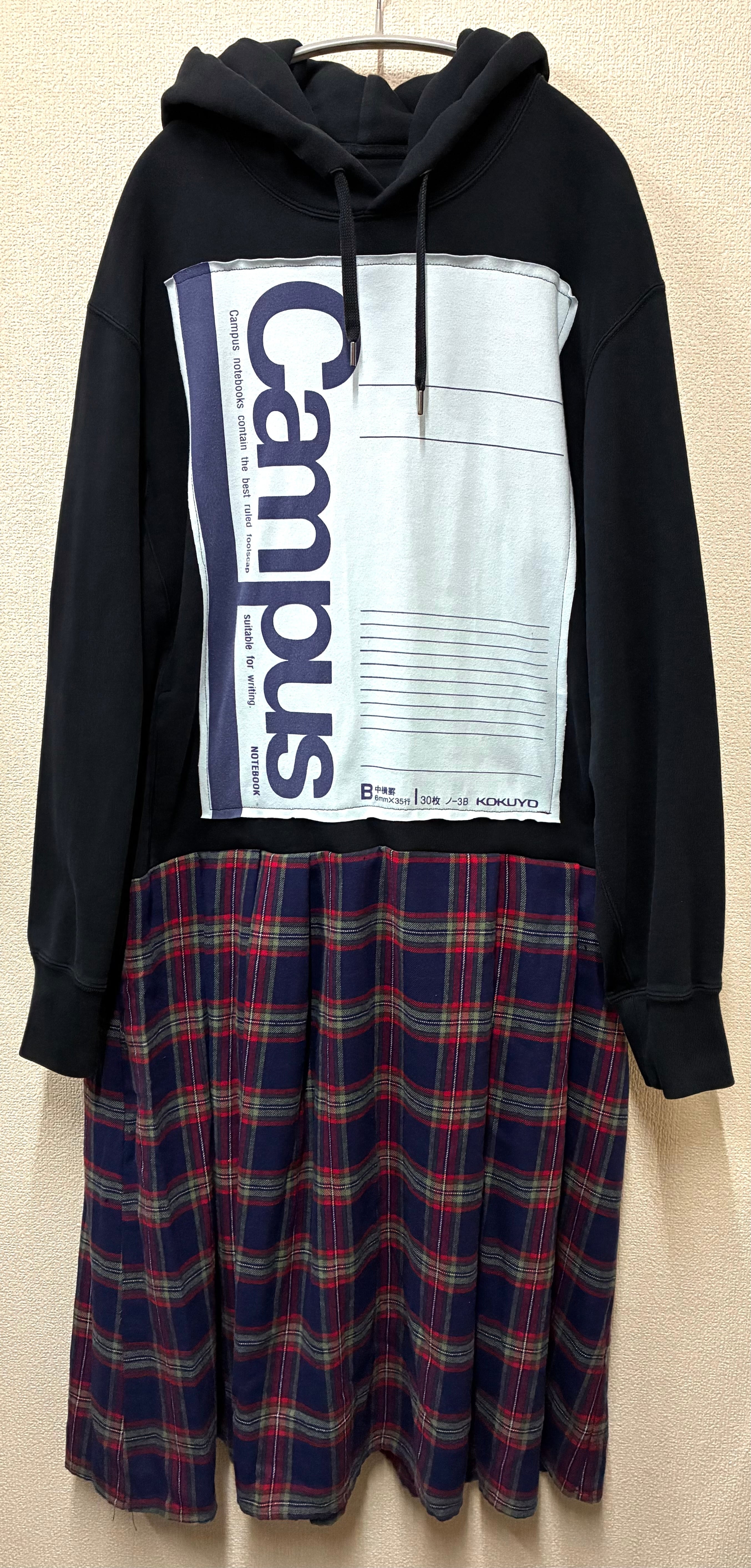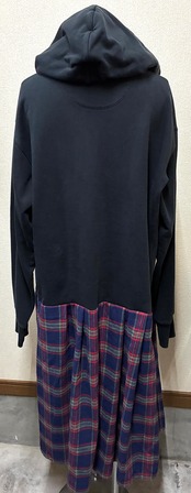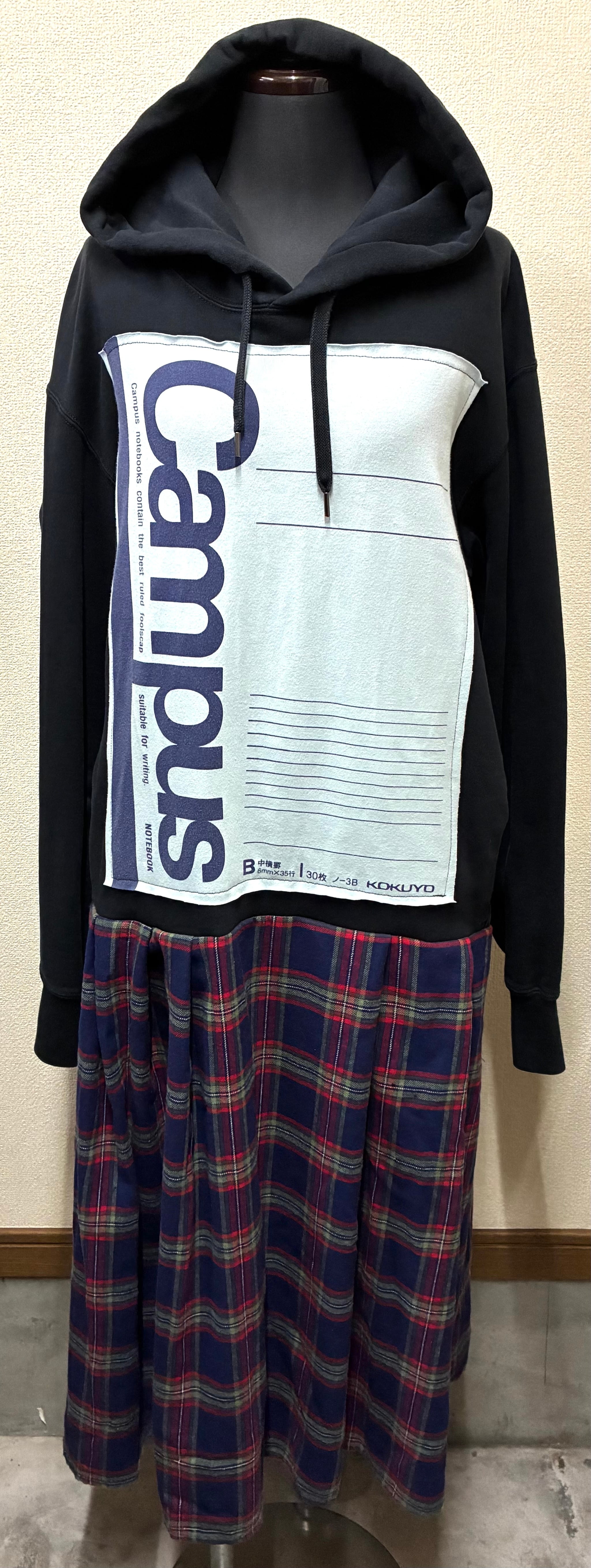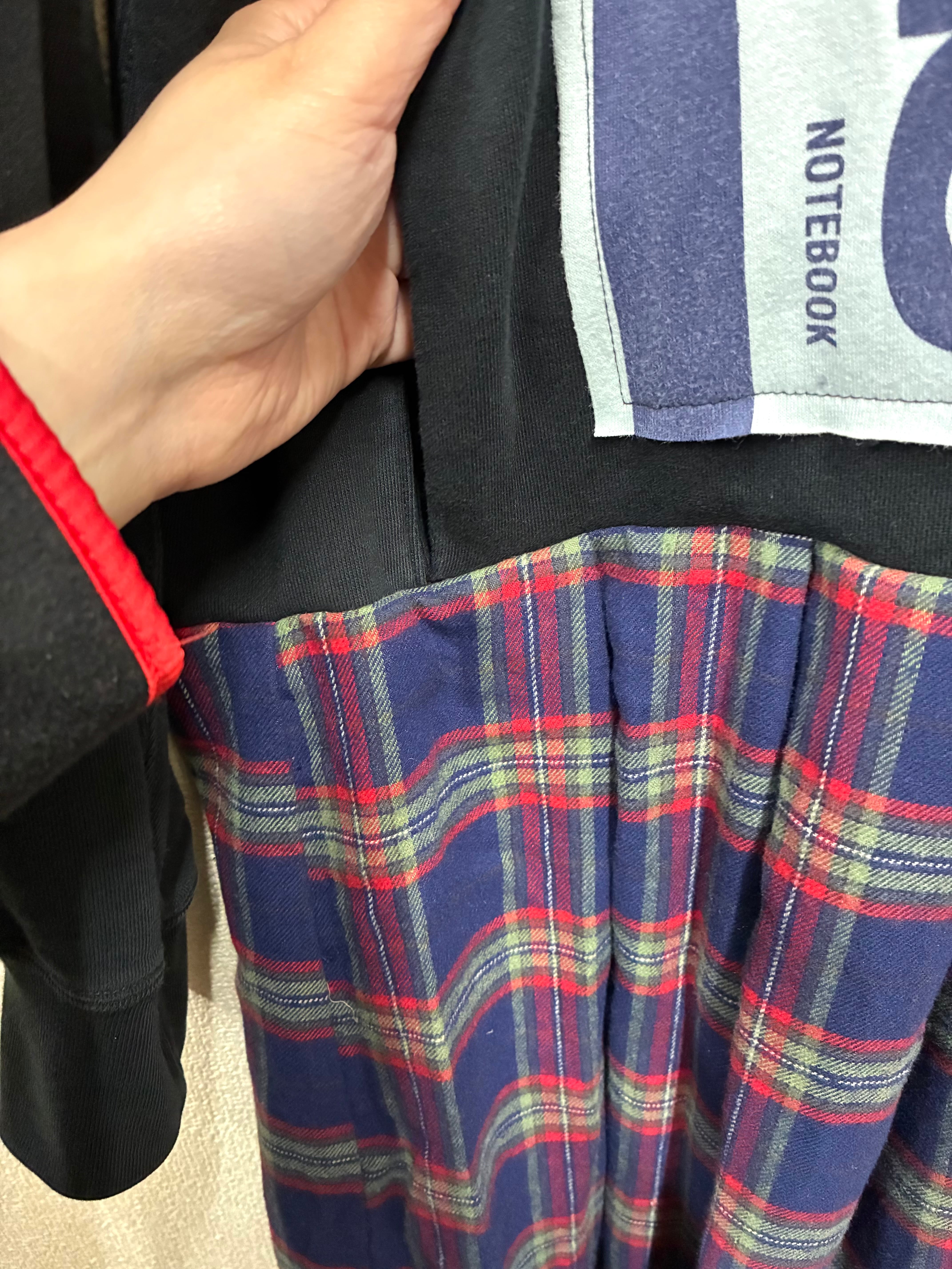 黒パーカーにノートを縫いつけ、チェック柄スカートを合わせています♬