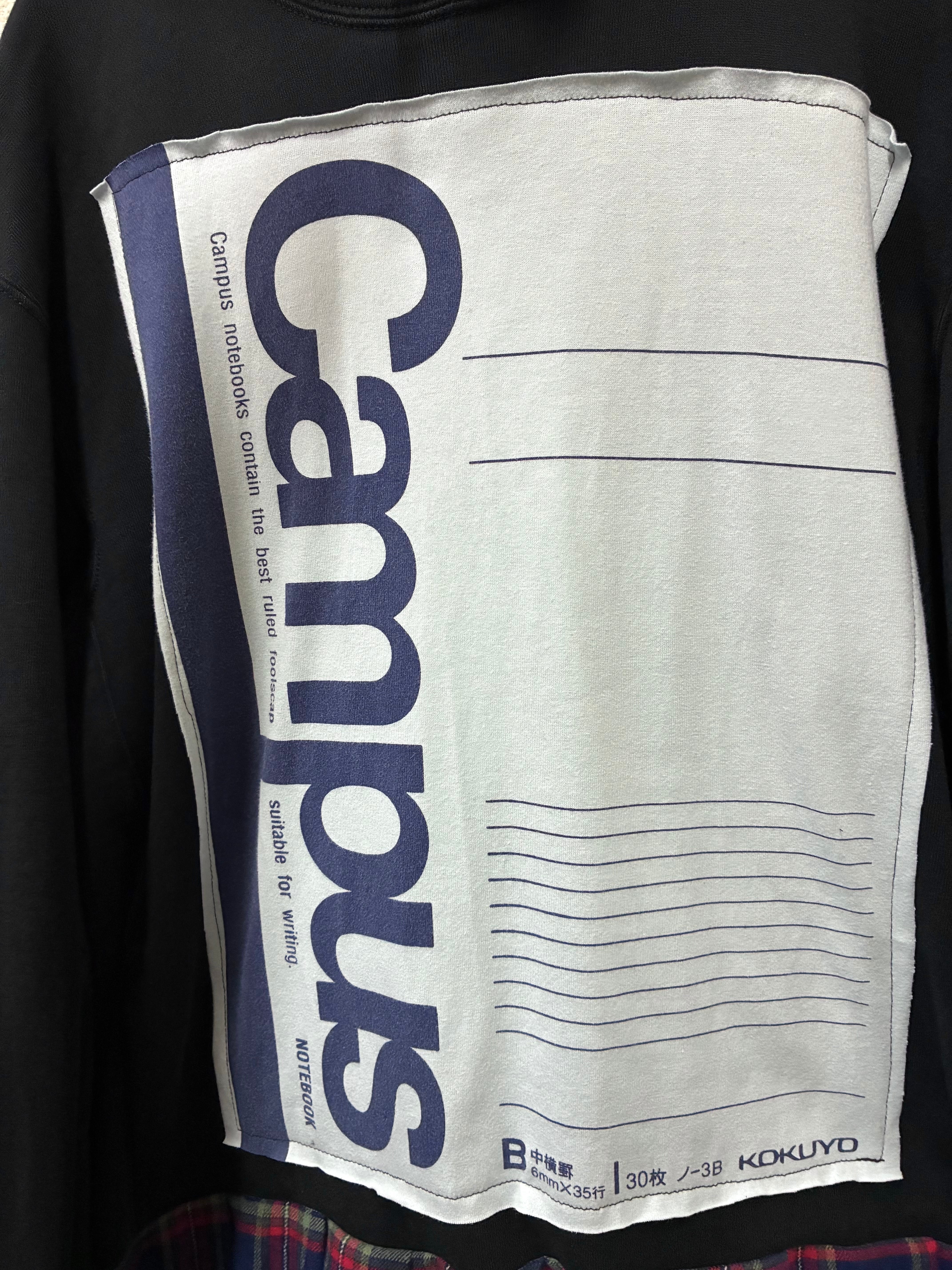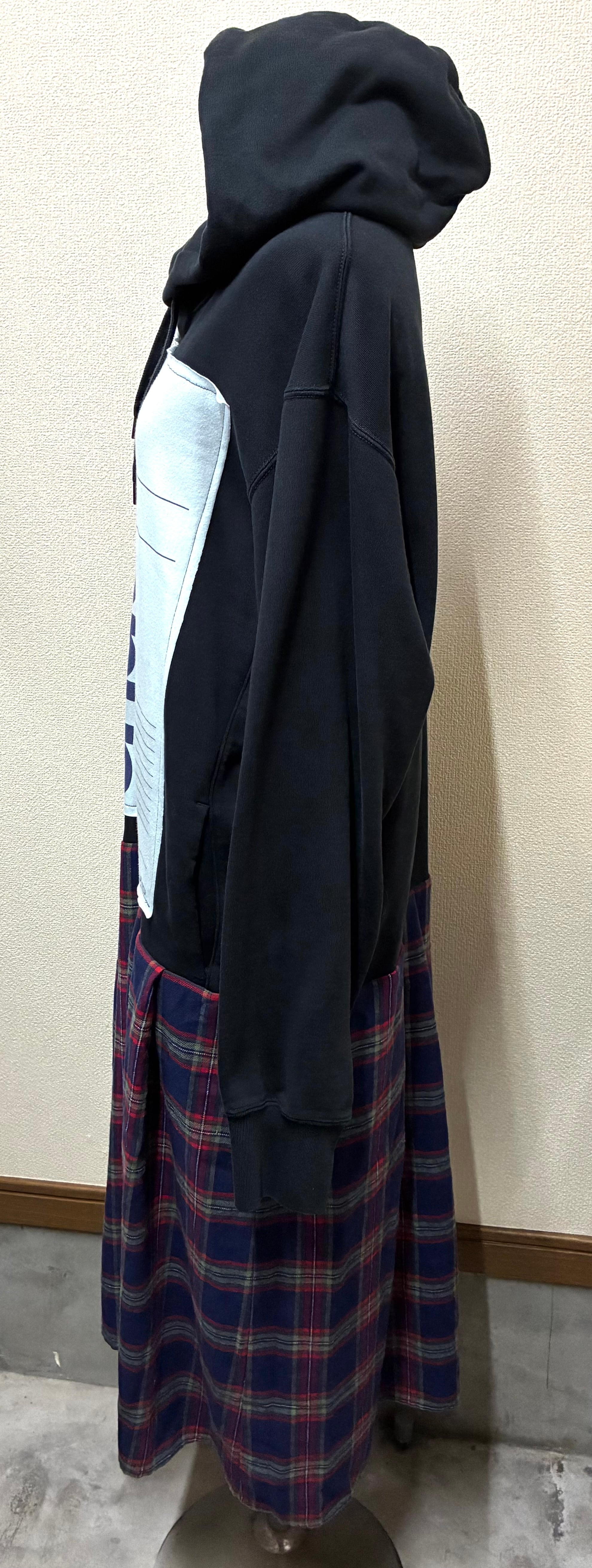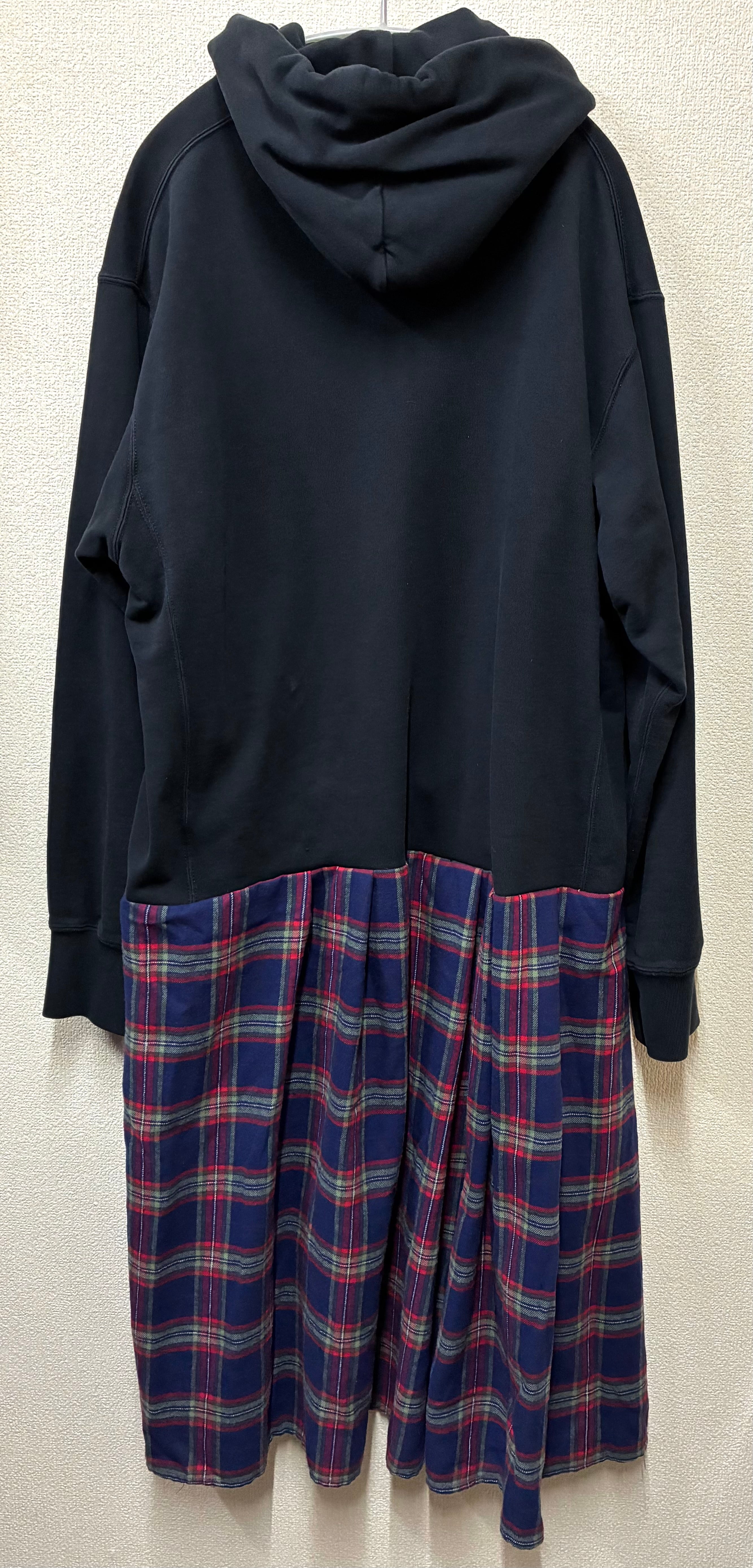 黒パーカーにノートを縫いつけ、チェック柄スカートを合わせています♬
