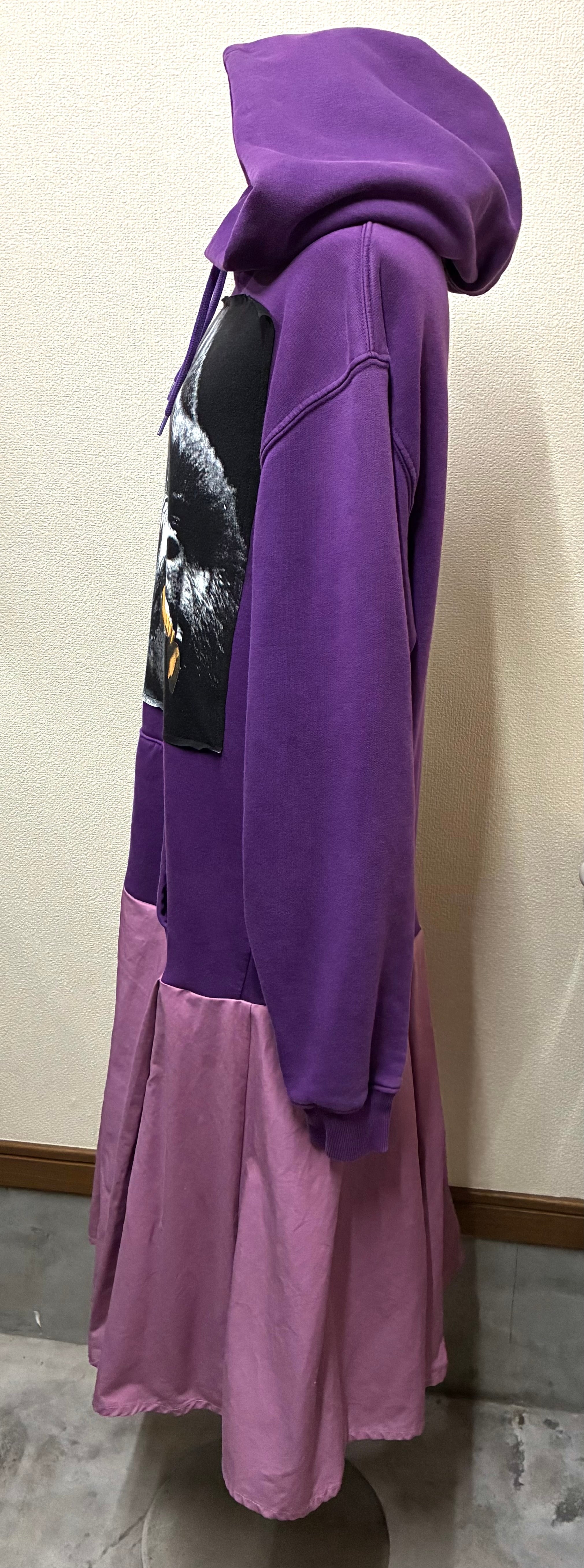 紫パーカーにゴリラを縫いつけ、しっかりした生地のピンクパープルのスカートを合わせています♬