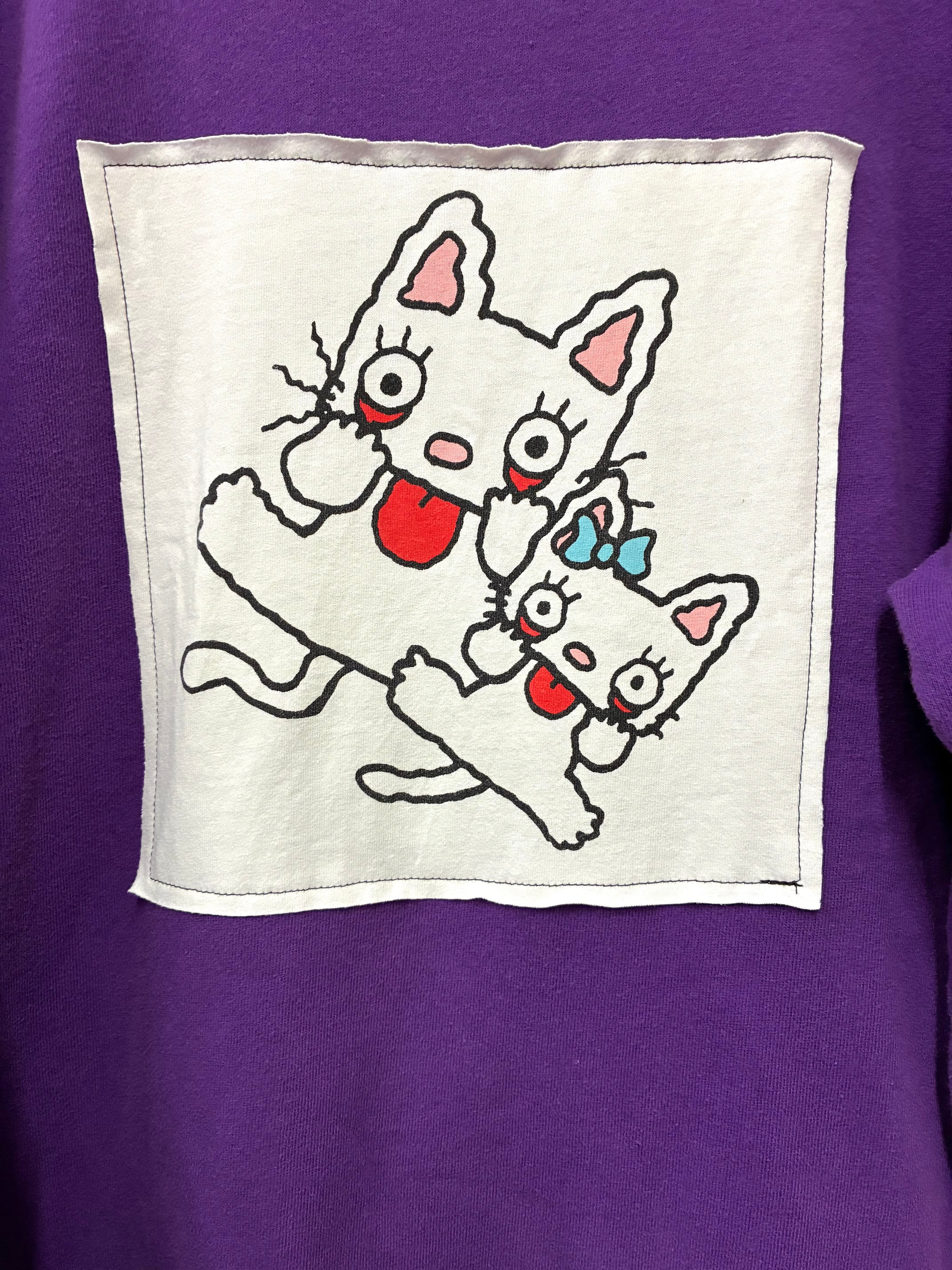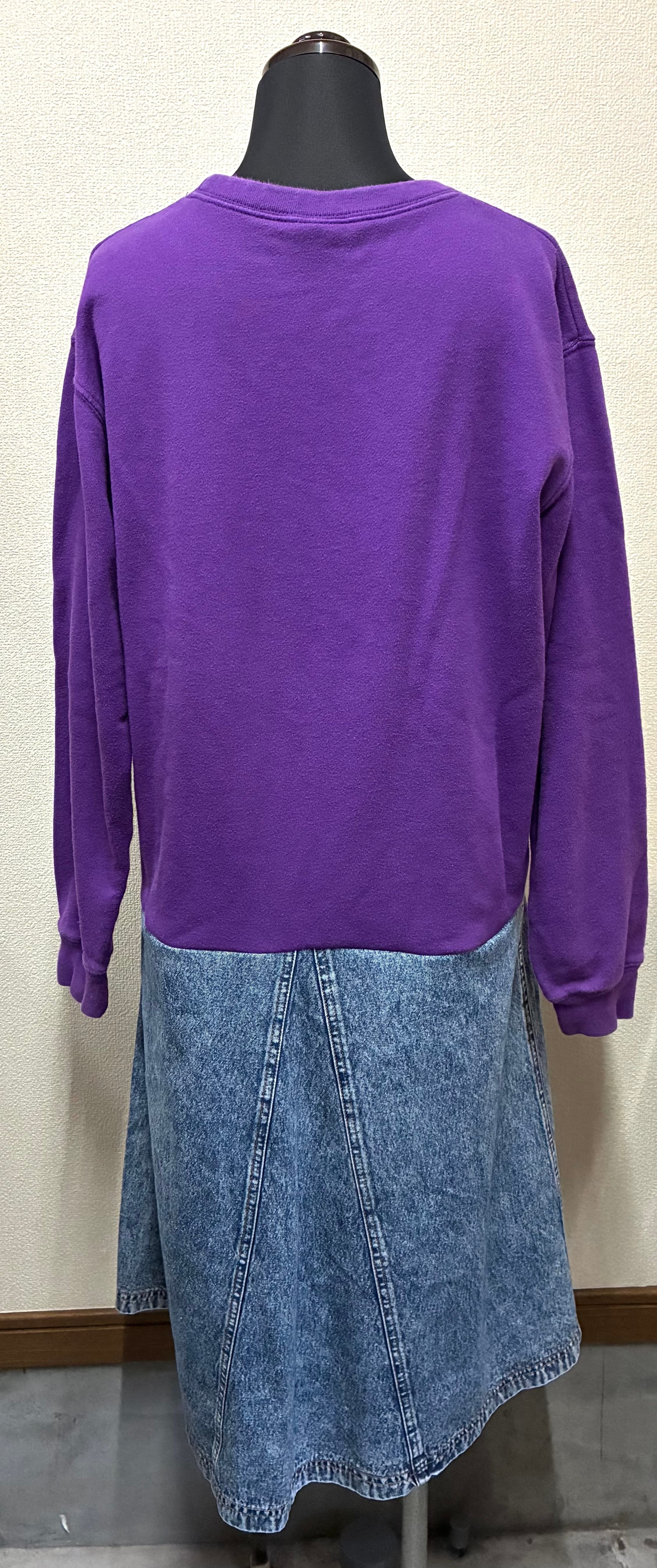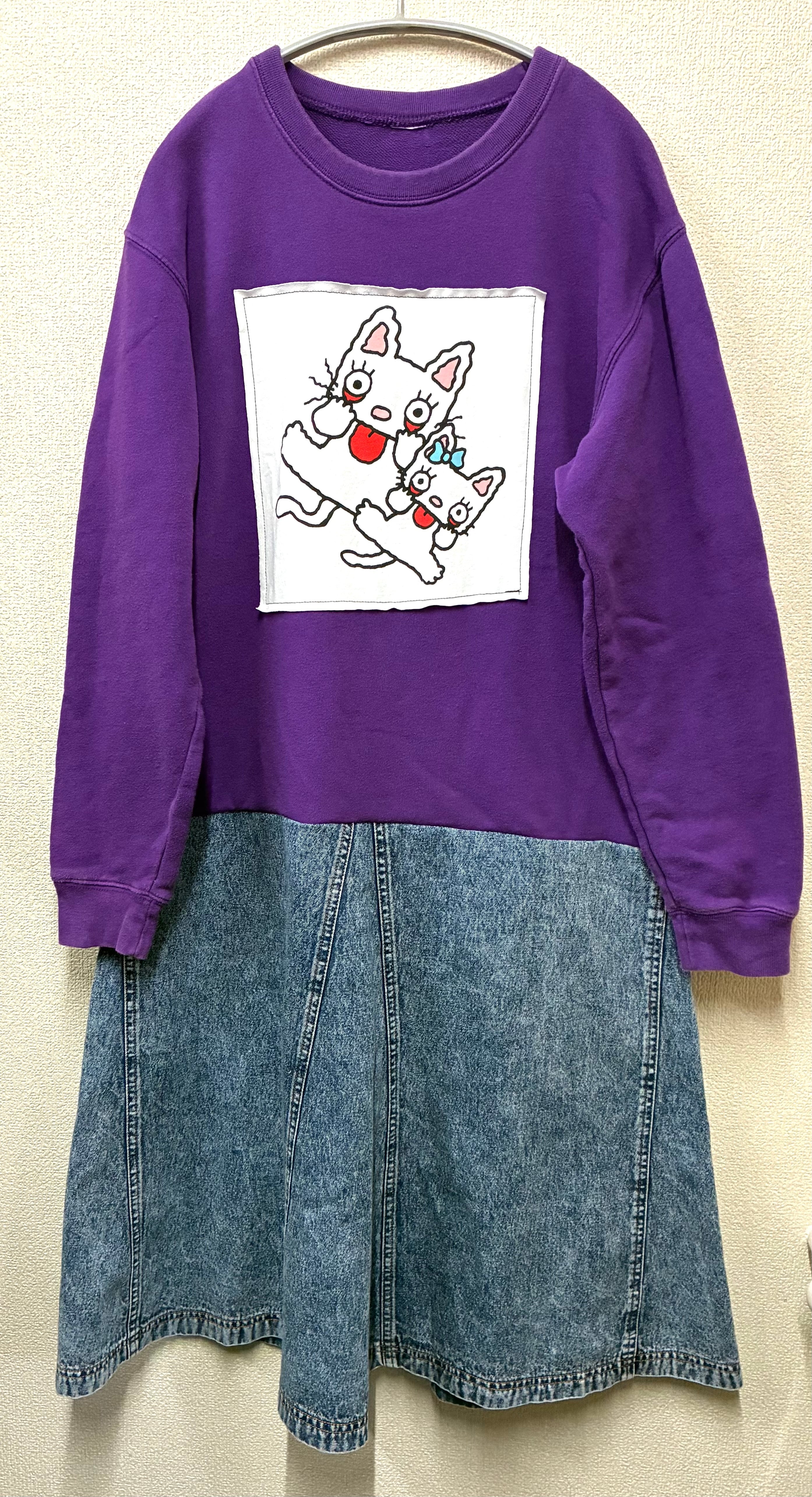 紫スウェットにかわいいあっかんべーを縫いつけ、デニムスカートを合わせています♬