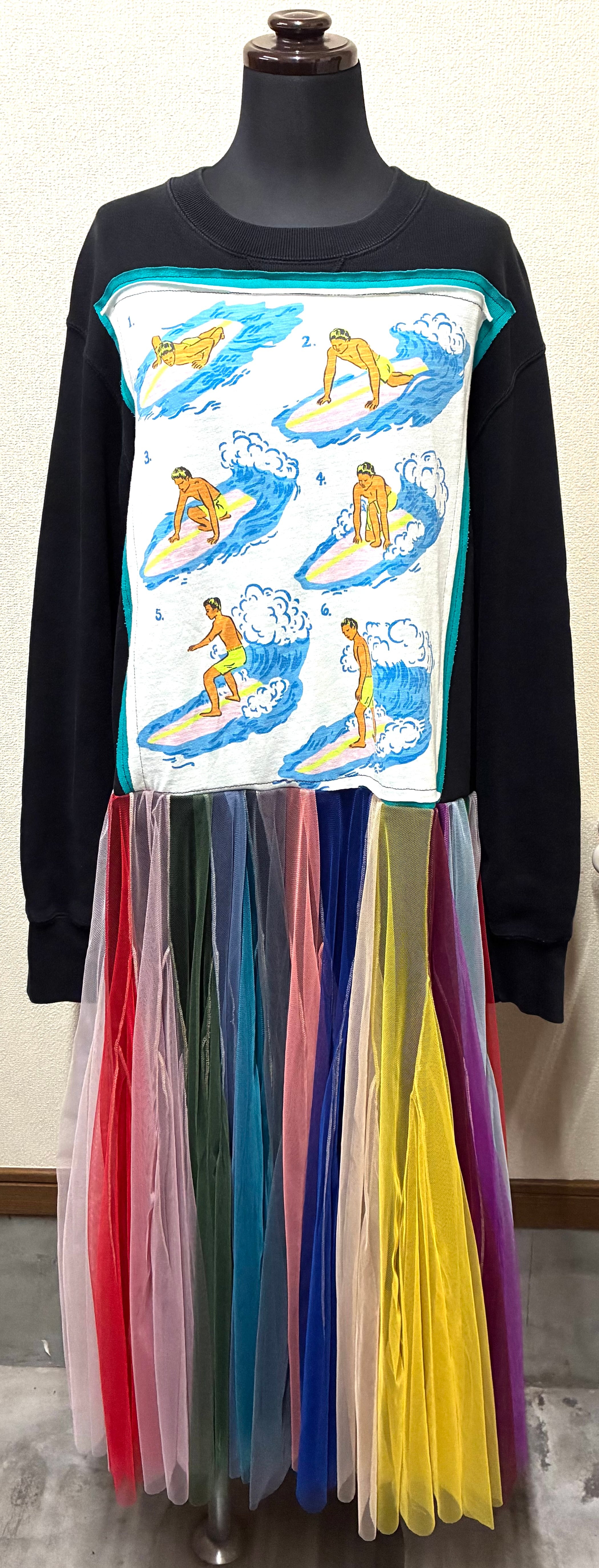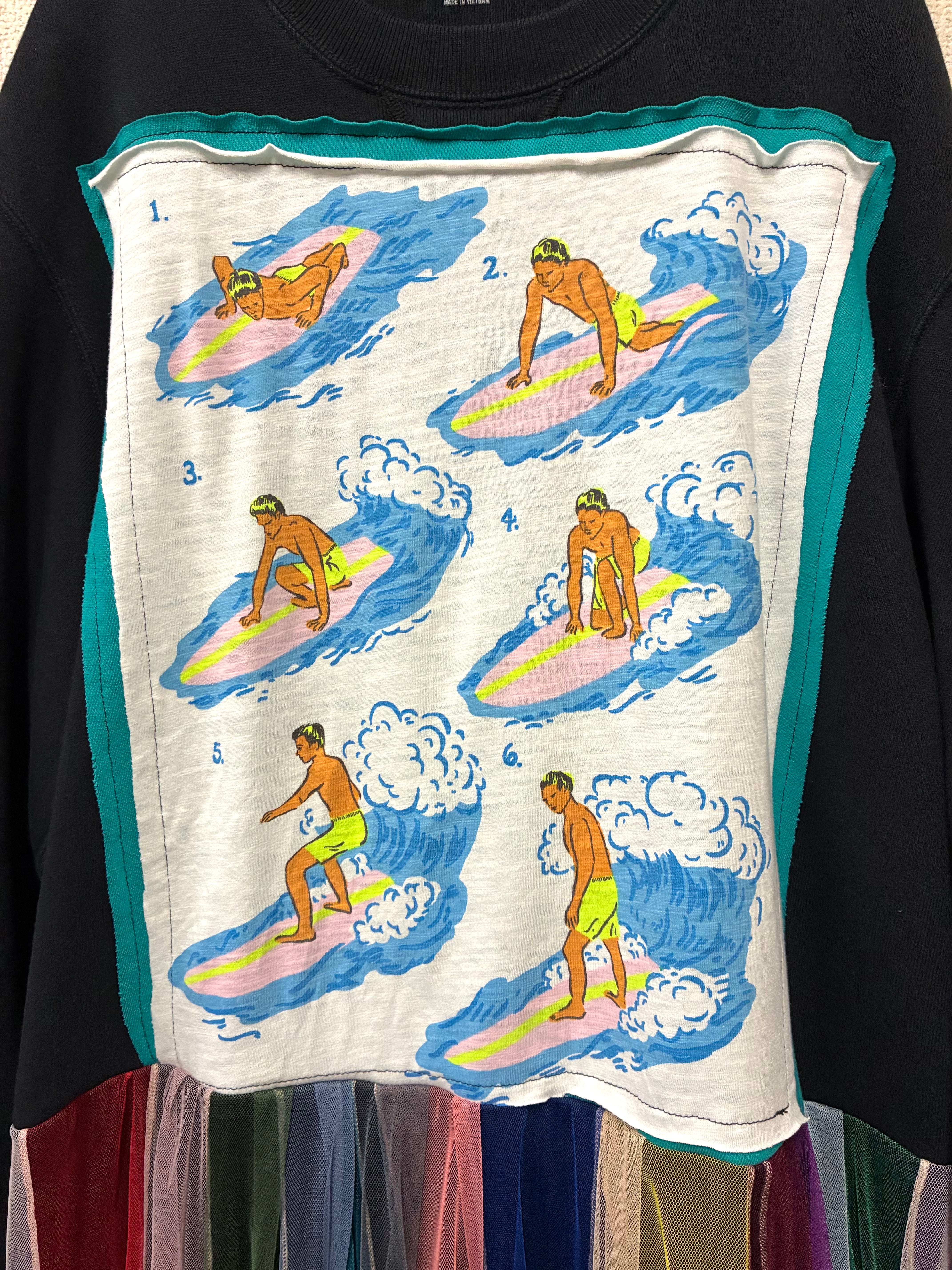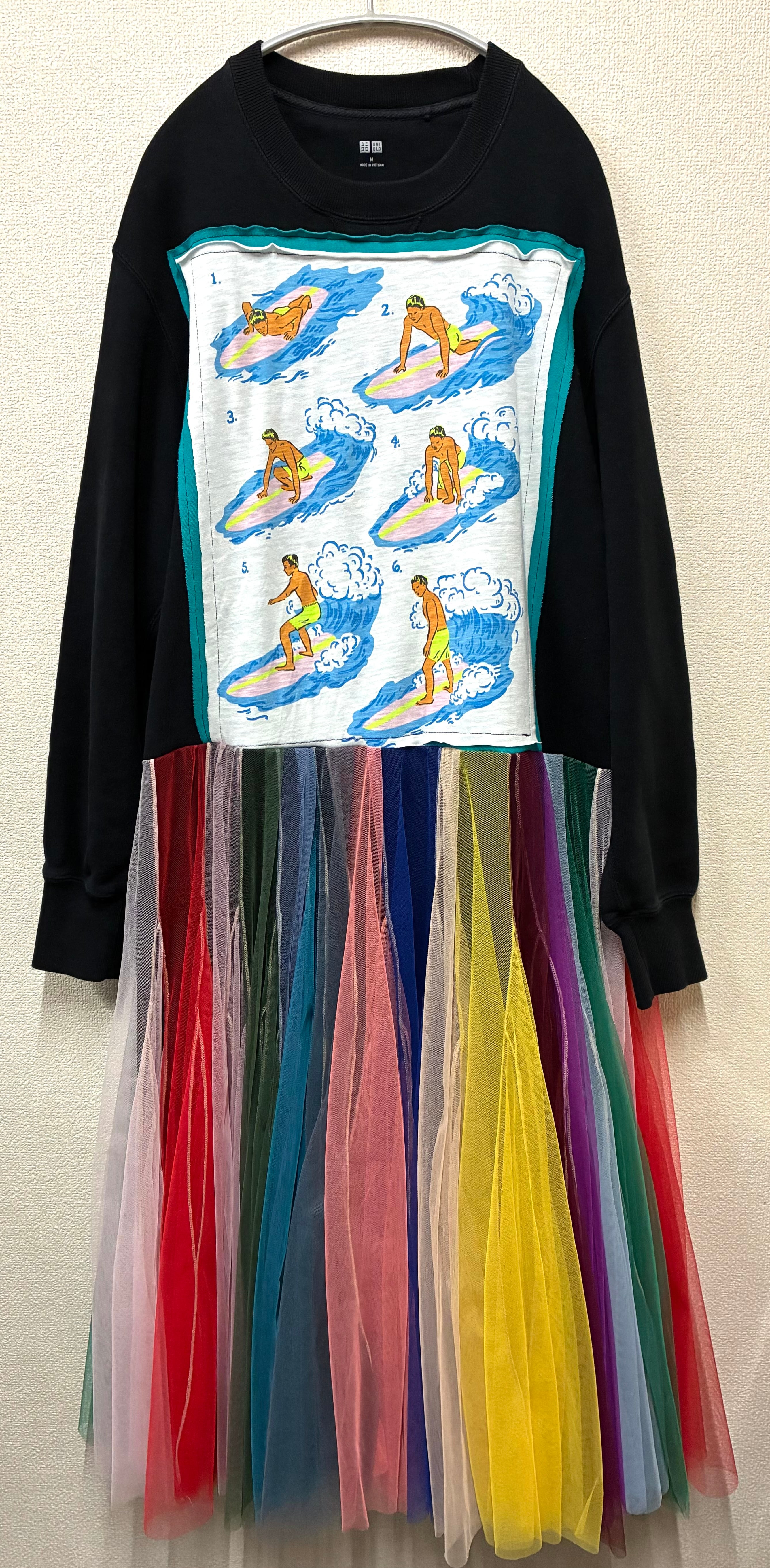 黒スウェットに波乗りを縫いつけ、ボリュームあるカラフルなチュールスカートを合わせています♬