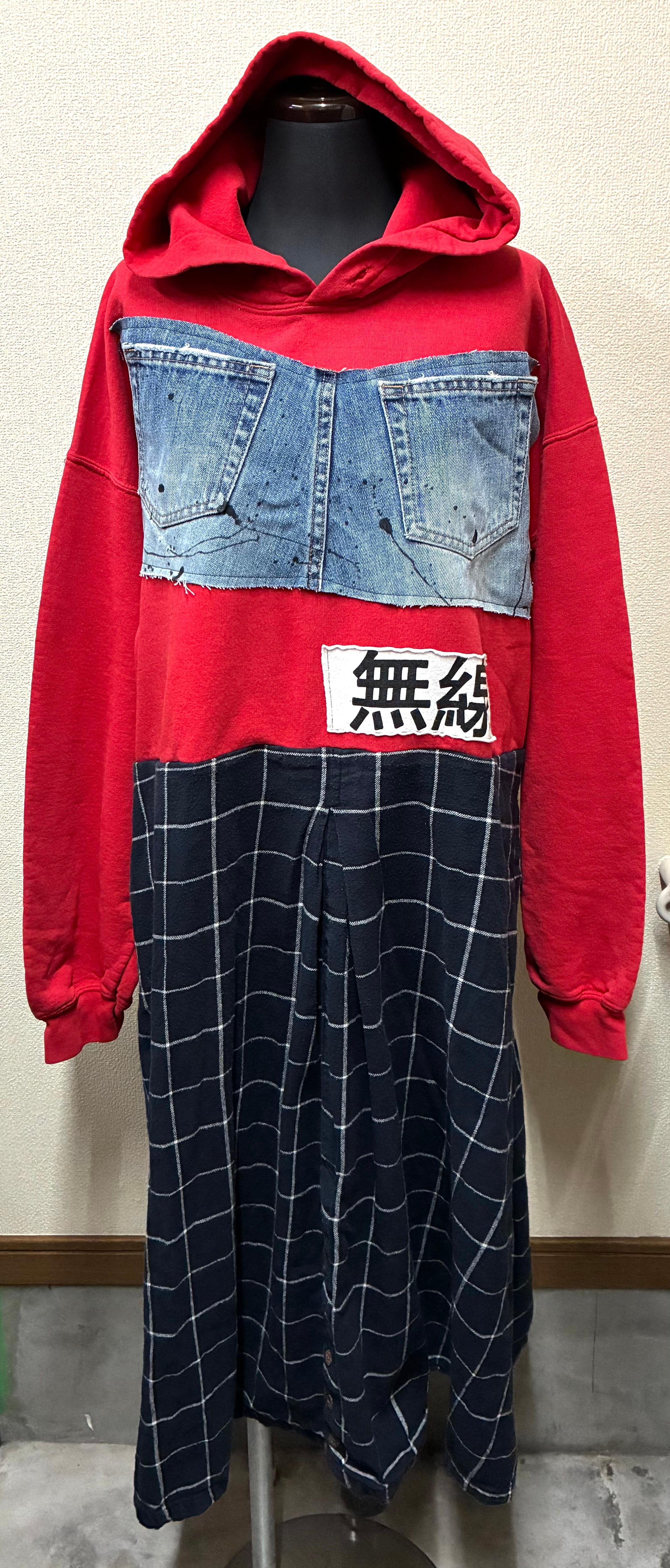 赤パーカーにデニムポケットと無線を縫いつけ、濃紺のチェックスカートを合わせています♬