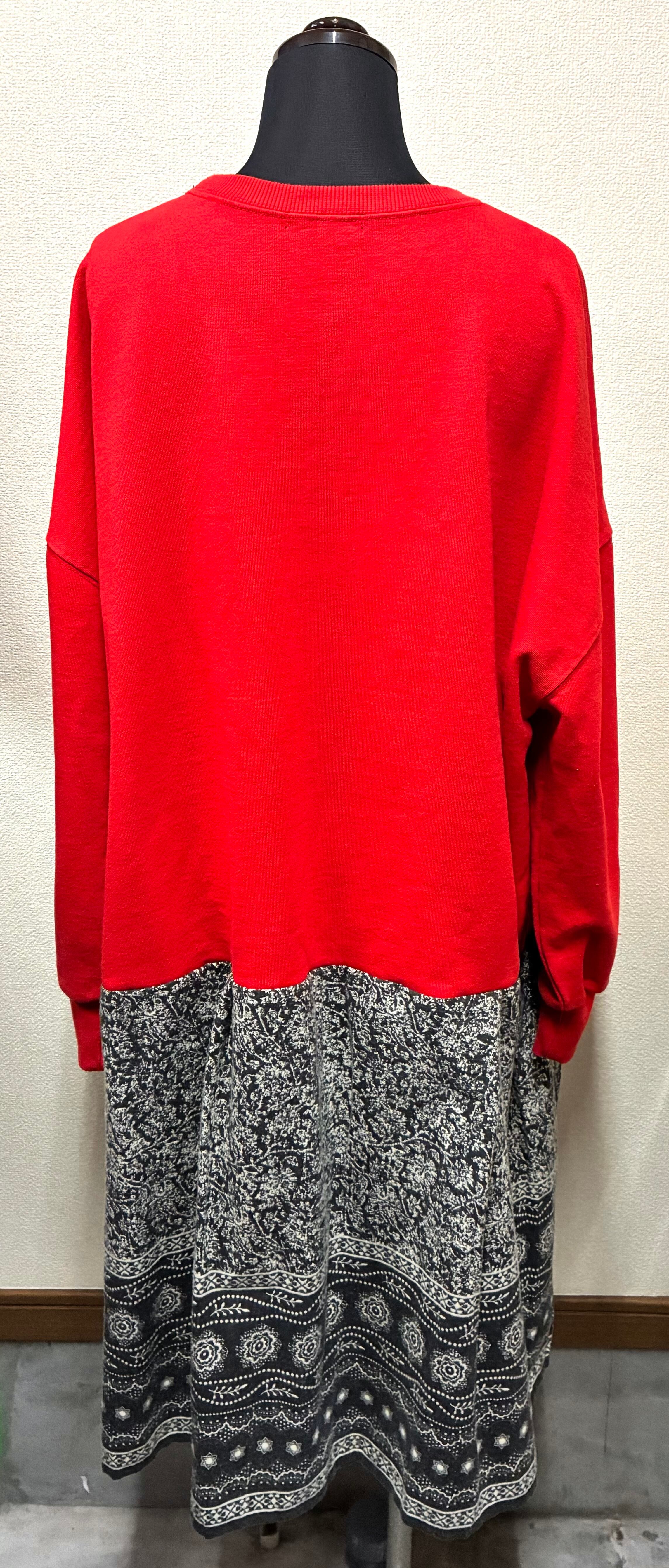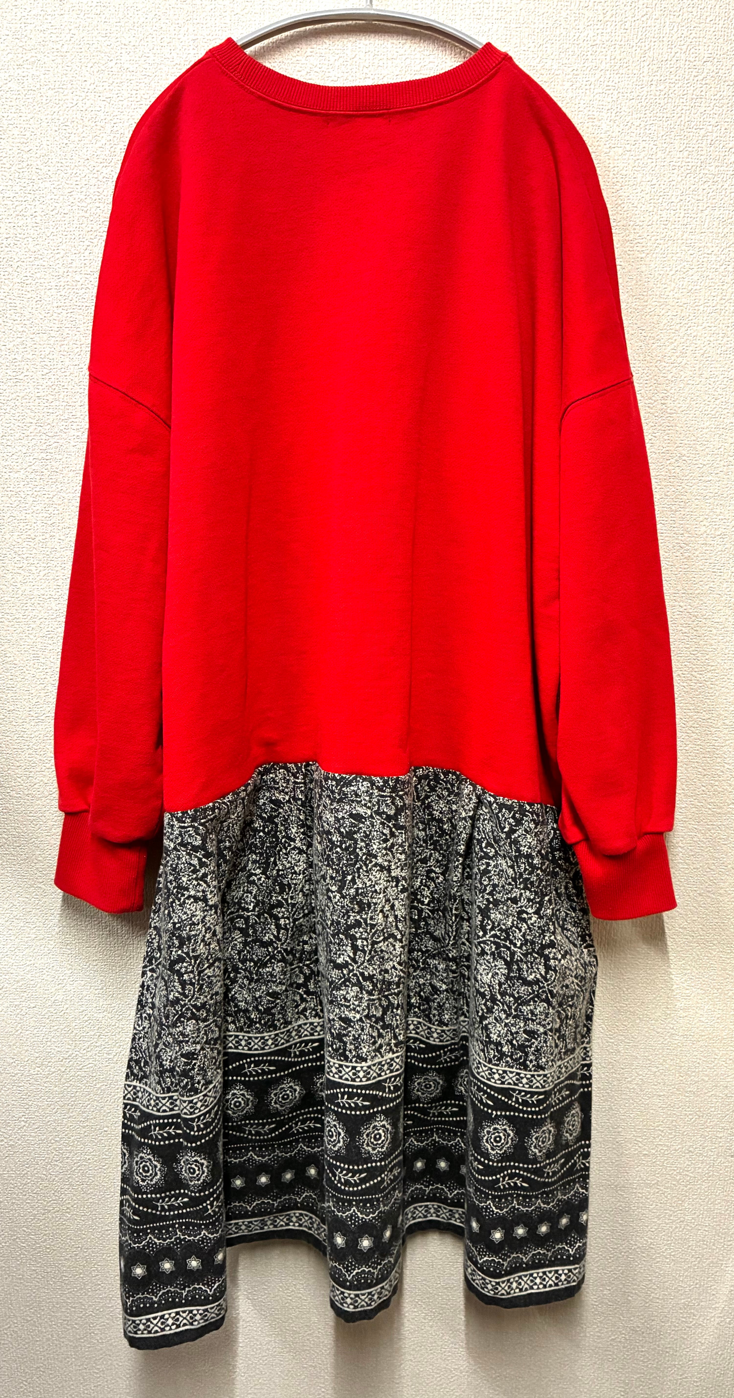 赤スウェットにかわいいのを縫いつけ、ネル生地の柄スカートを合わせています♬