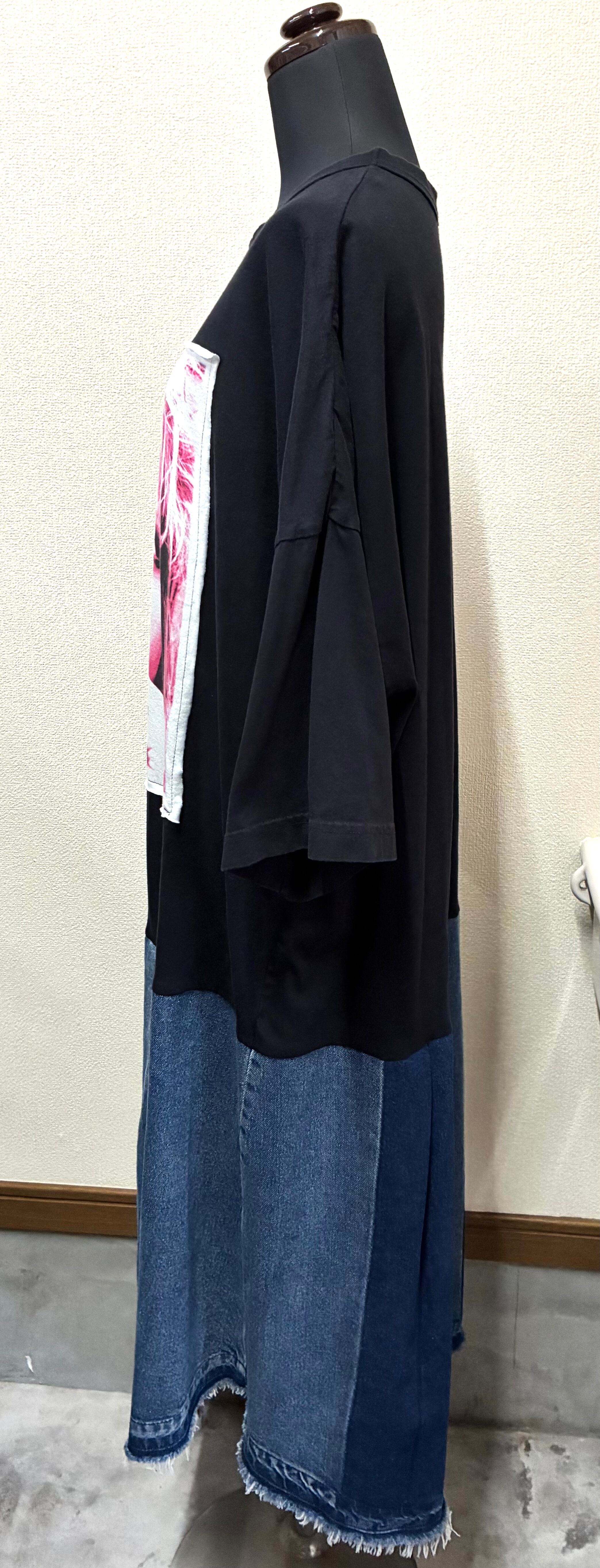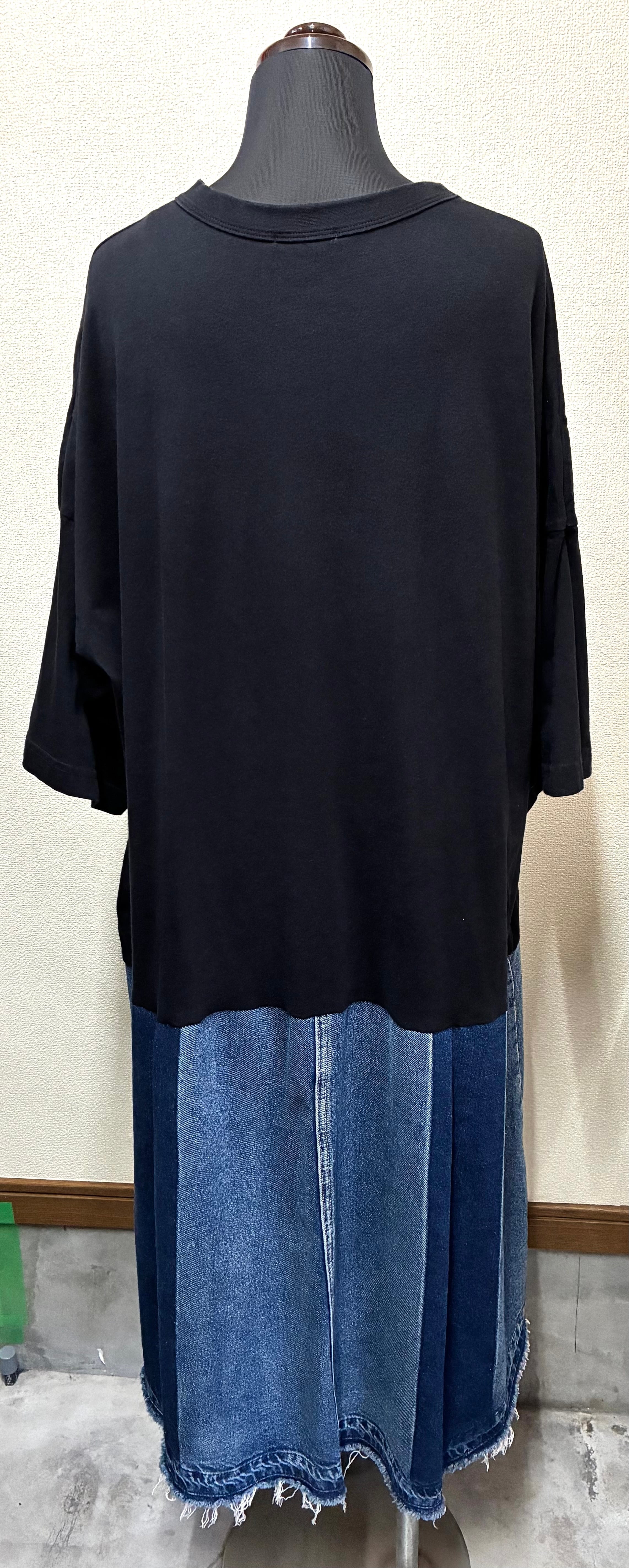 黒Tシャツに女性を縫いつけ、デニムスカートを合わせています♬