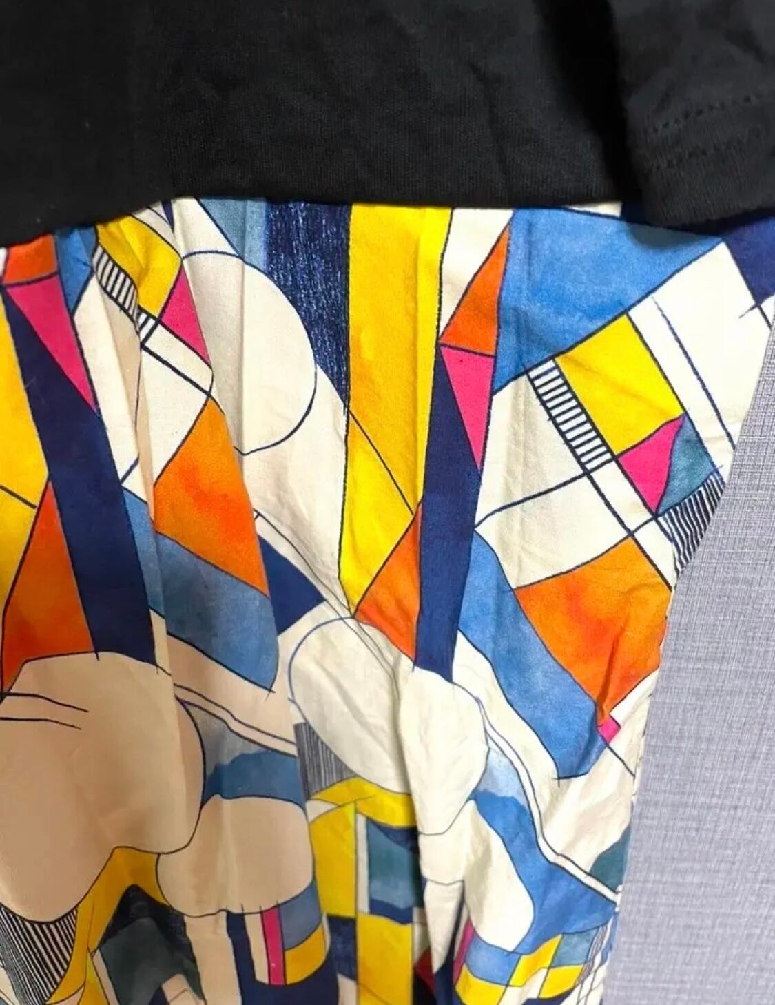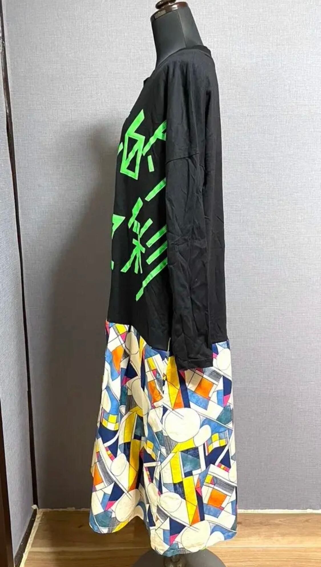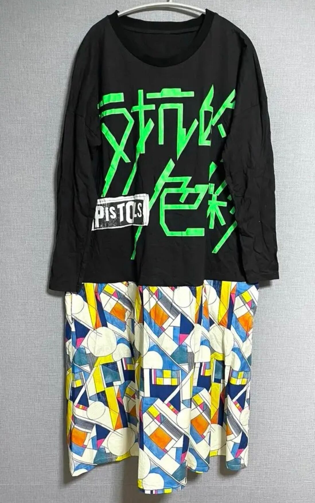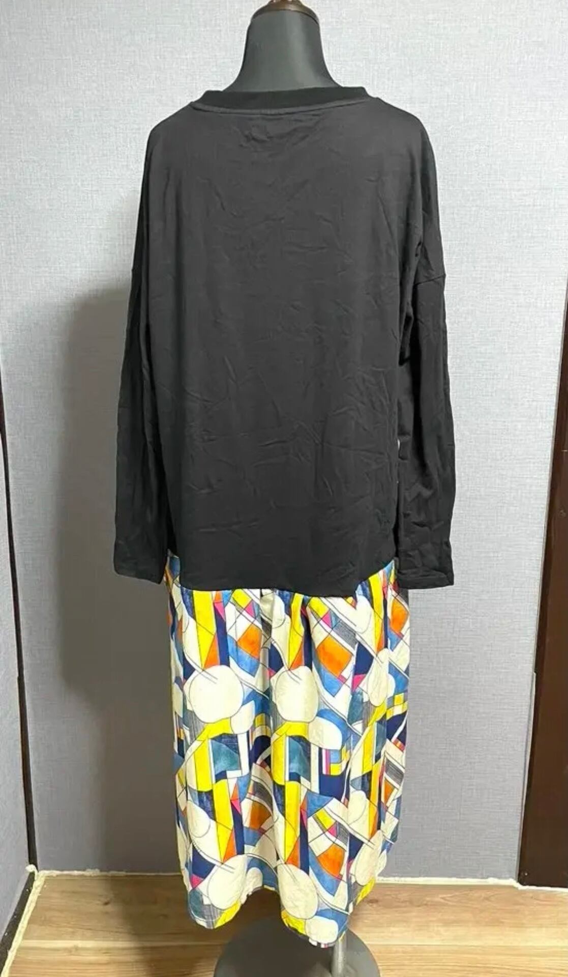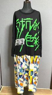 黄緑が目立つ黒のカットソーに、レトロ調な柄スカートを合わせています♬
