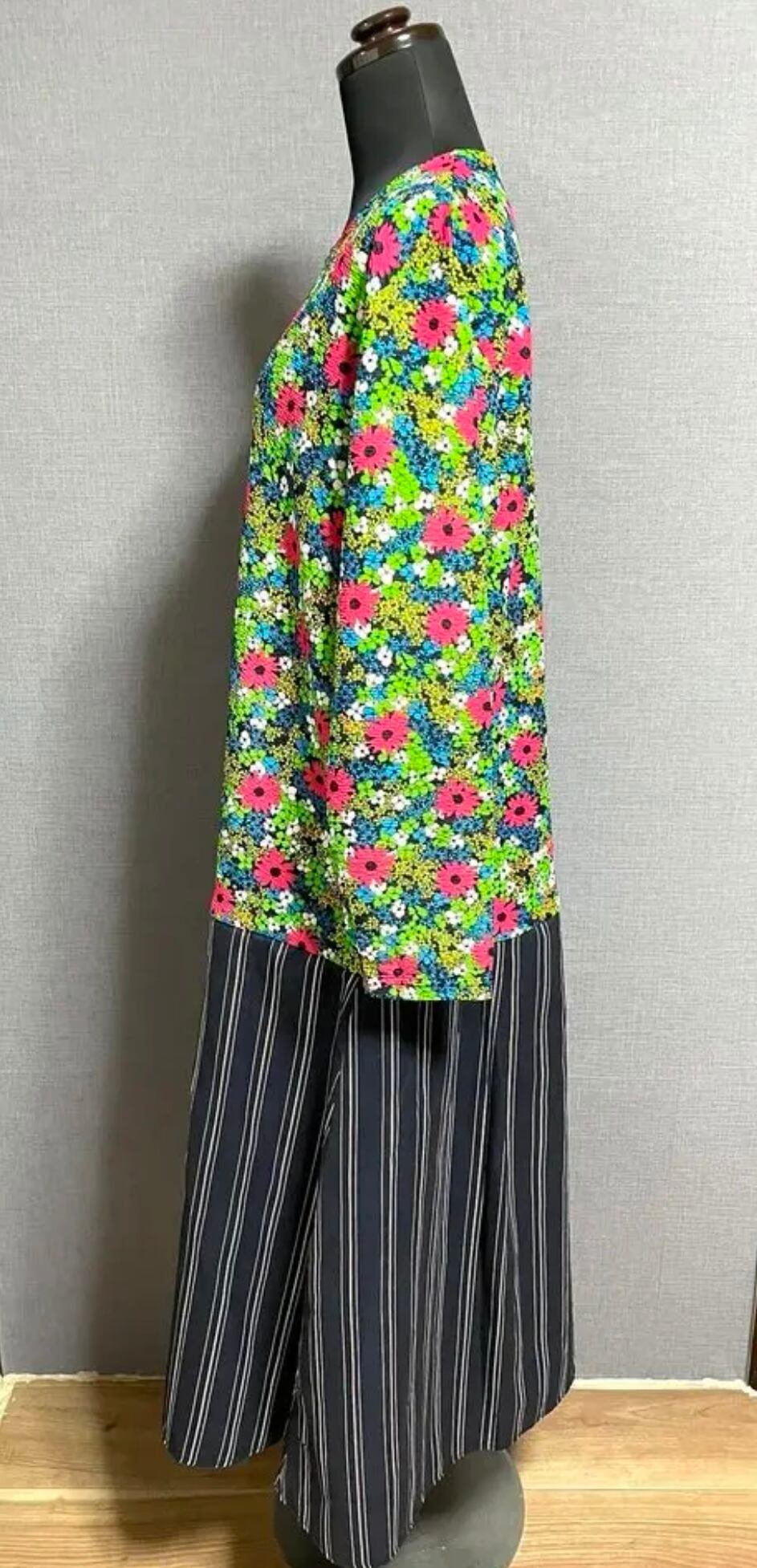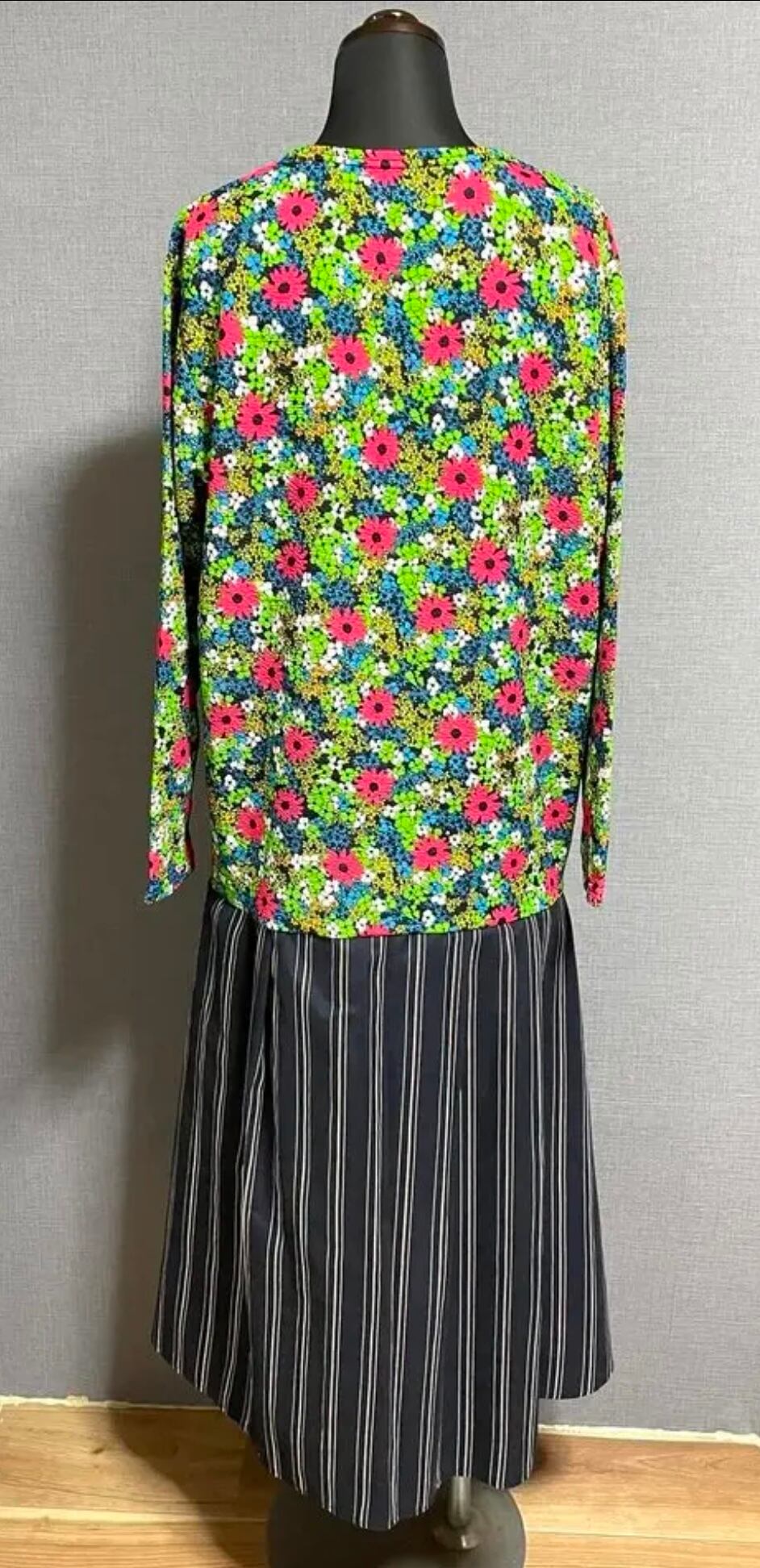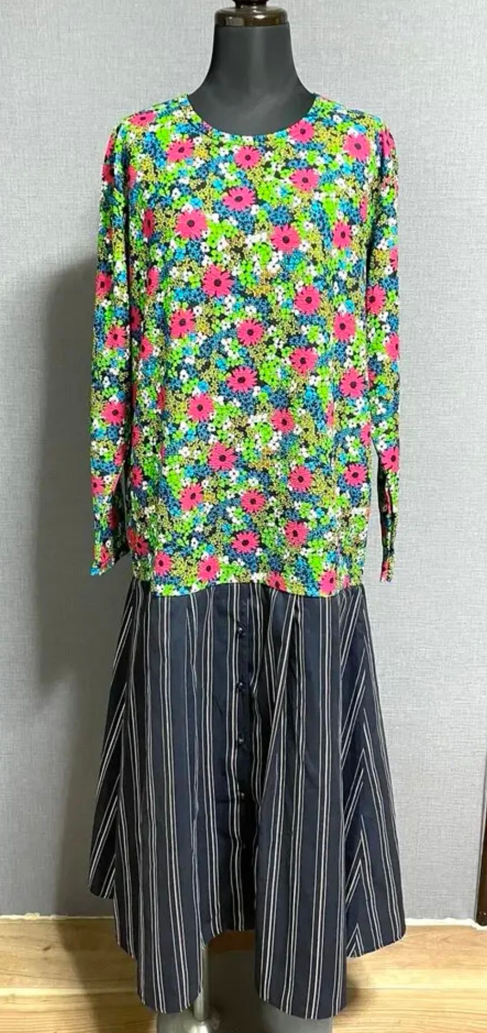 ネオンカラーがかわいいレトロ花柄トップスに、ネイビーのストライプ柄スカートを合わせています♬