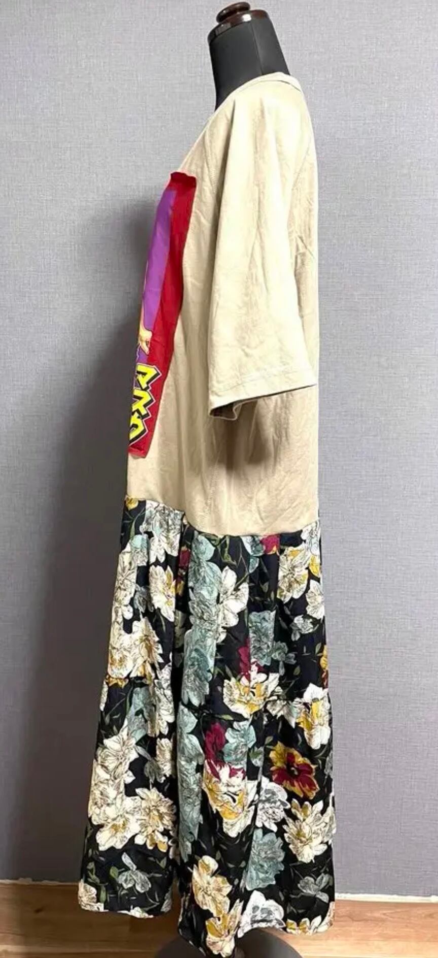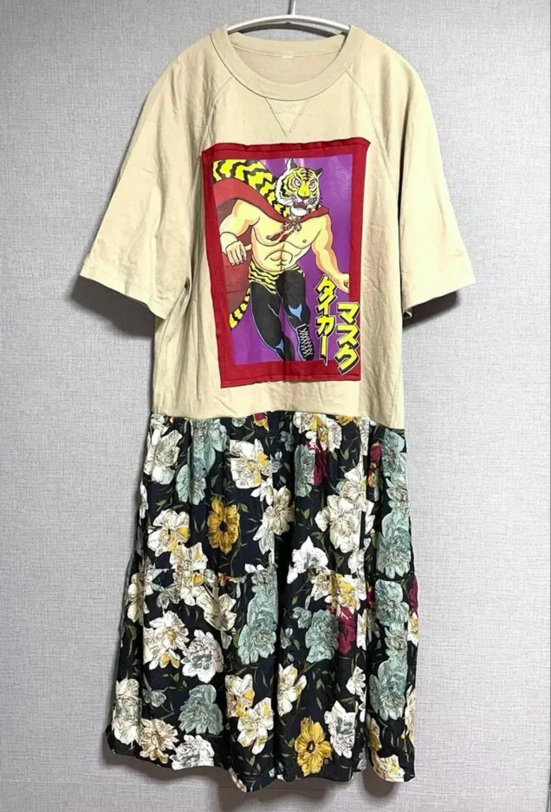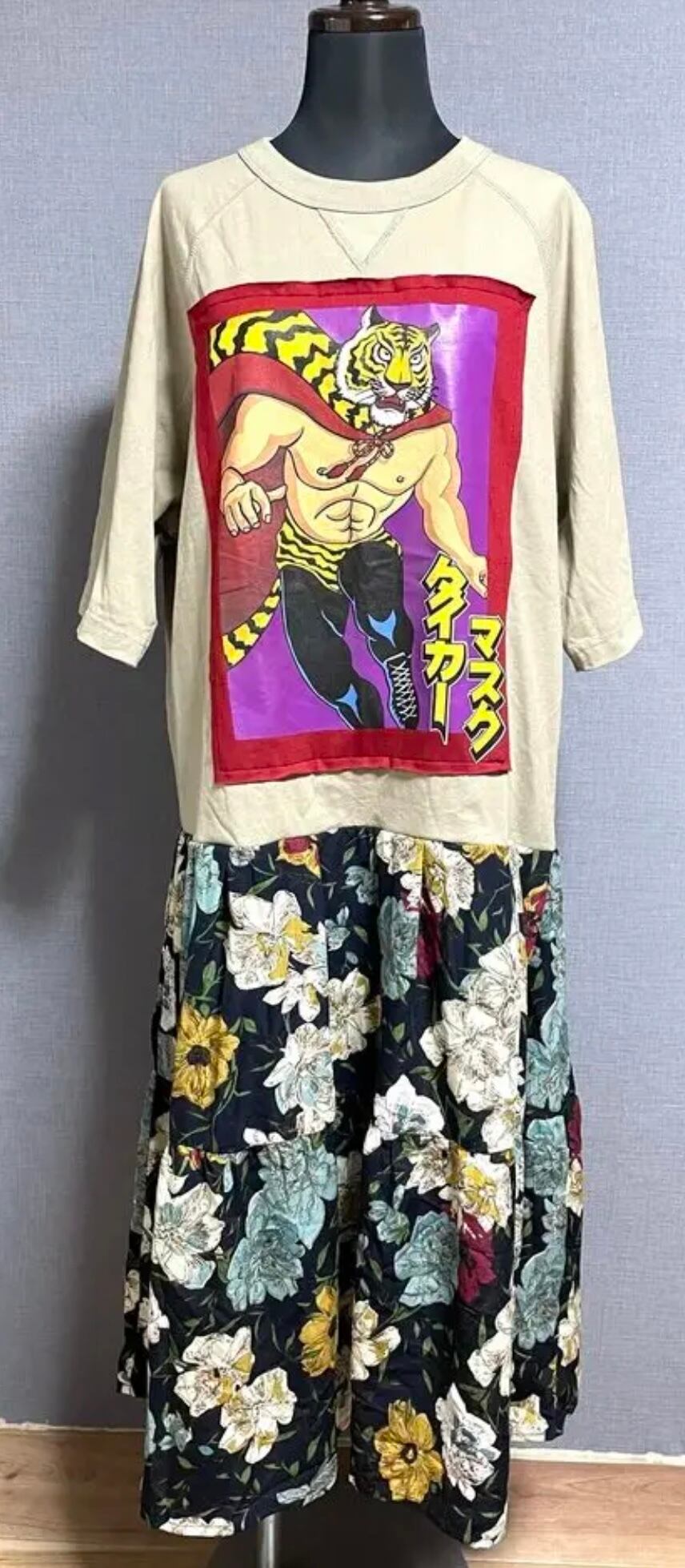 ベージュのラグランTシャツにかっこいいタイガーくんを縫いつけ、濃紺ベースの花柄スカートを合わせています♬