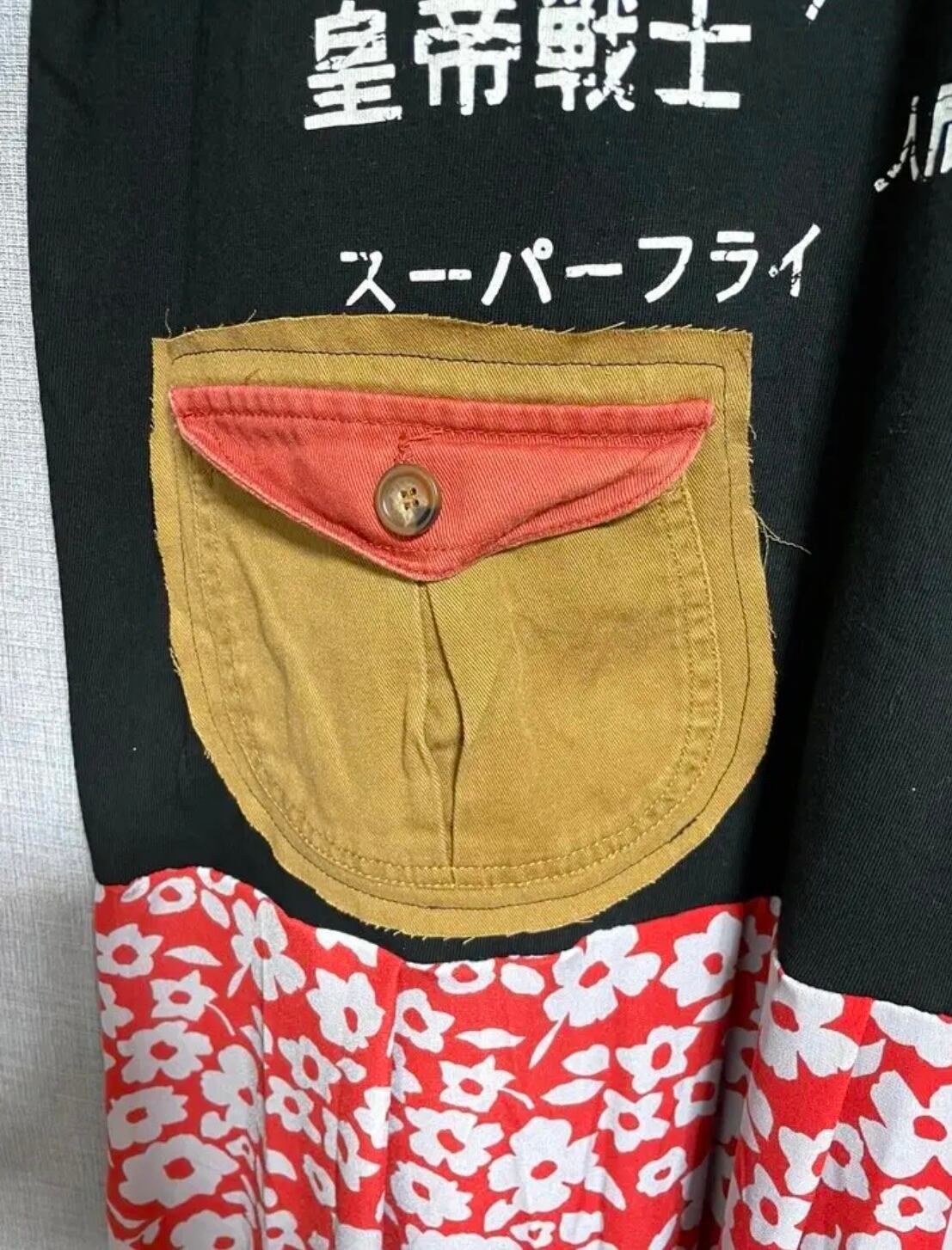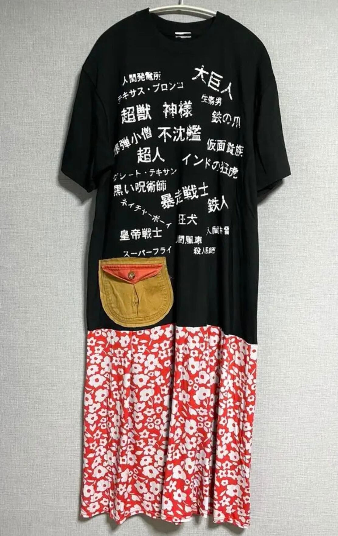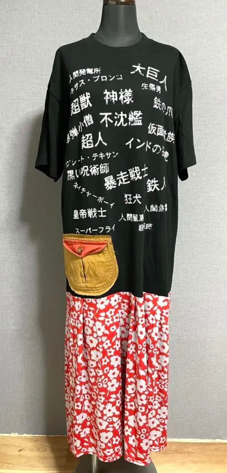 プロレススター大集結黒Tシャツにフタ付きポケットを縫いつけ、花柄スカートを合わせています♬