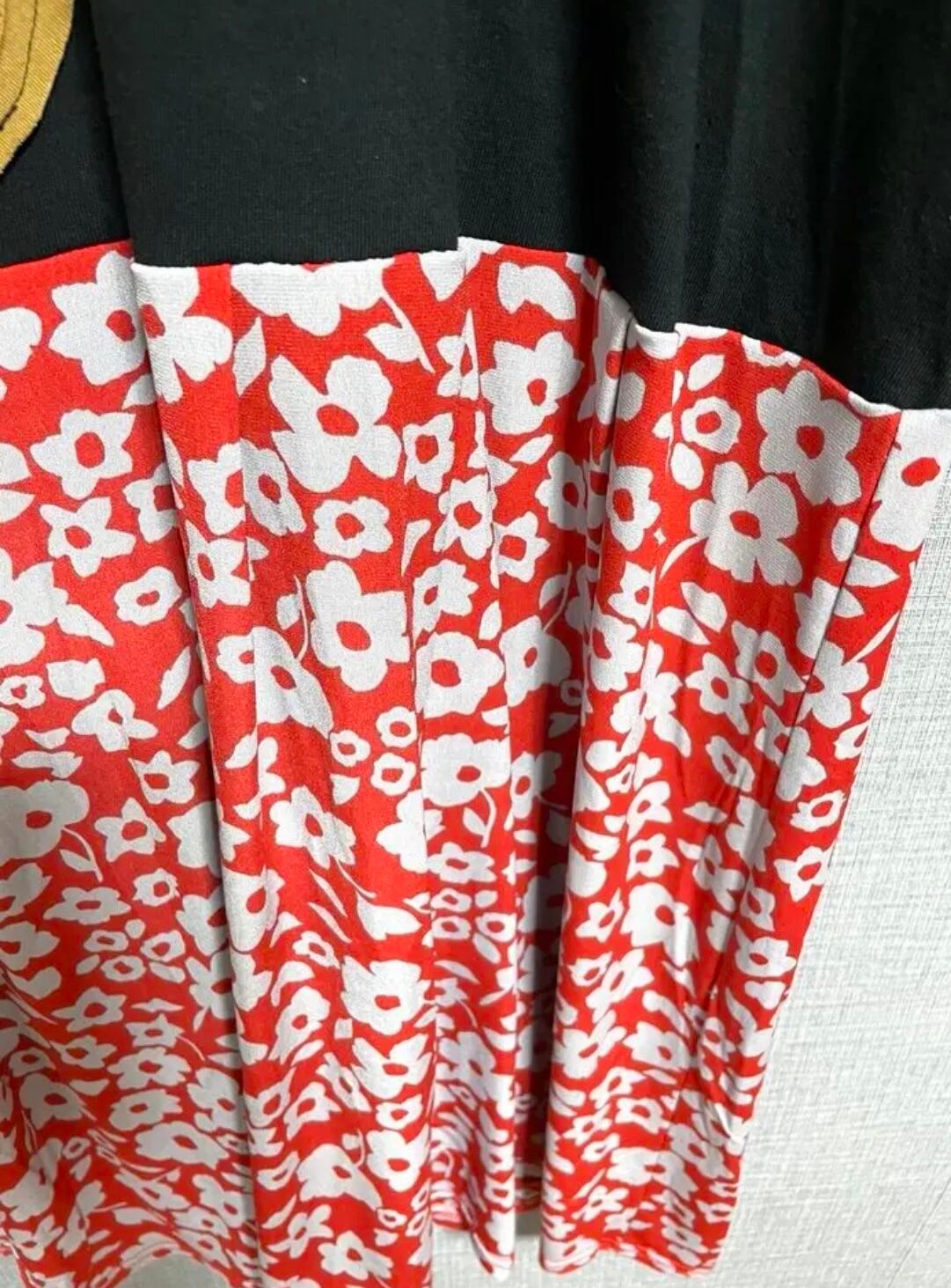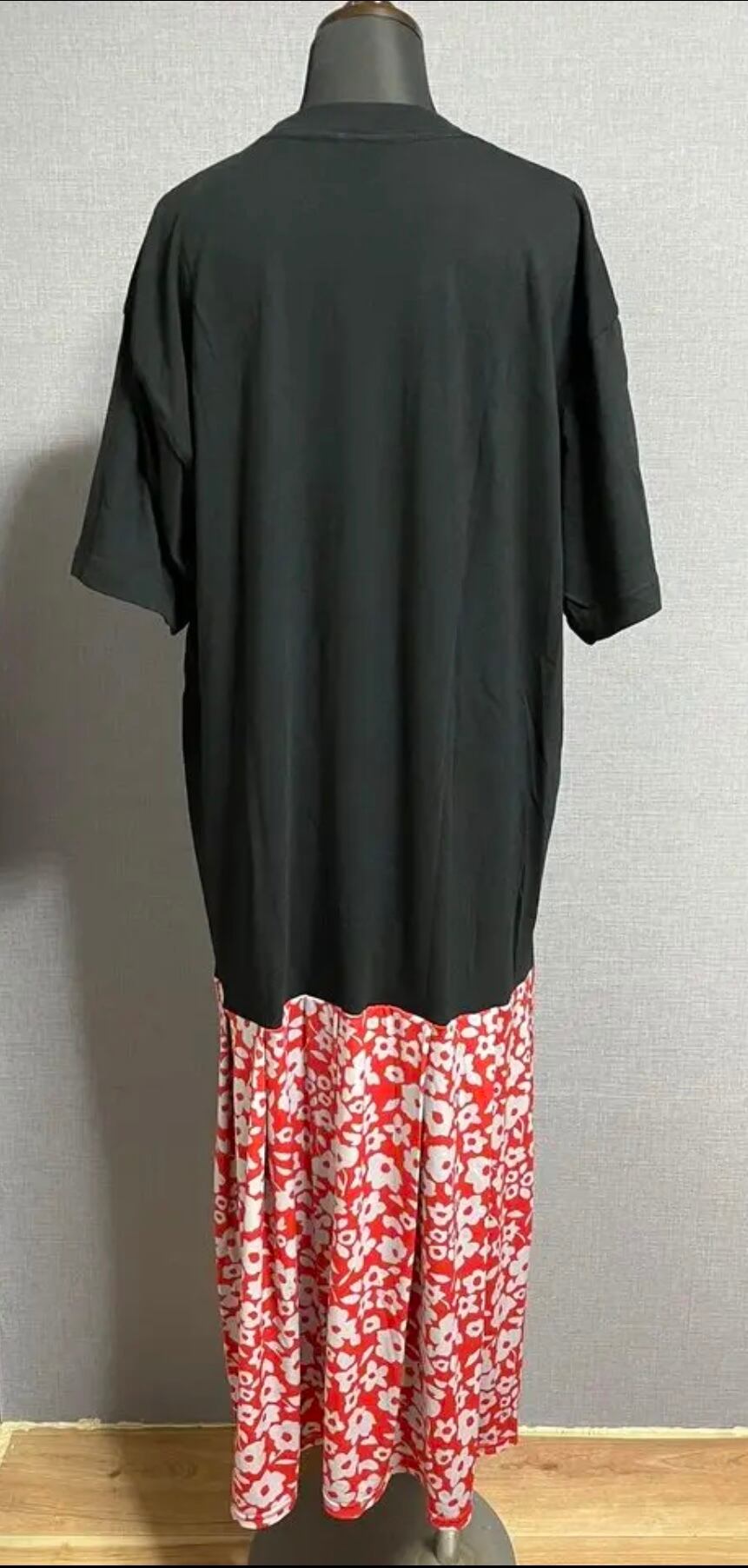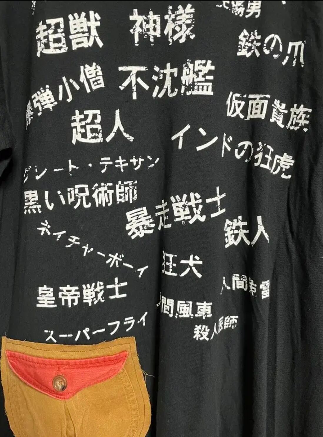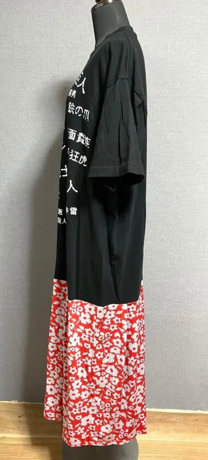 プロレススター大集結黒Tシャツにフタ付きポケットを縫いつけ、花柄スカートを合わせています♬