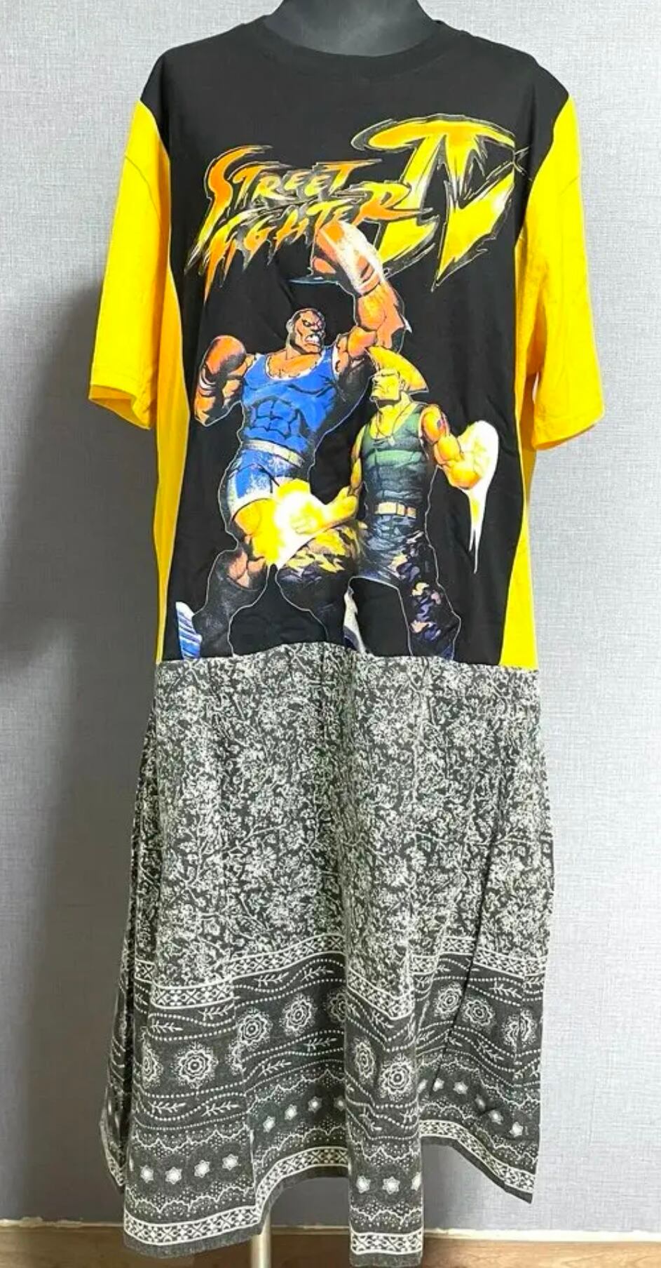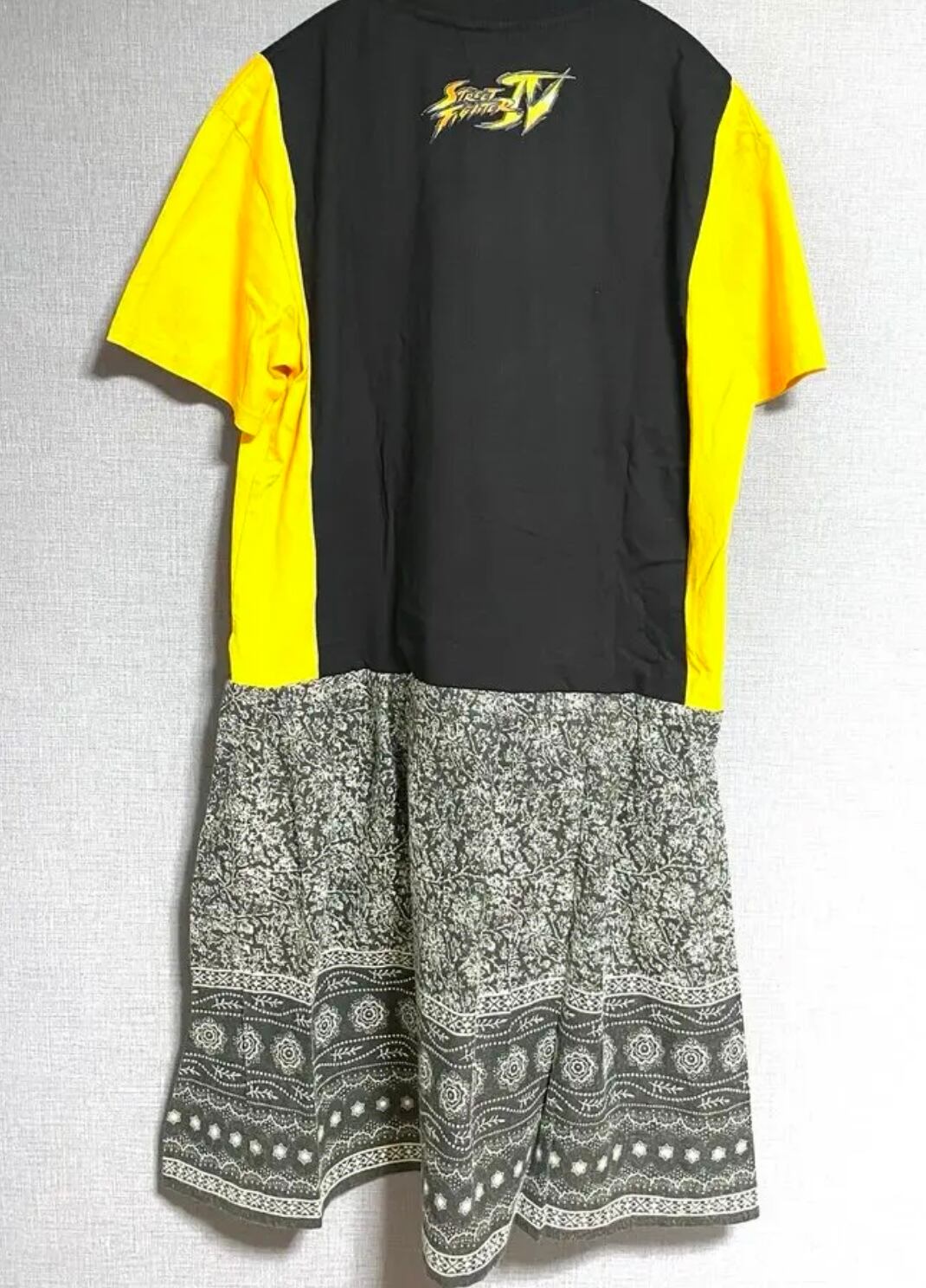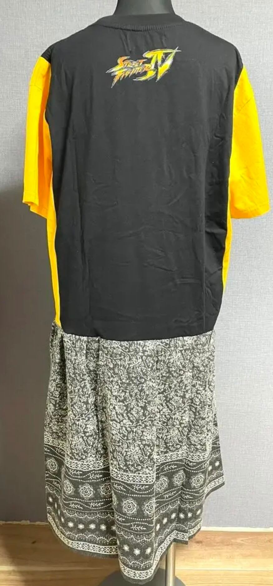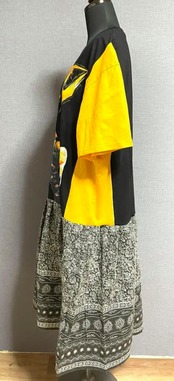かっこいいプリント黒Tシャツに袖とサイドは黄色を合わせ、柄スカートを合わせています♬