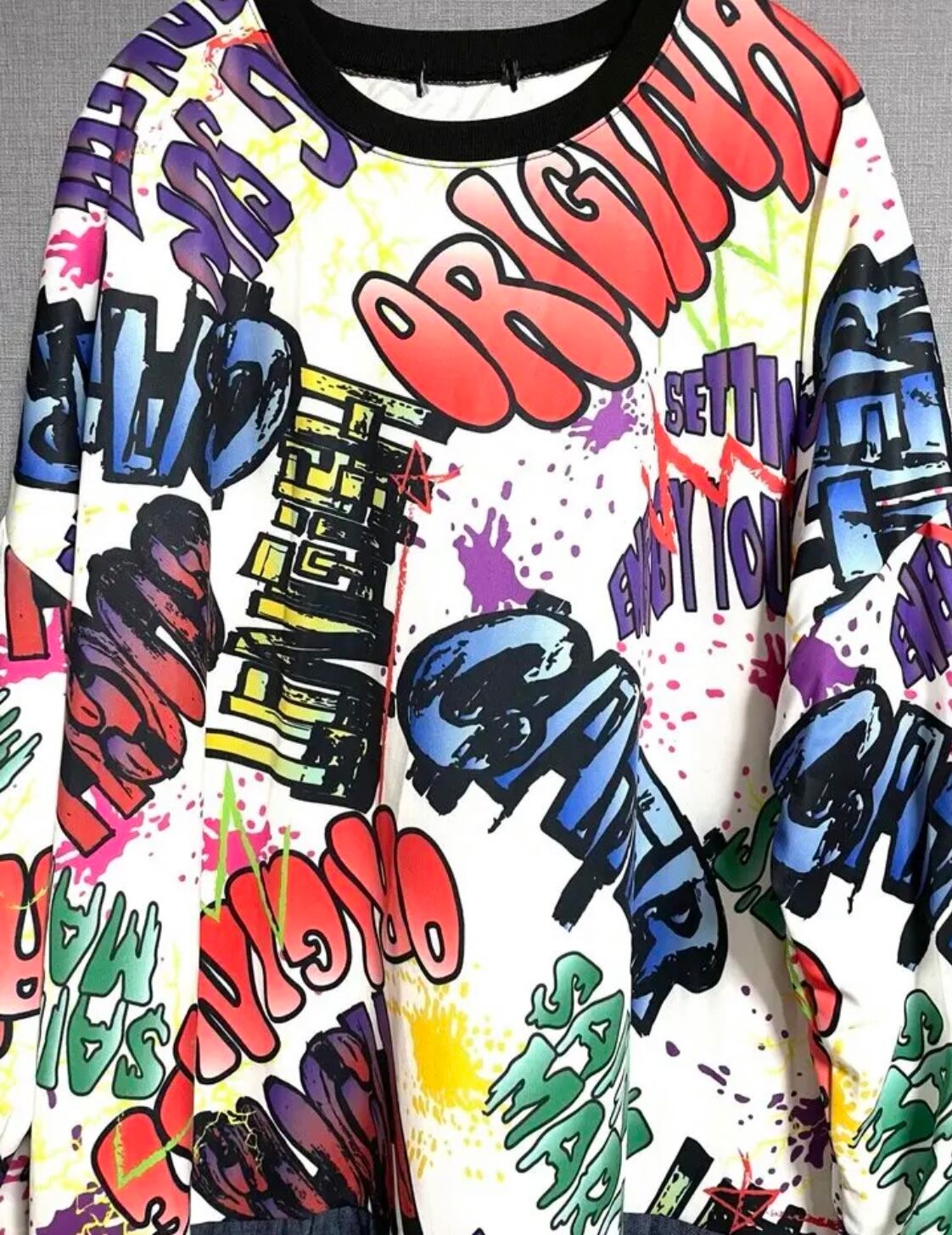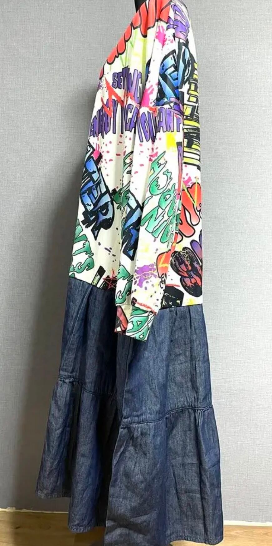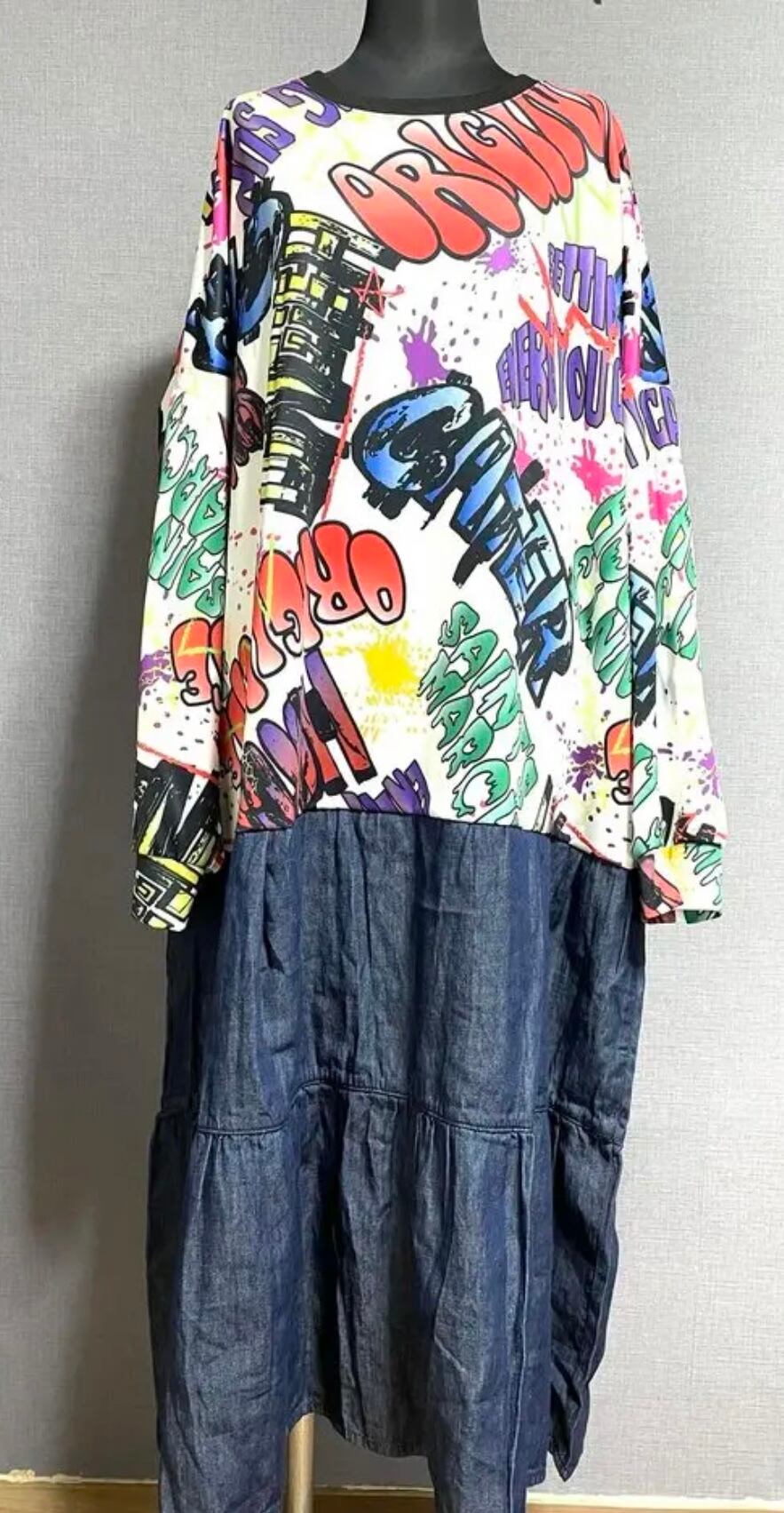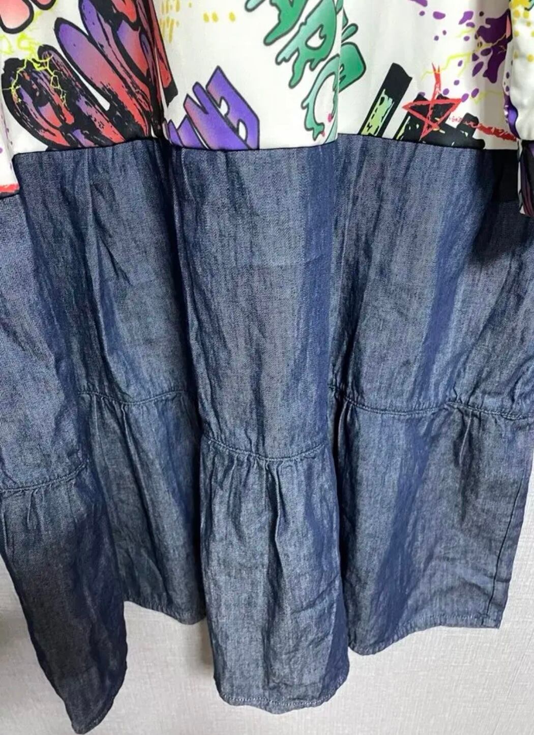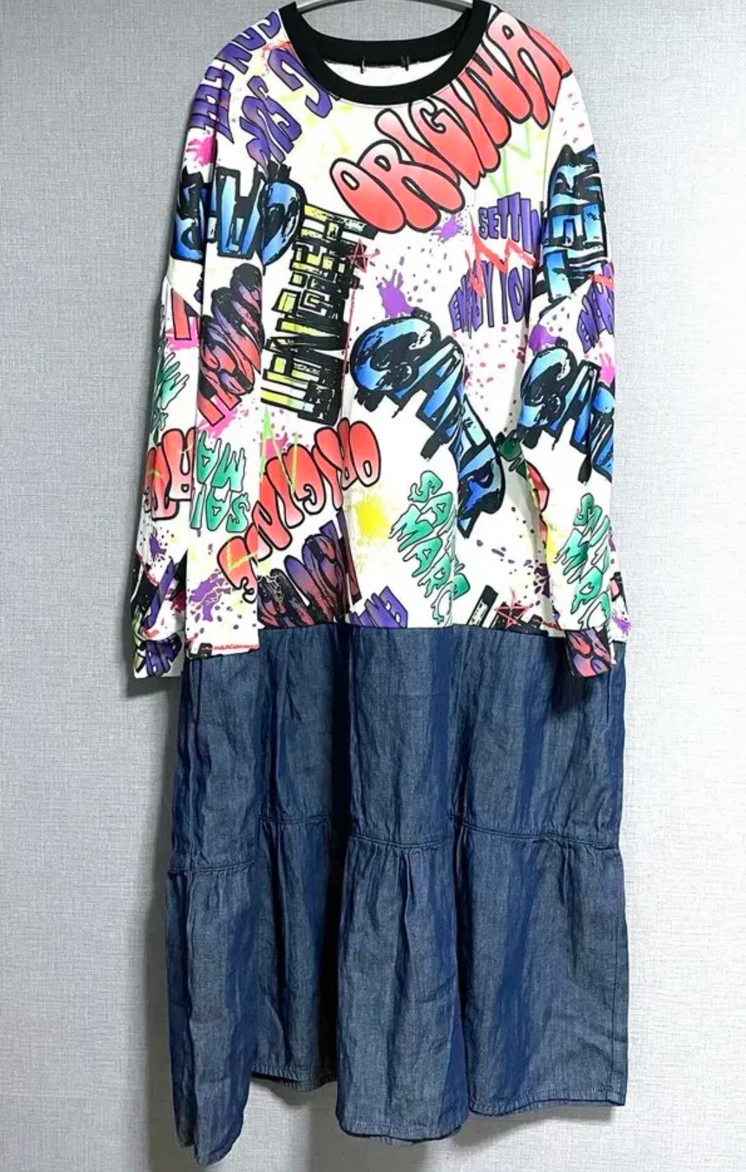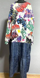 とてもかわいい落書きみたいな柄トップスに、薄手のデニムスカートを合わせています♬