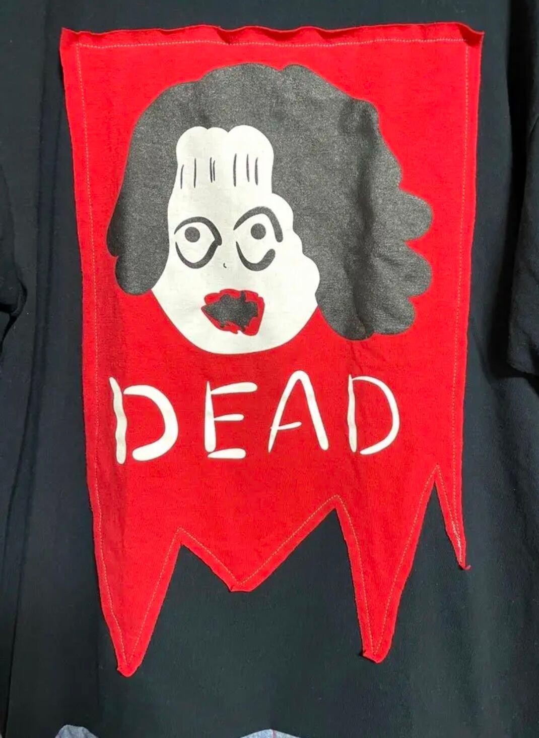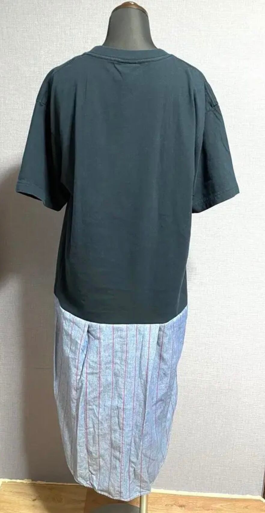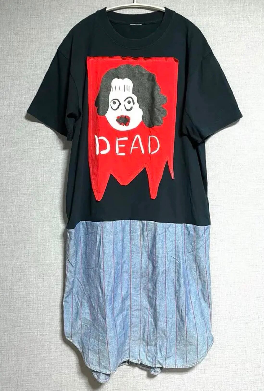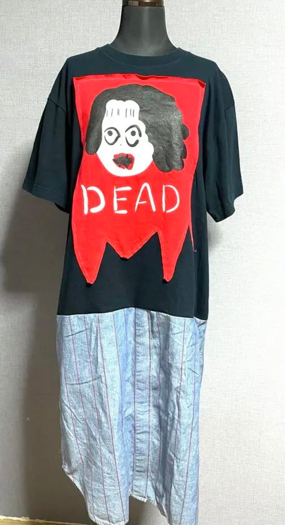 黒TシャツにDEADを縫いつけ、ストライプシャツ型スカートを合わせています♬