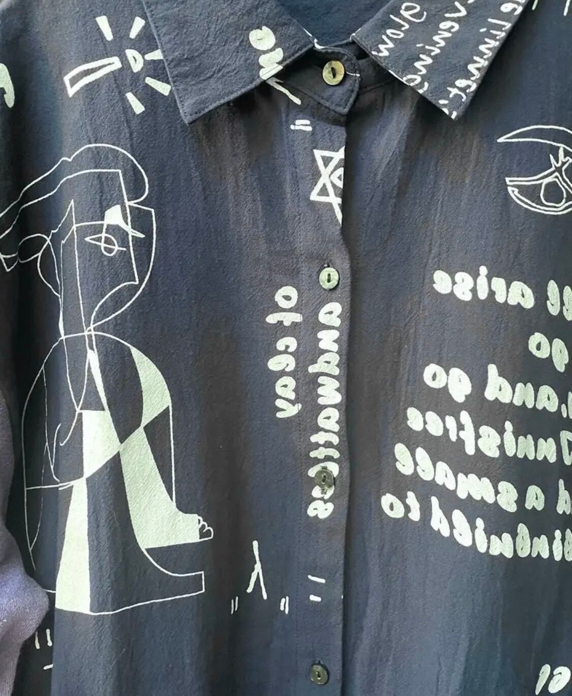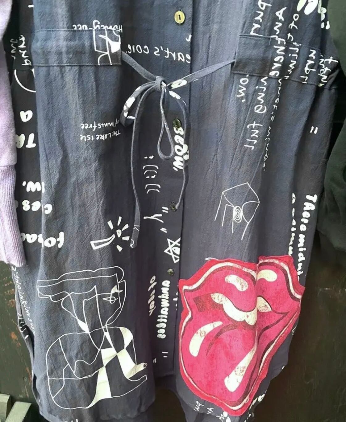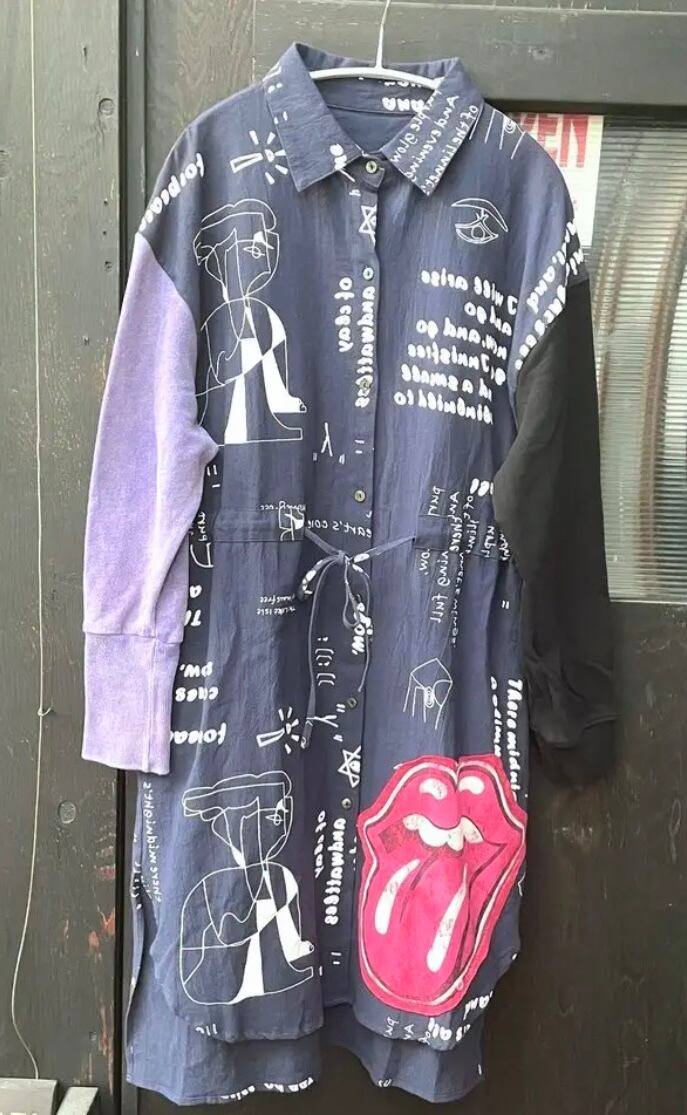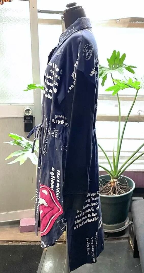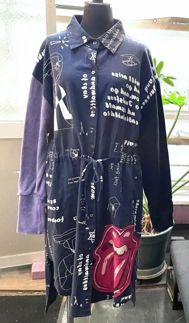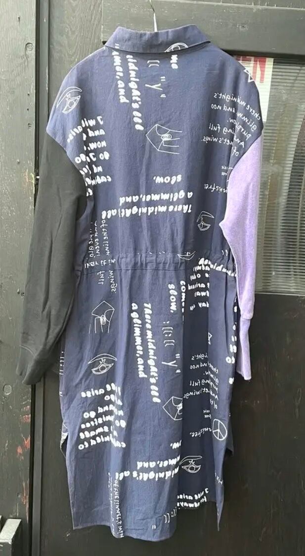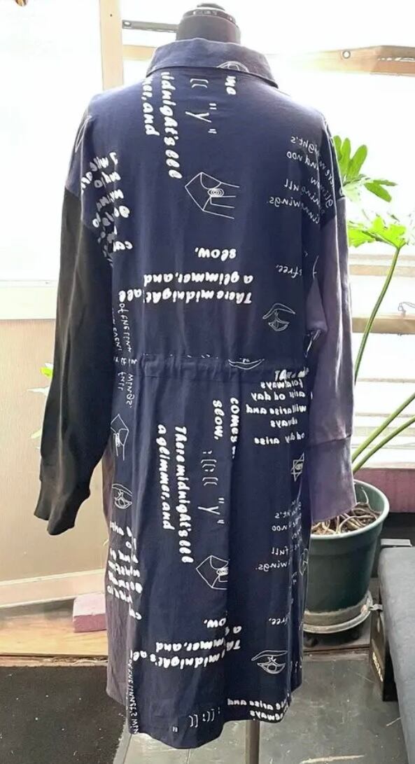 ネイビーのかわいいプリントのシャツワンピースに、袖はスウェット素材の袖を付け、裾にでっかいベロを縫い付けています。