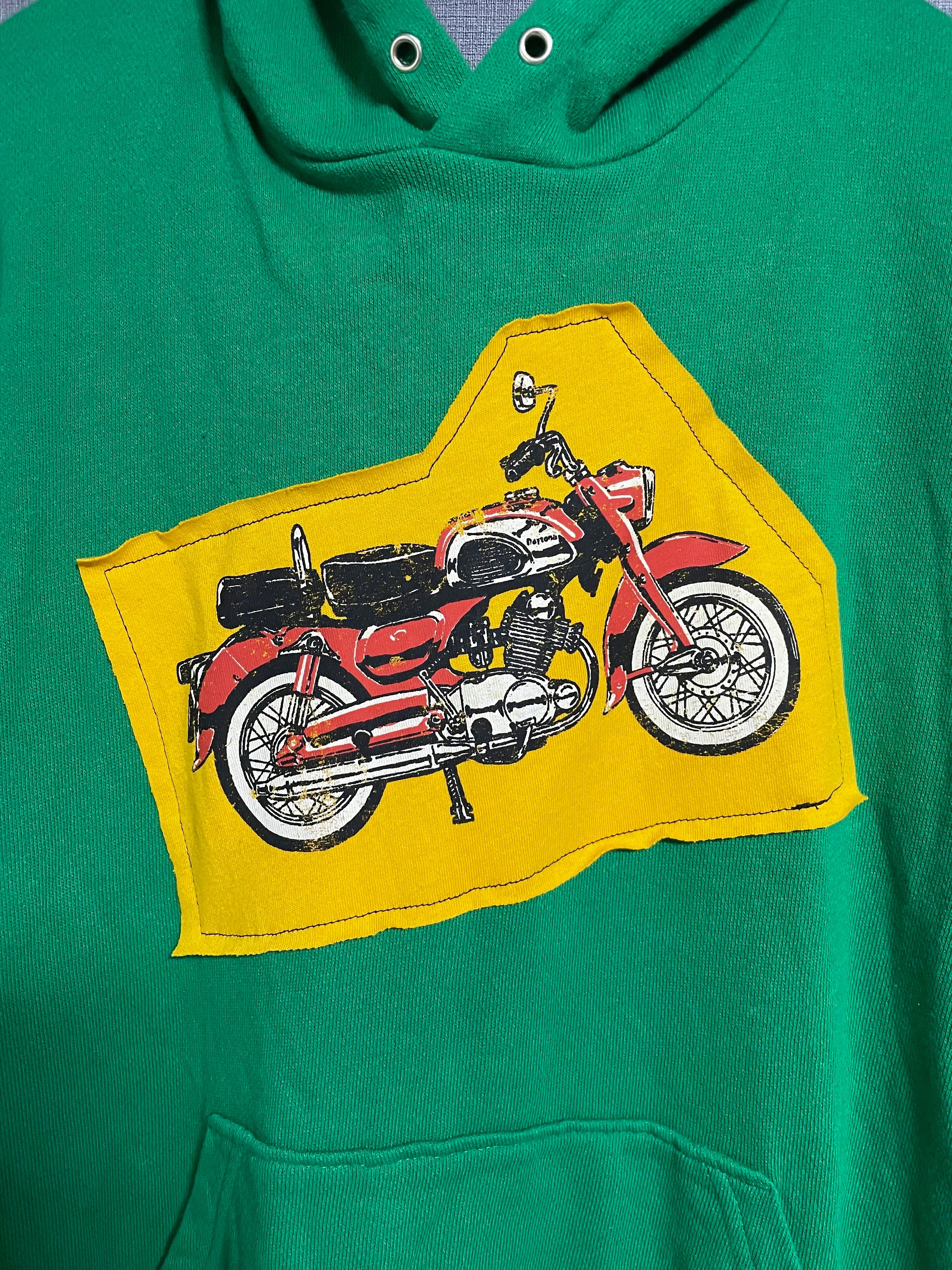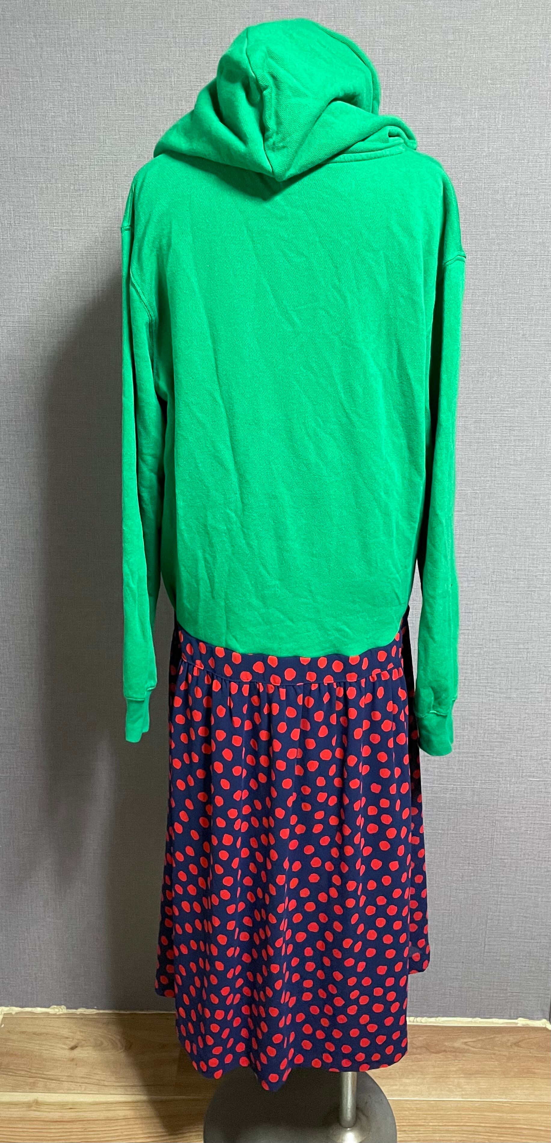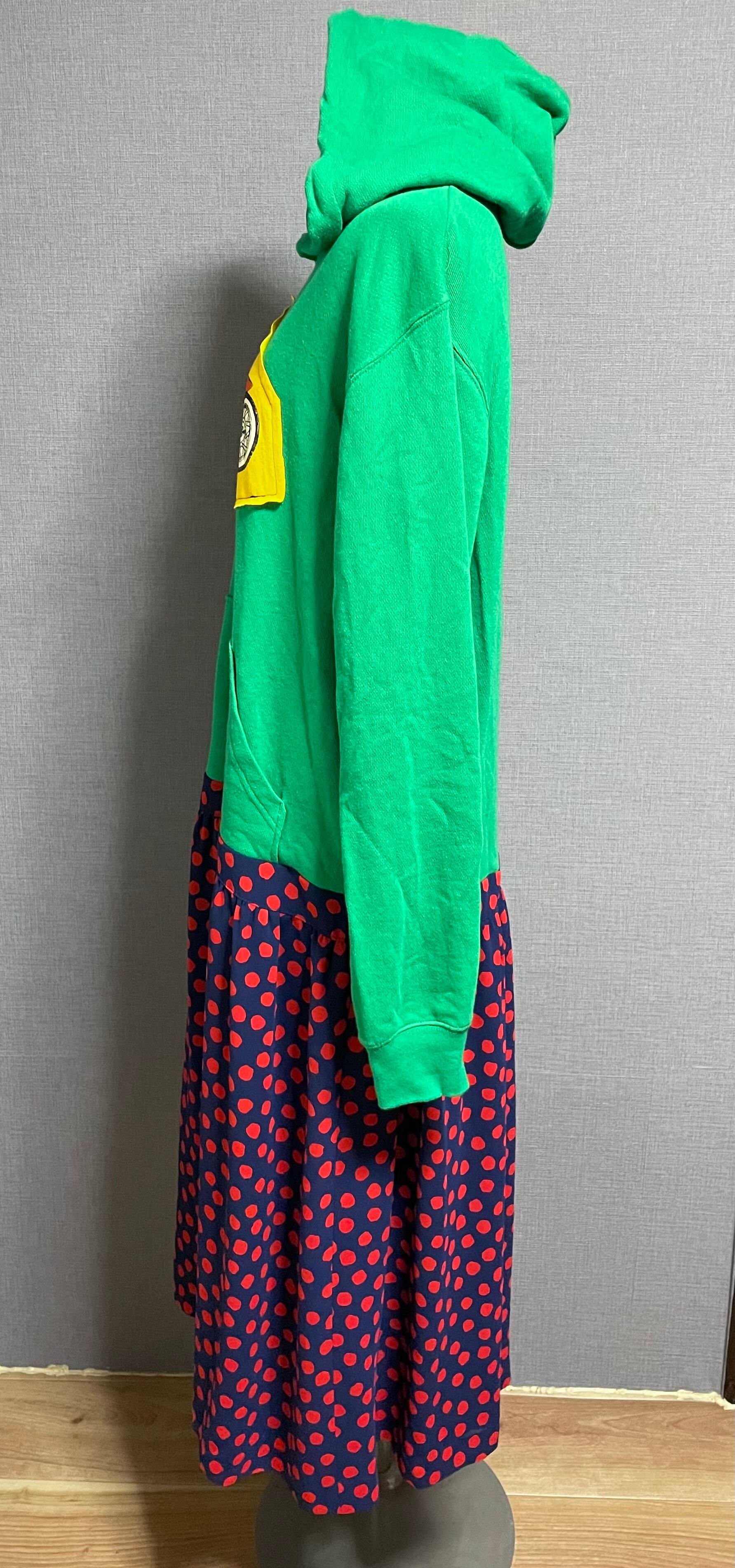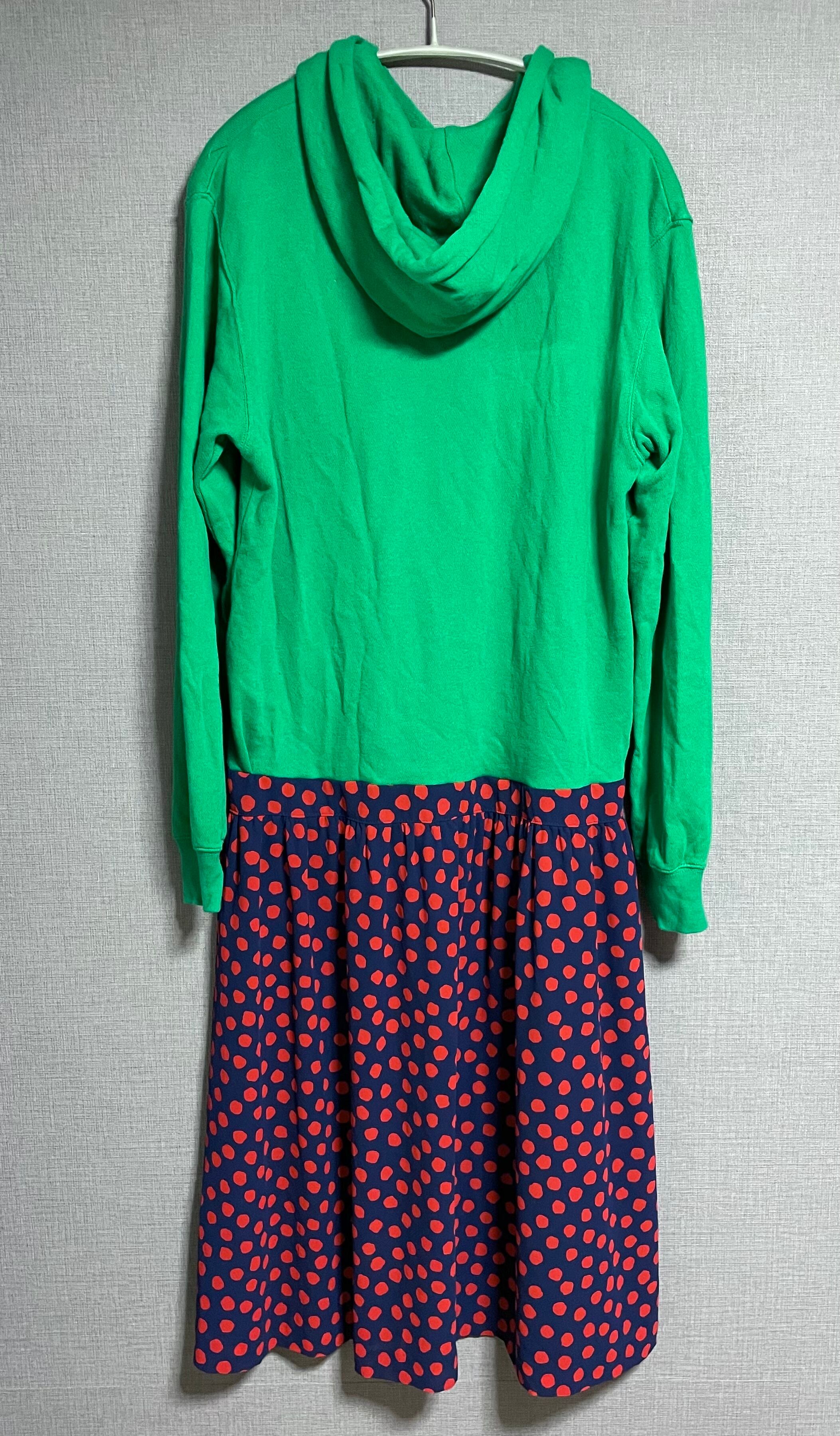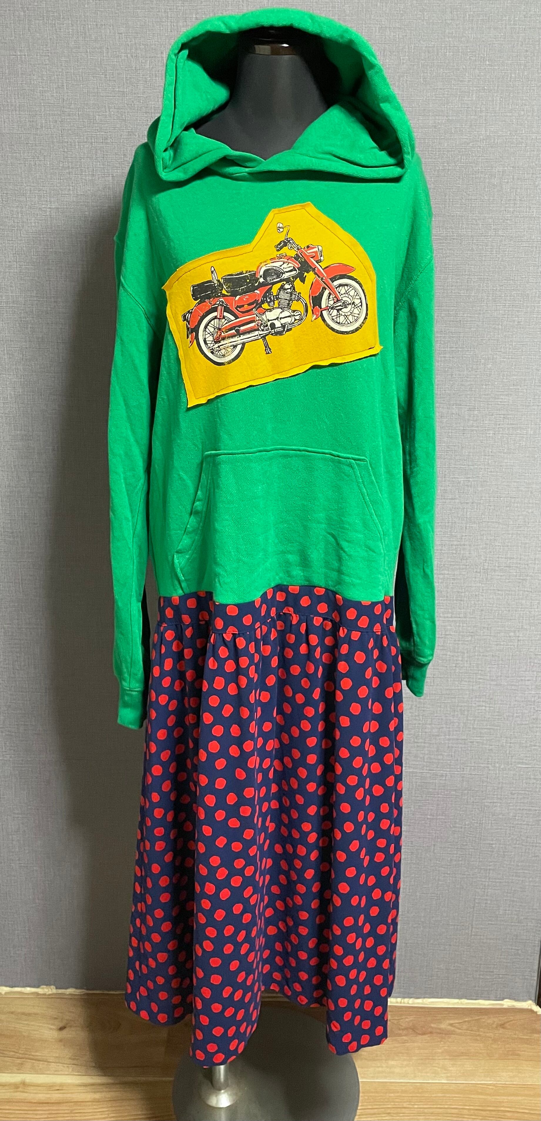 緑パーカーにかわいいバイクを縫いつけ、ネイビー×赤のドット柄スカートを合わせています♬