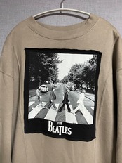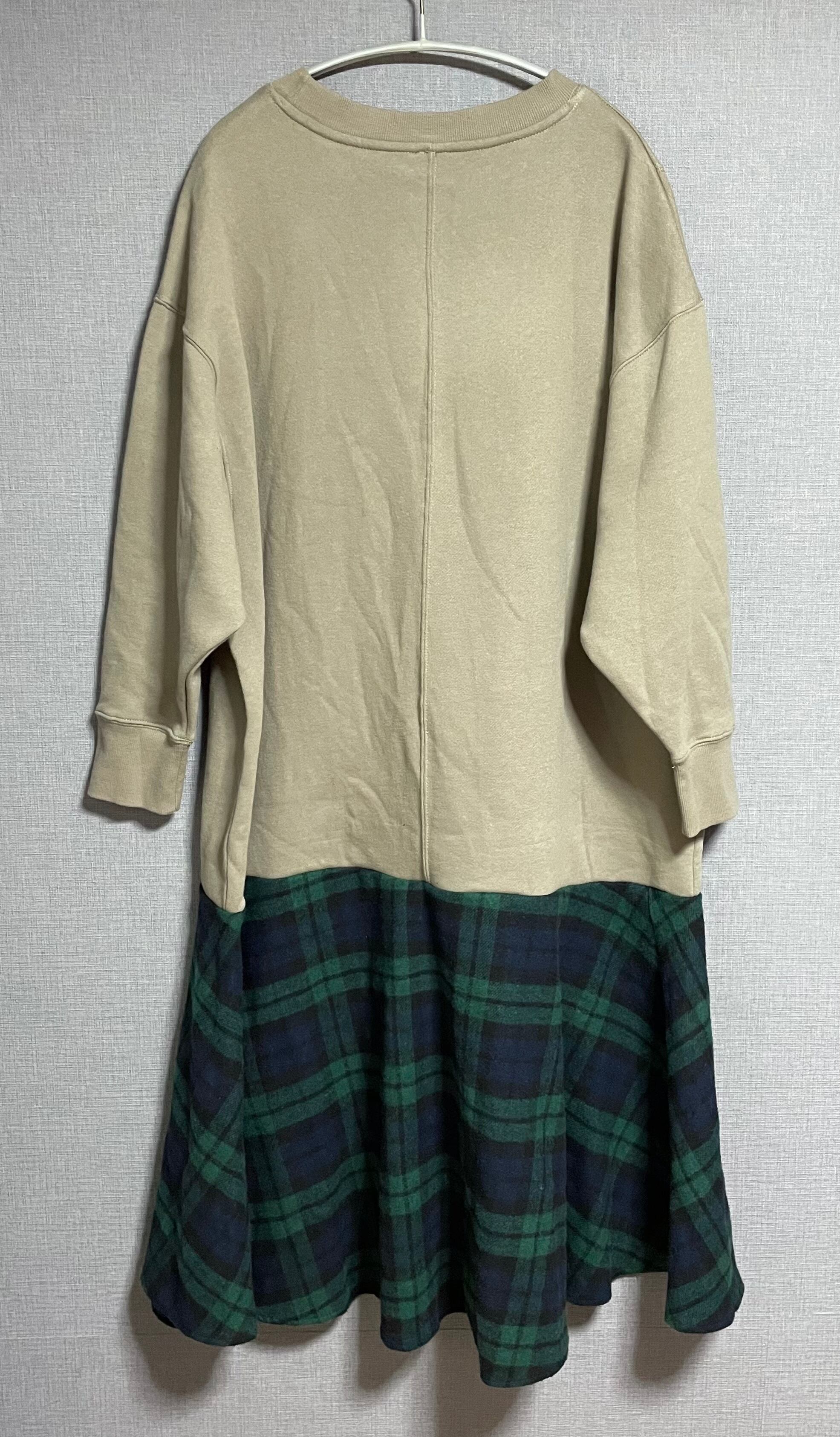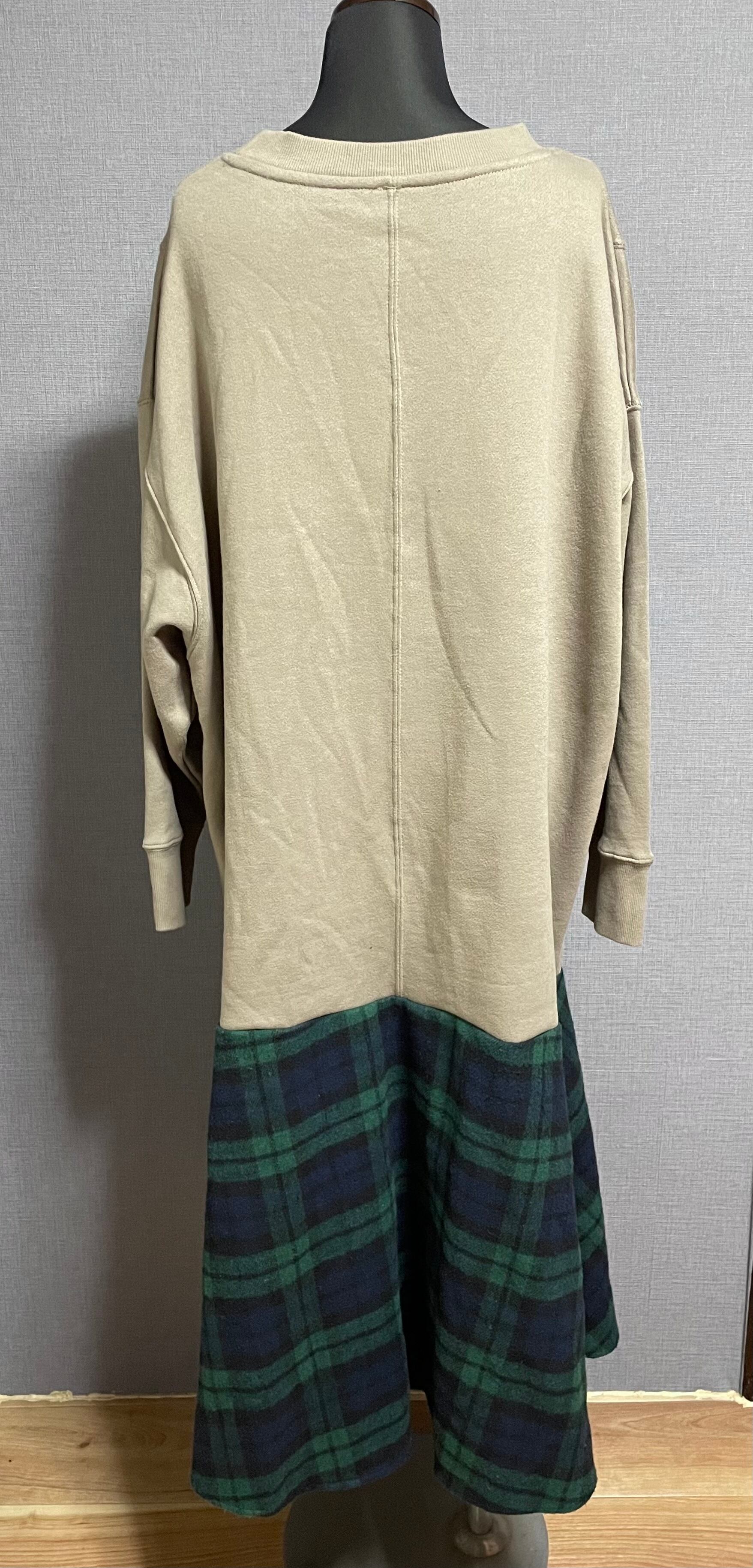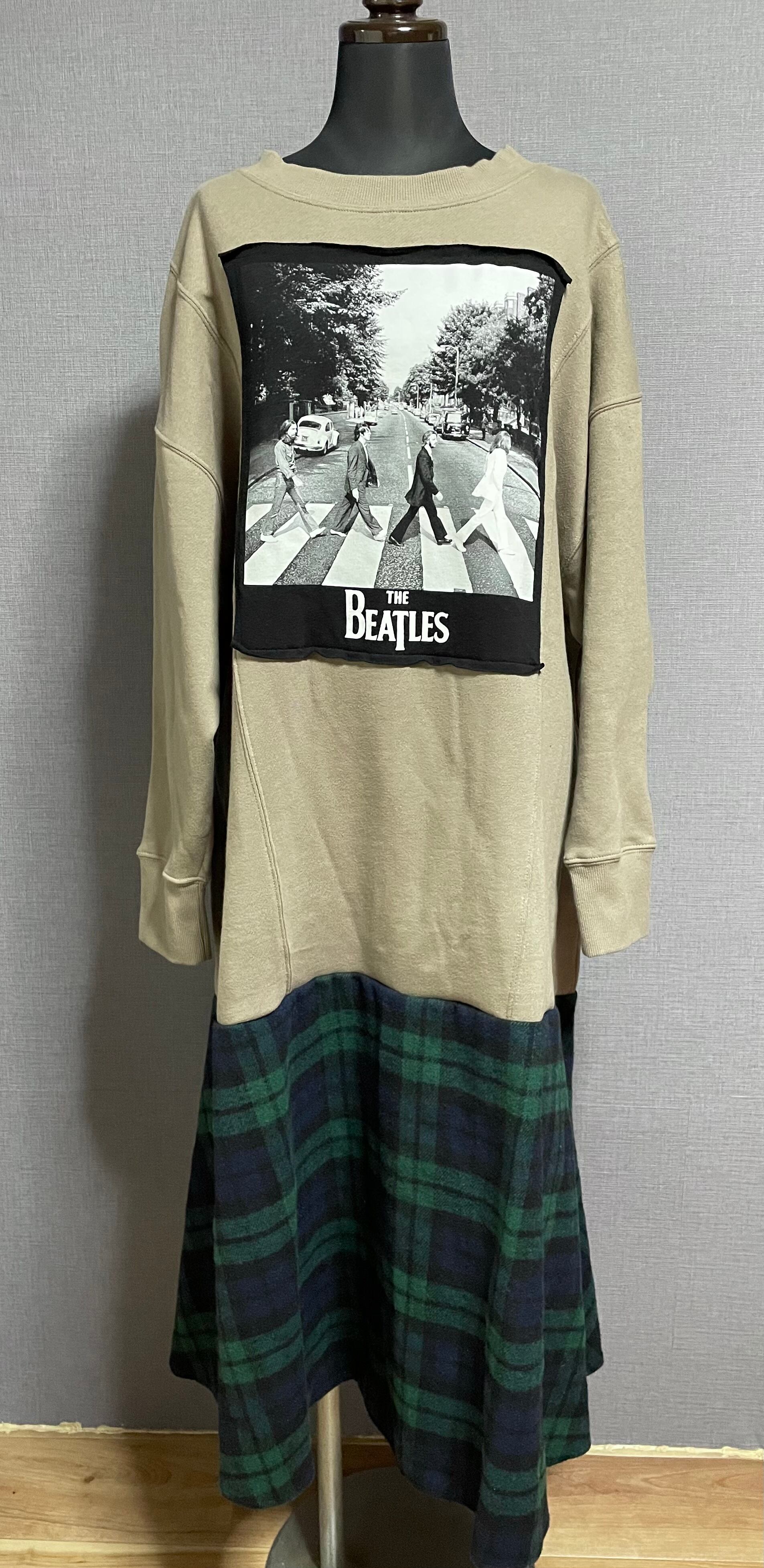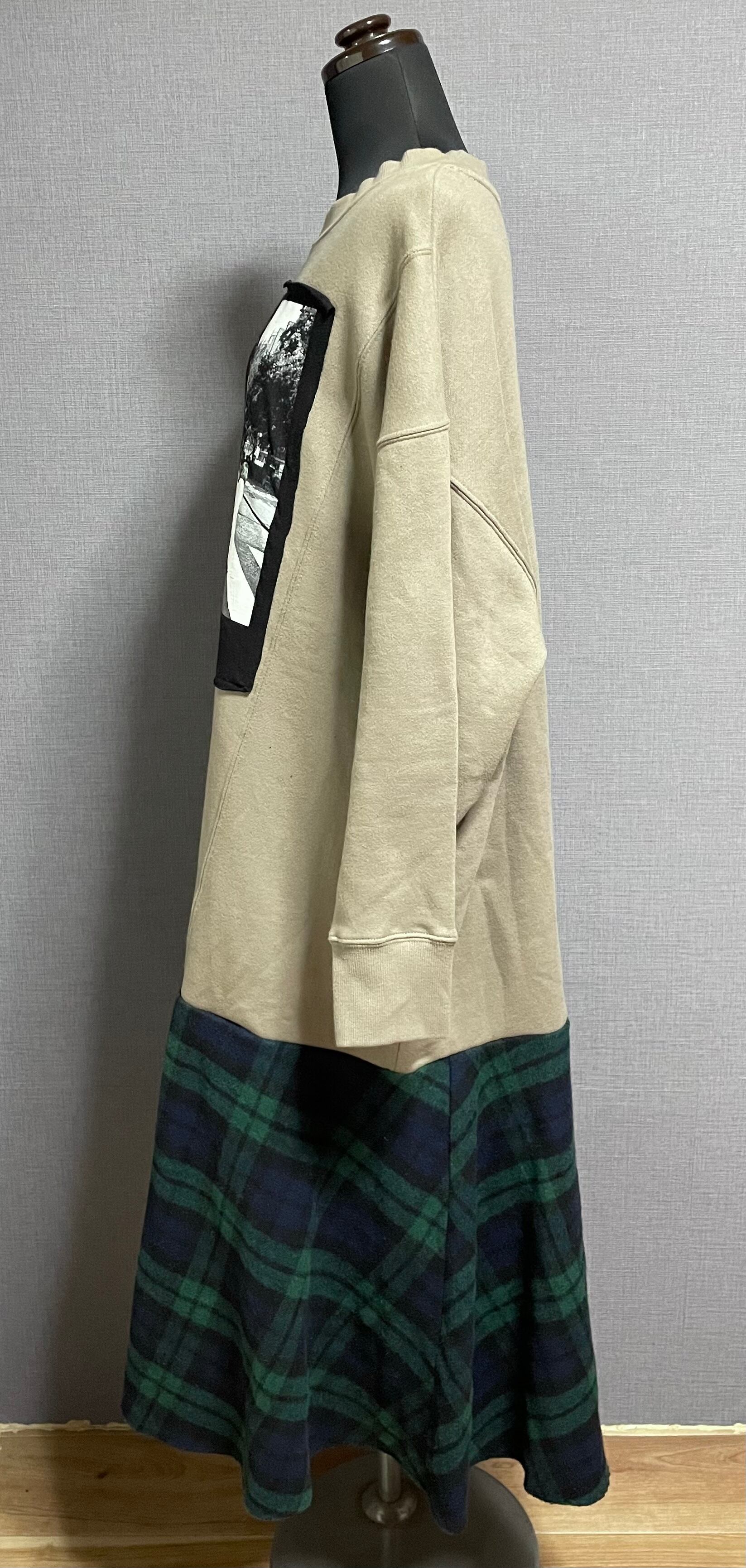 ベージュ系スウェットに4人組を縫いつけ、あたたかいチェック柄スカートを合わせています♬
