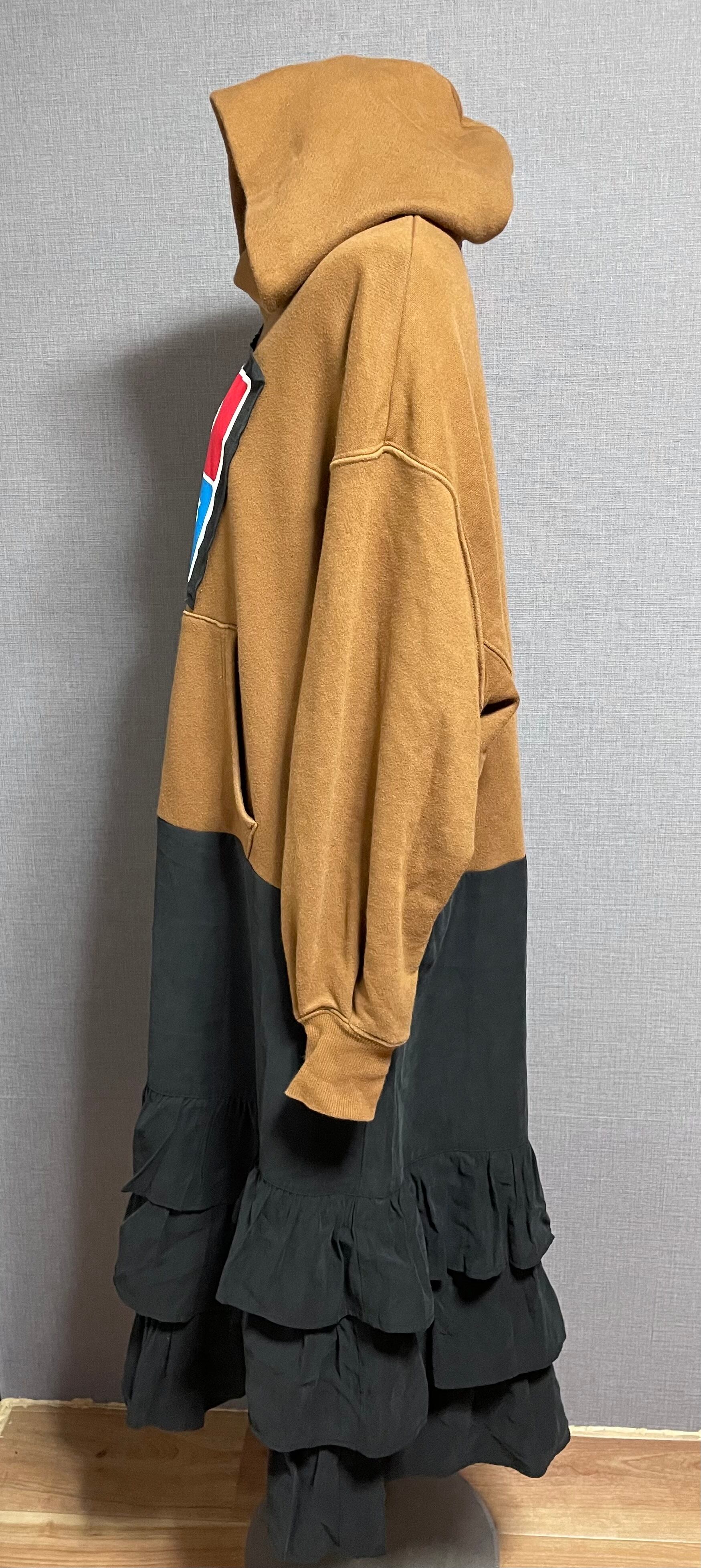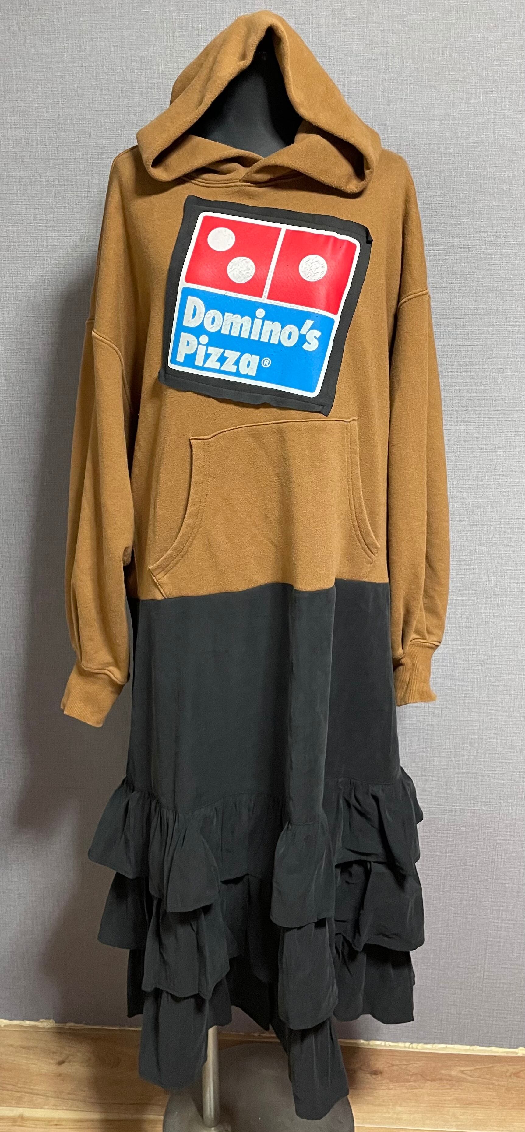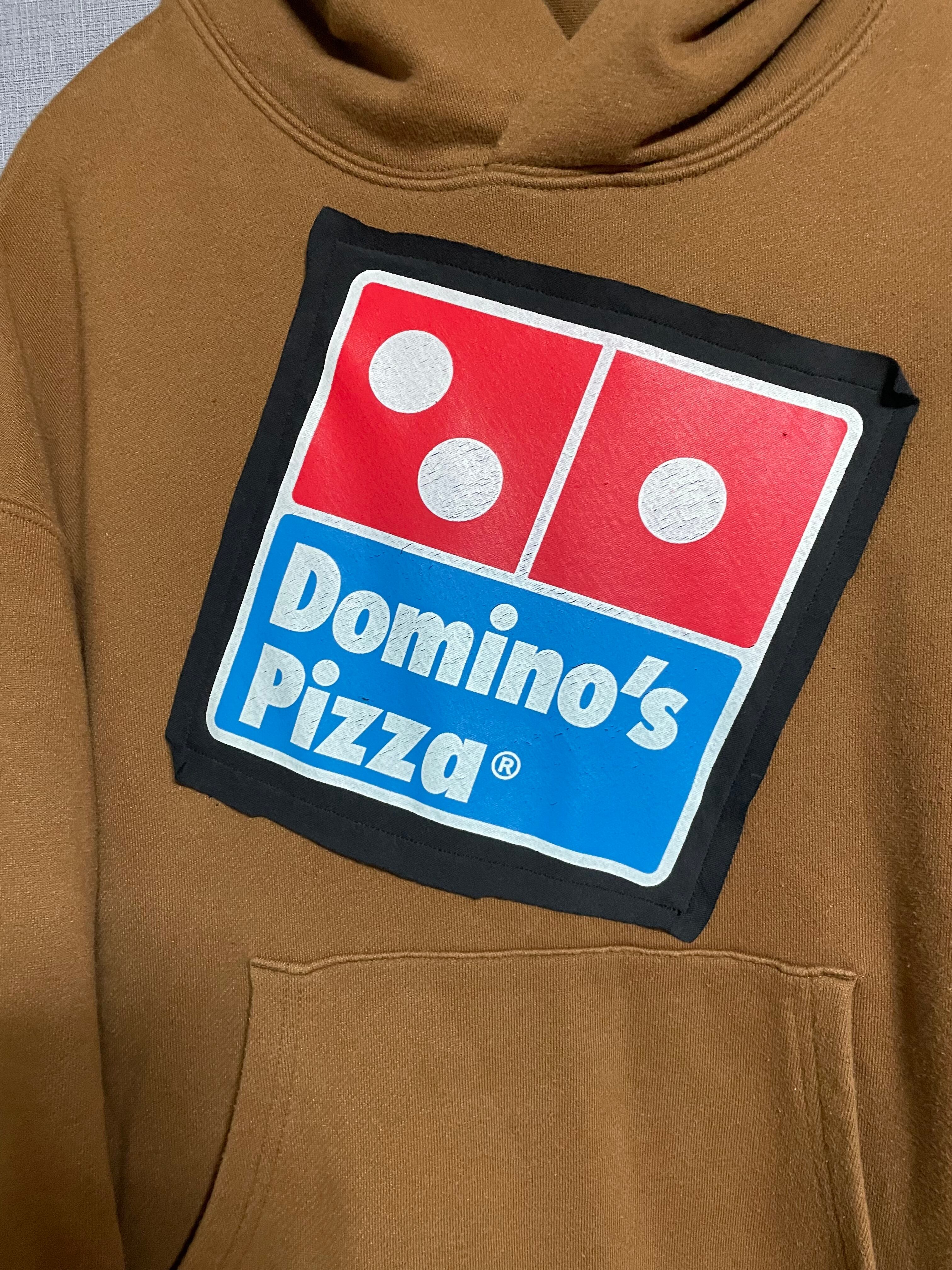 茶色のパーカーにピザを縫いつけ、黒のフリルスカートを合わせています♬
