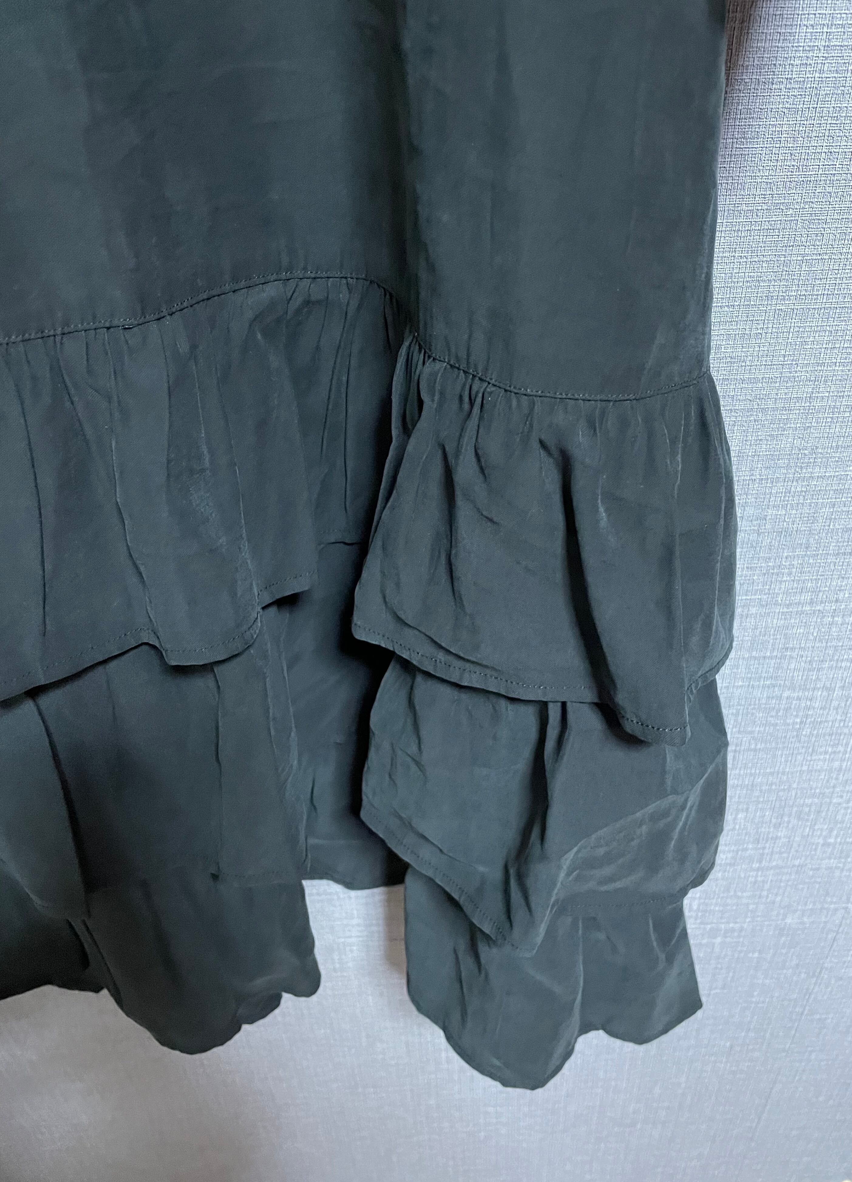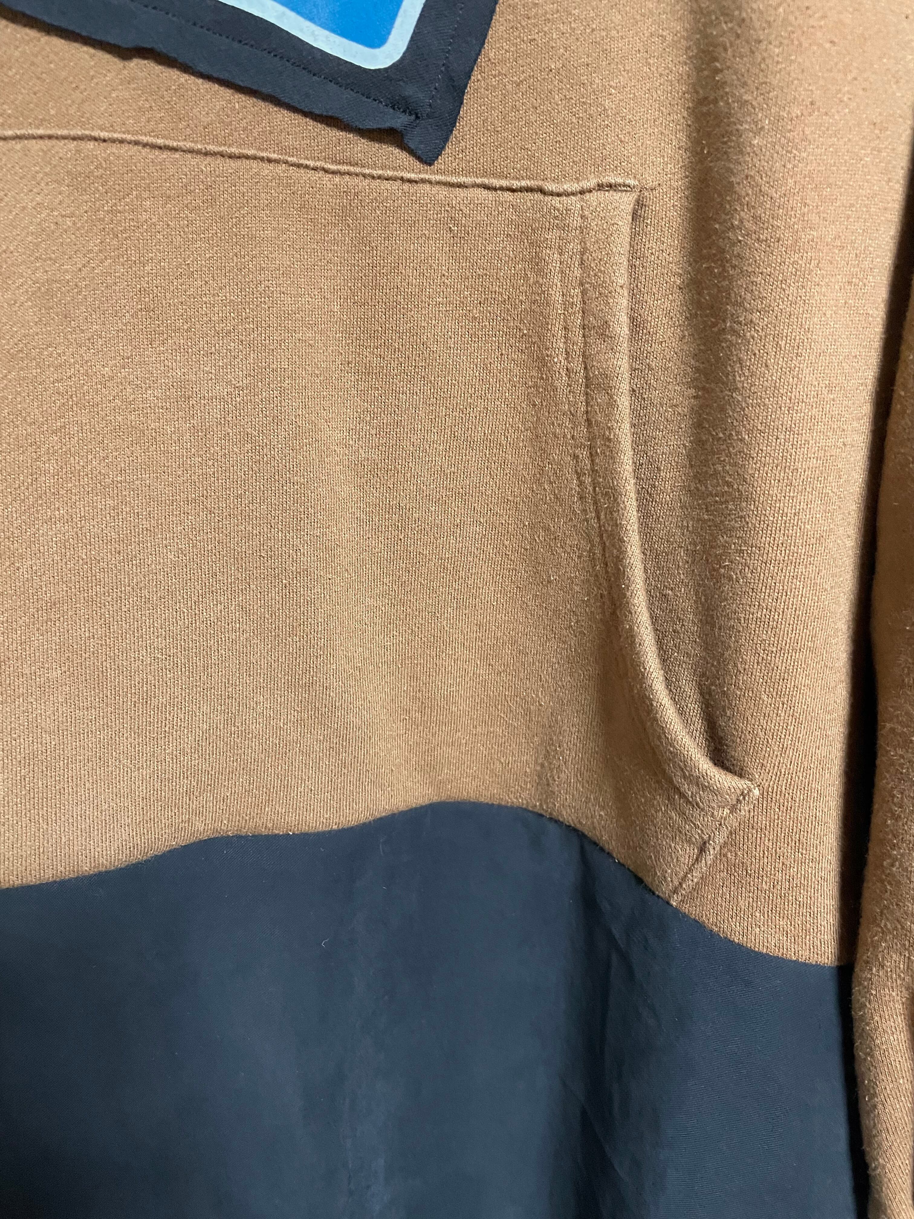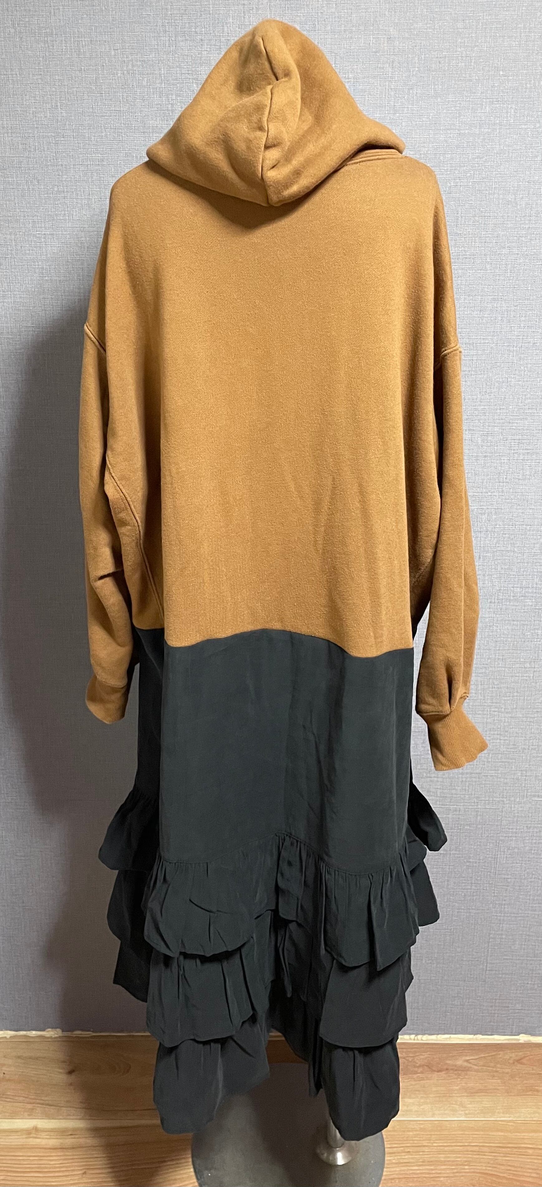 茶色のパーカーにピザを縫いつけ、黒のフリルスカートを合わせています♬
