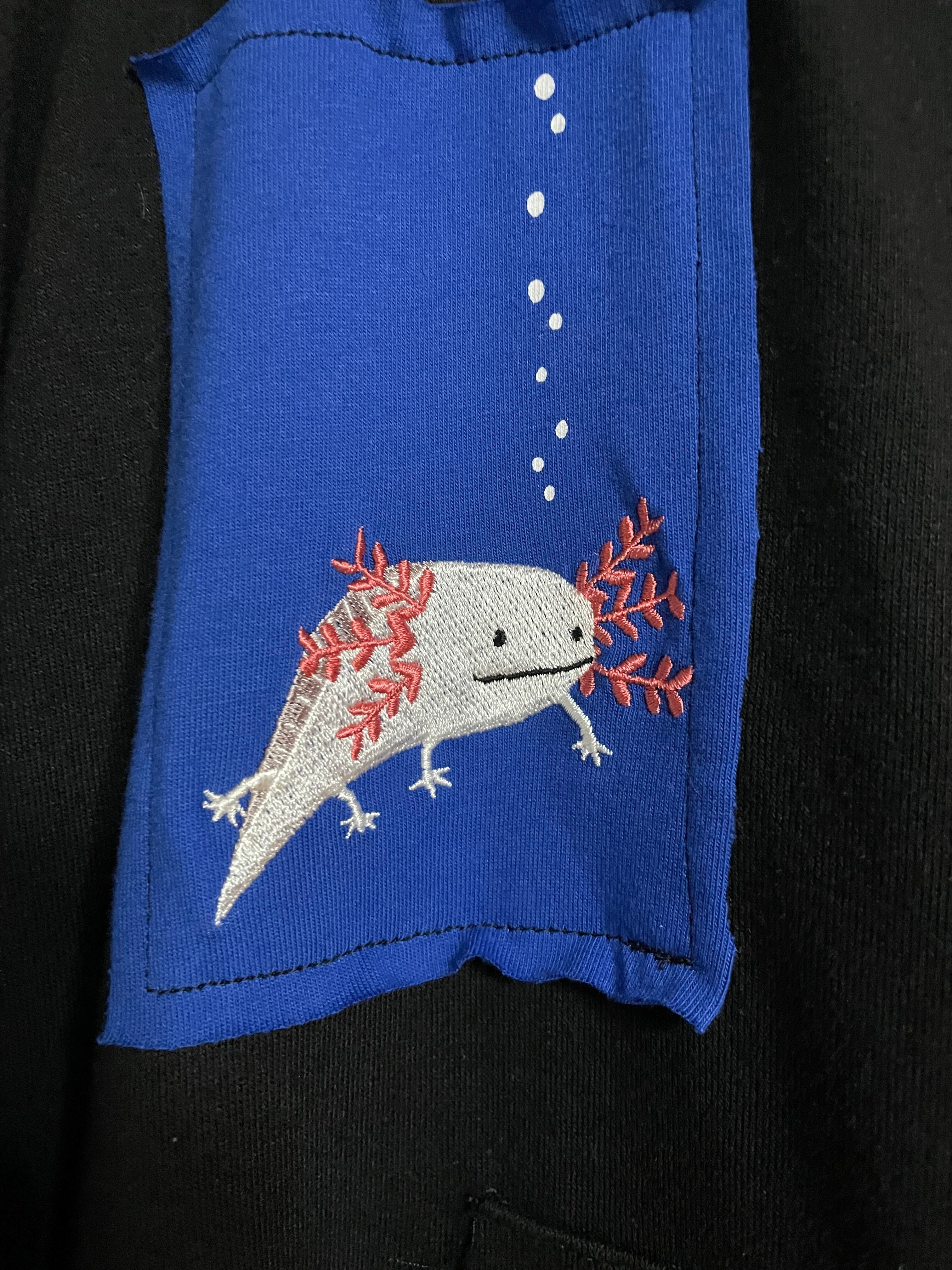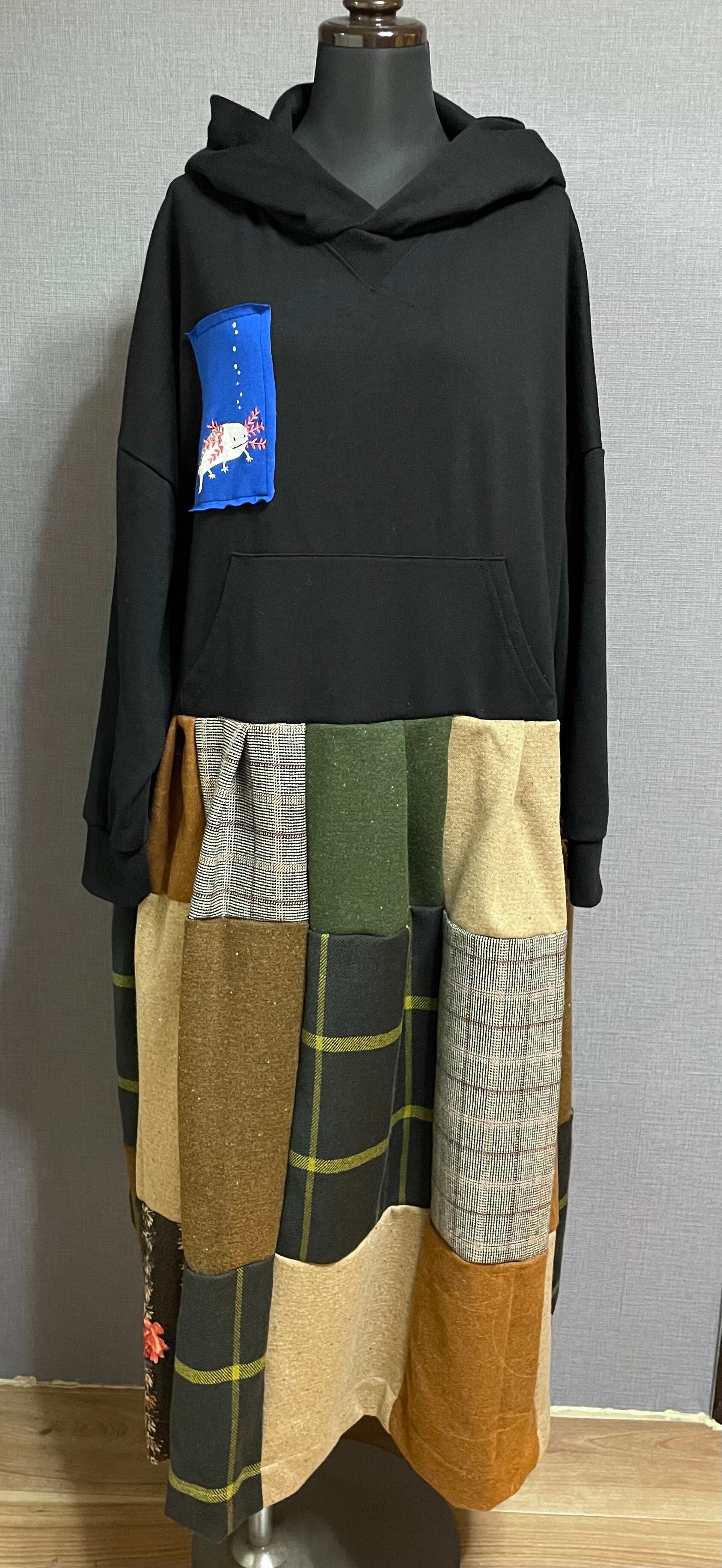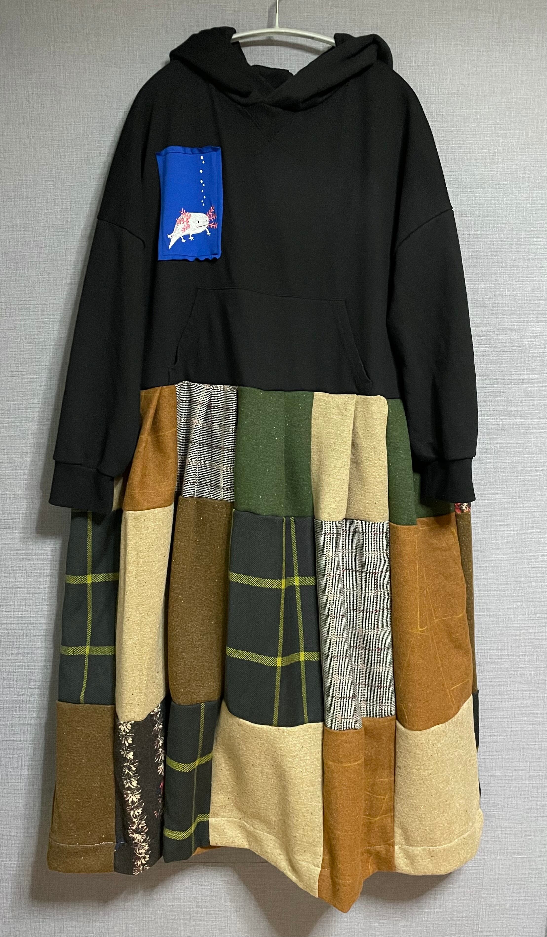 黒パーカーに可愛いウーパールーパーを縫いつけ、いろんな生地をパッチワークしたスカートを合わせています♬