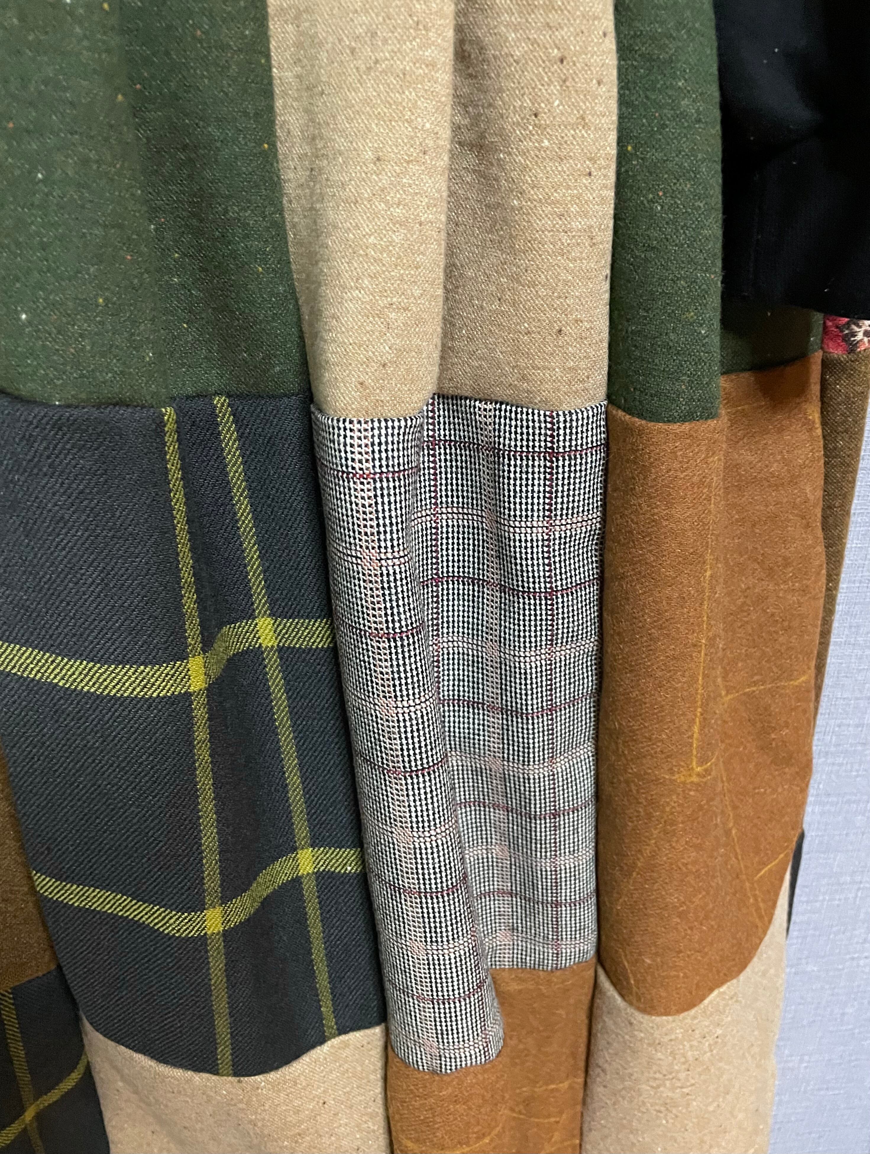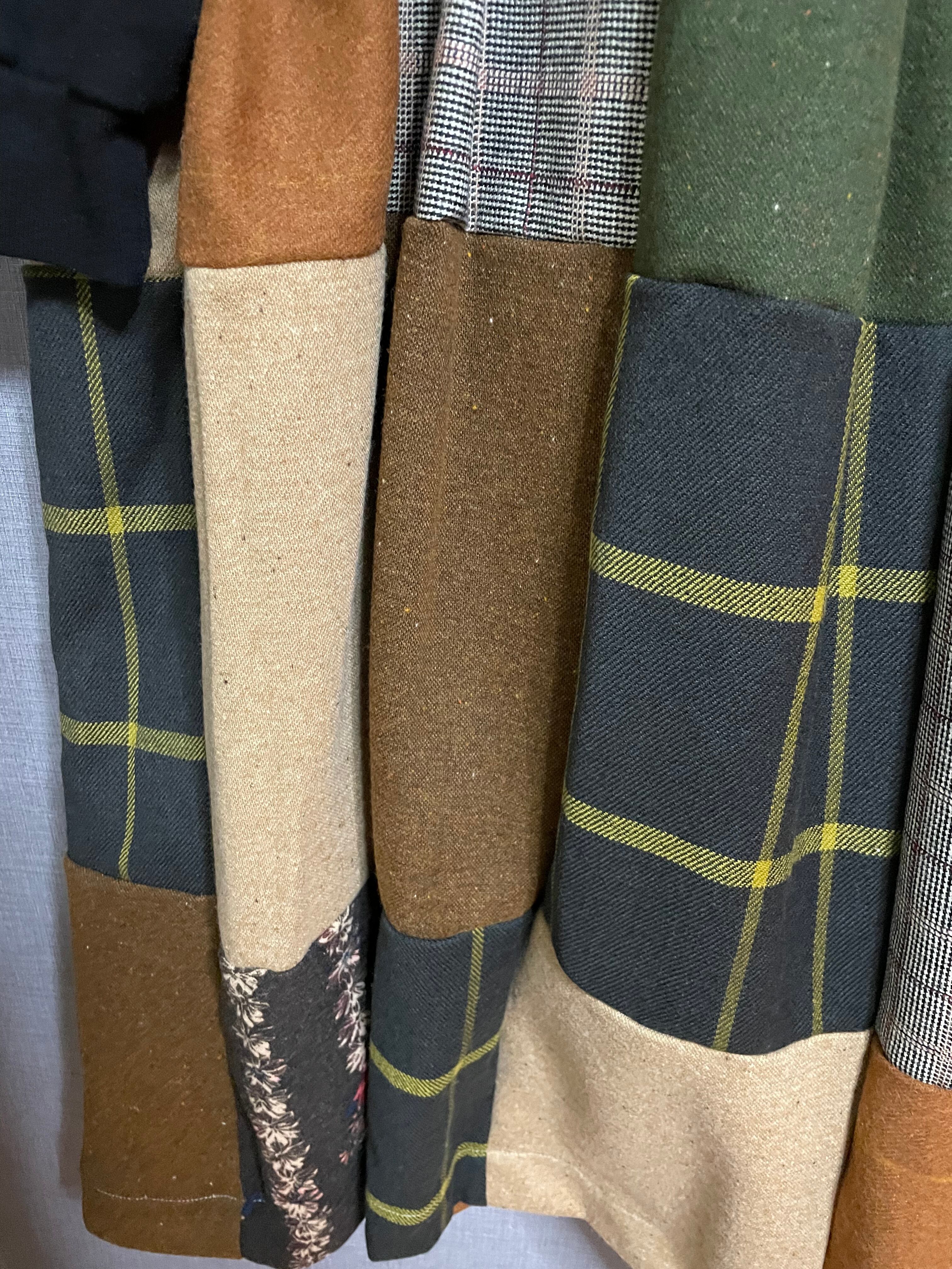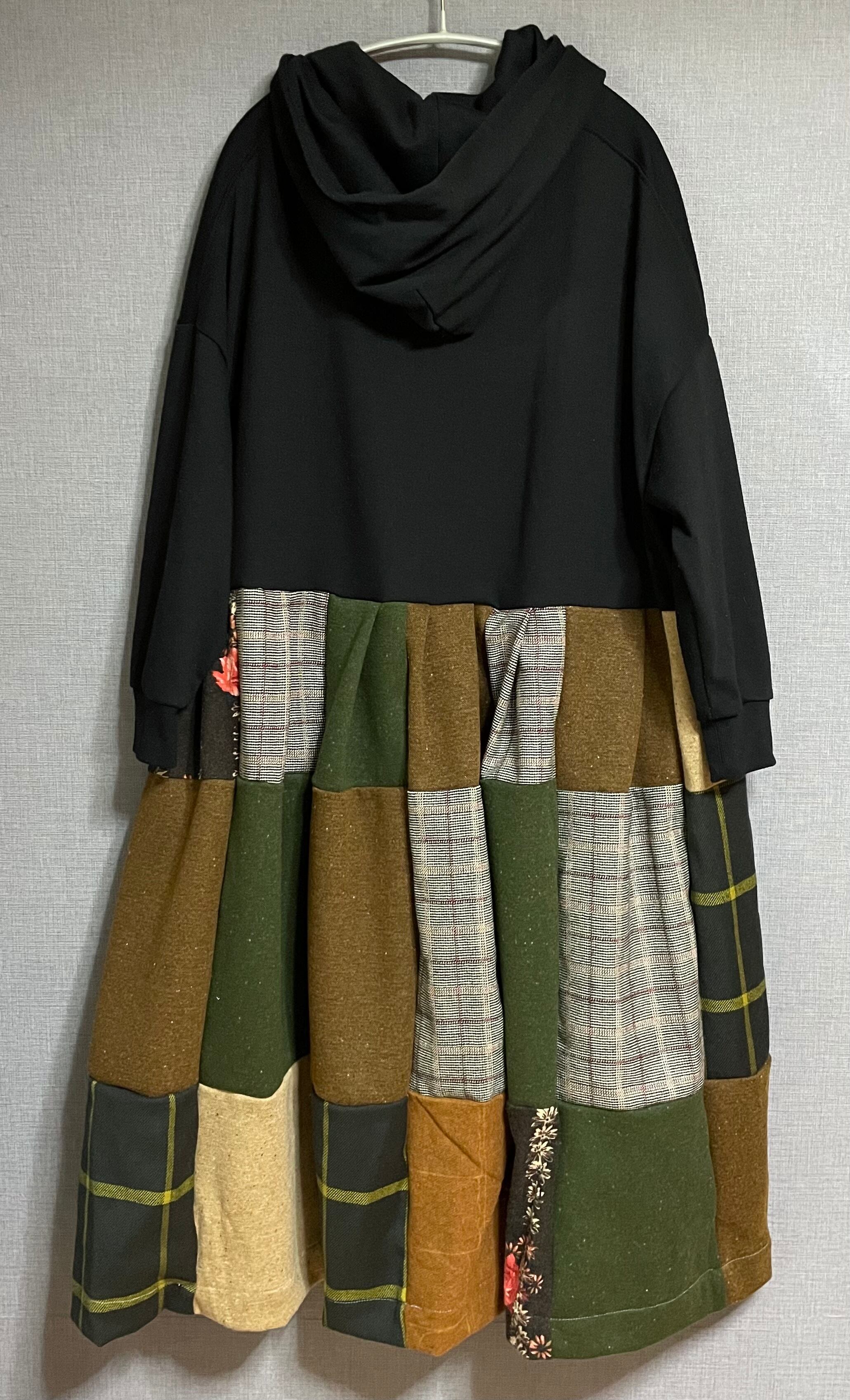 黒パーカーに可愛いウーパールーパーを縫いつけ、いろんな生地をパッチワークしたスカートを合わせています♬